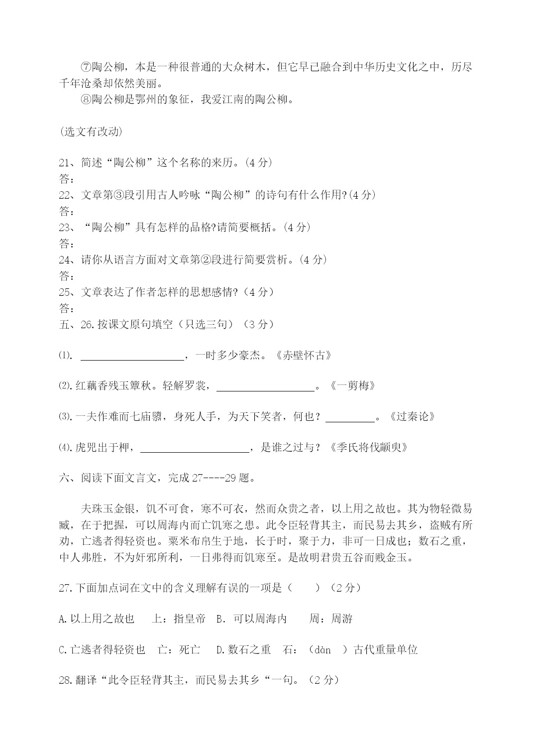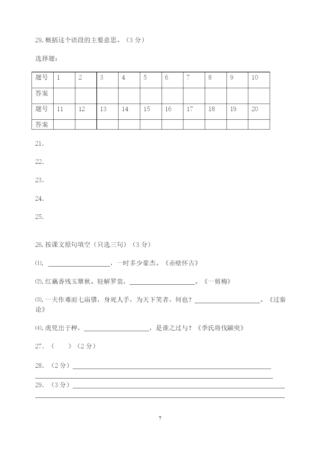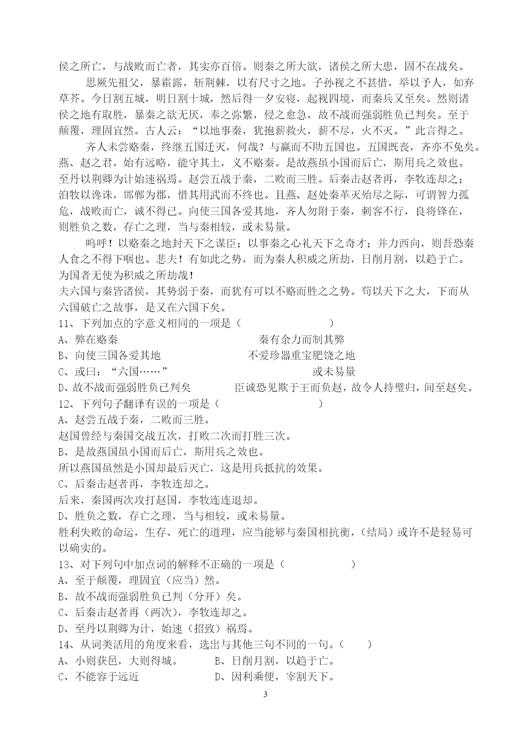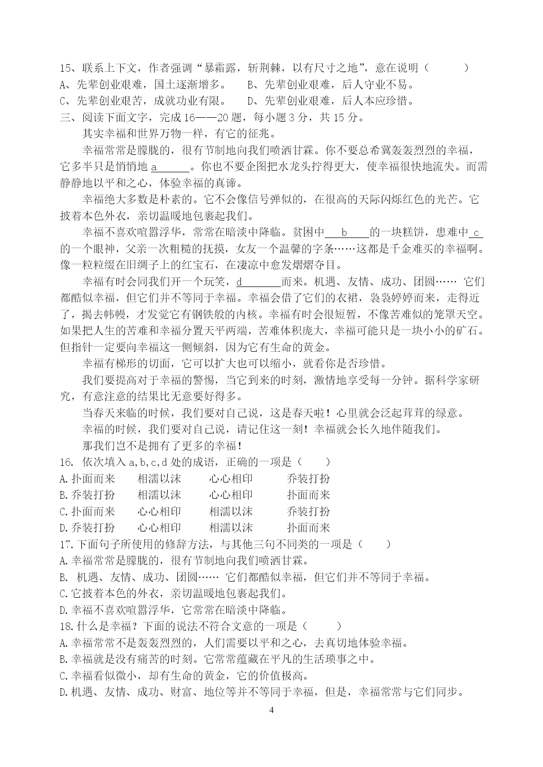 PAGEPAGE9高职考试语文练习试卷一、共十题,每小题3分,共计30分1.下列词语中加点字的读音,全都不相同的一组是()A.呐喊木讷那年方枘圆凿按捺不住B.纯真嗔怪缜密审慎周密宾客阗门C.倔强角色联袂诡谲奸诈精神矍铄D.杜甫哺育果脯铺张浪费花园苗圃2.下列各组词语中,有错别字的一组是()A.振动举世震惊行迹形迹可疑B.风声谈笑风生卓见真知灼见C.恣意肆意妄为直言仗义执言D.桃园世外桃源题名金榜提名3.依次填入下列各句横线处的词语,最恰当的一组是()①不少“形象工程”的背后,往往隐藏着双重的利益:政治上以政绩求得上级提拔,经济上以项目捞取一己实惠。②文学需要深厚的文化和深沉的人文精神,没有这些则只能流于一般的情感宣泄和浅薄的心灵安慰。③“人有七情六欲”这固然不错,但物欲怎样膨胀,不应该折损祖国在心目中的光芒和庄严。A.趋向内涵纵然/也B.趋向蕴涵纵然/也C.取向内涵无论/都D.取向蕴涵无论/都4.下列各句中没有语病的一句是()A.随着滨海新区开发开放的深入,为滨海新区提供强大的智力、人力支撑,已成为本市高校的广泛共识。B.经过元旦三天的旺销,国美已经全面掌握了市场需求的较高的产品,特别针对此类产品进行了备货。C.进入冬季以来,天津水上公园开展了各种丰富多彩的雪上、冰上娱乐项目深受市民欢迎。D.冷战时期,作为美国军事盟友的日本将可能发动的苏联军事入侵行动列为主要威胁之一。5.下列各句中加点的成语使用不恰当的一项是()A.和煦的春风带来生机盎然的季节,学校社团的招新活动再次成为一道亮丽的风景线,男女学生纷至沓来,踊跃报名。B.机场附近山顶的大量无限电发射台严重影响了飞行安全,目前虽有一些已搬下山,但这对实现机场净空不过是九牛一毛。C.东方大学城在短短四年内就以2.1亿元自有资金获取了13.7亿元巨额利润,这种惊人的财富增长速度确实匪夷所思。D.很多教师和学生都有这样的经验体会,在考试前一定要保持轻松的心态,采用疲劳战术和题海战术只能事倍功半。6.下面各句括号内的两种表述分别编为四组,表述全都恰当的一项是()=1\*GB3①.沿江两岸(a.山花吐香,清风送爽,茂林修竹,飞瀑流泉,危崖竦峙,奇石满布,b.危崖竦峙,奇石满布,飞瀑流泉,清风送爽,茂林修竹,山花吐香,)=2\*GB3②.朱自清笔下的江南的水,有凌空飘逸的,有汪汪一碧的,有晶莹澄澈的。(a.他们是瀑布、深潭、琼浆。他逼真地描绘出山水的形、色、质。b.他逼真地描绘出水的质、形、色。他们是瀑布、琼浆、深潭。)A.=1\*GB3①a=2\*GB3②aB.=1\*GB3①b=2\*GB3②bC.=1\*GB3①a=2\*GB3②bD.=1\*GB3①b=2\*GB3②a7.下列句子使用的修辞方法,与其他三句不同的一项是()A.推动历史前进的,不是秦皇汉武,也不是唐宗宋祖,而是勤劳勇敢的人民。B.你是知道的,我是个粗人,没有喝过多少墨水,现在要我写这样的文章是不可能的。C.我似乎打了一个寒噤,我就知道,我们之间已经隔了一层可悲的厚障壁了。D.冬日里,刘大爷没有别的爱好,就喜欢晒太阳时跟着半导体哼哼。8.下列句子中,标点符号的使用有错误的一项是()A.三个条件是:=1\*CHINESENUM3一、工作计划由我们提出;=2\*CHINESENUM3二、人事问题也应有相对的理由;=3\*CHINESENUM3三、事业费要确定,预算由我们提出。B.为我们居住的地方,他很费了一番考虑,他说:“第一,群众条件要好;第二,不要住在村边上;第三,要靠近干部。”C.她爱买许多零碎的东西,什么黄花呀、木耳呀、干笋呀、满满地装了一篮子;她一个人提不动。D.那种叫“水晶”的,长得长长的、绿绿的,晶莹透明,真像用水晶和玉石雕刻出来似的。9.下面句中括号内的两种表达分别编为四组,表述最恰当的一项是()=1\*GB3①如果佛来思节夫人发觉是一种代替品,她会怎样想呢?会怎样说呢?(a.她的朋友会被当作一个贼吗?b.她不会把她的朋友当作一个贼吗?)=2\*GB3②她们本来被生活隔开,互相隔绝,(a.现在她用热烈的语言把他们鼓动起来。b.现在被她热烈的语言所鼓动)融成了一个整体。A.=1\*GB3①a=2\*GB3②aB.=1\*GB3①a=2\*GB3②bC.=1\*GB3①b=2\*GB3②aD.=1\*GB3①b=2\*GB3②b10.下列名言佳句的出处判断正确的一项是()A.“若舍郑以为东道主,行李之往来,供其乏困”。(《季氏将伐颛臾》)B.“但以刘日薄西山,