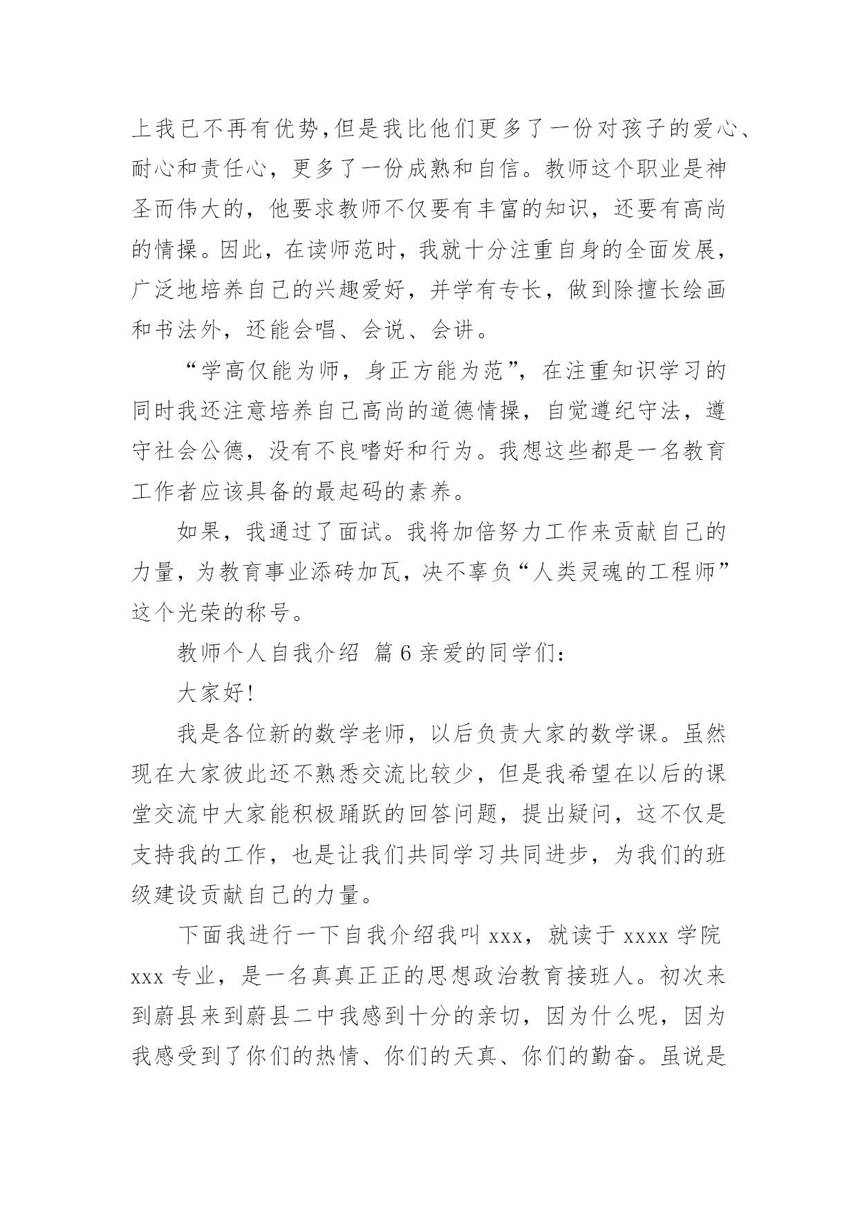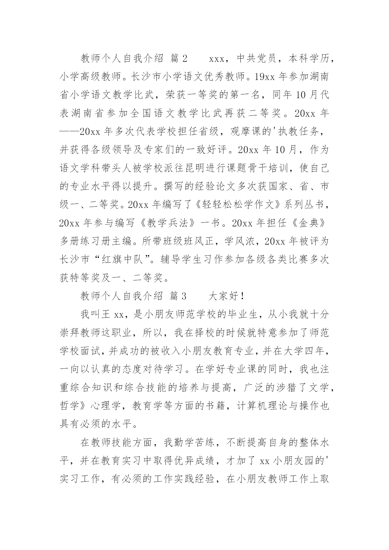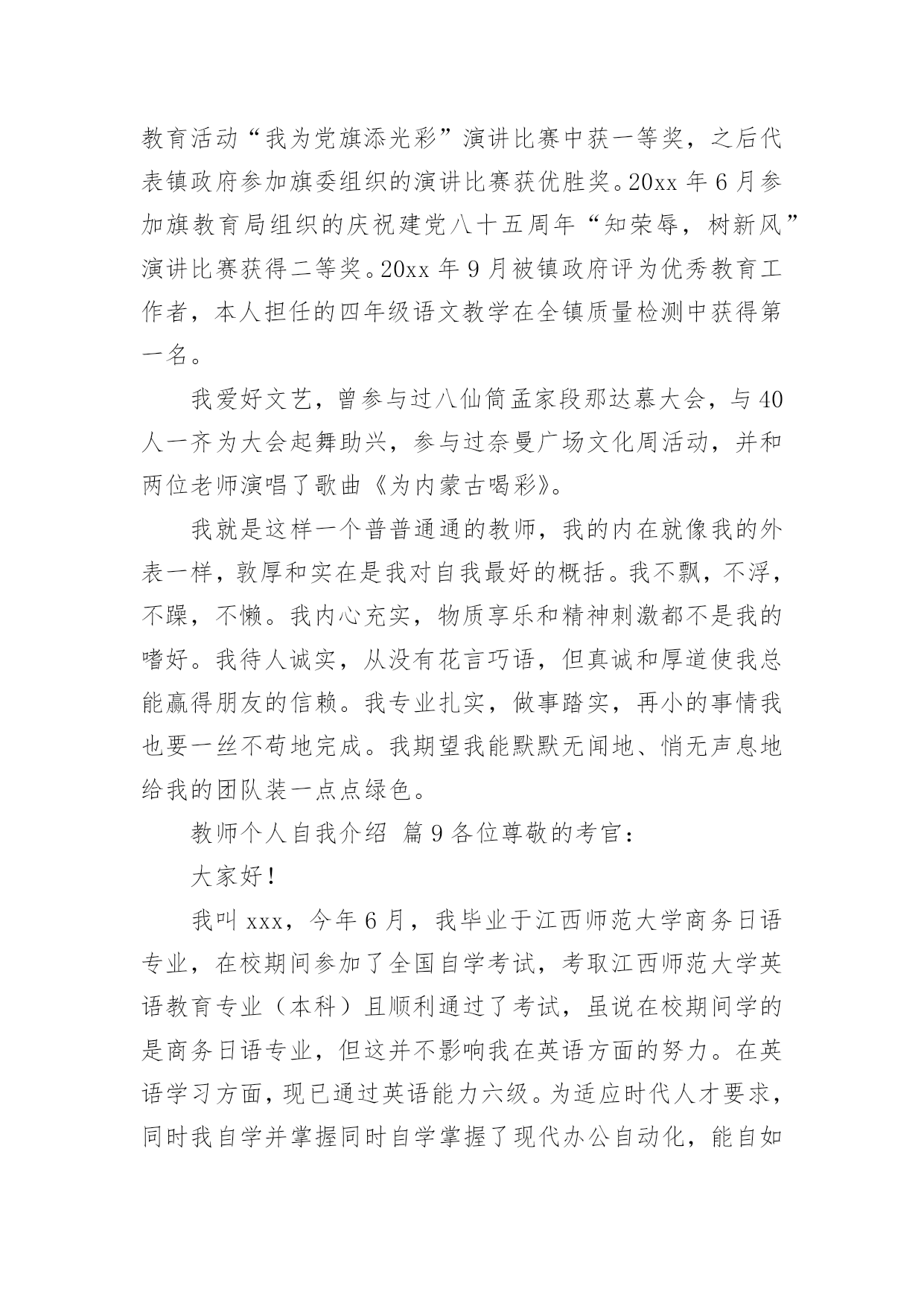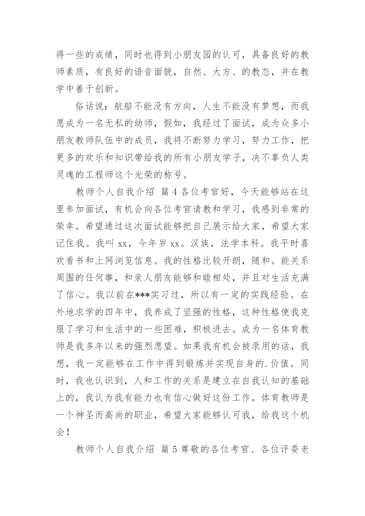 教师个人自我介绍教师个人自我介绍当到达一个陌生的环境后,我们就有可能用到自我介绍,通过自我介绍可以让他人了解我们。相信许多人会觉得自我介绍很难写吧,以下是小编精心整理的教师个人自我介绍,仅供参考,希望能够帮助到大家。教师个人自我介绍篇1尊敬的学校领导:你们好,我叫xx,我毕业于xxx师范学院幼师专业,今年xx岁,有爱心和责任心,对于不同阶段的幼儿,能针对小朋友因材施教.我先后在xxx省xxx市xxx师范大学附属幼儿园、xxx省xxx县幼儿园和xxx市xxx街外国语学校xxx国际幼稚园这三所幼儿园分别实习过一到两个月,后又在xxx街外国语学校小学部实习一个月,在幼儿园实习任教期间,有耐心能和小朋友一起完成学习和游戏,并在生活上主动关心和帮助.不仅教会小朋友学习课本上的知识,而且还注重培养他们的`学习兴趣,在组织活动中培养团队的合作能力及各方面能力让每位小朋友都能充分的展示自己,发挥出自己的优势。在工作中我积极进取,吃苦耐劳,在实践中成长很多,丰富了我的专业,学到了更多更实用的知识,也深得老师领导的好评。在以后工作过程中,我还要不断学习和完善自己.请领导给我一次机会,我会用实际行动去证明我的能力。教师个人自我介绍篇2xxx,中共党员,本科学历,小学高级教师。长沙市小学语文优秀教师。19xx年参加湖南省小学语文教学比武,荣获一等奖的第一名,同年10月代表湖南省参加全国语文教学比武再获二等奖。20xx年——20xx年多次代表学校担任省级,观摩课的'执教任务,并获得各级领导及专家们的一致好评。20xx年10月,作为语文学科带头人被学校派往昆明进行课题骨干培训,使自己的专业水平得以提升。撰写的经验论文多次获国家、省、市级一、二等奖。20xx年编写了《轻轻松松学作文》系列丛书,20xx年参与编写《教学兵法》一书。20xx年担任《金典》多册练习册主编。所带班级班风正,学风浓,20xx年被评为长沙市“红旗中队”。辅导学生习作参加各级各类比赛多次获特等奖及一、二等奖。教师个人自我介绍篇3大家好!我叫王xx,是小朋友师范学校的毕业生,从小我就十分崇拜教师这职业,所以,我在择校的时候就特意参加了师范学校面试,并成功的被收入小朋友教育专业,并在大学四年,一向以认真的态度对待学习。在学好专业课的同时,我也注重综合知识和综合技能的培养与提高,广泛的涉猎了文学,哲学》心理学,教育学等方面的书籍,计算机理论与操作也具有必须的水平。在教师技能方面,我勤学苦练,不断提高自身的整体水平,并在教育实习中取得优异成绩,才加了xx小朋友园的'实习工作,有必须的工作实践经验,在小朋友教师工作上取得一些的成绩,同时也得到小朋友园的认可,具备良好的教师素质,有良好的语音面貌,自然、大方、的教态,并在教学中善于创新。俗话说:航船不能没有方向,人生不能没有梦想,而我愿成为一名无私的幼师,假如,我经过了面试,成为众多小朋友教师队伍中的成员,我将不断努力学习,努力工作,把更多的欢乐和知识带给我的所有小朋友学子,决不辜负人类灵魂的工程师这个光荣的称号。教师个人自我介绍篇4各位考官好,今天能够站在这里参加面试,有机会向各位考官请教和学习,我感到非常的荣幸。希望通过这次面试能够把自己展示给大家,希望大家记住我。我叫xx,今年岁xx。汉族,法学本科。我平时喜欢看书和上网浏览信息。我的性格比较开朗,随和。能关系周围的任何事,和亲人朋友能够和睦相处,并且对生活充满了信心。我以前在***实习过,所以有一定的实践经验。在外地求学的四年中,我养成了坚强的性格,这种性格使我克服了学习和生活中的一些困难,积极进去。成为一名体育教师是我多年以来的强烈愿望。如果我有机会被录用的话,我想,我一定能够在工作中得到锻炼并实现自身的.价值。同时,我也认识到,人和工作的关系是建立在自我认知的基础上的,我认为我有能力也有信心做好这份工作。体育教师是一个神圣而高尚的职业,希望大家能够认可我,给我这个机会!教师个人自我介绍篇5尊敬的各位考官、各位评委老师大家好:通过考试,今天,我以本岗位笔试第一的成绩进入了面试。对我来说,这次机会显得尤为珍贵。我叫***,今年27岁。19xx年7月我从**师范学校艺师美术专业毕业。由于从xx年起国家不再对自费生包分配,使我与“太阳底下最光辉的职业”失之交臂。今天,我想通过此次考试重新走上讲坛的愿望是那样迫切!我家共有三姊妹,两个姐姐在外打工,为了照顾已上了年纪的父母,我一直留在他们身边。我曾开过铺子,先是经营工艺品,后又经营服装。但不论生意做得如何得心应手,当一名光荣的人民教师始终是我心向往之并愿倾尽毕生心血去追求的事业。我曾多次参加考试,但都由于各种原因而未能实现梦想,但我暗下决心,只要有机会,我就一直考下去,直到理想实现为止。河西马厂完小师资不足,经人介绍,我在该完小担任了一年的临时代