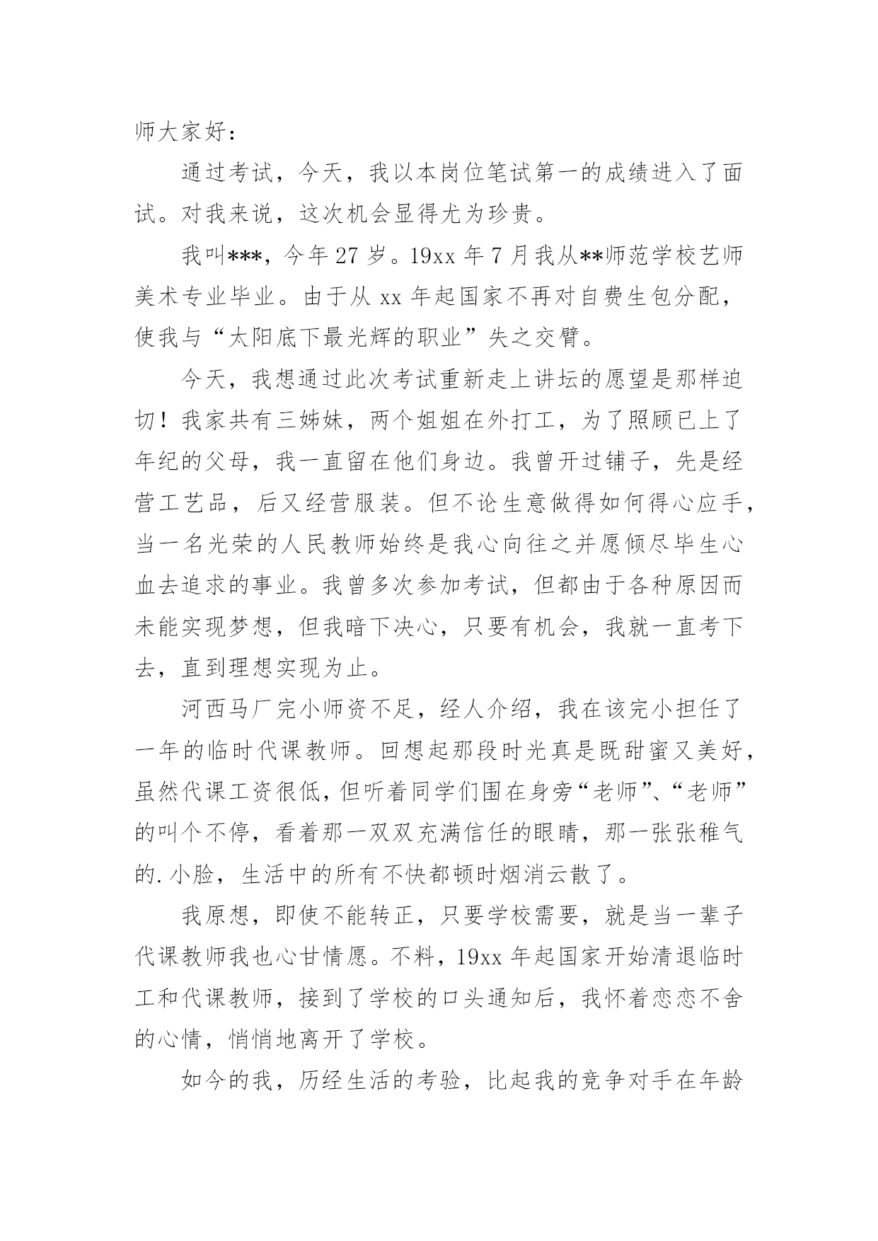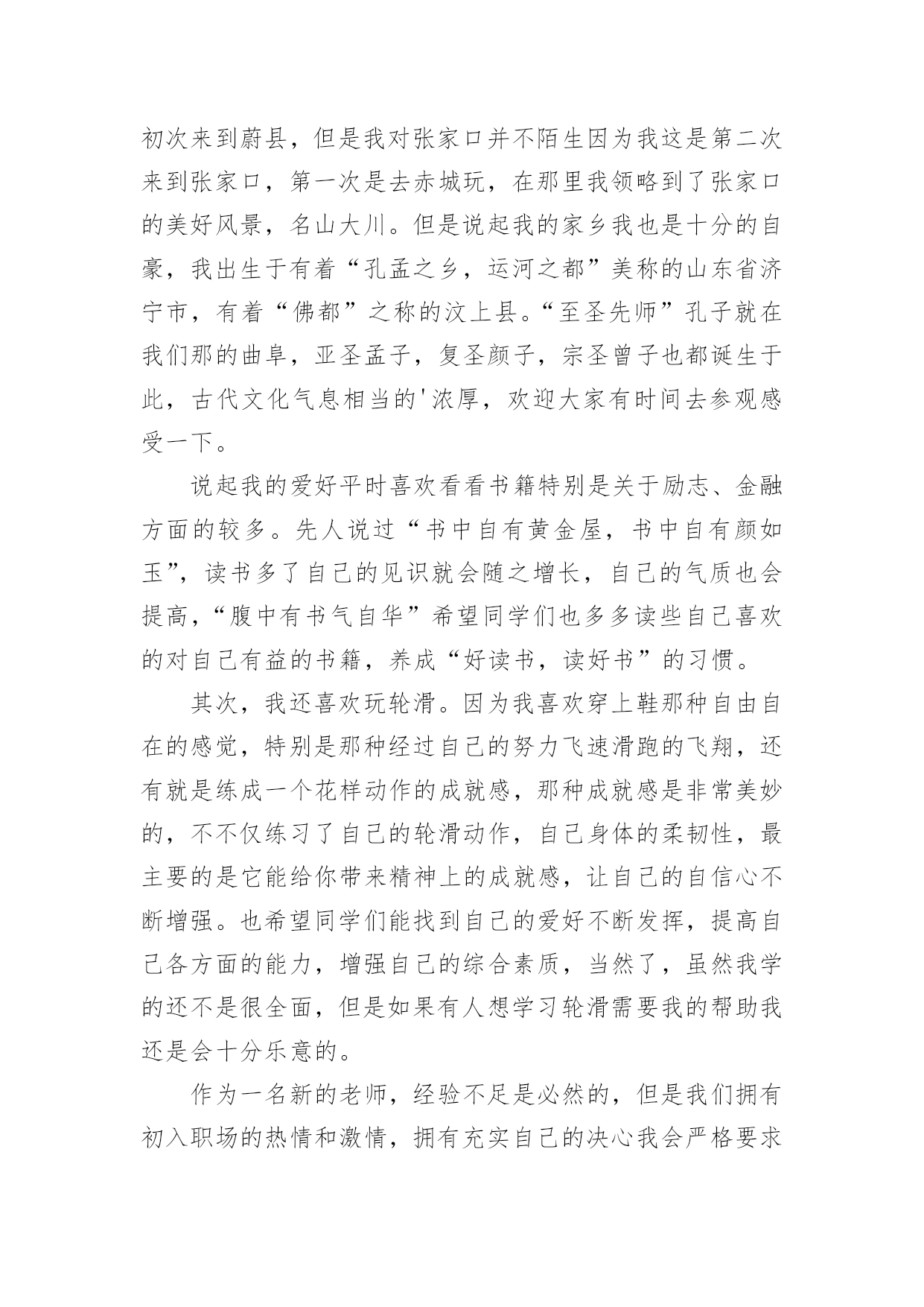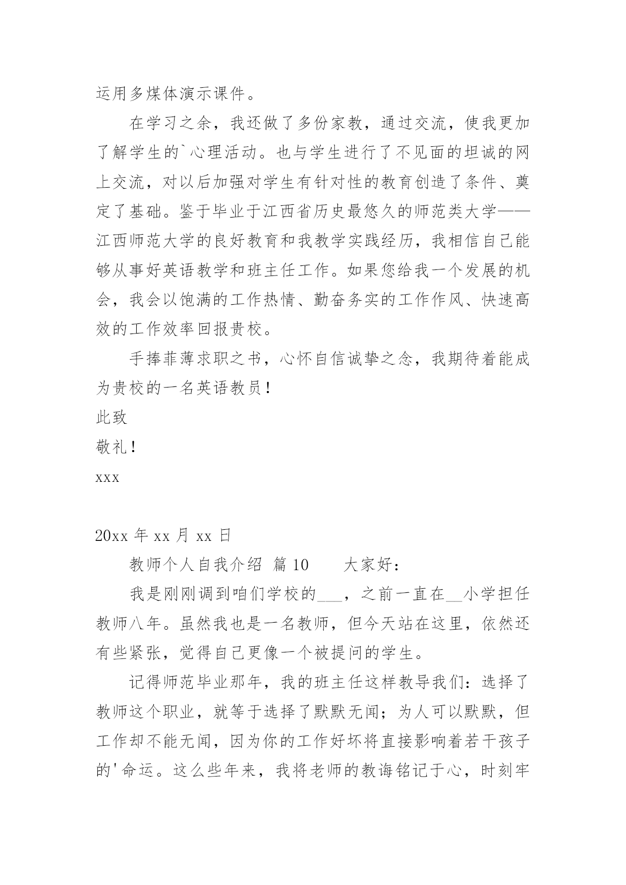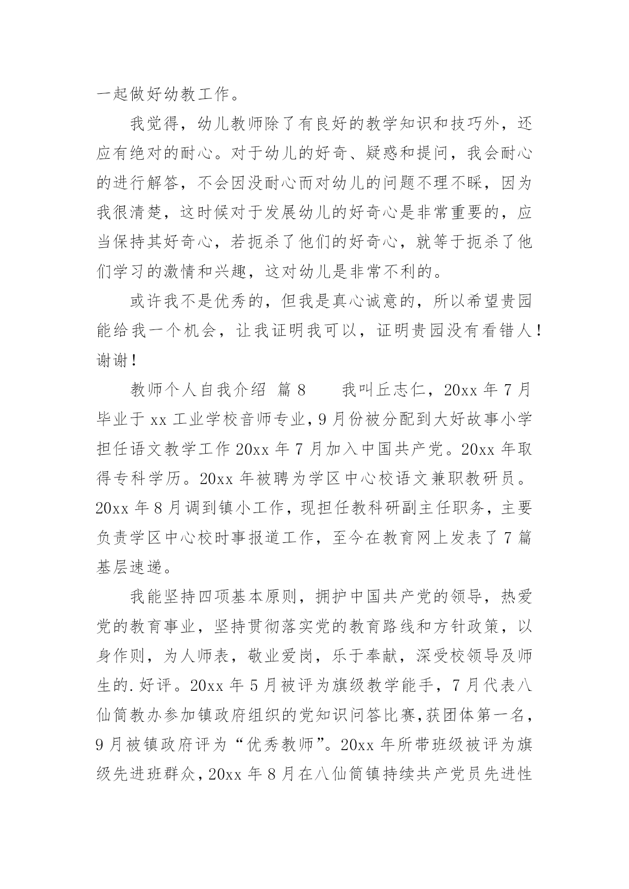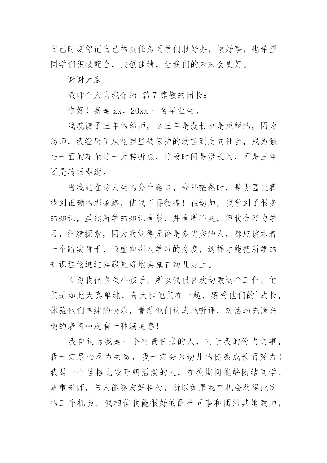 教师个人自我介绍教师个人自我介绍当到达一个陌生的环境后,我们就有可能用到自我介绍,通过自我介绍可以让他人了解我们。相信许多人会觉得自我介绍很难写吧,以下是小编精心整理的教师个人自我介绍,仅供参考,希望能够帮助到大家。教师个人自我介绍篇1尊敬的学校领导:你们好,我叫xx,我毕业于xxx师范学院幼师专业,今年xx岁,有爱心和责任心,对于不同阶段的幼儿,能针对小朋友因材施教.我先后在xxx省xxx市xxx师范大学附属幼儿园、xxx省xxx县幼儿园和xxx市xxx街外国语学校xxx国际幼稚园这三所幼儿园分别实习过一到两个月,后又在xxx街外国语学校小学部实习一个月,在幼儿园实习任教期间,有耐心能和小朋友一起完成学习和游戏,并在生活上主动关心和帮助.不仅教会小朋友学习课本上的知识,而且还注重培养他们的`学习兴趣,在组织活动中培养团队的合作能力及各方面能力让每位小朋友都能充分的展示自己,发挥出自己的优势。在工作中我积极进取,吃苦耐劳,在实践中成长很多,丰富了我的专业,学到了更多更实用的知识,也深得老师领导的好评。在以后工作过程中,我还要不断学习和完善自己.请领导给我一次机会,我会用实际行动去证明我的能力。教师个人自我介绍篇2xxx,中共党员,本科学历,小学高级教师。长沙市小学语文优秀教师。19xx年参加湖南省小学语文教学比武,荣获一等奖的第一名,同年10月代表湖南省参加全国语文教学比武再获二等奖。20xx年——20xx年多次代表学校担任省级,观摩课的'执教任务,并获得各级领导及专家们的一致好评。20xx年10月,作为语文学科带头人被学校派往昆明进行课题骨干培训,使自己的专业水平得以提升。撰写的经验论文多次获国家、省、市级一、二等奖。20xx年编写了《轻轻松松学作文》系列丛书,20xx年参与编写《教学兵法》一书。20xx年担任《金典》多册练习册主编。所带班级班风正,学风浓,20xx年被评为长沙市“红旗中队”。辅导学生习作参加各级各类比赛多次获特等奖及一、二等奖。教师个人自我介绍篇3大家好!我叫王xx,是小朋友师范学校的毕业生,从小我就十分崇拜教师这职业,所以,我在择校的时候就特意参加了师范学校面试,并成功的被收入小朋友教育专业,并在大学四年,一向以认真的态度对待学习。在学好专业课的同时,我也注重综合知识和综合技能的培养与提高,广泛的涉猎了文学,哲学》心理学,教育学等方面的书籍,计算机理论与操作也具有必须的水平。在教师技能方面,我勤学苦练,不断提高自身的整体水平,并在教育实习中取得优异成绩,才加了xx小朋友园的'实习工作,有必须的工作实践经验,在小朋友教师工作上取得一些的成绩,同时也得到小朋友园的认可,具备良好的教师素质,有良好的语音面貌,自然、大方、的教态,并在教学中善于创新。俗话说:航船不能没有方向,人生不能没有梦想,而我愿成为一名无私的幼师,假如,我经过了面试,成为众多小朋友教师队伍中的成员,我将不断努力学习,努力工作,把更多的欢乐和知识带给我的所有小朋友学子,决不辜负人类灵魂的工程师这个光荣的称号。教师个人自我介绍篇4各位考官好,今天能够站在这里参加面试,有机会向各位考官请教和学习,我感到非常的荣幸。希望通过这次面试能够把自己展示给大家,希望大家记住我。我叫xx,今年岁xx。汉族,法学本科。我平时喜欢看书和上网浏览信息。我的性格比较开朗,随和。能关系周围的任何事,和亲人朋友能够和睦相处,并且对生活充满了信心。我以前在***实习过,所以有一定的实践经验。在外地求学的四年中,我养成了坚强的性格,这种性格使我克服了学习和生活中的一些困难,积极进去。成为一名体育教师是我多年以来的强烈愿望。如果我有机会被录用的话,我想,我一定能够在工作中得到锻炼并实现自身的.价值。同时,我也认识到,人和工作的关系是建立在自我认知的基础上的,我认为我有能力也有信心做好这份工作。体育教师是一个神圣而高尚的职业,希望大家能够认可我,给我这个机会!教师个人自我介绍篇5尊敬的各位考官、各位评委老师大家好:通过考试,今天,我以本岗位笔试第一的成绩进入了面试。对我来说,这次机会显得尤为珍贵。我叫***,今年27岁。19xx年7月我从**师范学校艺师美术专业毕业。由于从xx年起国家不再对自费生包分配,使我与“太阳底下最光辉的职业”失之交臂。今天,我想通过此次考试重新走上讲坛的愿望是那样迫切!我家共有三姊妹,两个姐姐在外打工,为了照顾已上了年纪的父母,我一直留在他们身边。我曾开过铺子,先是经营工艺品,后又经营服装。但不论生意做得如何得心应手,当一名光荣的人民教师始终是我心向往之并愿倾尽毕生心血去追求的事业。我曾多次参加考试,但都由于各种原因而未能实现梦想,但我暗下决心,只要有机会,我就一直考下去,直到理想实现为止。河西马厂完小师资不足,经人介绍,我在该完小担任了一年的临时代