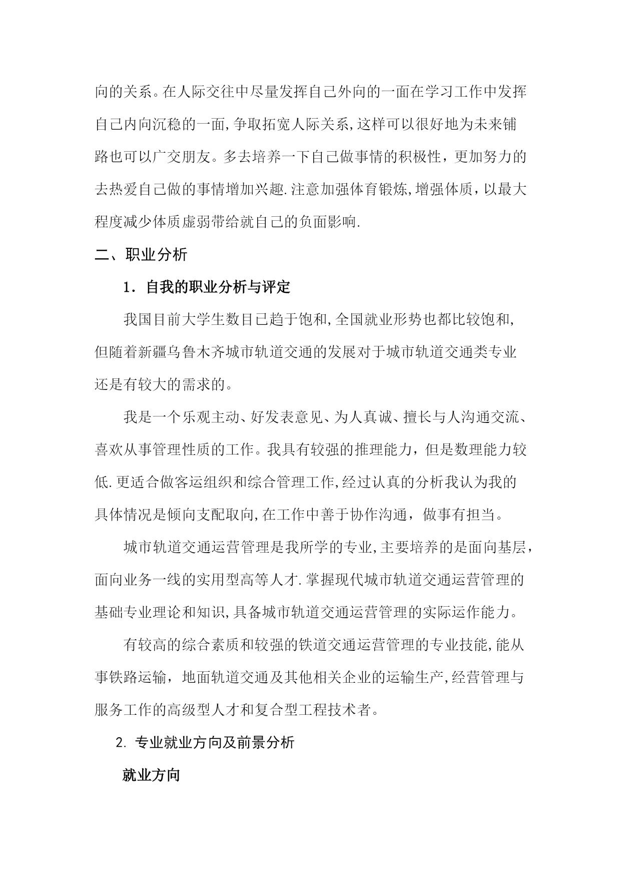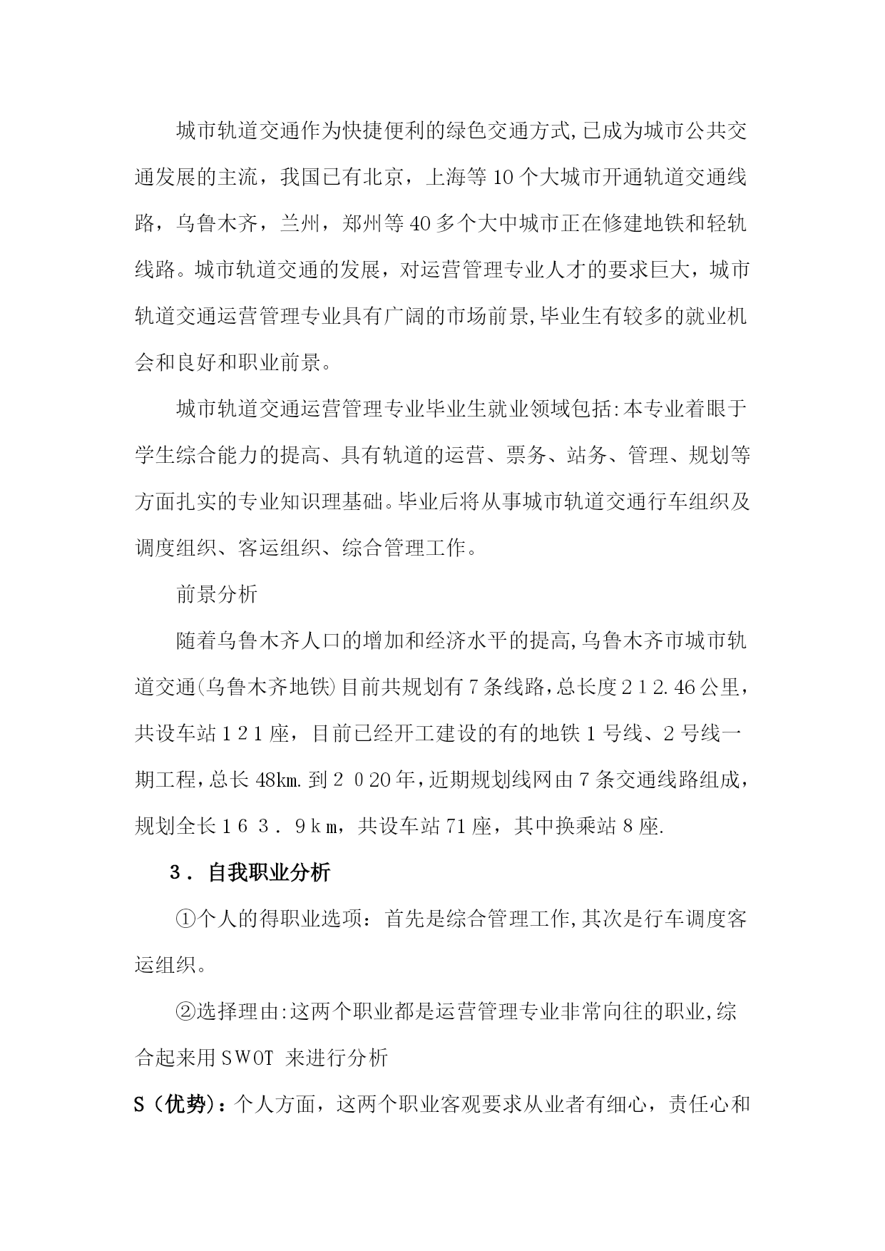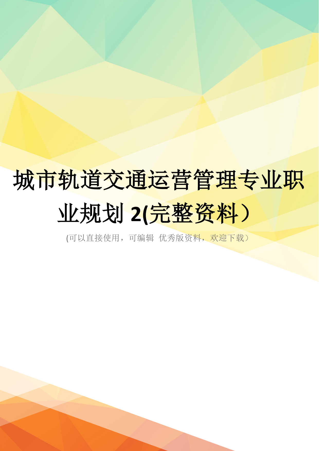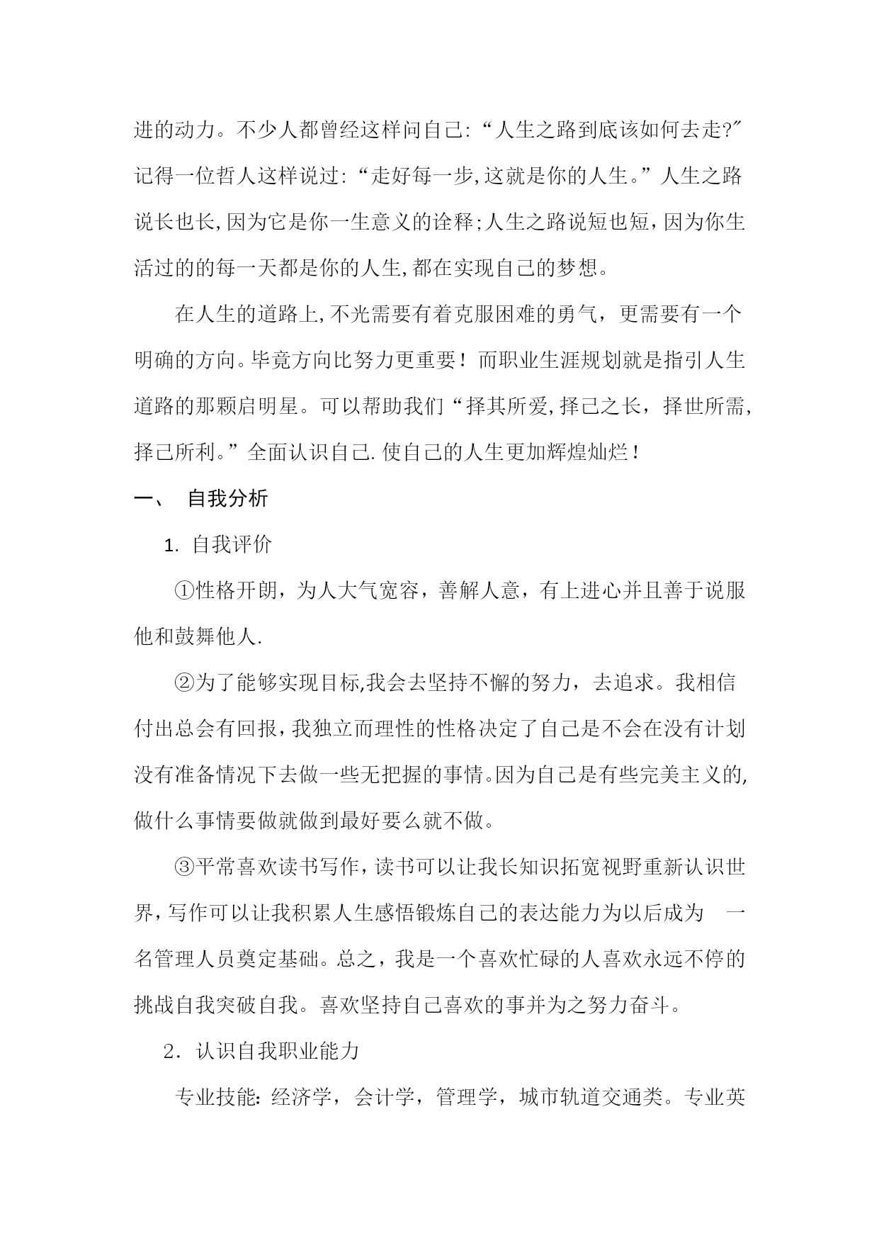 城市轨道交通运营管理专业职业规划(完整资料)(可以直接使用,可编辑优秀版资料,欢迎下载)大学生职业生涯规划设计征文比赛参赛作品姓名:学院:住址:电话:邮件:目录引言自我分析职业分析未来人生职业规划计划实施评估调整结束语引言:“Ihaveadream”--———--———马丁·路德金每个人都有一个梦想,我也不例外。小时候会梦想着飞向外太空所以想要成为一名宇航员,长大后会梦想着环游全世界所以想要成为一名探险家,现在会梦想着有很多很多的钱所以想要成为一名企业家。站在人生的十字路口上,面对滚滚人流,看事态变迁.逼着自己不得不收起曾经的稚气与天真,开始深刻的思考未来的路.在现在的社会,只有真正的人才才能称的上是真正锋利闪亮的尖刀,想成为人才应该是每个年轻人的理想。但是浑浑噩噩的度日是做不到这一点的,只有做一份适合自己的人生规划,正确的评价个人的特点和强项,才能重新认识自己的价值并且通过不断地学习使之递增.为自己提供前进的动力。不少人都曾经这样问自己:“人生之路到底该如何去走?"记得一位哲人这样说过:“走好每一步,这就是你的人生。”人生之路说长也长,因为它是你一生意义的诠释;人生之路说短也短,因为你生活过的的每一天都是你的人生,都在实现自己的梦想。在人生的道路上,不光需要有着克服困难的勇气,更需要有一个明确的方向。毕竟方向比努力更重要!而职业生涯规划就是指引人生道路的那颗启明星。可以帮助我们“择其所爱,择己之长,择世所需,择己所利。”全面认识自己.使自己的人生更加辉煌灿烂!自我分析自我评价①性格开朗,为人大气宽容,善解人意,有上进心并且善于说服他和鼓舞他人.②为了能够实现目标,我会去坚持不懈的努力,去追求。我相信付出总会有回报,我独立而理性的性格决定了自己是不会在没有计划没有准备情况下去做一些无把握的事情。因为自己是有些完美主义的,做什么事情要做就做到最好要么就不做。③平常喜欢读书写作,读书可以让我长知识拓宽视野重新认识世界,写作可以让我积累人生感悟锻炼自己的表达能力为以后成为一名管理人员奠定基础。总之,我是一个喜欢忙碌的人喜欢永远不停的挑战自我突破自我。喜欢坚持自己喜欢的事并为之努力奋斗。2.认识自我职业能力专业技能:经济学,会计学,管理学,城市轨道交通类。专业英语,专业维语。其他技能:有一定的团队合作能力,组织策划能力,创新能力,有很好的学习思考能力,吸收知识扎实到位,善于观察与总结。新疆是一个多民族的地区,这就需要我去掌握维语,幸运的是我们专业开设了基础维语课,能拥有这样便利的条件让我去学习。虽然我学习语言能力有限,但我想只有不懈的努力,一定会有所提高。也为我在乌鲁木齐地铁一号线今后的工作奠定坚实基础。3.认识自我个人特质我所学的专业为城市轨道交通运营管理属于管理类的专业,但是所谓技多不压身,所以我又自考了一门会计和计算机,而后又对财政和税收方面有多了些了解,可以深入对管理学的研究,想要成为一名合格的管理者,并不是那么简单的。你想要管理别人首先你得在技术上超越别人。其次你得让别让人对你心服口服,有自己的气场可以镇得住对方。在自己的控制里收放自如这也是成为一名合格管理者的前提。在这之前还需要制定实施方案,充分利用在学校的时间为自己补充知识和技能,多参加团队活动,使自己在团队生活中得到锻炼,多组织协调社团工作,并且通过进行多次社团活动,积极改进,逐步完善,得到自己想要的结果。为今后的团队工作积累经验在团队中可以更好地发挥自己的作用。4.认识自我的价值观我认为协调是最重要的,用辩证的方法看问题,人要对社会做出贡献,但不是完全脱离自我的需求,应该尽量把自身同社会要求起来,达到双方满足,互惠互利。同时我们要对社会抱一种乐观向上的态度,对任何事物都要看到其积极向上的一面,并且以此来激励自己进步,创造出更好地人生价值。5.自我的能力的认知我的优势能力我的弱势能力①坚持自己的观点有积极上进的心态②能对未来有清醒的认识,目标较明确③善于思考,不人云亦云④思维分析实力相对较强,思维活跃⑤谦虚踏实,为人善良⑥人生活实力较强,能不依赖他人①人际交往中主动性差②在一些问题上急于求成③懒惰性强,缺乏恒心④对自己信心不足,错失很多机会⑤易烦躁有时不冷静⑥缺乏体育锻炼6.解决自我分析中的劣势和缺点尽管自己有时候缺乏信心,恒心,和毅力,但是凭借自己的热度和对未来的比较清楚的认识,我相信我会逐渐的培养起自己的恒心。自己在未来的发展中应当注意下性格的培养,应当处理一下内向和外向的关系。在人际交往中尽量发挥自己外向的一面在学习工作中发挥自己内向沉稳的一面,争取拓宽人际关系,这样可以很好地为未来铺路也可以广交朋友。多去培养一下自己做事情的积极性