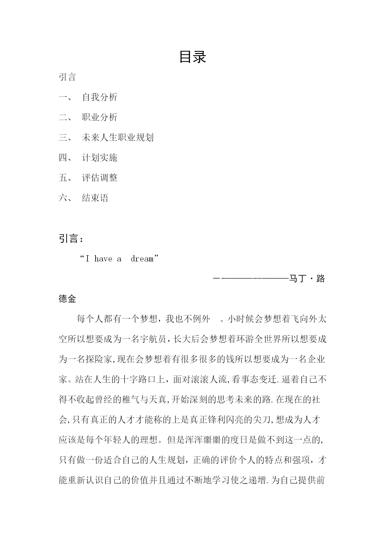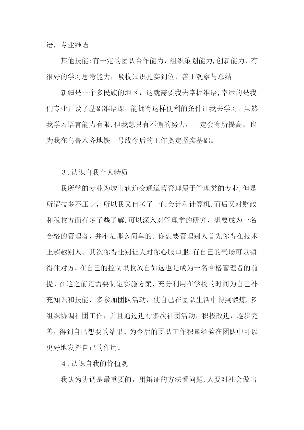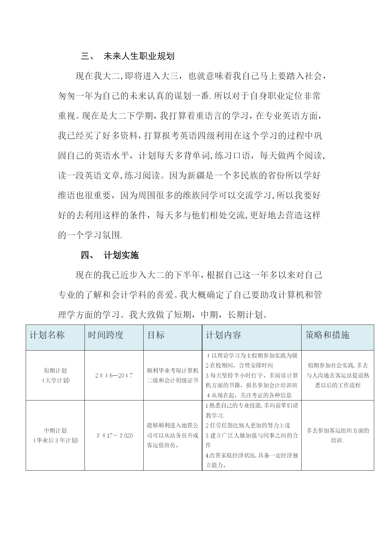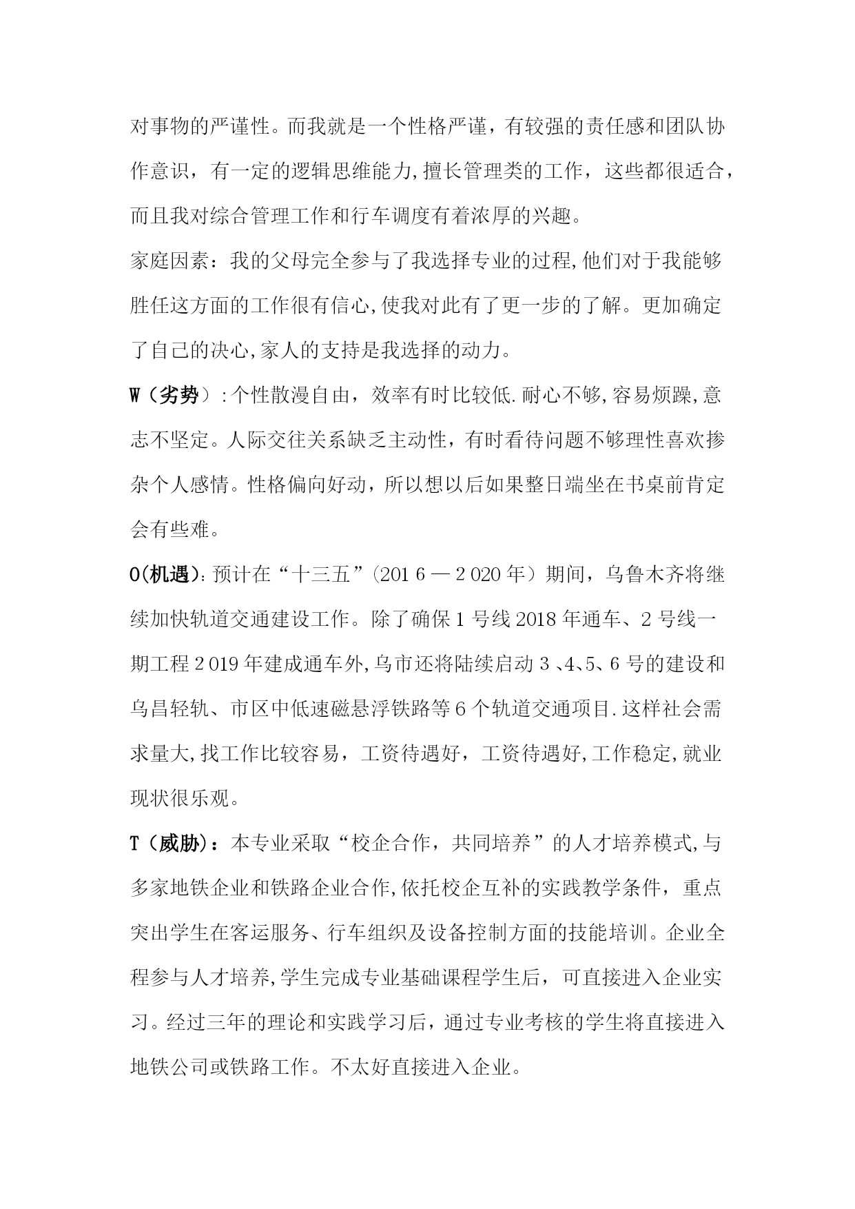 城市轨道交通运营管理专业职业规划(完整资料)(可以直接使用,可编辑优秀版资料,欢迎下载)大学生职业生涯规划设计征文比赛参赛作品姓名:学院:住址:电话:邮件:目录引言自我分析职业分析未来人生职业规划计划实施评估调整结束语引言:“Ihaveadream”--———--———马丁·路德金每个人都有一个梦想,我也不例外。小时候会梦想着飞向外太空所以想要成为一名宇航员,长大后会梦想着环游全世界所以想要成为一名探险家,现在会梦想着有很多很多的钱所以想要成为一名企业家。站在人生的十字路口上,面对滚滚人流,看事态变迁.逼着自己不得不收起曾经的稚气与天真,开始深刻的思考未来的路.在现在的社会,只有真正的人才才能称的上是真正锋利闪亮的尖刀,想成为人才应该是每个年轻人的理想。但是浑浑噩噩的度日是做不到这一点的,只有做一份适合自己的人生规划,正确的评价个人的特点和强项,才能重新认识自己的价值并且通过不断地学习使之递增.为自己提供前进的动力。不少人都曾经这样问自己:“人生之路到底该如何去走?"记得一位哲人这样说过:“走好每一步,这就是你的人生。”人生之路说长也长,因为它是你一生意义的诠释;人生之路说短也短,因为你生活过的的每一天都是你的人生,都在实现自己的梦想。在人生的道路上,不光需要有着克服困难的勇气,更需要有一个明确的方向。毕竟方向比努力更重要!而职业生涯规划就是指引人生道路的那颗启明星。可以帮助我们“择其所爱,择己之长,择世所需,择己所利。”全面认识自己.使自己的人生更加辉煌灿烂!自我分析自我评价①性格开朗,为人大气宽容,善解人意,有上进心并且善于说服他和鼓舞他人.②为了能够实现目标,我会去坚持不懈的努力,去追求。我相信付出总会有回报,我独立而理性的性格决定了自己是不会在没有计划没有准备情况下去做一些无把握的事情。因为自己是有些完美主义的,做什么事情要做就做到最好要么就不做。③平常喜欢读书写作,读书可以让我长知识拓宽视野重新认识世界,写作可以让我积累人生感悟锻炼自己的表达能力为以后成为一名管理人员奠定基础。总之,我是一个喜欢忙碌的人喜欢永远不停的挑战自我突破自我。喜欢坚持自己喜欢的事并为之努力奋斗。2.认识自我职业能力专业技能:经济学,会计学,管理学,城市轨道交通类。专业英语,专业维语。其他技能:有一定的团队合作能力,组织策划能力,创新能力,有很好的学习思考能力,吸收知识扎实到位,善于观察与总结。新疆是一个多民族的地区,这就需要我去掌握维语,幸运的是我们专业开设了基础维语课,能拥有这样便利的条件让我去学习。虽然我学习语言能力有限,但我想只有不懈的努力,一定会有所提高。也为我在乌鲁木齐地铁一号线今后的工作奠定坚实基础。3.认识自我个人特质我所学的专业为城市轨道交通运营管理属于管理类的专业,但是所谓技多不压身,所以我又自考了一门会计和计算机,而后又对财政和税收方面有多了些了解,可以深入对管理学的研究,想要成为一名合格的管理者,并不是那么简单的。你想要管理别人首先你得在技术上超越别人。其次你得让别让人对你心服口服,有自己的气场可以镇得住对方。在自己的控制里收放自如这也是成为一名合格管理者的前提。在这之前还需要制定实施方案,充分利用在学校的时间为自己补充知识和技能,多参加团队活动,使自己在团队生活中得到锻炼,多组织协调社团工作,并且通过进行多次社团活动,积极改进,逐步完善,得到自己想要的结果。为今后的团队工作积累经验在团队中可以更好地发挥自己的作用。4.认识自我的价值观我认为协调是最重要的,用辩证的方法看问题,人要对社会做出贡献,但不是完全脱离自我的需求,应该尽量把自身同社会要求起来,达到双方满足,互惠互利。同时我们要对社会抱一种乐观向上的态度,对任何事物都要看到其积极向上的一面,并且以此来激励自己进步,创造出更好地人生价值。5.自我的能力的认知我的优势能力我的弱势能力①坚持自己的观点有积极上进的心态②能对未来有清醒的认识,目标较明确③善于思考,不人云亦云④思维分析实力相对较强,思维活跃⑤谦虚踏实,为人善良⑥人生活实力较强,能不依赖他人①人际交往中主动性差②在一些问题上急于求成③懒惰性强,缺乏恒心④对自己信心不足,错失很多机会⑤易烦躁有时不冷静⑥缺乏体育锻炼6.解决自我分析中的劣势和缺点尽管自己有时候缺乏信心,恒心,和毅力,但是凭借自己的热度和对未来的比较清楚的认识,我相信我会逐渐的培养起自己的恒心。自己在未来的发展中应当注意下性格的培养,应当处理一下内向和外向的关系。在人际交往中尽量发挥自己外向的一面在学习工作中发挥自己内向沉稳的一面,争取拓宽人际关系,这样可以很好地为未来铺路也可以广交朋友。多去培养一下自己做事情的积极性