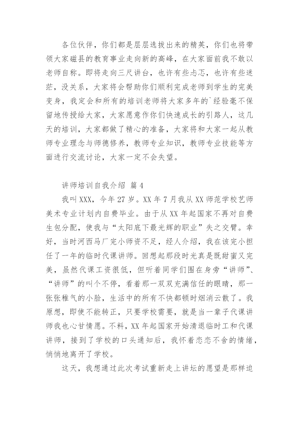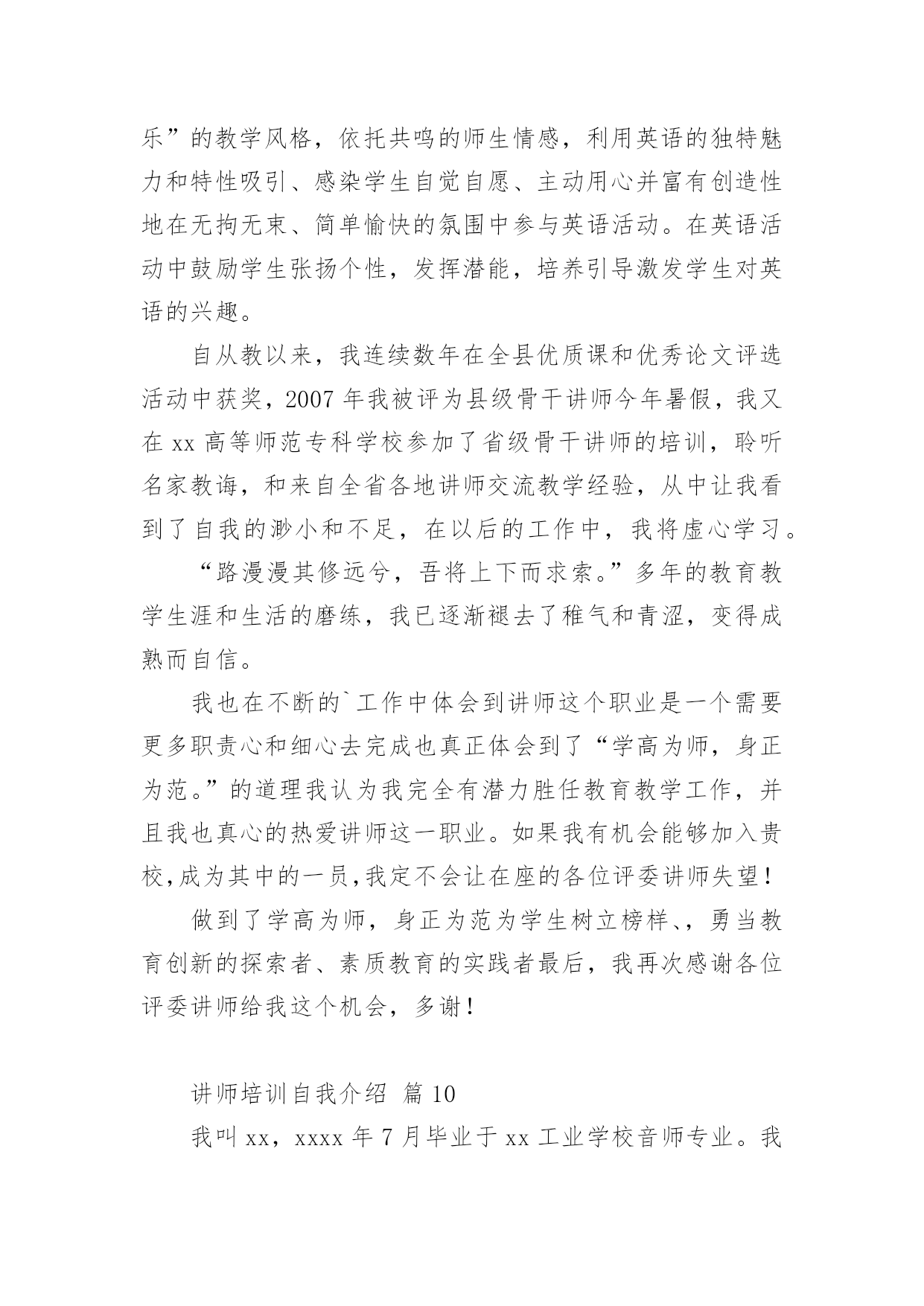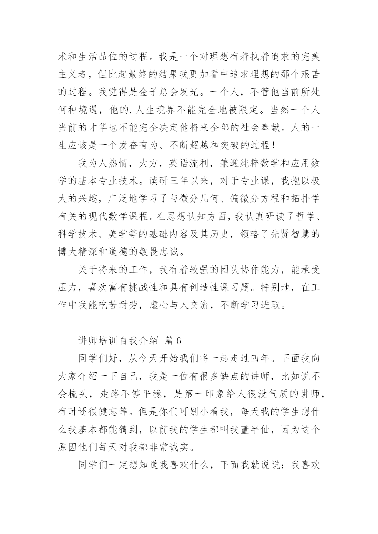 讲师培训自我介绍当到达一个新的环境后,通常需要我们进行自我介绍,自我介绍是一种认识自我的手段。那么什么样的自我介绍才合适呢?以下是小编精心整理的讲师培训自我介绍,仅供参考,大家一起来看看吧。讲师培训自我介绍篇1我的名字叫X,来自X,今年X岁,毕业于X学院汽车建筑工程系。昨天在X信息中看到贵公司发布了聘请广告,我很喜爱这个职位。三载匆忙,如今的我深深懂得:昨天的成果已成为历史,将来的辉煌要用今天脚踏实地锲而不舍地努力去完成。在我离校的时分,我携带着学到的学问和年轻人满腔的热忱与幻想,真诚而又诚心地向贵单位求职。在校期间我也常常阅读课外书物,以增长学问,还学到了许多做人的道理,只有老实努力才能胜利。也阅读了许多关于销售的书籍,积累了一些学问,只是还没有验证的时机,希望领导赐予我一个展现自己的舞台。我非常喜爱汽车销售这个工作,我会用我全部的'学问和热忱来完成这个工作。我之所以应聘这份工作,由于我具有以下条件:丰富的理论学问和娴熟的实践技能;良好的顺应力量,能吃苦,做事认真、踏实;充实的头脑、健康的体魄和充分的精力。讲师培训自我介绍篇2各位同学好,我是你们班的新语文讲师,以后负责上你们班的语文课。目前虽然大家对我并不熟悉,但是我希望以后各位同学都支持我的工作,好好学习。我的名字叫XX,毕业于XX师范大学汉语言文学专业,很高兴我能成为一名讲师,尤其是当你们这么聪明的同学的讲师。我教的是语文,但是我的风格不是枯燥的,我要把语文课上得像历史课一样具备趣味性。请大家以后的学习中积极给我提意见,我第一次做讲师,有很多都不懂,我也是一个学习的`过程,向你们学习如何做一个好讲师,合格的讲师。我相信只要经过我们共同的努力,我会学到如何做好一个讲师的经验以及能力,你们也会在新一学期的学习成绩里面创一新高。讲师培训自我介绍篇3各位领导,各位伙伴:大家上午好!我是一名来自一线的普通教师xxx,能作为一名培训教师站在这里发言,既兴奋又深感责任重大,我此时的心情归结为两个字就是“感谢”。感谢各位领导为大家教师队伍注入新的血液、并为大家搭建了这样的学习、交流平台,感谢各位伙伴在这个物欲横流的时代,选择了教师这个高尚而有相对清贫的行业,感谢大家冒着酷暑参加大家这次培训。各位伙伴,你们都是层层选拔出来的精英,你们也将带领大家磁县的教育事业走向新的高峰,在大家面前我不敢以老师自称。即将走向三尺讲台,也许有些忐忑,也许有些迷茫,没关系,大家将会帮助你们顺利完成老师到学生的完美变身,我定会和所有的培训老师将大家多年的`经验毫不保留地传授给大家,大家愿意作你们快速成长的引路人,这几天的培训,大家都做了精心的准备,大家将和大家一起从教师专业理念与师德修养,教师专业知识,教师专业技能等方面进行交流讨论,大家一定不会失望。讲师培训自我介绍篇4我叫XXX,今年27岁。XX年7月我从XX师范学校艺师美术专业计划内自费毕业。由于从XX年起国家不再对自费生包分配,使我与“太阳底下最光辉的职业”失之交臂。幸好,当时河西马厂完小师资不足,经人介绍,我在该完小担任了一年的临时代课讲师。回想起那段时光真是既甜蜜又完美,虽然代课工资很低,但听着同学们围在身旁“讲师”、“讲师”的叫个不停,看着那一双双充满信任的眼睛,那一张张稚气的小脸,生活中的所有不快都顿时烟消云散了。我原想,即使不能转正,只要学校需要,就是当一辈子代课讲师我也心甘情愿。不料,XX年起国家开始清退临时工和代课讲师,接到了学校的口头通知后,我怀着恋恋不舍的情绪,悄悄地离开了学校。这天,我想通过此次考试重新走上讲坛的愿望是那样迫切!我家共有三姊妹,两个姐姐在外打工,为了照顾已上了年纪的`父母,我一向留在他们身边。我曾开过铺子,先是经营工艺品,后又经营服装。但不论生意做得如何得心应手,当一名光荣的人民讲师始终是我心向往之并愿倾尽毕生心血去追求的事业。我曾多次参加考试,但都由于各种原因而未能实现梦想,但我暗下决心,只要有机会,我就一向考下去,直到理想实现为止。如今的我,历经生活的考验,比起我的竞争对手在年龄上我已不再有优势,但是我比他们更多了一份对孩子的爱心、耐心和职责心,更多了一份成熟和自信。讲师这个职业是神圣而伟大的,他要求讲师不仅仅要有丰富的知识,还要有高尚的情操。因此,在读师范时,我就十分注重自身的全面发展,广泛地培养自我的兴趣爱好,并学有专长,做到除擅长绘画和书法外,还能会唱、会说、会讲。“学高仅能为师,身正方能为范”,在注重知识学习的同时我还注意培养自我高尚的道德情操,自觉遵纪守法,遵守社会公德,没有不良嗜好和行为。我想这些都是一名教育工作者就应具备的最起码的素养。假如,我通过了面试,成为众多讲师队伍中的成员,我将不断努力学习,努力工作,为家乡的教育事业贡献自我的力量,决不辜负“人类灵魂的工程师”这个光荣的称号。讲师培训自我