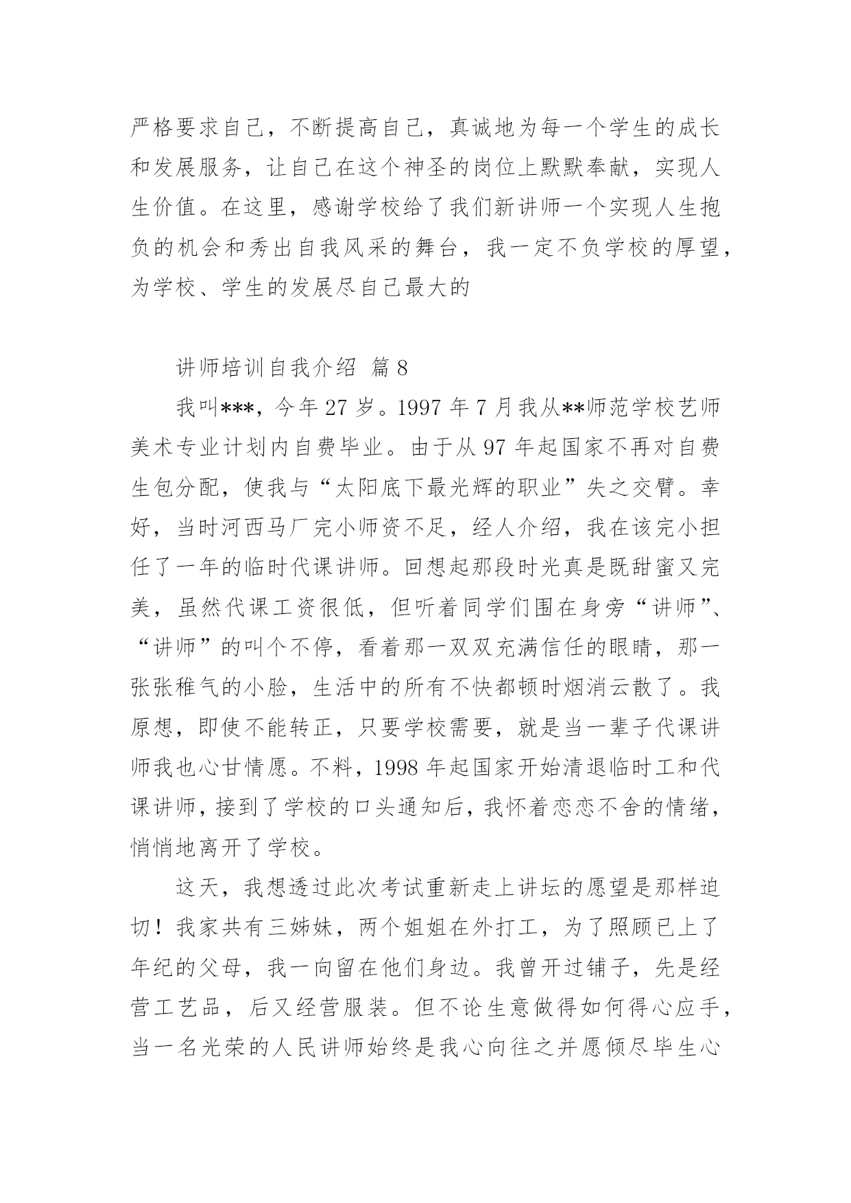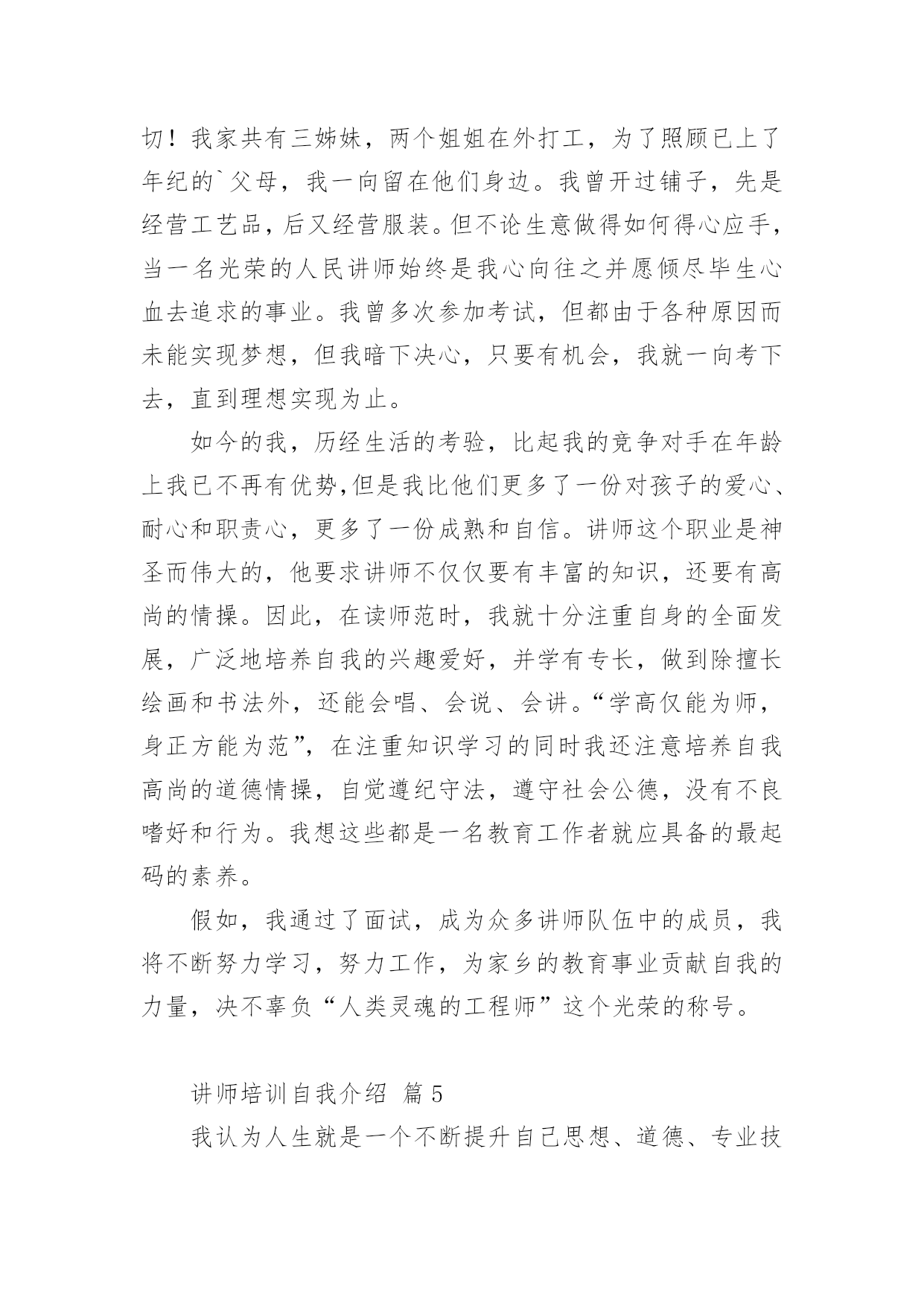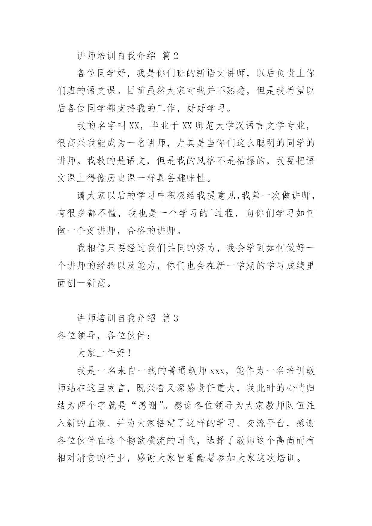 讲师培训自我介绍当到达一个新的环境后,通常需要我们进行自我介绍,自我介绍是一种认识自我的手段。那么什么样的自我介绍才合适呢?以下是小编精心整理的讲师培训自我介绍,仅供参考,大家一起来看看吧。讲师培训自我介绍篇1我的名字叫X,来自X,今年X岁,毕业于X学院汽车建筑工程系。昨天在X信息中看到贵公司发布了聘请广告,我很喜爱这个职位。三载匆忙,如今的我深深懂得:昨天的成果已成为历史,将来的辉煌要用今天脚踏实地锲而不舍地努力去完成。在我离校的时分,我携带着学到的学问和年轻人满腔的热忱与幻想,真诚而又诚心地向贵单位求职。在校期间我也常常阅读课外书物,以增长学问,还学到了许多做人的道理,只有老实努力才能胜利。也阅读了许多关于销售的书籍,积累了一些学问,只是还没有验证的时机,希望领导赐予我一个展现自己的舞台。我非常喜爱汽车销售这个工作,我会用我全部的'学问和热忱来完成这个工作。我之所以应聘这份工作,由于我具有以下条件:丰富的理论学问和娴熟的实践技能;良好的顺应力量,能吃苦,做事认真、踏实;充实的头脑、健康的体魄和充分的精力。讲师培训自我介绍篇2各位同学好,我是你们班的新语文讲师,以后负责上你们班的语文课。目前虽然大家对我并不熟悉,但是我希望以后各位同学都支持我的工作,好好学习。我的名字叫XX,毕业于XX师范大学汉语言文学专业,很高兴我能成为一名讲师,尤其是当你们这么聪明的同学的讲师。我教的是语文,但是我的风格不是枯燥的,我要把语文课上得像历史课一样具备趣味性。请大家以后的学习中积极给我提意见,我第一次做讲师,有很多都不懂,我也是一个学习的`过程,向你们学习如何做一个好讲师,合格的讲师。我相信只要经过我们共同的努力,我会学到如何做好一个讲师的经验以及能力,你们也会在新一学期的学习成绩里面创一新高。讲师培训自我介绍篇3各位领导,各位伙伴:大家上午好!我是一名来自一线的普通教师xxx,能作为一名培训教师站在这里发言,既兴奋又深感责任重大,我此时的心情归结为两个字就是“感谢”。感谢各位领导为大家教师队伍注入新的血液、并为大家搭建了这样的学习、交流平台,感谢各位伙伴在这个物欲横流的时代,选择了教师这个高尚而有相对清贫的行业,感谢大家冒着酷暑参加大家这次培训。各位伙伴,你们都是层层选拔出来的精英,你们也将带领大家磁县的教育事业走向新的高峰,在大家面前我不敢以老师自称。即将走向三尺讲台,也许有些忐忑,也许有些迷茫,没关系,大家将会帮助你们顺利完成老师到学生的完美变身,我定会和所有的培训老师将大家多年的`经验毫不保留地传授给大家,大家愿意作你们快速成长的引路人,这几天的培训,大家都做了精心的准备,大家将和大家一起从教师专业理念与师德修养,教师专业知识,教师专业技能等方面进行交流讨论,大家一定不会失望。讲师培训自我介绍篇4我叫XXX,今年27岁。XX年7月我从XX师范学校艺师美术专业计划内自费毕业。由于从XX年起国家不再对自费生包分配,使我与“太阳底下最光辉的职业”失之交臂。幸好,当时河西马厂完小师资不足,经人介绍,我在该完小担任了一年的临时代课讲师。回想起那段时光真是既甜蜜又完美,虽然代课工资很低,但听着同学们围在身旁“讲师”、“讲师”的叫个不停,看着那一双双充满信任的眼睛,那一张张稚气的小脸,生活中的所有不快都顿时烟消云散了。我原想,即使不能转正,只要学校需要,就是当一辈子代课讲师我也心甘情愿。不料,XX年起国家开始清退临时工和代课讲师,接到了学校的口头通知后,我怀着恋恋不舍的情绪,悄悄地离开了学校。这天,我想通过此次考试重新走上讲坛的愿望是那样迫切!我家共有三姊妹,两个姐姐在外打工,为了照顾已上了年纪的`父母,我一向留在他们身边。我曾开过铺子,先是经营工艺品,后又经营服装。但不论生意做得如何得心应手,当一名光荣的人民讲师始终是我心向往之并愿倾尽毕生心血去追求的事业。我曾多次参加考试,但都由于各种原因而未能实现梦想,但我暗下决心,只要有机会,我就一向考下去,直到理想实现为止。如今的我,历经生活的考验,比起我的竞争对手在年龄上我已不再有优势,但是我比他们更多了一份对孩子的爱心、耐心和职责心,更多了一份成熟和自信。讲师这个职业是神圣而伟大的,他要求讲师不仅仅要有丰富的知识,还要有高尚的情操。因此,在读师范时,我就十分注重自身的全面发展,广泛地培养自我的兴趣爱好,并学有专长,做到除擅长绘画和书法外,还能会唱、会说、会讲。“学高仅能为师,身正方能为范”,在注重知识学习的同时我还注意培养自我高尚的道德情操,自觉遵纪守法,遵守社会公德,没有不良嗜好和行为。我想这些都是一名教育工作者就应具备的最起码的素养。假如,我通过了面试,成为众多讲师队伍中的成员,我将不断努力学习,努力工作,为家乡的教育事业贡献自我的力量,决不辜负“人类灵魂的工程师”这个光荣的称号。讲师培训自我