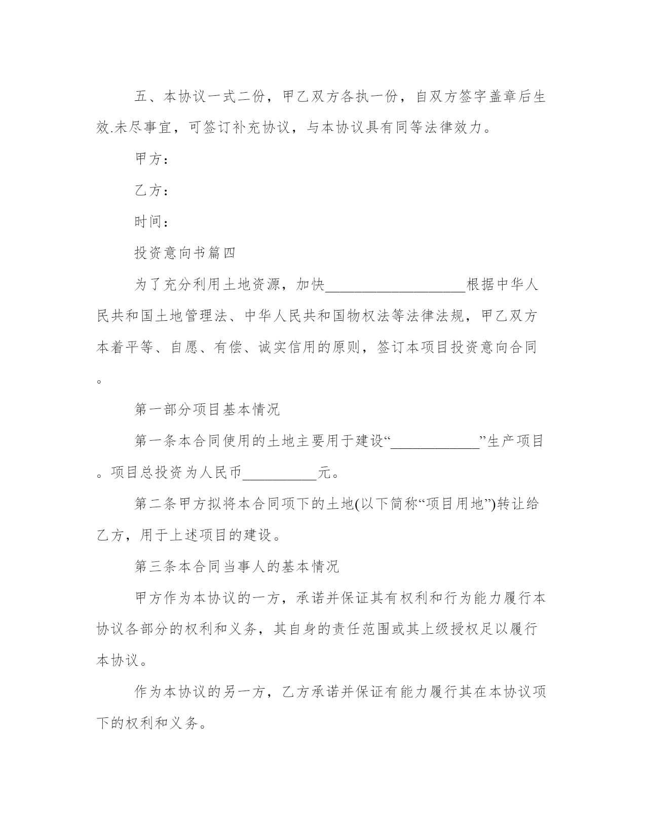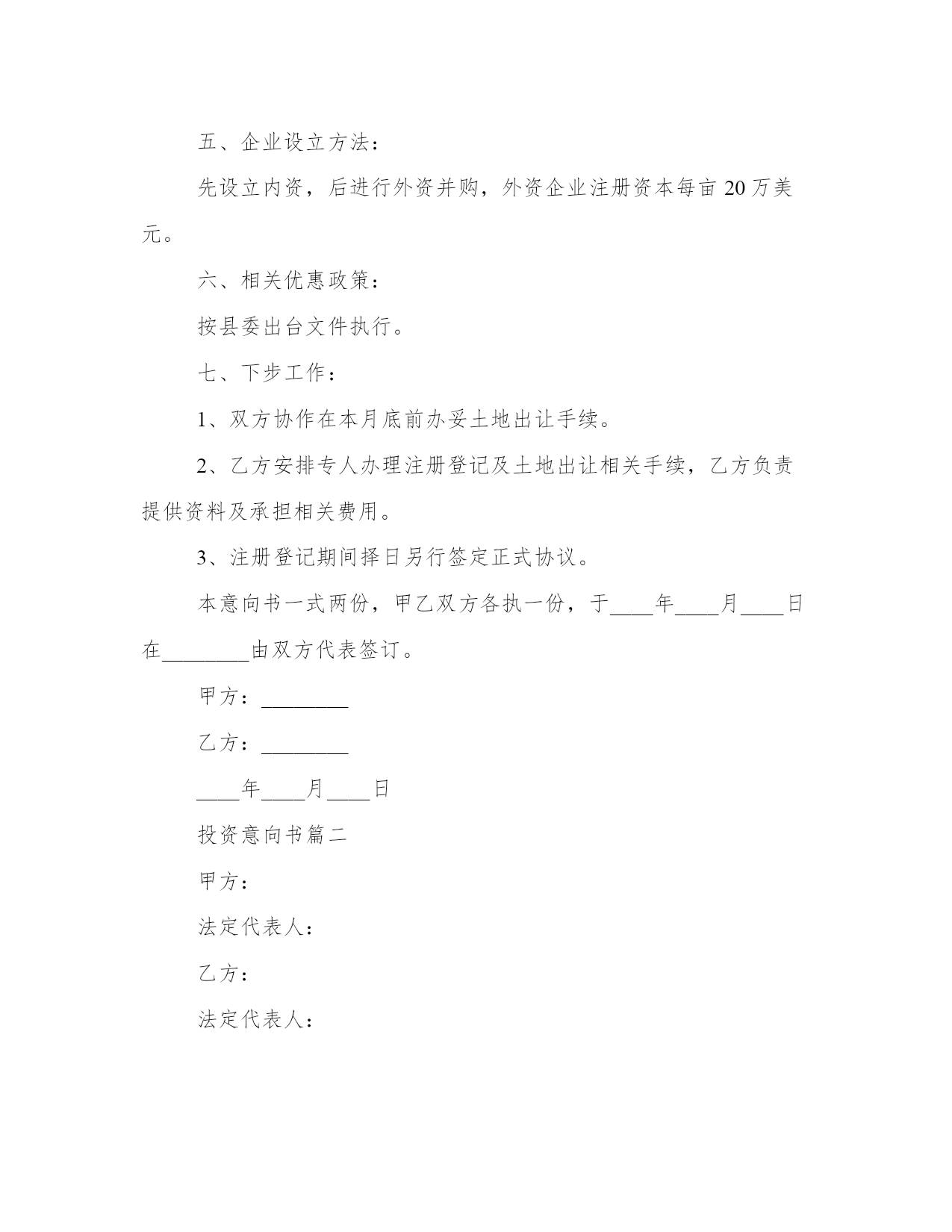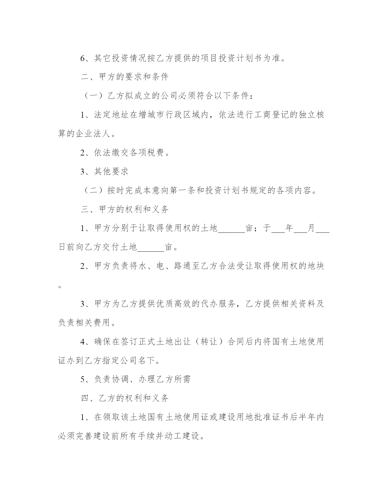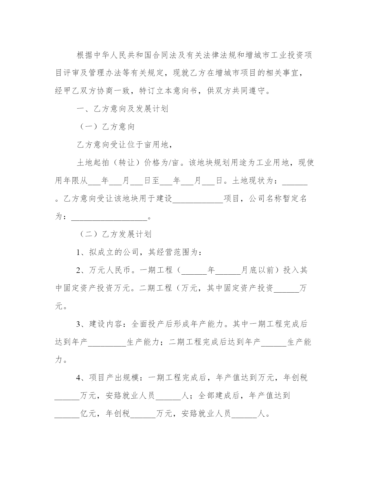 最新投资意向书(通用16篇)散文是一种抒发感情和思考的形式,可以自由表达个人的观点和情感。逻辑是一种思维方式,是按照因果关系和前后顺序进行思考和推理的能力。以下是一些经典电影的推荐,让我们一起享受电影的魅力。投资意向书篇一立意向双方:投资方:________________以下简称甲方接洽方:_________________以下简称乙方经实地考察,甲方有意在乙方工业集中区投资新办工业项目,双方自愿,达成意向如下:一、项目内容及规模:服装生产线,设备____台套,厂房____平方米,附房____平方米,总投入____万元。二、项目拟定企业名称:三、项目选址占地:约36亩(以红线图为准),位于镇中工业集中区,公司南侧。四、土地使用方式:一次性出让50年,出让价50000元/亩,但必须在2006年九月底前办好土地出让合同,逾期若遇上级政策调整,按调整价格执行。五、企业设立方法:先设立内资,后进行外资并购,外资企业注册资本每亩20万美元。六、相关优惠政策:按县委出台文件执行。七、下步工作:1、双方协作在本月底前办妥土地出让手续。2、乙方安排专人办理注册登记及土地出让相关手续,乙方负责提供资料及承担相关费用。3、注册登记期间择日另行签定正式协议。本意向书一式两份,甲乙双方各执一份,于____年____月____日在________由双方代表签订。甲方:________乙方:____________年____月____日投资意向书篇二甲方:法定代表人:乙方:法定代表人:根据中华人民共和国合同法及有关法律法规和增城市工业投资项目评审及管理办法等有关规定,现就乙方在增城市项目的相关事宜,经甲乙双方协商一致,特订立本意向书,供双方共同遵守。一、乙方意向及发展计划(一)乙方意向乙方意向受让位于亩用地,土地起拍(转让)价格为/亩。该地块规划用途为工业用地,现使用年限从___年___月___日至___年___月___日。土地现状为:______。乙方意向受让该地块用于建设____________项目,公司名称暂定名为:__________________。(二)乙方发展计划1、拟成立的公司,其经营范围为:2、万元人民币。一期工程(______年______月底以前)投入其中固定资产投资万元。二期工程(万元,其中固定资产投资______万元。3、建设内容:全面投产后形成年产能力。其中一期工程完成后达到年产_________生产能力;二期工程完成后达到年产______生产能力。4、项目产出规模:一期工程完成后,年产值达到万元,年创税______万元,安臵就业人员______人;全部建成后,年产值达到______亿元,年创税______万元,安臵就业人员______人。6、其它投资情况按乙方提供的项目投资计划书为准。二、甲方的要求和条件(一)乙方拟成立的公司必须符合以下条件:1、法定地址在增城市行政区域内,依法进行工商登记的独立核算的企业法人。2、依法缴交各项税费。3、其他要求(二)按时完成本意向第一条和投资计划书规定的各项内容。三、甲方的权利和义务1、甲方分别于让取得使用权的土地______亩;于___年___月___日前向乙方交付土地______亩。2、甲方负责将水、电、路通至乙方合法受让取得使用权的地块。3、甲方为乙方提供优质高效的代办服务,乙方提供相关资料及负责相关费用。4、确保在签订正式土地出让(转让)合同后内将国有土地使用证办到乙方指定公司名下。5、负责协调、办理乙方所需四、乙方的权利和义务1、在领取该土地国有土地使用证或建设用地批准证书后半年内必须完善建设前所有手续并动工建设。2、参与土地招拍挂,取得转让土地后,按协议要求使用土地,不得倒卖土地和擅自改变用地性质与用途。3、规范经营行为,服从主管部门的管理;按时上报企业财务报表;按有关部门要求及时提供各种资料。4、按甲方办证需要,及时配合并提供有关资料、证照。五、违约责任本意向书签字生效后,任何一方违反意向书规定条款均为违约。若甲方违约,须赔偿乙方已投入资金;若乙方违约,甲方有权视情况收回土地。六、未尽事宜本着有利于项目建设的原则,经双方协商后签订补充意向条款。七、本意向书一式两份,甲、乙双方各执一份,经双方签章后生效。甲方(签章)乙方(签章):代表:代表:日期:日期:投资意向书篇三甲方:乙方:甲方分别在新疆和内蒙古自治区承揽了部分风力发电机座和煤矿土石方剥离工程施工项目,为了确保工程按时开工,经甲乙双方充分协商达成共识,由乙方投入一定数额资金,共同合作施工。现就相关事宜签订协议如下:一、乙方投资人民币壹佰万元给甲方,用于工程启动。具体支付方式为