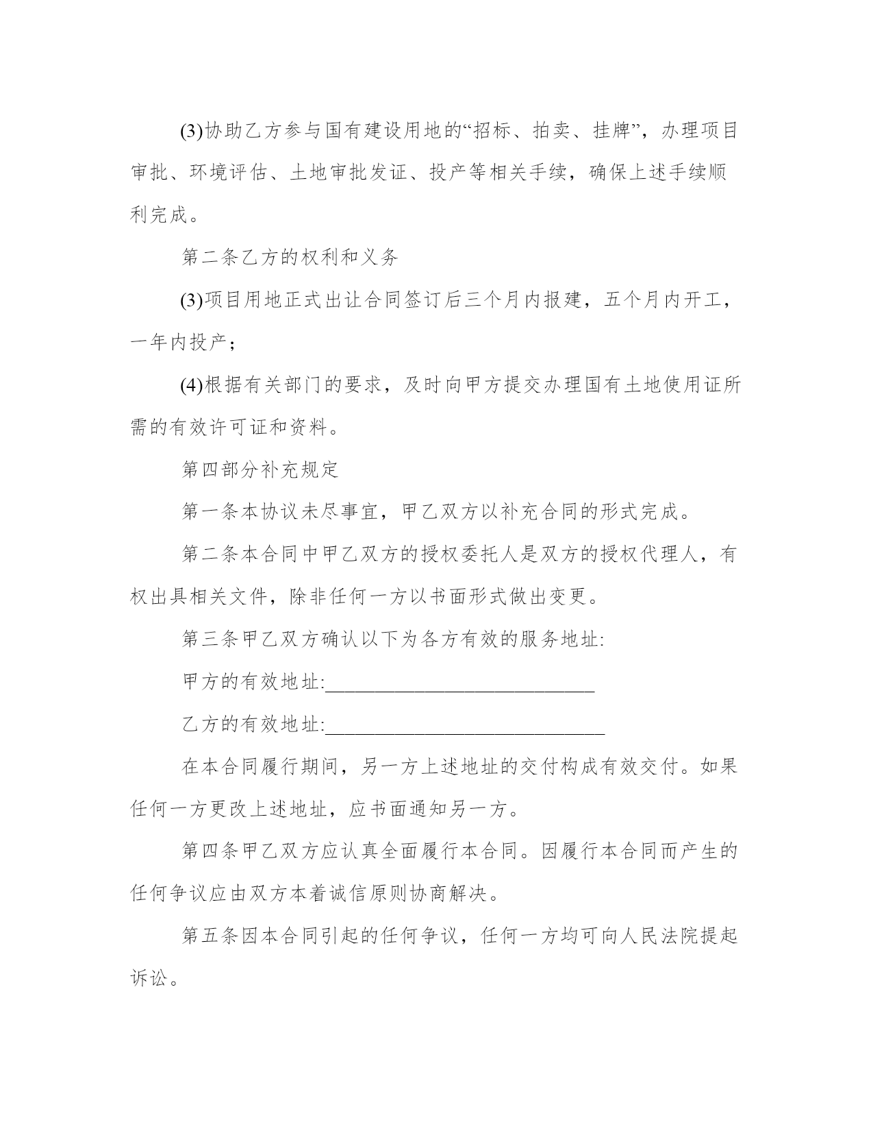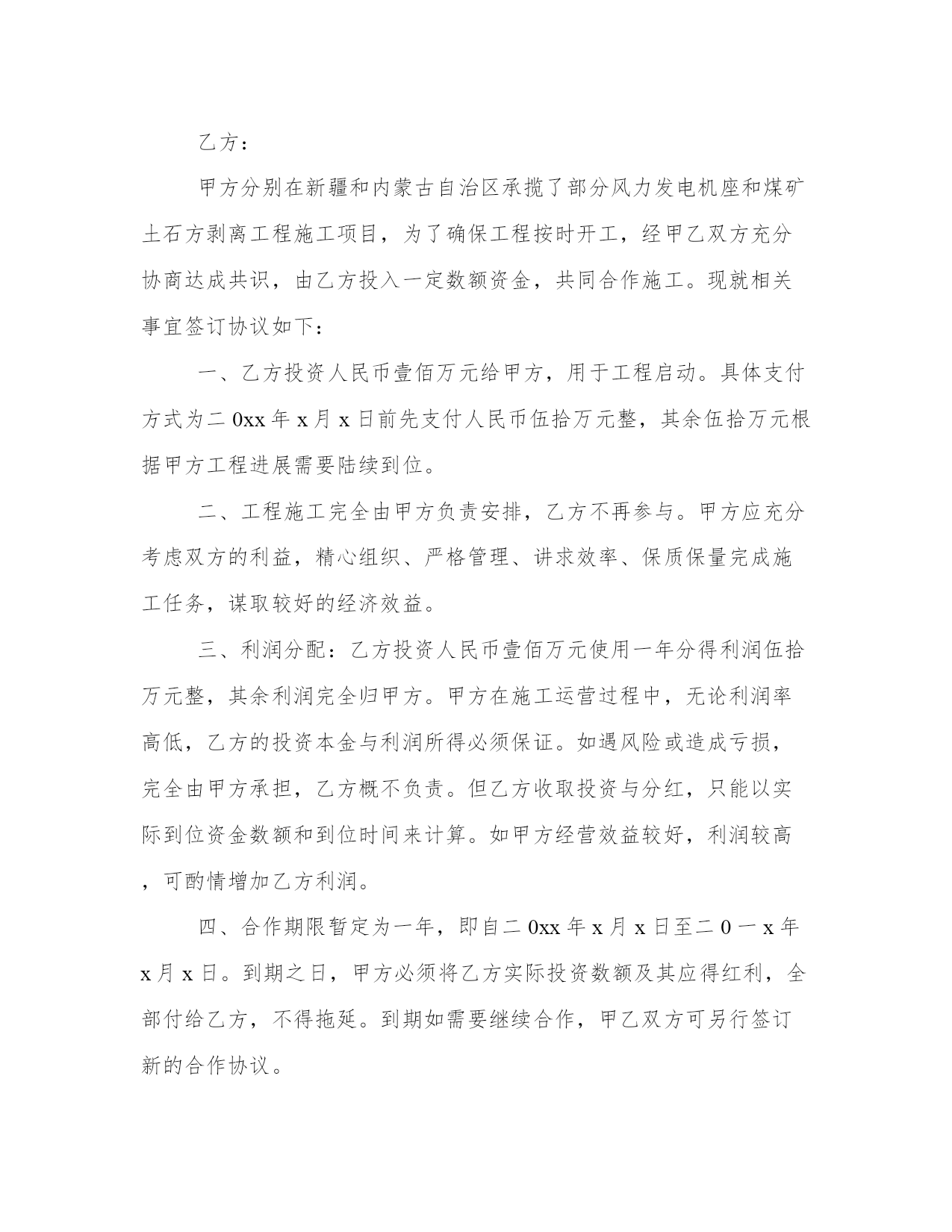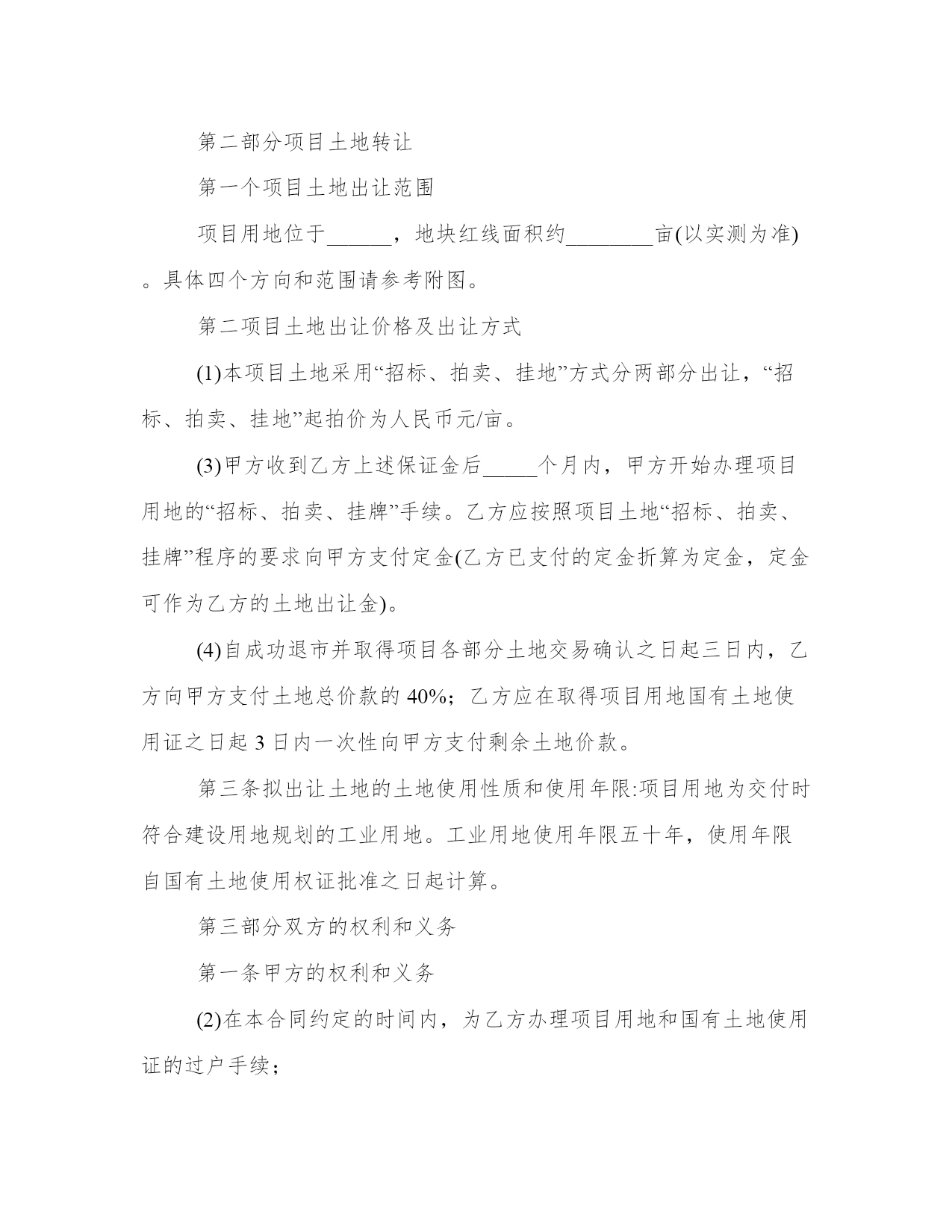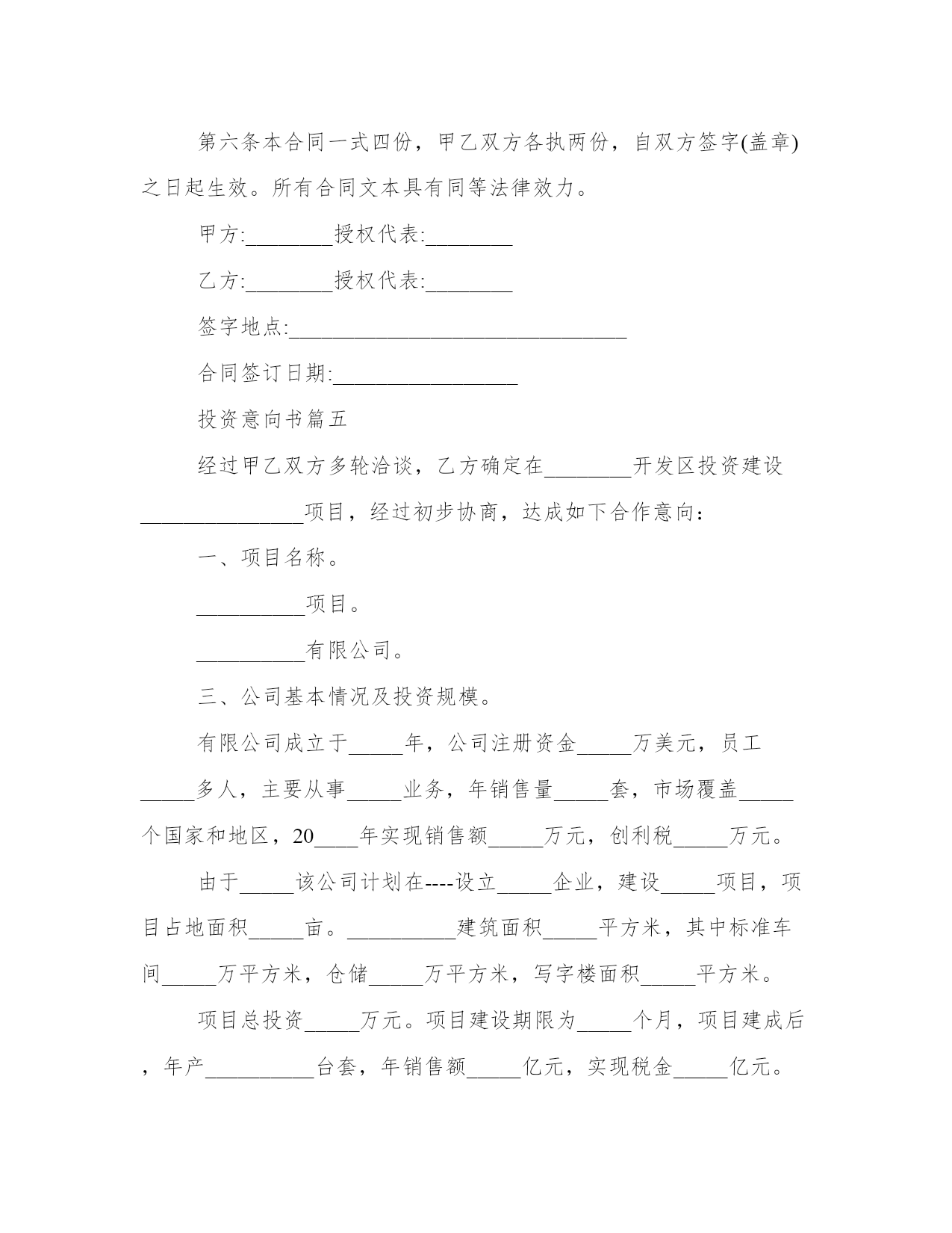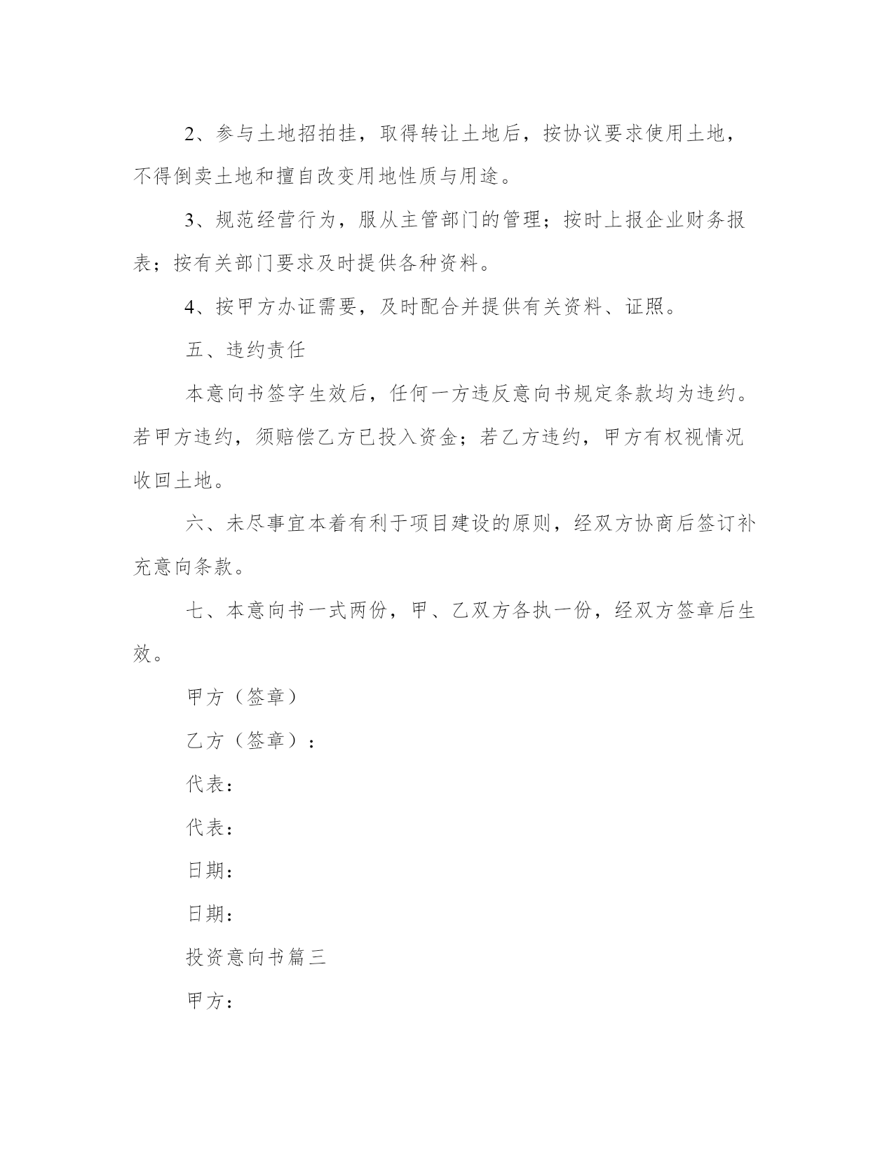 最新投资意向书(通用16篇)散文是一种抒发感情和思考的形式,可以自由表达个人的观点和情感。逻辑是一种思维方式,是按照因果关系和前后顺序进行思考和推理的能力。以下是一些经典电影的推荐,让我们一起享受电影的魅力。投资意向书篇一立意向双方:投资方:________________以下简称甲方接洽方:_________________以下简称乙方经实地考察,甲方有意在乙方工业集中区投资新办工业项目,双方自愿,达成意向如下:一、项目内容及规模:服装生产线,设备____台套,厂房____平方米,附房____平方米,总投入____万元。二、项目拟定企业名称:三、项目选址占地:约36亩(以红线图为准),位于镇中工业集中区,公司南侧。四、土地使用方式:一次性出让50年,出让价50000元/亩,但必须在2006年九月底前办好土地出让合同,逾期若遇上级政策调整,按调整价格执行。五、企业设立方法:先设立内资,后进行外资并购,外资企业注册资本每亩20万美元。六、相关优惠政策:按县委出台文件执行。七、下步工作:1、双方协作在本月底前办妥土地出让手续。2、乙方安排专人办理注册登记及土地出让相关手续,乙方负责提供资料及承担相关费用。3、注册登记期间择日另行签定正式协议。本意向书一式两份,甲乙双方各执一份,于____年____月____日在________由双方代表签订。甲方:________乙方:____________年____月____日投资意向书篇二甲方:法定代表人:乙方:法定代表人:根据中华人民共和国合同法及有关法律法规和增城市工业投资项目评审及管理办法等有关规定,现就乙方在增城市项目的相关事宜,经甲乙双方协商一致,特订立本意向书,供双方共同遵守。一、乙方意向及发展计划(一)乙方意向乙方意向受让位于亩用地,土地起拍(转让)价格为/亩。该地块规划用途为工业用地,现使用年限从___年___月___日至___年___月___日。土地现状为:______。乙方意向受让该地块用于建设____________项目,公司名称暂定名为:__________________。(二)乙方发展计划1、拟成立的公司,其经营范围为:2、万元人民币。一期工程(______年______月底以前)投入其中固定资产投资万元。二期工程(万元,其中固定资产投资______万元。3、建设内容:全面投产后形成年产能力。其中一期工程完成后达到年产_________生产能力;二期工程完成后达到年产______生产能力。4、项目产出规模:一期工程完成后,年产值达到万元,年创税______万元,安臵就业人员______人;全部建成后,年产值达到______亿元,年创税______万元,安臵就业人员______人。6、其它投资情况按乙方提供的项目投资计划书为准。二、甲方的要求和条件(一)乙方拟成立的公司必须符合以下条件:1、法定地址在增城市行政区域内,依法进行工商登记的独立核算的企业法人。2、依法缴交各项税费。3、其他要求(二)按时完成本意向第一条和投资计划书规定的各项内容。三、甲方的权利和义务1、甲方分别于让取得使用权的土地______亩;于___年___月___日前向乙方交付土地______亩。2、甲方负责将水、电、路通至乙方合法受让取得使用权的地块。3、甲方为乙方提供优质高效的代办服务,乙方提供相关资料及负责相关费用。4、确保在签订正式土地出让(转让)合同后内将国有土地使用证办到乙方指定公司名下。5、负责协调、办理乙方所需四、乙方的权利和义务1、在领取该土地国有土地使用证或建设用地批准证书后半年内必须完善建设前所有手续并动工建设。2、参与土地招拍挂,取得转让土地后,按协议要求使用土地,不得倒卖土地和擅自改变用地性质与用途。3、规范经营行为,服从主管部门的管理;按时上报企业财务报表;按有关部门要求及时提供各种资料。4、按甲方办证需要,及时配合并提供有关资料、证照。五、违约责任本意向书签字生效后,任何一方违反意向书规定条款均为违约。若甲方违约,须赔偿乙方已投入资金;若乙方违约,甲方有权视情况收回土地。六、未尽事宜本着有利于项目建设的原则,经双方协商后签订补充意向条款。七、本意向书一式两份,甲、乙双方各执一份,经双方签章后生效。甲方(签章)乙方(签章):代表:代表:日期:日期:投资意向书篇三甲方:乙方:甲方分别在新疆和内蒙古自治区承揽了部分风力发电机座和煤矿土石方剥离工程施工项目,为了确保工程按时开工,经甲乙双方充分协商达成共识,由乙方投入一定数额资金,共同合作施工。现就相关事宜签订协议如下:一、乙方投资人民币壹佰万元给甲方,用于工程启动。具体支付方式为