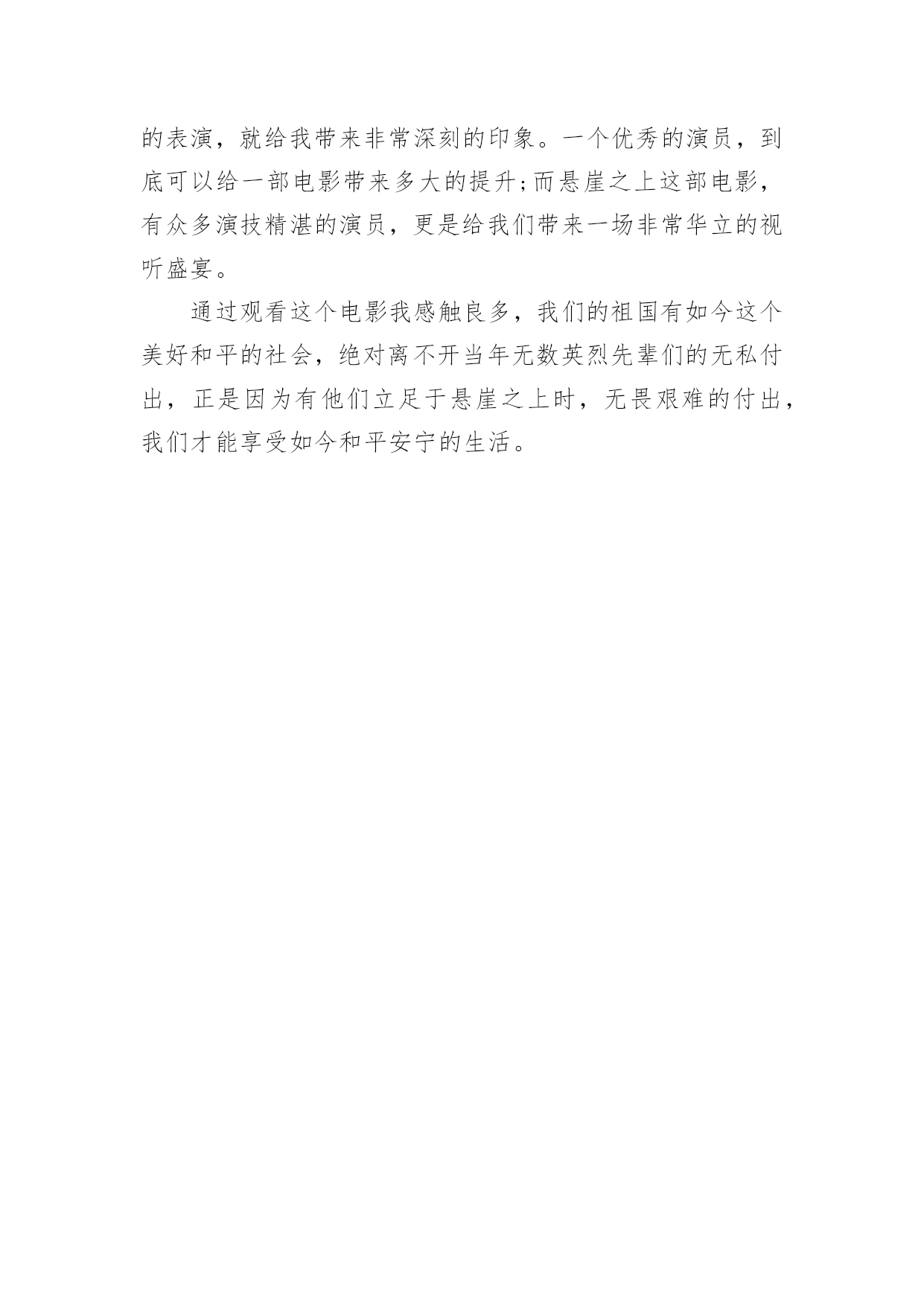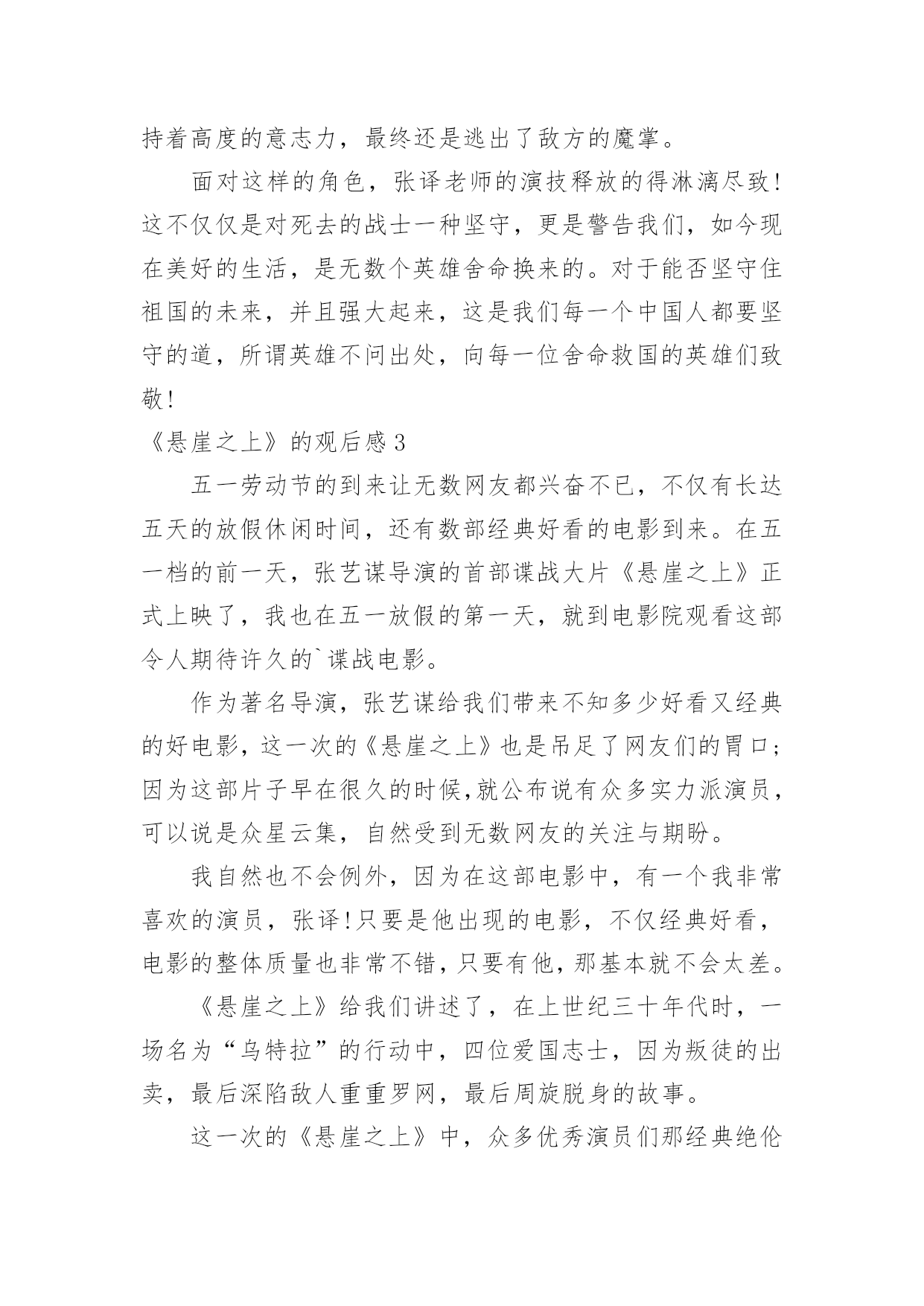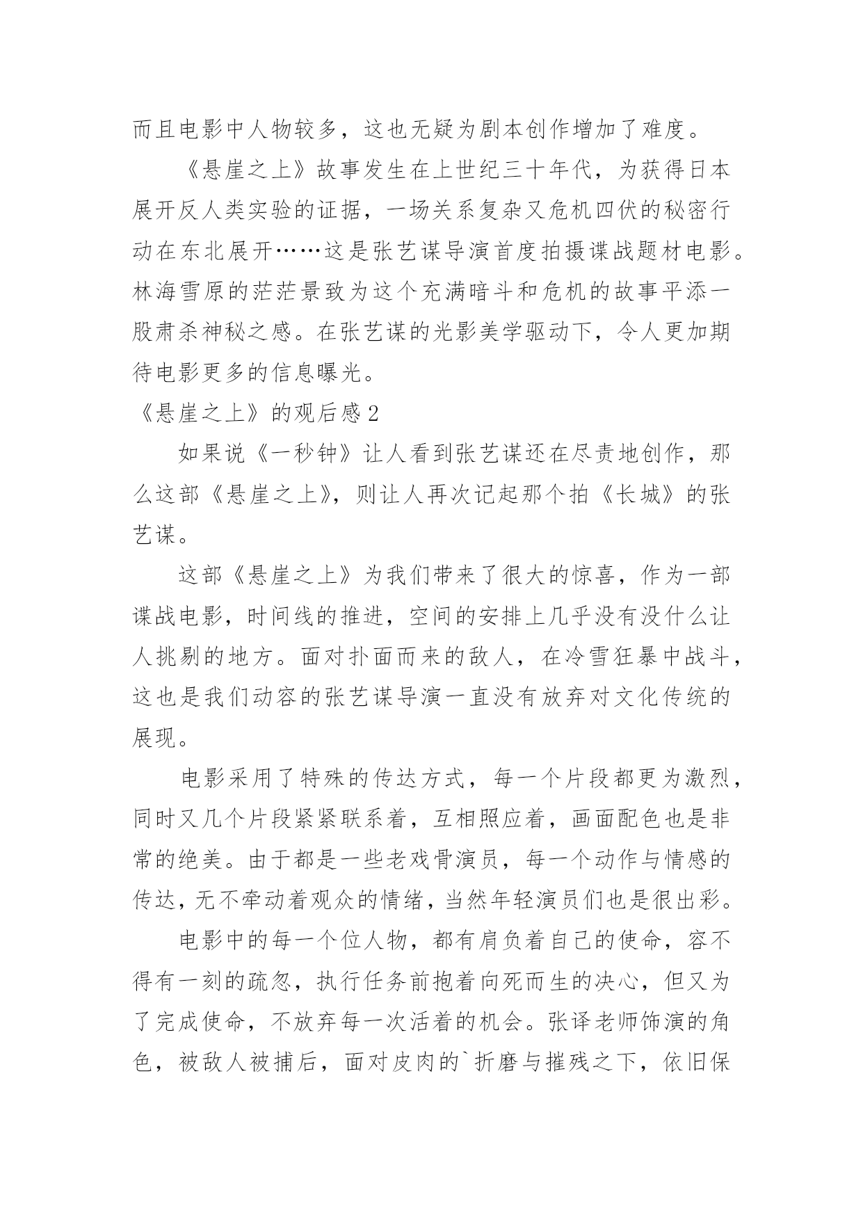 《悬崖之上》的观后感《悬崖之上》的观后感认真看完一部作品以后,相信你会有不少感想吧,为此就要认真思考观后感如何写了。那么你真的会写观后感吗?以下是小编为大家收集的《悬崖之上》的观后感,欢迎阅读与收藏。《悬崖之上》的观后感1《悬崖之上》是全勇先和导演张艺谋的首次合作,电影在东北雪乡官宣开机之时,网友便对电影的故事产生了极大好奇。作为一名“资深谍战片编剧”,全勇先此前已有许多优秀作品面世,此次现身金爵论坛,让人格外期待他的“爆料”。谈到谍战类型,全勇先表示“我写谍战戏最关注的是人,人物是最有魅力的。”全勇先常常把人物关系放在谍战氛围里去表现,他特别提到,把人写好才能更好地打动观众:“如果观众对这个人物建立了兴趣,建立了情感,这个人物的一举一动,一言一行所有行为都会牵动观众的情绪。这对我来说是一个法宝。”《悬崖之上》对人物的描绘是电影的一大看点,也是创作的难点。全勇先提到,《悬崖之上》和普通的谍战片还有一些区别,除了敌我阵营的.明暗交锋,电影对人的复杂性、人在极端情况下的反应、绝境之中的遭遇等都有较深的刻画。而且电影中人物较多,这也无疑为剧本创作增加了难度。《悬崖之上》故事发生在上世纪三十年代,为获得日本展开反人类实验的证据,一场关系复杂又危机四伏的秘密行动在东北展开……这是张艺谋导演首度拍摄谍战题材电影。林海雪原的茫茫景致为这个充满暗斗和危机的故事平添一股肃杀神秘之感。在张艺谋的光影美学驱动下,令人更加期待电影更多的信息曝光。《悬崖之上》的观后感2如果说《一秒钟》让人看到张艺谋还在尽责地创作,那么这部《悬崖之上》,则让人再次记起那个拍《长城》的张艺谋。这部《悬崖之上》为我们带来了很大的惊喜,作为一部谍战电影,时间线的推进,空间的安排上几乎没有没什么让人挑剔的地方。面对扑面而来的敌人,在冷雪狂暴中战斗,这也是我们动容的张艺谋导演一直没有放弃对文化传统的展现。电影采用了特殊的传达方式,每一个片段都更为激烈,同时又几个片段紧紧联系着,互相照应着,画面配色也是非常的绝美。由于都是一些老戏骨演员,每一个动作与情感的传达,无不牵动着观众的情绪,当然年轻演员们也是很出彩。电影中的每一个位人物,都有肩负着自己的使命,容不得有一刻的疏忽,执行任务前抱着向死而生的决心,但又为了完成使命,不放弃每一次活着的机会。张译老师饰演的角色,被敌人被捕后,面对皮肉的`折磨与摧残之下,依旧保持着高度的意志力,最终还是逃出了敌方的魔掌。面对这样的角色,张译老师的演技释放的得淋漓尽致!这不仅仅是对死去的战士一种坚守,更是警告我们,如今现在美好的生活,是无数个英雄舍命换来的。对于能否坚守住祖国的未来,并且强大起来,这是我们每一个中国人都要坚守的道,所谓英雄不问出处,向每一位舍命救国的英雄们致敬!《悬崖之上》的观后感3五一劳动节的到来让无数网友都兴奋不已,不仅有长达五天的放假休闲时间,还有数部经典好看的电影到来。在五一档的前一天,张艺谋导演的首部谍战大片《悬崖之上》正式上映了,我也在五一放假的第一天,就到电影院观看这部令人期待许久的`谍战电影。作为著名导演,张艺谋给我们带来不知多少好看又经典的好电影,这一次的《悬崖之上》也是吊足了网友们的胃口;因为这部片子早在很久的时候,就公布说有众多实力派演员,可以说是众星云集,自然受到无数网友的关注与期盼。我自然也不会例外,因为在这部电影中,有一个我非常喜欢的演员,张译!只要是他出现的电影,不仅经典好看,电影的整体质量也非常不错,只要有他,那基本就不会太差。《悬崖之上》给我们讲述了,在上世纪三十年代时,一场名为“乌特拉”的行动中,四位爱国志士,因为叛徒的出卖,最后深陷敌人重重罗网,最后周旋脱身的故事。这一次的《悬崖之上》中,众多优秀演员们那经典绝伦的表演,就给我带来非常深刻的印象。一个优秀的演员,到底可以给一部电影带来多大的提升;而悬崖之上这部电影,有众多演技精湛的演员,更是给我们带来一场非常华立的视听盛宴。通过观看这个电影我感触良多,我们的祖国有如今这个美好和平的社会,绝对离不开当年无数英烈先辈们的无私付出,正是因为有他们立足于悬崖之上时,无畏艰难的付出,我们才能享受如今和平安宁的生活。