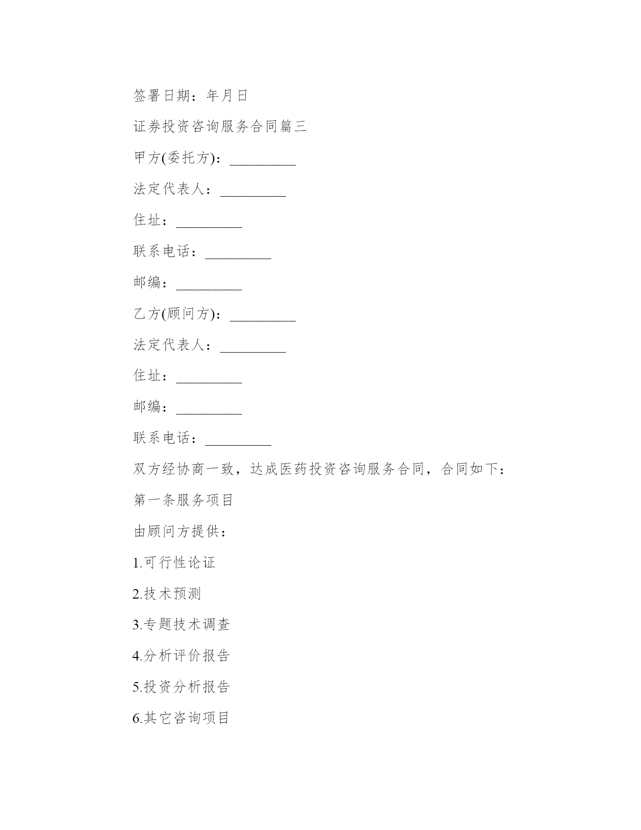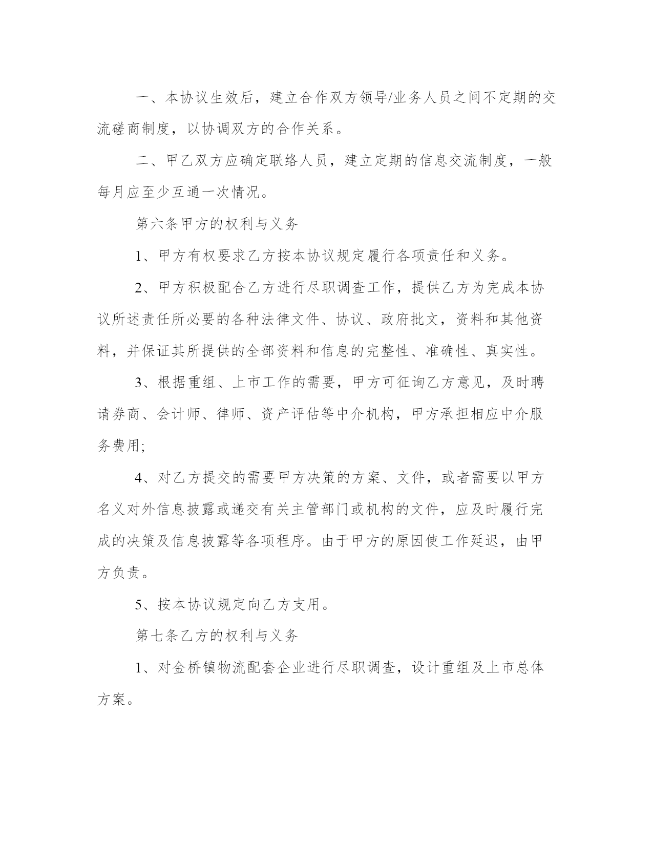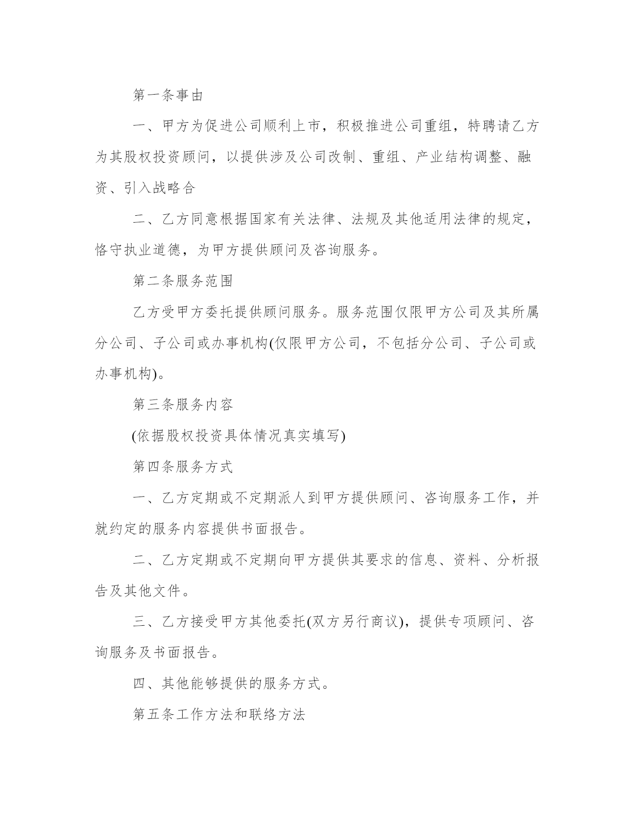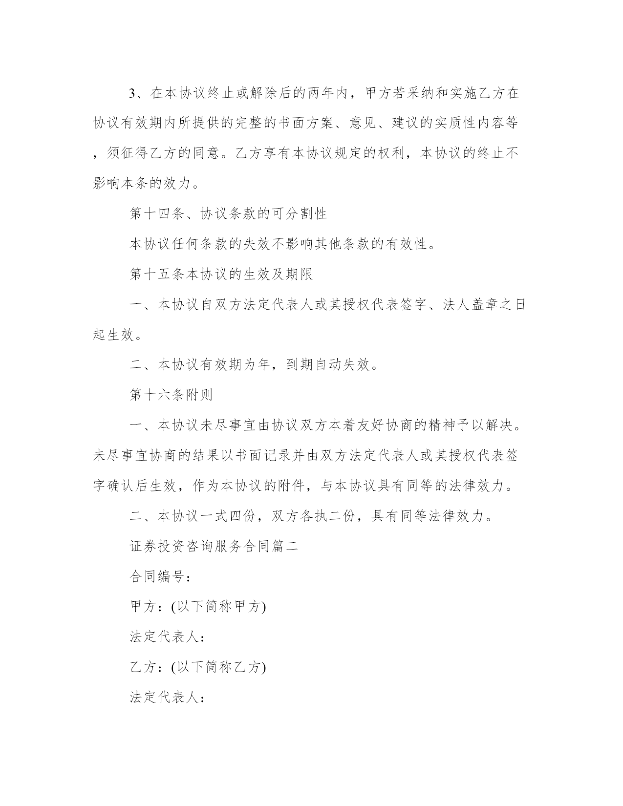 证券投资咨询服务合同(13篇)在生活中,越来越多人会去使用协议,签订签订协议是最有效的法律依据之一。那么大家知道正规的合同书怎么写吗?下面是小编帮大家整理的最新合同模板,仅供参考,希望能够帮助到大家。证券投资咨询服务合同篇一法定代表人:住所:邮政编码:传真:联系人:联系电话:乙方:法定代表人:住所:邮政编码:传真:联系人:联系电话:甲乙双方本着平等、互利的原则,根据中华人民共和国合同法及其他有关法律、法规,签订本合同,共同遵照执行。第一条事由一、甲方为促进公司顺利上市,积极推进公司重组,特聘请乙方为其股权投资顾问,以提供涉及公司改制、重组、产业结构调整、融资、引入战略合二、乙方同意根据国家有关法律、法规及其他适用法律的规定,恪守执业道德,为甲方提供顾问及咨询服务。第二条服务范围乙方受甲方委托提供顾问服务。服务范围仅限甲方公司及其所属分公司、子公司或办事机构(仅限甲方公司,不包括分公司、子公司或办事机构)。第三条服务内容(依据股权投资具体情况真实填写)第四条服务方式一、乙方定期或不定期派人到甲方提供顾问、咨询服务工作,并就约定的服务内容提供书面报告。二、乙方定期或不定期向甲方提供其要求的信息、资料、分析报告及其他文件。三、乙方接受甲方其他委托(双方另行商议),提供专项顾问、咨询服务及书面报告。四、其他能够提供的服务方式。第五条工作方法和联络方法一、本协议生效后,建立合作双方领导/业务人员之间不定期的交流磋商制度,以协调双方的合作关系。二、甲乙双方应确定联络人员,建立定期的信息交流制度,一般每月应至少互通一次情况。第六条甲方的权利与义务1、甲方有权要求乙方按本协议规定履行各项责任和义务。2、甲方积极配合乙方进行尽职调查工作,提供乙方为完成本协议所述责任所必要的各种法律文件、协议、政府批文,资料和其他资料,并保证其所提供的全部资料和信息的完整性、准确性、真实性。3、根据重组、上市工作的需要,甲方可征询乙方意见,及时聘请券商、会计师、律师、资产评估等中介机构,甲方承担相应中介服务费用;4、对乙方提交的需要甲方决策的方案、文件,或者需要以甲方名义对外信息披露或递交有关主管部门或机构的文件,应及时履行完成的决策及信息披露等各项程序。由于甲方的原因使工作延迟,由甲方负责。5、按本协议规定向乙方支用。第七条乙方的权利与义务1、对金桥镇物流配套企业进行尽职调查,设计重组及上市总体方案。在对甲方进行尽职调查的基础上,充分考虑股东及债权人的意见,并根据有关的政策、法规制定可行的总体重组及上市方案,包括股份制改造、资产重组以及股权重组等。2、依据总体重组方案,在甲方支持和配合下组织方案的实施,包括制定具体实施计划,协调有关各方,分工协作,以保证重组工作顺利进行。3、根据对甲方公司尽职调查得出的相关资料,提出股份制改造、资产重组和与股权重组的方案。4、乙方负责协助甲方与资本市场的相应中介谈判并及时将谈判进展告知甲方,以便于双方确定或调整股份制改造、资产重组与股权重组方案,以及确定公司上市前期重组的其他工作。5、乙方对在本项目中知悉的甲方不可公开的资料和信息(口头的和书面的)承担不可撤销的保密义务。除非本协议约定、或本协议所述重组工作之必要、或得到甲方书面许可,乙方不得向任何第三方泄露。第八条乙方顾问服务的完成乙方就本协议约定的服务内容,按本协议约定向甲方提交书面顾问文件以后,视为约定顾问服务工作的完成。第九条免责约定乙方就本协议约定的顾问服务内容,向甲方提交各项方案、建议、报告、意见等书面顾问服务文件,在甲方同意或认可并实施以后,只要乙方在工作中不存在损害甲方利益的故意,则乙方对该方案、建议、报告、意见等实施的后果不承担任何责任。第十条知识产权的约定乙方提出的上述顾问服务报告、建议、方案、意见等顾问服务文件,甲方可以自由决定采用顾问文件的部分或全部。但该文件的知识产权归甲乙双方共同所有,任何一方未经他方同意,不得向任何第三方披露该顾问服务文件的内容。第十一条信息资料的保密及所有权一、一方向另一方提供的所有资料及信息,接受方应承担保密责任,并保证接受方工作人员亦承担相应责任。二、提供方应限定其知晓有关资料及信息的范围及人员,并保证非经协议双方允许,不向该范围及人员以外的人员和第三方披露有关资料和信息(但乙方根据有关政策法规及监管部门的要求除外)。三、本条所指保密责任在本协议期满或本协议提前终止后年内继续有效;如该等资料或信息已被公开披露,则保密责任同时解除。四、因违反上述规定而给对方造成损失时,违约一方应当按对方的实际损失承担赔偿责任及其他责任。五、本协议任何一方依据本协议从对方取得信息、数据或其他任何形式的资料的所有权归对方所有,在本次顾问