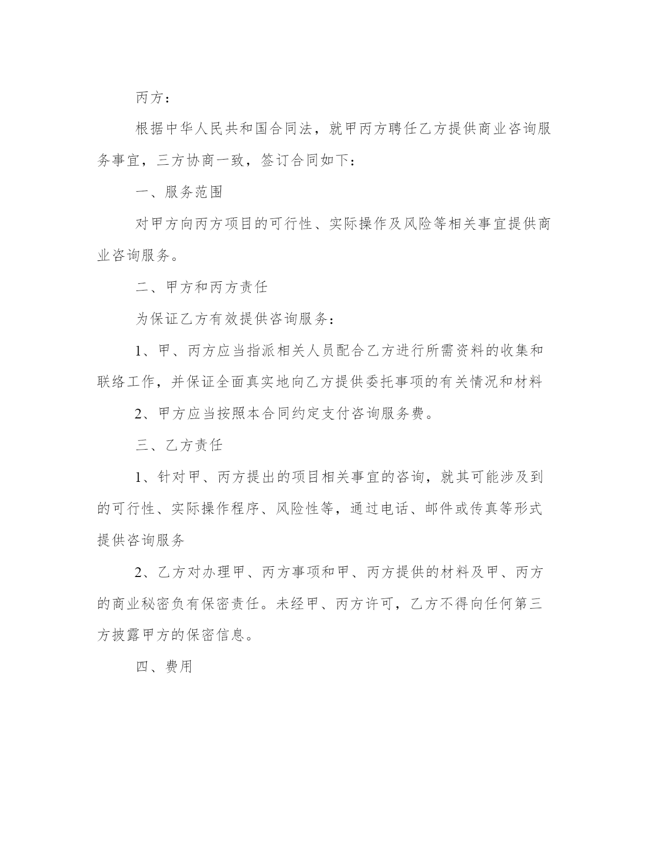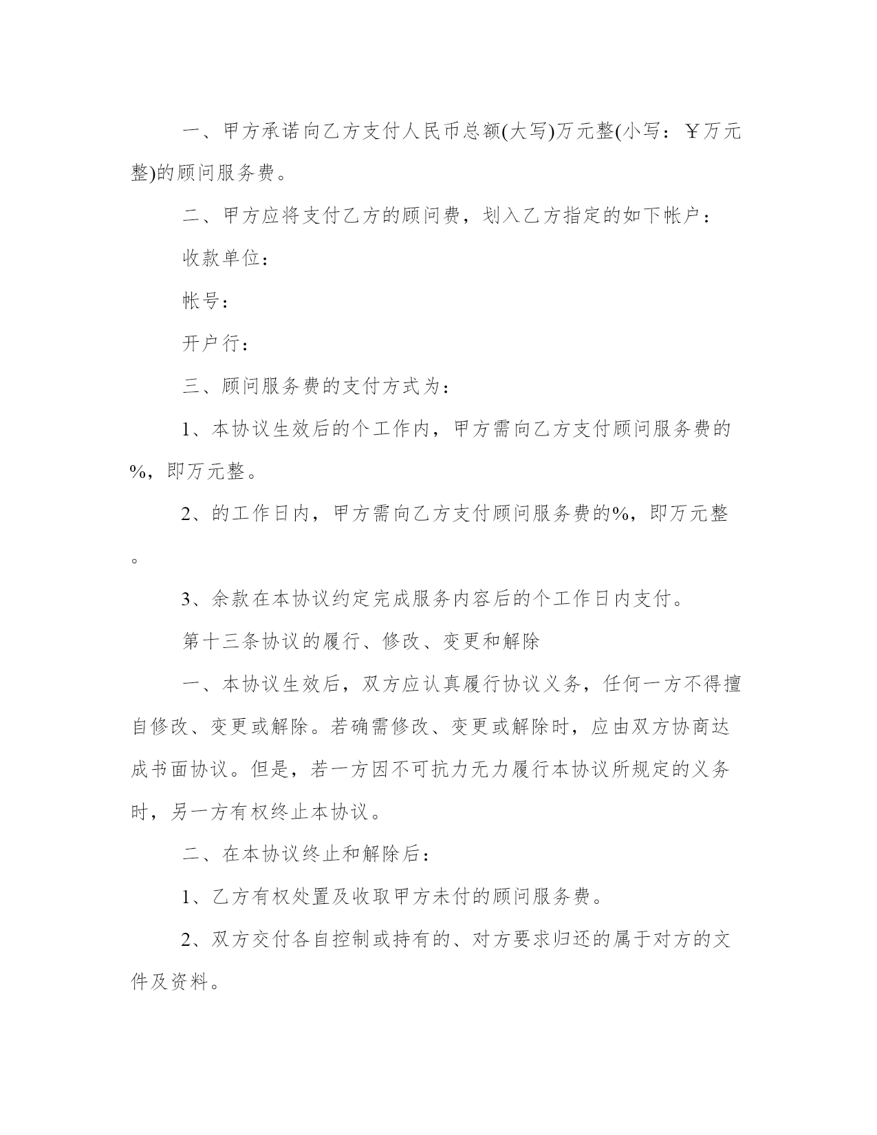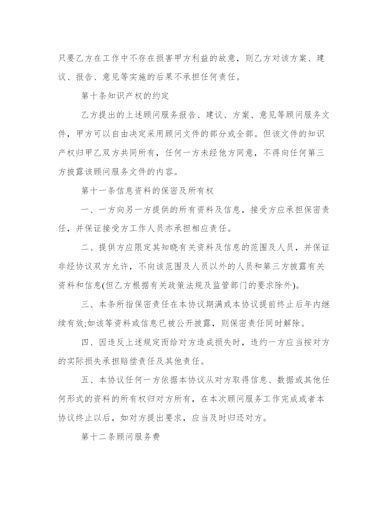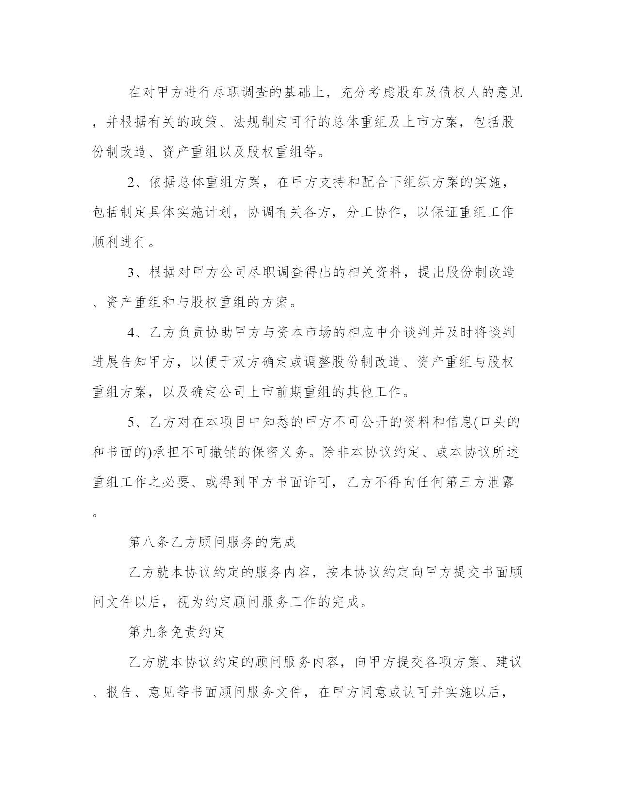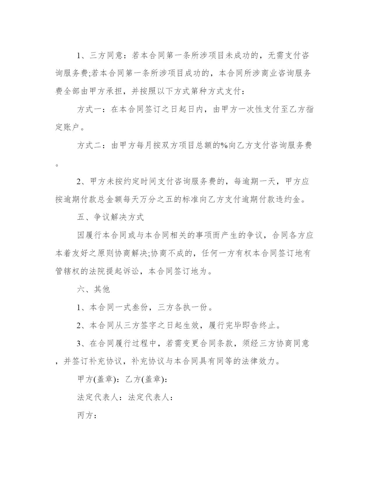 证券投资咨询服务合同(13篇)在生活中,越来越多人会去使用协议,签订签订协议是最有效的法律依据之一。那么大家知道正规的合同书怎么写吗?下面是小编帮大家整理的最新合同模板,仅供参考,希望能够帮助到大家。证券投资咨询服务合同篇一法定代表人:住所:邮政编码:传真:联系人:联系电话:乙方:法定代表人:住所:邮政编码:传真:联系人:联系电话:甲乙双方本着平等、互利的原则,根据中华人民共和国合同法及其他有关法律、法规,签订本合同,共同遵照执行。第一条事由一、甲方为促进公司顺利上市,积极推进公司重组,特聘请乙方为其股权投资顾问,以提供涉及公司改制、重组、产业结构调整、融资、引入战略合二、乙方同意根据国家有关法律、法规及其他适用法律的规定,恪守执业道德,为甲方提供顾问及咨询服务。第二条服务范围乙方受甲方委托提供顾问服务。服务范围仅限甲方公司及其所属分公司、子公司或办事机构(仅限甲方公司,不包括分公司、子公司或办事机构)。第三条服务内容(依据股权投资具体情况真实填写)第四条服务方式一、乙方定期或不定期派人到甲方提供顾问、咨询服务工作,并就约定的服务内容提供书面报告。二、乙方定期或不定期向甲方提供其要求的信息、资料、分析报告及其他文件。三、乙方接受甲方其他委托(双方另行商议),提供专项顾问、咨询服务及书面报告。四、其他能够提供的服务方式。第五条工作方法和联络方法一、本协议生效后,建立合作双方领导/业务人员之间不定期的交流磋商制度,以协调双方的合作关系。二、甲乙双方应确定联络人员,建立定期的信息交流制度,一般每月应至少互通一次情况。第六条甲方的权利与义务1、甲方有权要求乙方按本协议规定履行各项责任和义务。2、甲方积极配合乙方进行尽职调查工作,提供乙方为完成本协议所述责任所必要的各种法律文件、协议、政府批文,资料和其他资料,并保证其所提供的全部资料和信息的完整性、准确性、真实性。3、根据重组、上市工作的需要,甲方可征询乙方意见,及时聘请券商、会计师、律师、资产评估等中介机构,甲方承担相应中介服务费用;4、对乙方提交的需要甲方决策的方案、文件,或者需要以甲方名义对外信息披露或递交有关主管部门或机构的文件,应及时履行完成的决策及信息披露等各项程序。由于甲方的原因使工作延迟,由甲方负责。5、按本协议规定向乙方支用。第七条乙方的权利与义务1、对金桥镇物流配套企业进行尽职调查,设计重组及上市总体方案。在对甲方进行尽职调查的基础上,充分考虑股东及债权人的意见,并根据有关的政策、法规制定可行的总体重组及上市方案,包括股份制改造、资产重组以及股权重组等。2、依据总体重组方案,在甲方支持和配合下组织方案的实施,包括制定具体实施计划,协调有关各方,分工协作,以保证重组工作顺利进行。3、根据对甲方公司尽职调查得出的相关资料,提出股份制改造、资产重组和与股权重组的方案。4、乙方负责协助甲方与资本市场的相应中介谈判并及时将谈判进展告知甲方,以便于双方确定或调整股份制改造、资产重组与股权重组方案,以及确定公司上市前期重组的其他工作。5、乙方对在本项目中知悉的甲方不可公开的资料和信息(口头的和书面的)承担不可撤销的保密义务。除非本协议约定、或本协议所述重组工作之必要、或得到甲方书面许可,乙方不得向任何第三方泄露。第八条乙方顾问服务的完成乙方就本协议约定的服务内容,按本协议约定向甲方提交书面顾问文件以后,视为约定顾问服务工作的完成。第九条免责约定乙方就本协议约定的顾问服务内容,向甲方提交各项方案、建议、报告、意见等书面顾问服务文件,在甲方同意或认可并实施以后,只要乙方在工作中不存在损害甲方利益的故意,则乙方对该方案、建议、报告、意见等实施的后果不承担任何责任。第十条知识产权的约定乙方提出的上述顾问服务报告、建议、方案、意见等顾问服务文件,甲方可以自由决定采用顾问文件的部分或全部。但该文件的知识产权归甲乙双方共同所有,任何一方未经他方同意,不得向任何第三方披露该顾问服务文件的内容。第十一条信息资料的保密及所有权一、一方向另一方提供的所有资料及信息,接受方应承担保密责任,并保证接受方工作人员亦承担相应责任。二、提供方应限定其知晓有关资料及信息的范围及人员,并保证非经协议双方允许,不向该范围及人员以外的人员和第三方披露有关资料和信息(但乙方根据有关政策法规及监管部门的要求除外)。三、本条所指保密责任在本协议期满或本协议提前终止后年内继续有效;如该等资料或信息已被公开披露,则保密责任同时解除。四、因违反上述规定而给对方造成损失时,违约一方应当按对方的实际损失承担赔偿责任及其他责任。五、本协议任何一方依据本协议从对方取得信息、数据或其他任何形式的资料的所有权归对方所有,在本次顾问