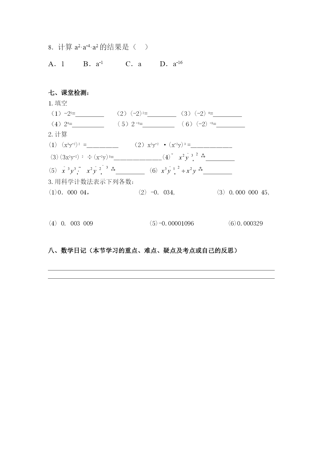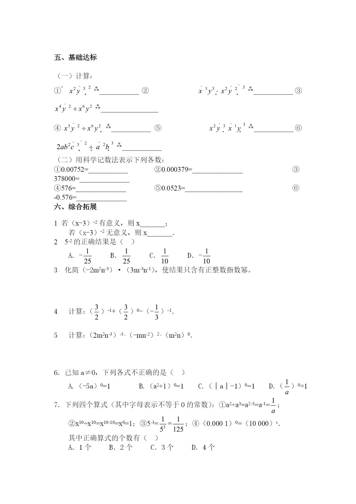 学案设计16.2.3整数指数幂延庆县下屯中学郭维岭一、学习目标:1、理解和掌握负整数指数幂的法则,体会指数域扩大的内涵.2、学会小于1的正数用科学记数法表示的方法.二、学习重点,理解负整数指数幂的意义,掌握整数指数幂的运算.掌握小于1的正数用科学记数法表示.学会正数指数与负整数指数用于科学记数法的区别.三、知识梳理复习与新知识探索:一、正数指数幂运算性质①②③④⑤⑥二、请你计算下列各式①_______________②③④⑤⑥__归纳:一般地,当n是正整数时,,这就是说,是的倒数.四、典型例题例9计算(1)(a-1b2)3(2)a-2b2·(a2b-2)-3例10下列等式是否正确?为什么?(1)am÷an=am·a-n(2)()n=anb-n例11纳米是非常小的长度单位,1纳米=10-9米,把1纳米的物体放到乒乓球上,就如同把乒乓球放到地球上。1立方毫米的空间可以放多少个1立方纳米的物体?五、基础达标(一)计算:①②③④⑤⑥(二)用科学记数法表示下列各数:①0.00752=___________②0.000379=______________③378000=______________④576=______________⑤0.0523=________________⑥-0.576=______________六、综合拓展1若(x-3)-2有意义,则x_______;若(x-3)-2无意义,则x_______.25-2的正确结果是()A.-B.C.D.-3化简(-2m2n-3)·(3m-3n-1),使结果只含有正整数指数幂。4计算:()-1+()0-(-)-1.5计算:(2m2n-3)-3·(-mn-2)2·(m2n)0.6.已知a≠0,下列各式不正确的是()A.(-5a)0=1B.(a2+1)0=1C.(│a│-1)0=1D.()0=17.下列四个算式(其中字母表示不等于0的常数):①a2÷a3=a2-3=a-1=;②x10÷x10=x10-10=x0=1;③5-3==;④(0.0001)0=(10000)0.其中正确算式的个数有()A.1个B.2个C.3个D.4个8.计算a2·a-4·a2的结果是()A.1B.a-1C.aD.a-16七、课堂检测:1.填空(1)-22=(2)(-2)2=(3)(-2)0=(4)20=(5)2-3=(6)(-2)-3=2.计算(1)(x3y-2)2=__________(2)x2y-2·(x-2y)3=_____________(3)(3x2y-2)2÷(x-2y)3=_______________(4)(5)(6)3.用科学计数法表示下列各数:(1)0.00004,(2)-0.034,(3)0.00000045,(4)0.003009(5)-0.00001096(6)0.000329八、数学日记(本节学习的重点、难点、疑点及考点或自己的反思)