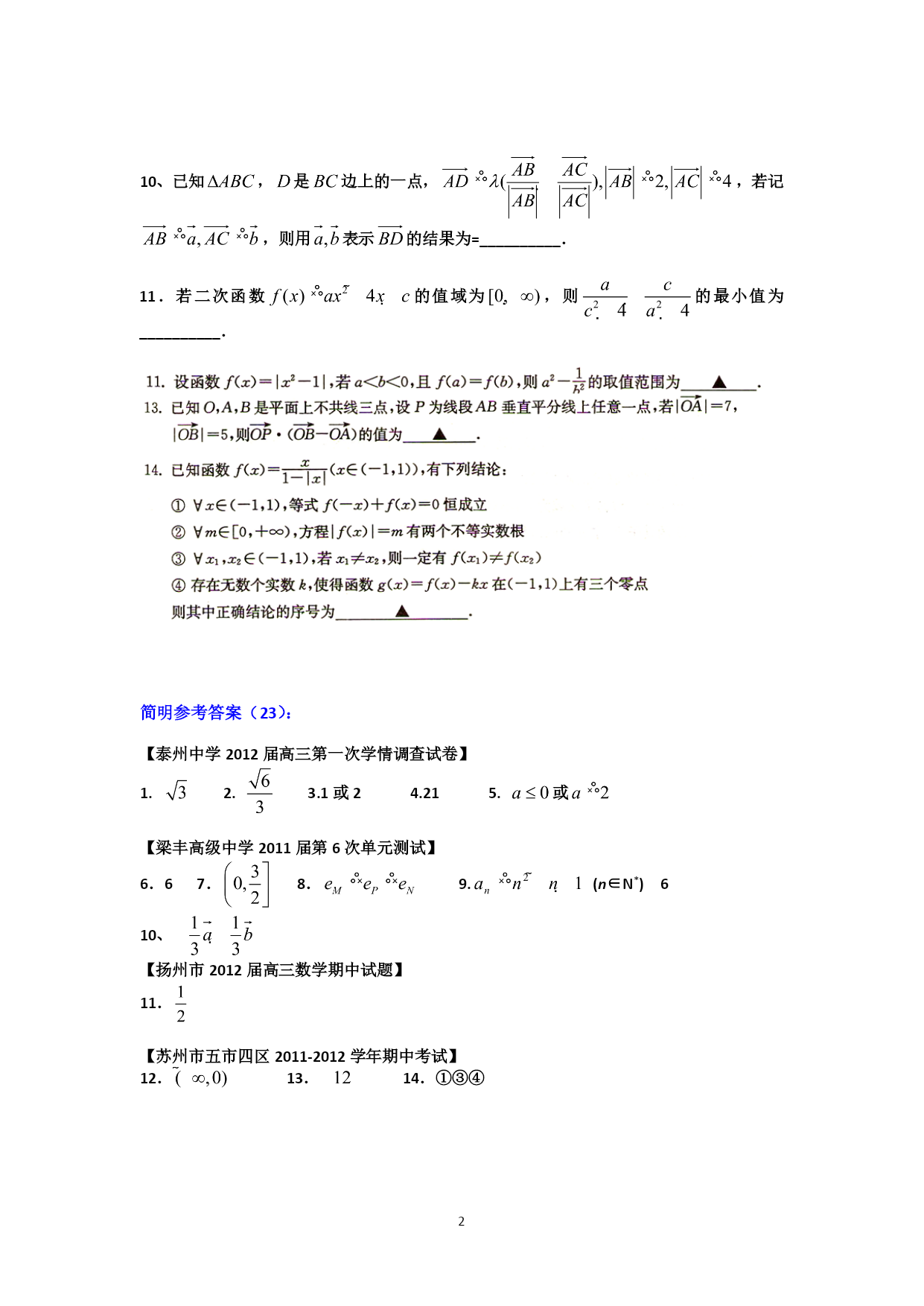 PAGEPAGE32012江苏高考数学填空题“提升练习”(23)1.已知数列的首项=__________.2.以椭圆的右焦点为圆心的圆经过原点O,且与该椭圆的右准线交于A,B两点,已知是正三角形,则该椭圆的离心率是__________.3.若不等式对于任意正实数x,y总成立的必要不充分条件是,则正整数m可取的值是__________.4.已知a,b,c,d都是整数,且,若a,b,c在成等差数列,b,c,d成等比数列,则a+b+c+d的值等于__________.5.如果关于x的方程在区间上有且仅有一个解,那么实数a的取值范围为__________.6.已知函数满足且当时,,则的图象的交点个数为__________.7.如果实数满足,对任意的正数,不等式恒成立,则的取值范围是__________.8.如图,已知|AB|=10,图中的一系列圆是圆心分别为A、B的两组同心圆,每组同心圆的半径分别是。利用这两组同心圆可以画出以A、B为焦点的双曲线,若其中经过点M、N、P的双曲线的离心率分别记为,则它们的大小关系是__________.(用“<”连接)9.某资料室在计算机使用中,如下表所示,编码以一定规则排列,且从左至右以及从上到下都是无限的.111111…123456…11357911…1147101316…159131721…1611162126…1……11………1……此表中,数列1,3,7,13,21,…的通项公式为__________;编码51共出现_______次.10、已知,是边上的一点,,若记,则用表示的结果为=__________.11.若二次函数的值域为,则的最小值为__________.简明参考答案(23):【泰州中学2012届高三第一次学情调查试卷】1.2.3.1或24.215.或【梁丰高级中学2011届第6次单元测试】6.67.8.9.(n∈N*)610、【扬州市2012届高三数学期中试题】11.【苏州市五市四区2011-2012学年期中考试】12.13.14.①③④
