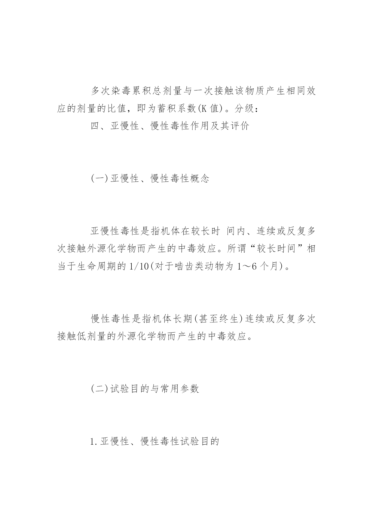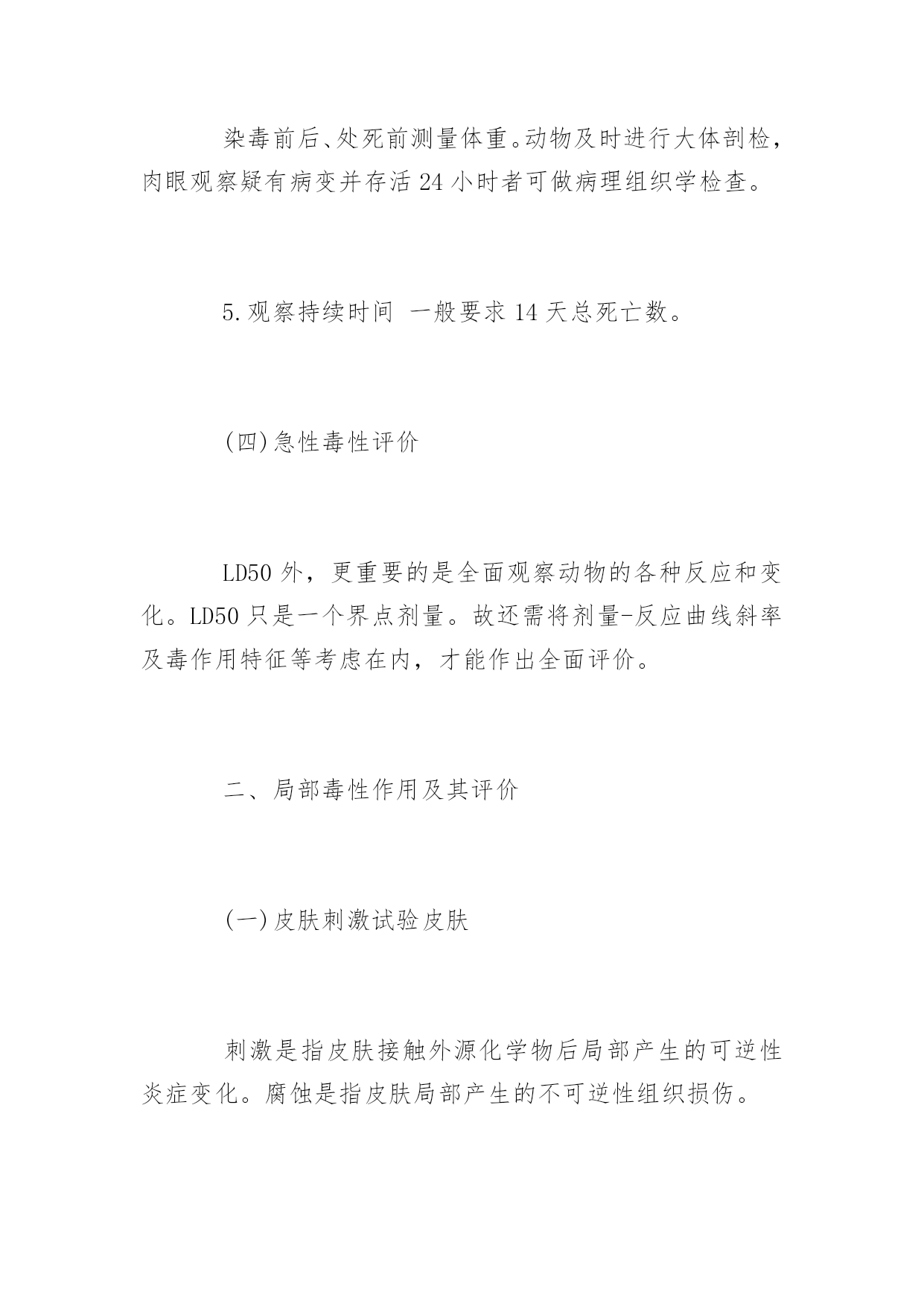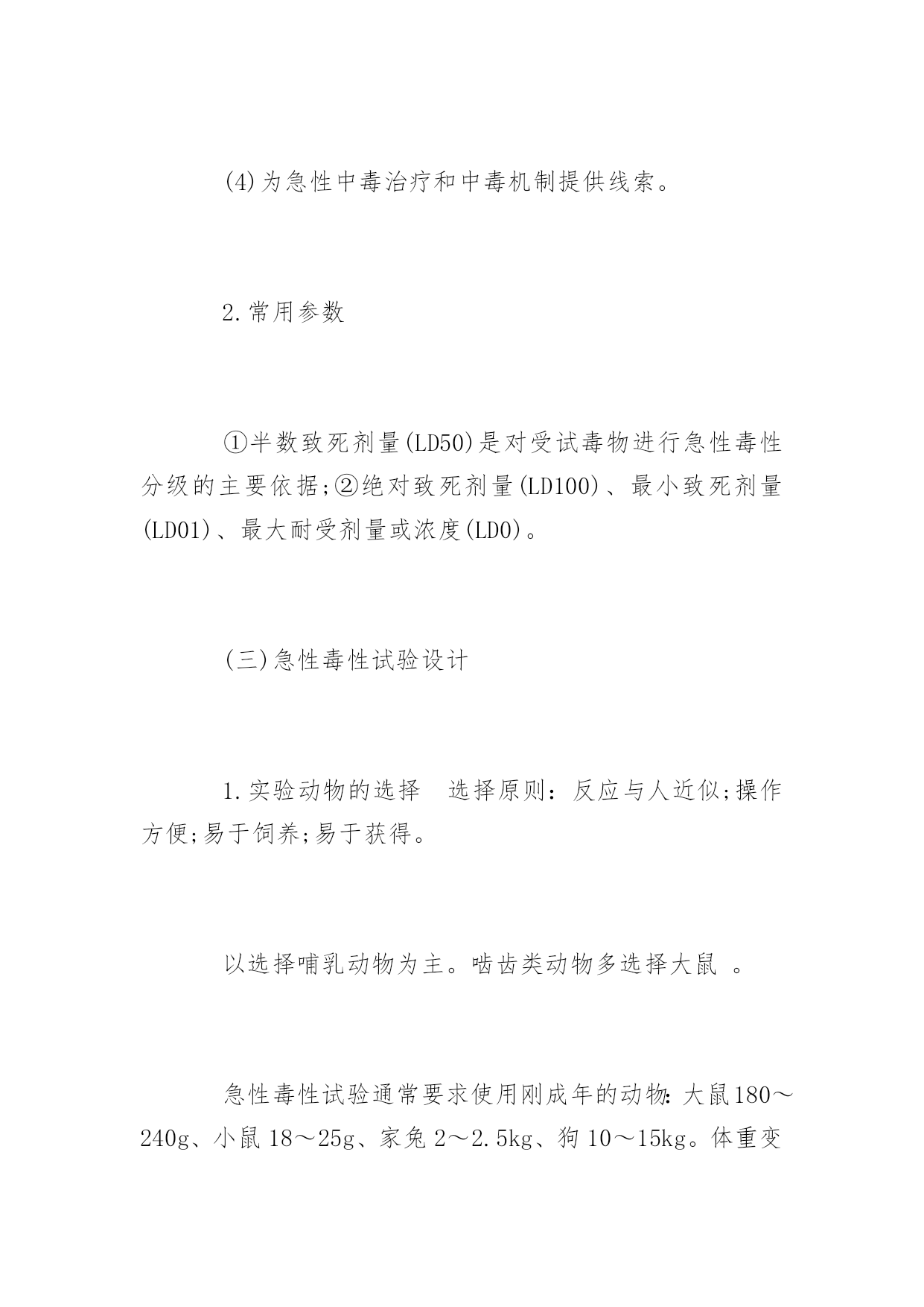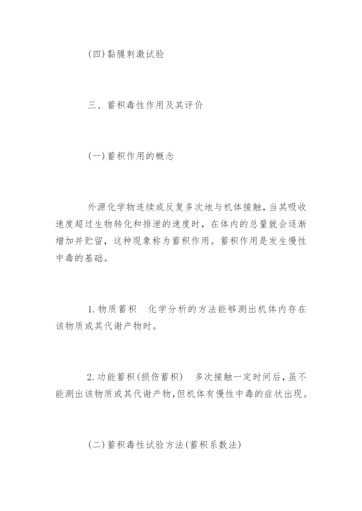 公卫执业医师考试卫生毒理学辅导资料卫生毒理学属于预防医学的范畴,也是毒理学的一个分支学科。任何一种化学物质在一定条件下都可能是对机体有害的,卫生毒理学的目的就在于研究外源化学物质的毒性和产生毒性作用的条件,阐明剂量一效应(反应)关系,为制订卫生标准及防治措施提供理论依据。下面是应届毕业生小编为大家搜索整理了公卫执业医师考试卫生毒理学辅导资料,希望对大家有所帮助。化学毒物一般毒性作用一、急性毒性作用及其评价(一)急性毒性的概念急性毒性是指机体因一次或在24小时内多次接触外源化学物而产生的毒效应及死亡。“一次”接触在经口、经静脉途径染毒时,是指将受试物瞬间给予实验动物。而当经皮肤与呼吸道染毒时,则是指在一个规定期间内使实验动物持续接触外源化学物。24小时内分多次给予,(二)急性毒性试验目的与常用参数1.试验目的(1)获得急性毒性参数(LD50最重要),进行急性毒性分级。(2)观察中毒表现、毒作用强度、死亡情况,阐明剂量-反应关系和毒效应的特征,估计对人危害性。(3)为亚慢性、慢性及其他毒理学试验的剂量设计和观察指标选择提供参考依据。(4)为急性中毒治疗和中毒机制提供线索。2.常用参数①半数致死剂量(LD50)是对受试毒物进行急性毒性分级的主要依据;②绝对致死剂量(LD100)、最小致死剂量(LD01)、最大耐受剂量或浓度(LD0)。(三)急性毒性试验设计1.实验动物的选择选择原则:反应与人近似;操作方便;易于饲养;易于获得。以选择哺乳动物为主。啮齿类动物多选择大鼠。急性毒性试验通常要求使用刚成年的动物:大鼠180~240g、小鼠18~25g、家兔2~2.5kg、狗10~15kg。体重变异范围不得超过平均体重的20%。要求每组10只,雌雄各半。检疫适应期一般为5~7天。2.染毒途径的选择一般根据实验目的、受试物的性质和用途以及人类接触该物质的实际途径和方式选择染毒途径。灌胃针或导管染毒。灌胃体积应一致,以ml/kg体重或ml/g计。具体为:小鼠0.2~1.Oml/只,大鼠3.染毒剂量与分组分组数与染毒剂量往往需要通过预备实验来确定。正式实验一般设5~7个剂量组,组距:(LD100-LD0)/(组数-1)。4.毒效应观察应注意记录发生中毒症状的时间、表现的特点和程度、发生发展过程、死亡的时间及各组死亡的动物数。染毒前后、处死前测量体重。动物及时进行大体剖检,肉眼观察疑有病变并存活24小时者可做病理组织学检查。5.观察持续时间一般要求14天总死亡数。(四)急性毒性评价LD50外,更重要的是全面观察动物的各种反应和变化。LD50只是一个界点剂量。故还需将剂量-反应曲线斜率及毒作用特征等考虑在内,才能作出全面评价。二、局部毒性作用及其评价(一)皮肤刺激试验皮肤刺激是指皮肤接触外源化学物后局部产生的可逆性炎症变化。腐蚀是指皮肤局部产生的不可逆性组织损伤。研究(Draize试验)常用的动物是家兔和豚鼠,家兔至少4只,大鼠10只。受试物0.5ml(g)涂于经备皮的皮肤上,覆盖固定。时间为4小时。之后第1、24、48小时观察反应(红斑形成、紫红色红斑并有焦痂形成、水肿形成、水肿隆起),按其严重程度评分并评价刺激强度。(二)皮肤致敏试验选择豚鼠作为实验动物。每天涂皮或皮内注射受试物溶液,共14天,此阶段称为诱导阶段。间隔10~14天后,用激发剂量(通常低于诱导剂量)再皮内注射1次(称为激发阶段),观察有无皮肤反应及反应程度并评分。(三)眼刺激试验4只家兔,兔眼一侧结膜囊内滴入受试物,另一侧对照。根据结膜、角膜和虹膜的反应,按分级标准进行评分。(四)黏膜刺激试验三、蓄积毒性作用及其评价(一)蓄积作用的概念外源化学物连续或反复多次地与机体接触,当其吸收速度超过生物转化和排泄的速度时,在体内的总量就会逐渐增加并贮留,这种现象称为蓄积作用。蓄积作用是发生慢性中毒的基础。1.物质蓄积化学分析的方法能够测出机体内存在该物质或其代谢产物时。2.功能蓄积(损伤蓄积)多次接触一定时间后,虽不能测出该物质或其代谢产物,但机体有慢性中毒的症状出现。(二)蓄积毒性试验方法(蓄积系数法)多次染毒累积总剂量与一次接触该物质产生相同效应的剂量的比值,即为蓄积系数(K值)。分级:四、亚慢性、慢性毒性作用及其评价(一)亚慢性、慢性毒性概念亚慢性毒性是指机体在较长时间内、连续或反复多次接触外源化学物而产生的中毒效应。所谓“较长时间”相当于生命周期的1/10(对于啮齿类动物为1~6个月)。慢性毒性是指机体长期(甚至终生)连续或反复多次接触低剂量的外源化学物而产生的中毒效应。(二)试验目的与常用参数1.亚慢性、慢性毒性试验目的(1)探讨长期染毒条件下,受试物毒作用性质、特点、毒效应的类