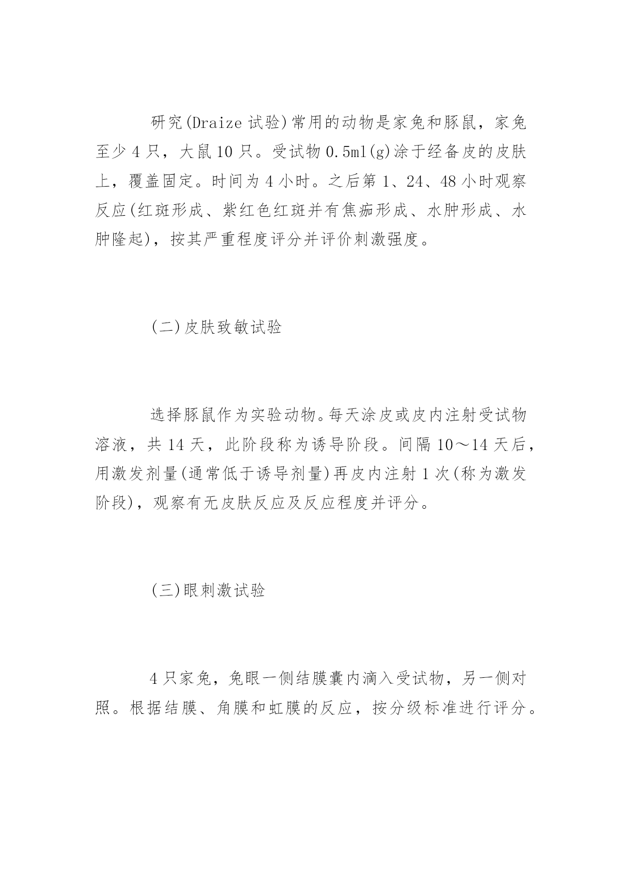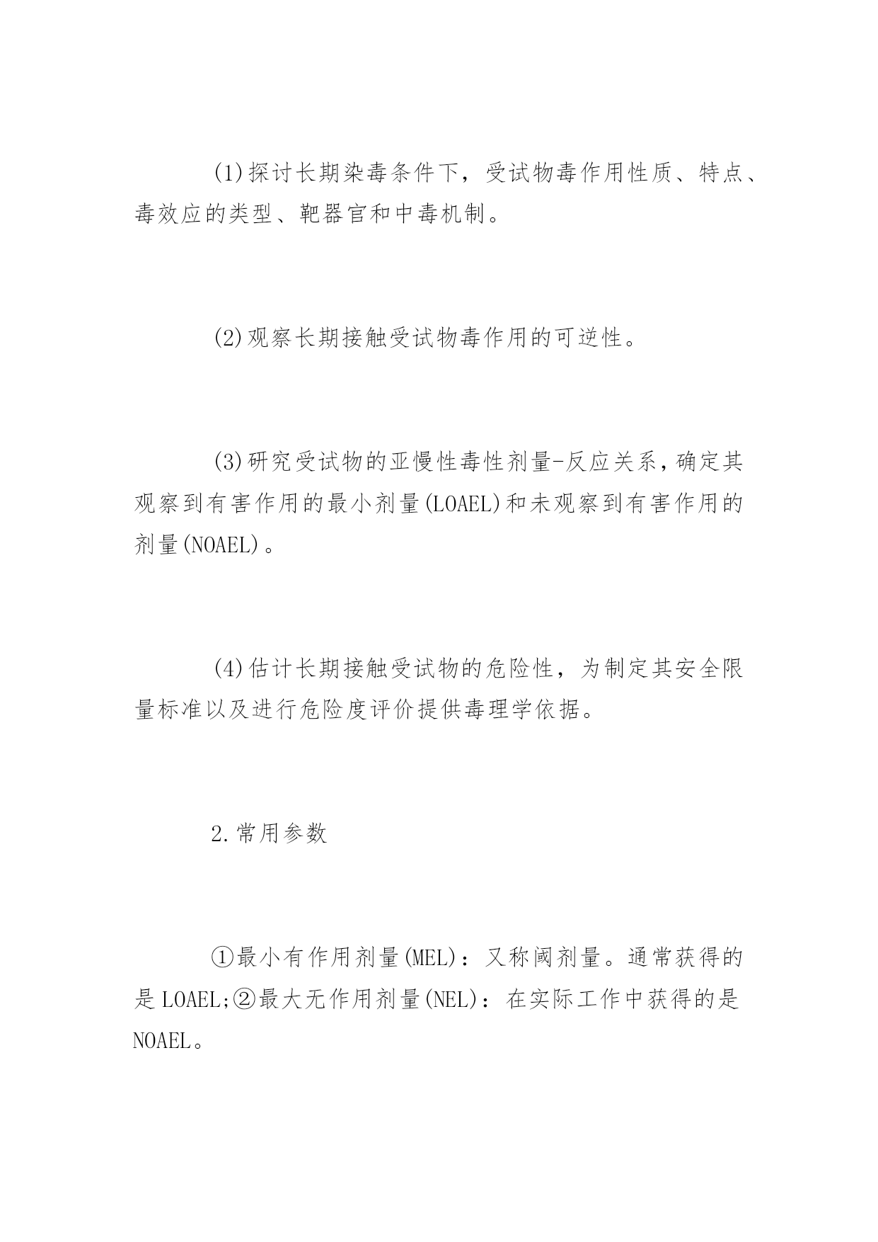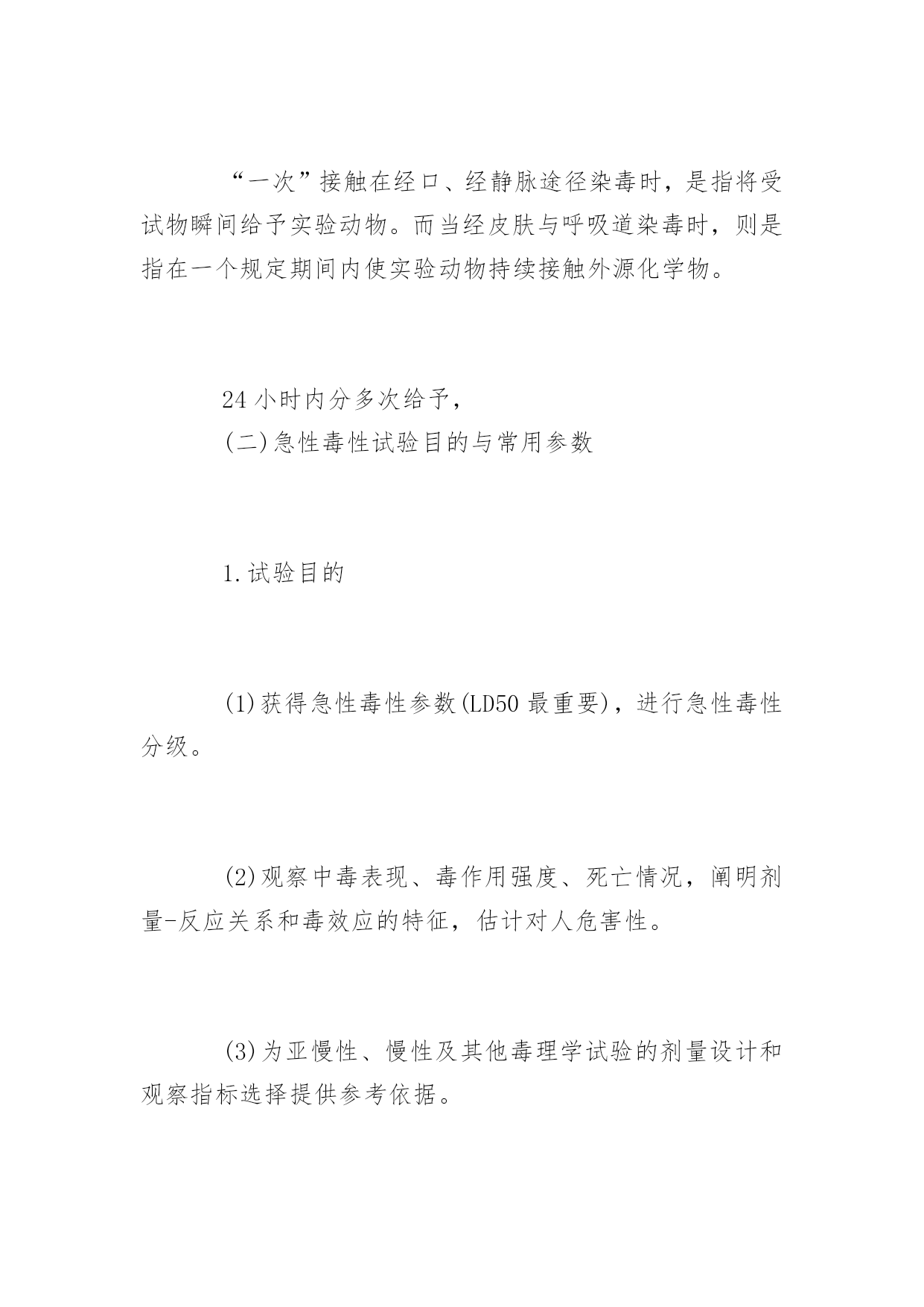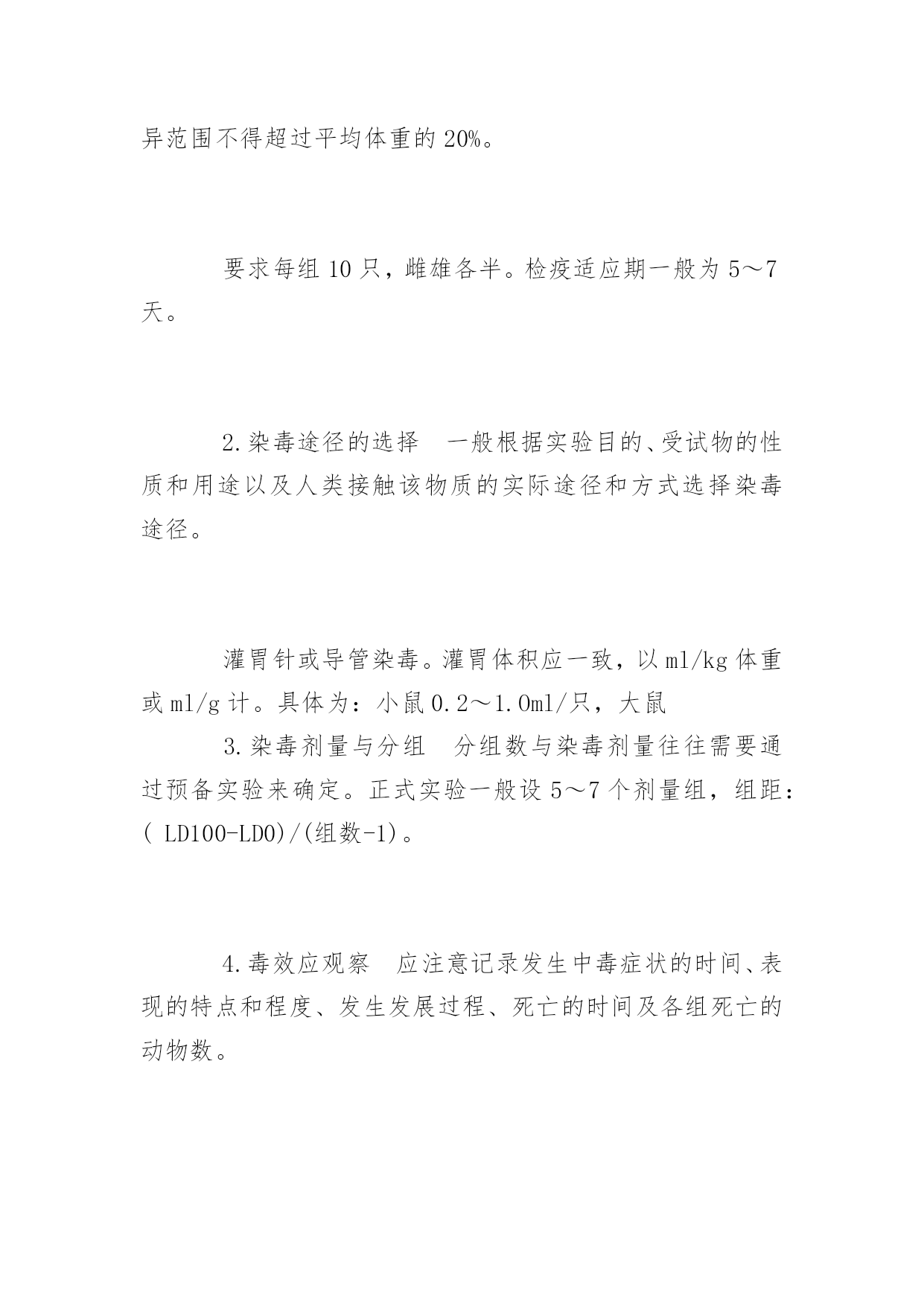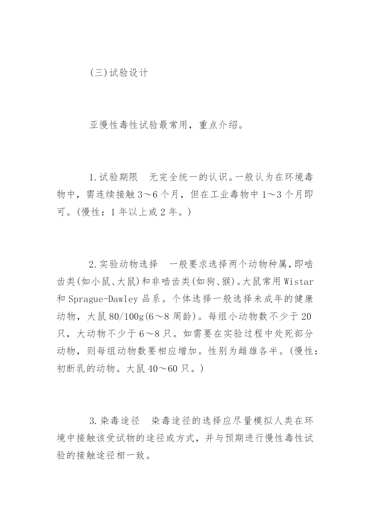 公卫执业医师考试卫生毒理学辅导资料卫生毒理学属于预防医学的范畴,也是毒理学的一个分支学科。任何一种化学物质在一定条件下都可能是对机体有害的,卫生毒理学的目的就在于研究外源化学物质的毒性和产生毒性作用的条件,阐明剂量一效应(反应)关系,为制订卫生标准及防治措施提供理论依据。下面是应届毕业生小编为大家搜索整理了公卫执业医师考试卫生毒理学辅导资料,希望对大家有所帮助。化学毒物一般毒性作用一、急性毒性作用及其评价(一)急性毒性的概念急性毒性是指机体因一次或在24小时内多次接触外源化学物而产生的毒效应及死亡。“一次”接触在经口、经静脉途径染毒时,是指将受试物瞬间给予实验动物。而当经皮肤与呼吸道染毒时,则是指在一个规定期间内使实验动物持续接触外源化学物。24小时内分多次给予,(二)急性毒性试验目的与常用参数1.试验目的(1)获得急性毒性参数(LD50最重要),进行急性毒性分级。(2)观察中毒表现、毒作用强度、死亡情况,阐明剂量-反应关系和毒效应的特征,估计对人危害性。(3)为亚慢性、慢性及其他毒理学试验的剂量设计和观察指标选择提供参考依据。(4)为急性中毒治疗和中毒机制提供线索。2.常用参数①半数致死剂量(LD50)是对受试毒物进行急性毒性分级的主要依据;②绝对致死剂量(LD100)、最小致死剂量(LD01)、最大耐受剂量或浓度(LD0)。(三)急性毒性试验设计1.实验动物的选择选择原则:反应与人近似;操作方便;易于饲养;易于获得。以选择哺乳动物为主。啮齿类动物多选择大鼠。急性毒性试验通常要求使用刚成年的动物:大鼠180~240g、小鼠18~25g、家兔2~2.5kg、狗10~15kg。体重变异范围不得超过平均体重的20%。要求每组10只,雌雄各半。检疫适应期一般为5~7天。2.染毒途径的选择一般根据实验目的、受试物的性质和用途以及人类接触该物质的实际途径和方式选择染毒途径。灌胃针或导管染毒。灌胃体积应一致,以ml/kg体重或ml/g计。具体为:小鼠0.2~1.Oml/只,大鼠3.染毒剂量与分组分组数与染毒剂量往往需要通过预备实验来确定。正式实验一般设5~7个剂量组,组距:(LD100-LD0)/(组数-1)。4.毒效应观察应注意记录发生中毒症状的时间、表现的特点和程度、发生发展过程、死亡的时间及各组死亡的动物数。染毒前后、处死前测量体重。动物及时进行大体剖检,肉眼观察疑有病变并存活24小时者可做病理组织学检查。5.观察持续时间一般要求14天总死亡数。(四)急性毒性评价LD50外,更重要的是全面观察动物的各种反应和变化。LD50只是一个界点剂量。故还需将剂量-反应曲线斜率及毒作用特征等考虑在内,才能作出全面评价。二、局部毒性作用及其评价(一)皮肤刺激试验皮肤刺激是指皮肤接触外源化学物后局部产生的可逆性炎症变化。腐蚀是指皮肤局部产生的不可逆性组织损伤。研究(Draize试验)常用的动物是家兔和豚鼠,家兔至少4只,大鼠10只。受试物0.5ml(g)涂于经备皮的皮肤上,覆盖固定。时间为4小时。之后第1、24、48小时观察反应(红斑形成、紫红色红斑并有焦痂形成、水肿形成、水肿隆起),按其严重程度评分并评价刺激强度。(二)皮肤致敏试验选择豚鼠作为实验动物。每天涂皮或皮内注射受试物溶液,共14天,此阶段称为诱导阶段。间隔10~14天后,用激发剂量(通常低于诱导剂量)再皮内注射1次(称为激发阶段),观察有无皮肤反应及反应程度并评分。(三)眼刺激试验4只家兔,兔眼一侧结膜囊内滴入受试物,另一侧对照。根据结膜、角膜和虹膜的反应,按分级标准进行评分。(四)黏膜刺激试验三、蓄积毒性作用及其评价(一)蓄积作用的概念外源化学物连续或反复多次地与机体接触,当其吸收速度超过生物转化和排泄的速度时,在体内的总量就会逐渐增加并贮留,这种现象称为蓄积作用。蓄积作用是发生慢性中毒的基础。1.物质蓄积化学分析的方法能够测出机体内存在该物质或其代谢产物时。2.功能蓄积(损伤蓄积)多次接触一定时间后,虽不能测出该物质或其代谢产物,但机体有慢性中毒的症状出现。(二)蓄积毒性试验方法(蓄积系数法)多次染毒累积总剂量与一次接触该物质产生相同效应的剂量的比值,即为蓄积系数(K值)。分级:四、亚慢性、慢性毒性作用及其评价(一)亚慢性、慢性毒性概念亚慢性毒性是指机体在较长时间内、连续或反复多次接触外源化学物而产生的中毒效应。所谓“较长时间”相当于生命周期的1/10(对于啮齿类动物为1~6个月)。慢性毒性是指机体长期(甚至终生)连续或反复多次接触低剂量的外源化学物而产生的中毒效应。(二)试验目的与常用参数1.亚慢性、慢性毒性试验目的(1)探讨长期染毒条件下,受试物毒作用性质、特点、毒效应的类