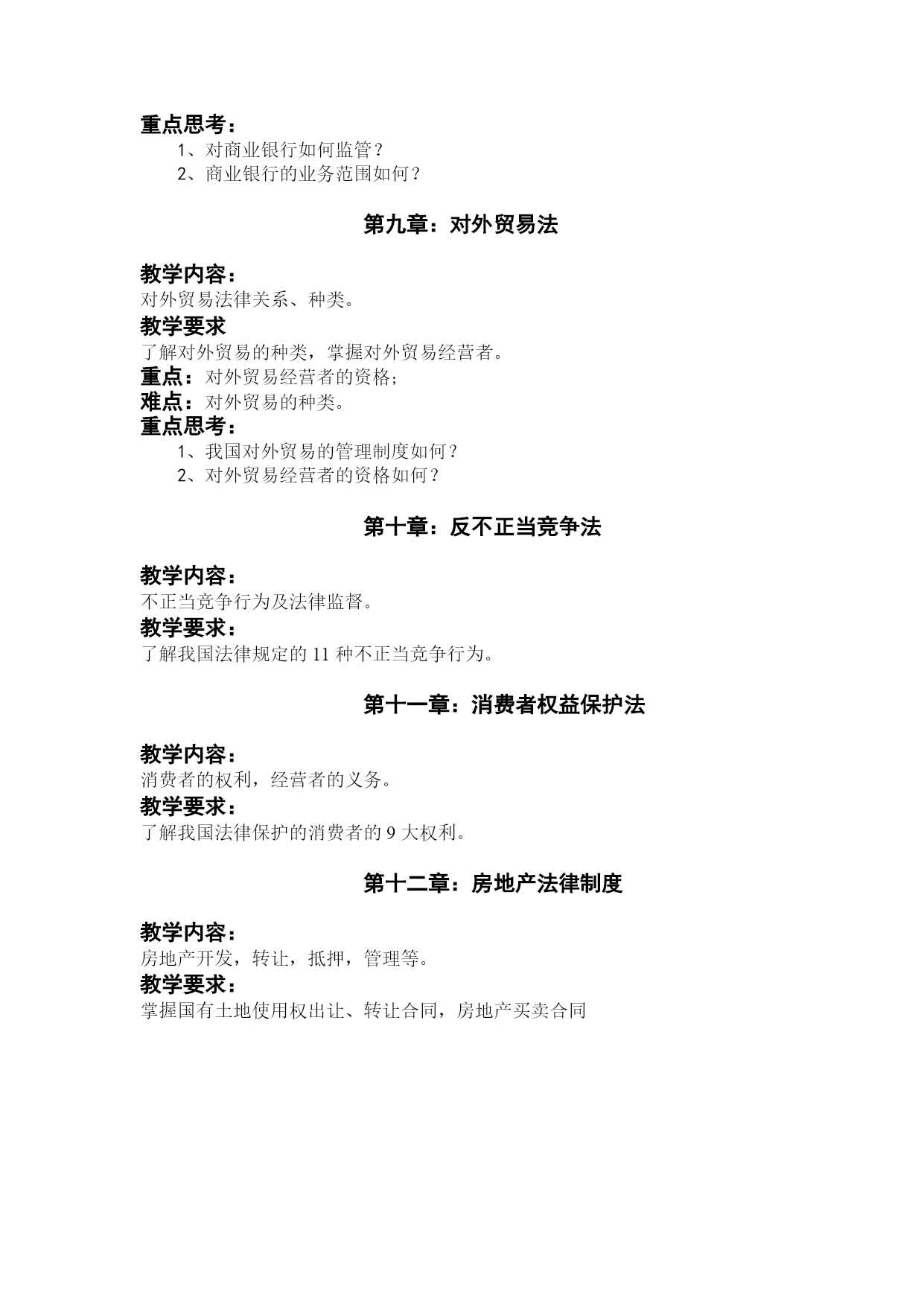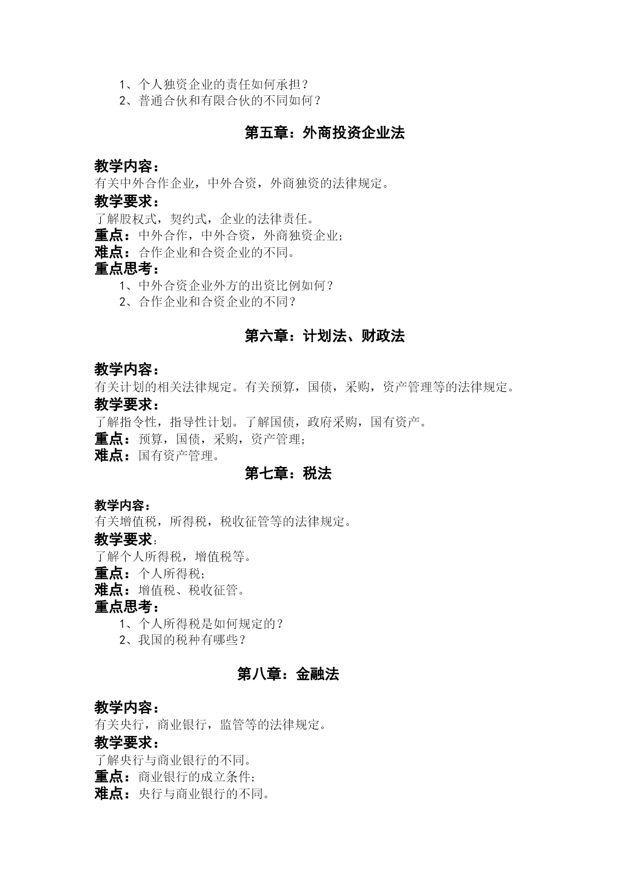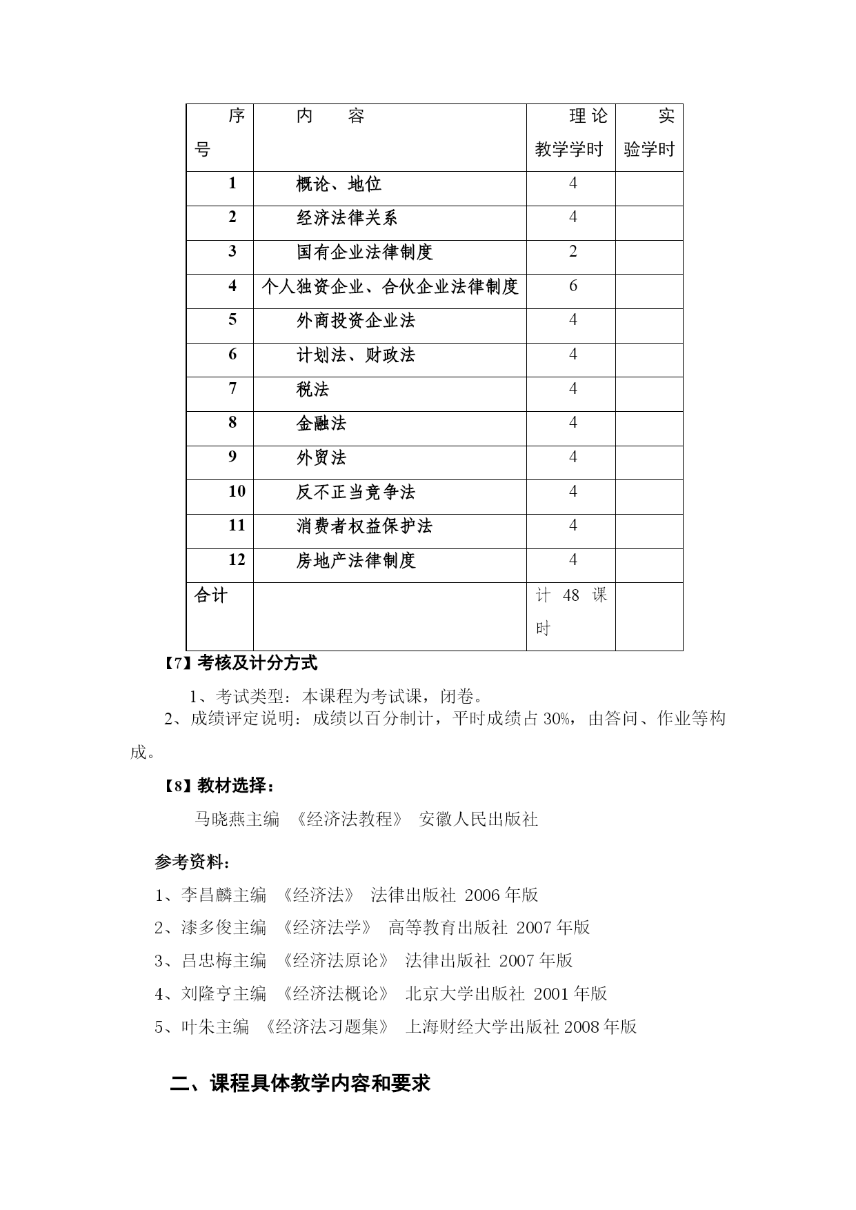 《经济法学(一)》课程教学大纲法律教研室制订日期:2008年10月30日课程编号:132004课程总学时、学分:48学时3学分课程类别:专业选修课适用专业:法律考核方式:闭卷考试首选教材:马晓燕主编《经济法教程》安徽人民出版社制定(或修订)单位:人文学院制定(或修订)时间:2008年9月一、课程总述课程性质、任务与目的本课程居于专业选修课,以马列主义、毛泽东思想、邓小平理论、“三个代表”重要思想为指导,对有关经济法律进行讲解,使学生对我国的经济法律有一定的了解,并能在实践中加以运用。与其他课程的关系本课程是法律专业的学生的一门专业基础课,是与民法、刑法、行政法等法并列的一个基本法。【3】课程特点(包括课程重点、难点)针对大学专科的特点,本课程讲课以理论为主,实务为辅。【4】教学总体要求:通过学习,能对中国有关经济法律有一定的了解。【5】教学手段及教学环节配置主要教学手段建议:讲授与讨论相结合教学环节配置:主要理论教学辅之以课堂讨论【6】教学总学时分配本课程共48学时,3学分,理论教学48学时。具体学时分配如下表所示:序号内容理论教学学时实验学时1概论、地位42经济法律关系43国有企业法律制度24个人独资企业、合伙企业法律制度65外商投资企业法46计划法、财政法47税法48金融法49外贸法410反不正当竞争法411消费者权益保护法412房地产法律制度4合计计48课时【7】考核及计分方式1、考试类型:本课程为考试课,闭卷。2、成绩评定说明:成绩以百分制计,平时成绩占30%,由答问、作业等构成。【8】教材选择:马晓燕主编《经济法教程》安徽人民出版社参考资料:1、李昌麟主编《经济法》法律出版社2006年版2、漆多俊主编《经济法学》高等教育出版社2007年版3、吕忠梅主编《经济法原论》法律出版社2007年版4、刘隆亨主编《经济法概论》北京大学出版社2001年版5、叶朱主编《经济法习题集》上海财经大学出版社2008年版二、课程具体教学内容和要求第一章:概论教学内容:经济法的产生,调整对象,地位,渊源,体系。教学要求:了解基本原则,法律渊源。重点:经济法的调整对象难点:经济法的渊源。重点思考:1、经济法的渊源有哪些?第二章:经济法律关系教学内容:种类,三要素。教学要求:掌握主体、内容、客体。重点:经济法律关系主体、客体的种类;难点:经济法律关系的客体。重点思考:1、如何认识经济法律关系客体的种类?2、经济权利的范围如何?第三章:国有企业法律制度教学内容:设立、变更、终止、经营方式等。教学要求:了解国有企业的设立、变更、终止。了解国有企业的权利和义务及与政府的关系。重点:国有企业的设立、变更、终止;难点:国有企业的权利和义务。重点思考:1、国有企业的权利和义务如何?第四章:个人独资企业和合伙企业法律制度教学内容:合伙企业、个人独资企业的法律规定。教学要求:掌握独资企业的开办和关闭、掌握普通合伙和有限合伙的不同。重点:合伙企业、个人独资企业的法律规定;难点:个人独资企业和合伙企业的不同。重点思考:1、个人独资企业的责任如何承担?2、普通合伙和有限合伙的不同如何?第五章:外商投资企业法教学内容:有关中外合作企业,中外合资,外商独资的法律规定。教学要求:了解股权式,契约式,企业的法律责任。重点:中外合作,中外合资,外商独资企业;难点:合作企业和合资企业的不同。重点思考:1、中外合资企业外方的出资比例如何?2、合作企业和合资企业的不同?第六章:计划法、财政法教学内容:有关计划的相关法律规定。有关预算,国债,采购,资产管理等的法律规定。教学要求:了解指令性,指导性计划。了解国债,政府采购,国有资产。重点:预算,国债,采购,资产管理;难点:国有资产管理。第七章:税法教学内容:有关增值税,所得税,税收征管等的法律规定。教学要求:了解个人所得税,增值税等。重点:个人所得税;难点:增值税、税收征管。重点思考:1、个人所得税是如何规定的?2、我国的税种有哪些?第八章:金融法教学内容:有关央行,商业银行,监管等的法律规定。教学要求:了解央行与商业银行的不同。重点:商业银行的成立条件;难点:央行与商业银行的不同。重点思考:1、对商业银行如何监管?2、商业银行的业务范围如何?第九章:对外贸易法教学内容:对外贸易法律关系、种类。教学要求了解对外贸易的种类,掌握对外贸易经营者。重点:对外贸易经营者的资格;难点:对外贸易的种类。重点思考:1、我国对外贸易的管理制度如何?2、对外贸易经营者的资格如何?