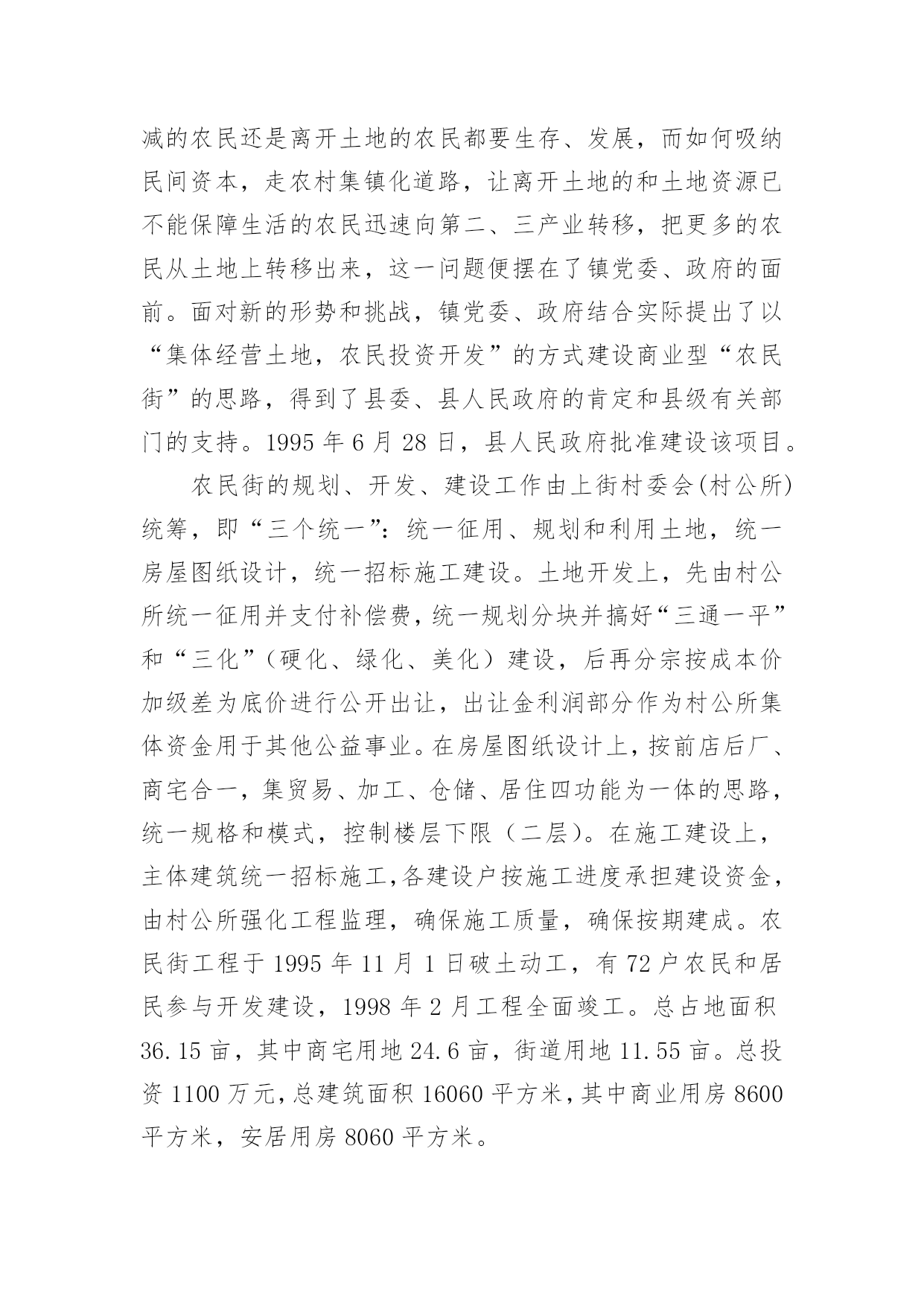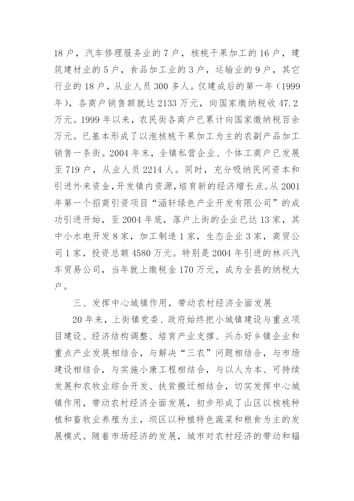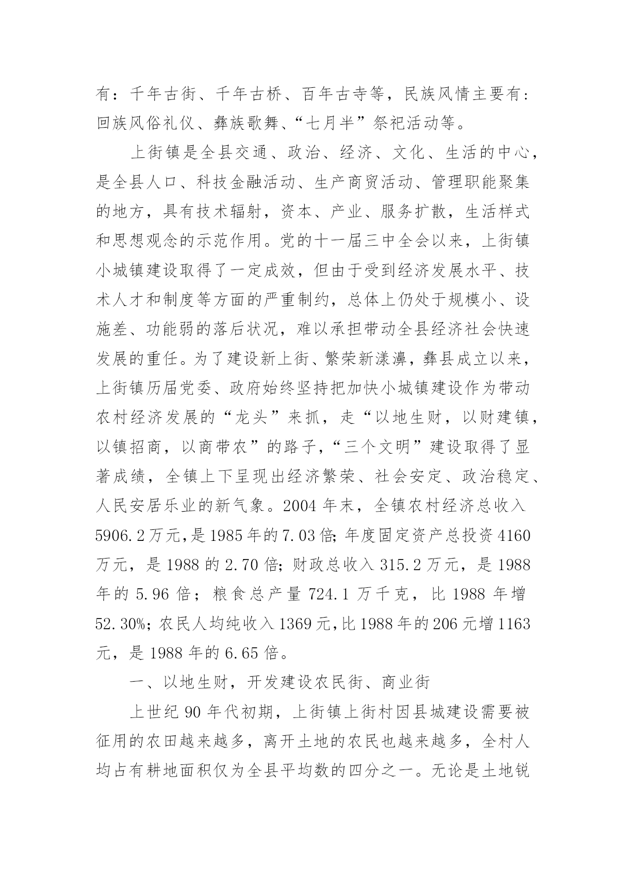 乡镇工作总结乡镇工作总结——发挥中心城镇作用加快城镇化进程上街镇位于县境中部偏北,东以点苍山脊为界交大理市,南接河西镇,西连富恒、太平二乡,北倚双涧乡、脉地镇。面积194平方千米。下设白章、白羊、淮安、石钟、美翕、密场、金星、上街8个村委会和1个社区,有103个农业合作社。人口23097人,有汉、彝、白、回、苗、傈僳等13个民族,彝族占总人口的26.60%。镇人民政府驻上街环城路北段,距州府(下关)32千米。上街始设于1926年。曾名“兴文”、“新化”、“化平”。1950年属化平区,1952年属第一区,1957年设上街乡,1958年漾濞县并入大理市后设上街公社,1961年复设漾濞县后分设漾濞、淮安、白羊三公社,1962年属漾濞公社,1963年属上街区,1966年将城镇人口划出设上街镇,农业人口连同其他农村大队同设淮安公社,1988年将淮安区、上街镇合并设今上街镇。上街镇居漾濞江河谷,是县内稻谷主产区之一。县城上街在本镇境内,省级公路平甸线穿越本镇,交通便捷,商贸繁华,土地资源、劳动力资源、生物资源富集。支柱产业为:核桃、特色作物、小水电、畜牧;当地知名产品(土特名产):核桃系列食品、腌生、卷粉等;自然景观主要有:百丈崖桥、白石悬钟、鹤峰仙迹、凤山雨霁等;人文景观主要有:千年古街、千年古桥、百年古寺等,民族风情主要有:回族风俗礼仪、彝族歌舞、“七月半”祭祀活动等。上街镇是全县交通、政治、经济、文化、生活的中心,是全县人口、科技金融活动、生产商贸活动、管理职能聚集的地方,具有技术辐射,资本、产业、服务扩散,生活样式和思想观念的示范作用。党的十一届三中全会以来,上街镇小城镇建设取得了一定成效,但由于受到经济发展水平、技术人才和制度等方面的严重制约,总体上仍处于规模小、设施差、功能弱的落后状况,难以承担带动全县经济社会快速发展的重任。为了建设新上街、繁荣新漾濞,彝县成立以来,上街镇历届党委、政府始终坚持把加快小城镇建设作为带动农村经济发展的“龙头”来抓,走“以地生财,以财建镇,以镇招商,以商带农”的路子,“三个文明”建设取得了显著成绩,全镇上下呈现出经济繁荣、社会安定、政治稳定、人民安居乐业的新气象。2004年末,全镇农村经济总收入5906.2万元,是1985年的7.03倍;年度固定资产总投资4160万元,是1988的2.70倍;财政总收入315.2万元,是1988年的5.96倍;粮食总产量724.1万千克,比1988年增52.30%;农民人均纯收入1369元,比1988年的206元增1163元,是1988年的6.65倍。一、以地生财,开发建设农民街、商业街上世纪90年代初期,上街镇上街村因县城建设需要被征用的农田越来越多,离开土地的农民也越来越多,全村人均占有耕地面积仅为全县平均数的四分之一。无论是土地锐减的农民还是离开土地的农民都要生存、发展,而如何吸纳民间资本,走农村集镇化道路,让离开土地的和土地资源已不能保障生活的农民迅速向第二、三产业转移,把更多的农民从土地上转移出来,这一问题便摆在了镇党委、政府的面前。面对新的形势和挑战,镇党委、政府结合实际提出了以“集体经营土地,农民投资开发”的方式建设商业型“农民街”的思路,得到了县委、县人民政府的肯定和县级有关部门的支持。1995年6月28日,县人民政府批准建设该项目。农民街的规划、开发、建设工作由上街村委会(村公所)统筹,即“三个统一”:统一征用、规划和利用土地,统一房屋图纸设计,统一招标施工建设。土地开发上,先由村公所统一征用并支付补偿费,统一规划分块并搞好“三通一平”和“三化”(硬化、绿化、美化)建设,后再分宗按成本价加级差为底价进行公开出让,出让金利润部分作为村公所集体资金用于其他公益事业。在房屋图纸设计上,按前店后厂、商宅合一,集贸易、加工、仓储、居住四功能为一体的思路,统一规格和模式,控制楼层下限(二层)。在施工建设上,主体建筑统一招标施工,各建设户按施工进度承担建设资金,由村公所强化工程监理,确保施工质量,确保按期建成。农民街工程于1995年11月1日破土动工,有72户农民和居民参与开发建设,1998年2月工程全面竣工。总占地面积36.15亩,其中商宅用地24.6亩,街道用地11.55亩。总投资1100万元,总建筑面积16060平方米,其中商业用房8600平方米,安居用房8060平方米。“农民街”是县内小城镇发展中第一个把农民引进市场、引入城市、引进小康的成功范例,为农民发展经济、解决就业、节约土地找到了一条根本的出路,为农民进城“造饭碗”提供了平台。借鉴“农民街”开发的成功经验,自1995年以来,按“三纵一横”的规划,上街镇先后开发了占地面积65.7亩的“私营经济一条街”,形成以住宅建设为中心的整个城市基础设施建设的投资热点和消费热点,并实施了县城主要街道的“硬化