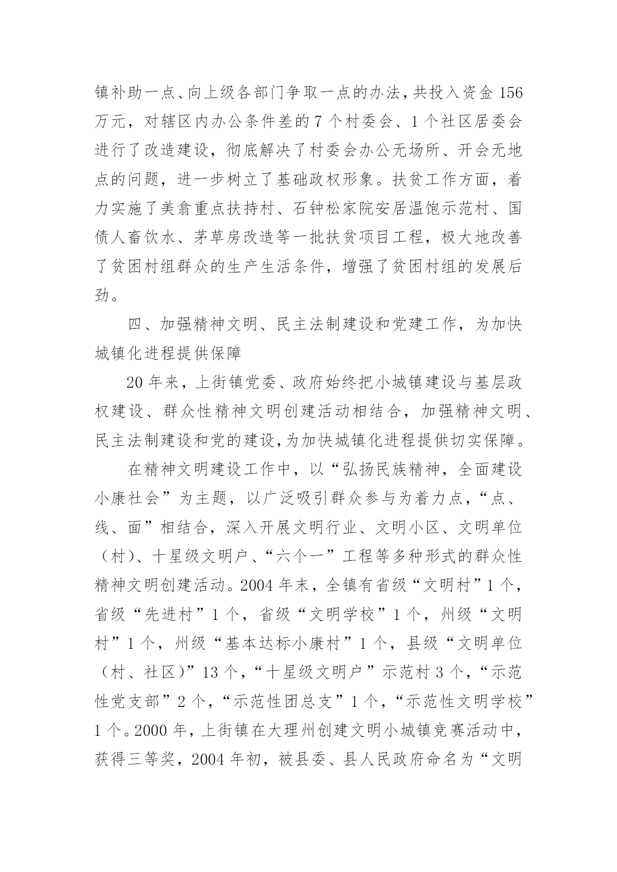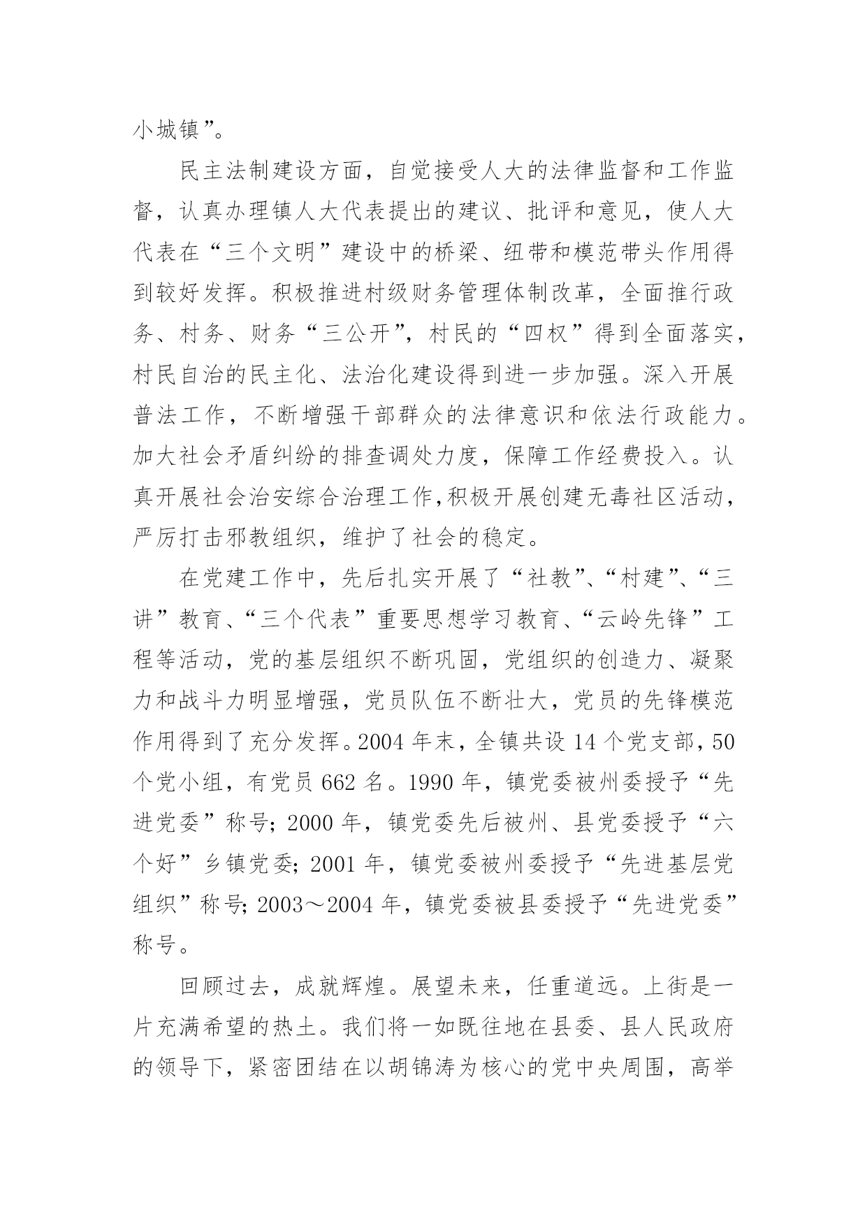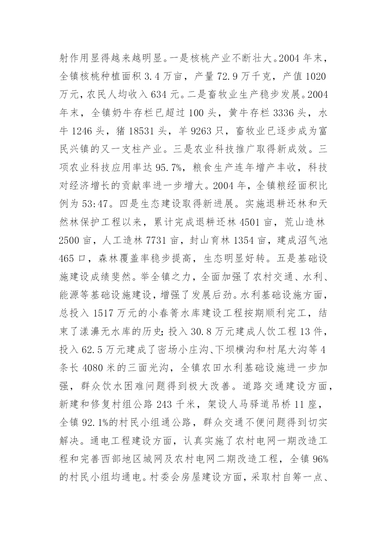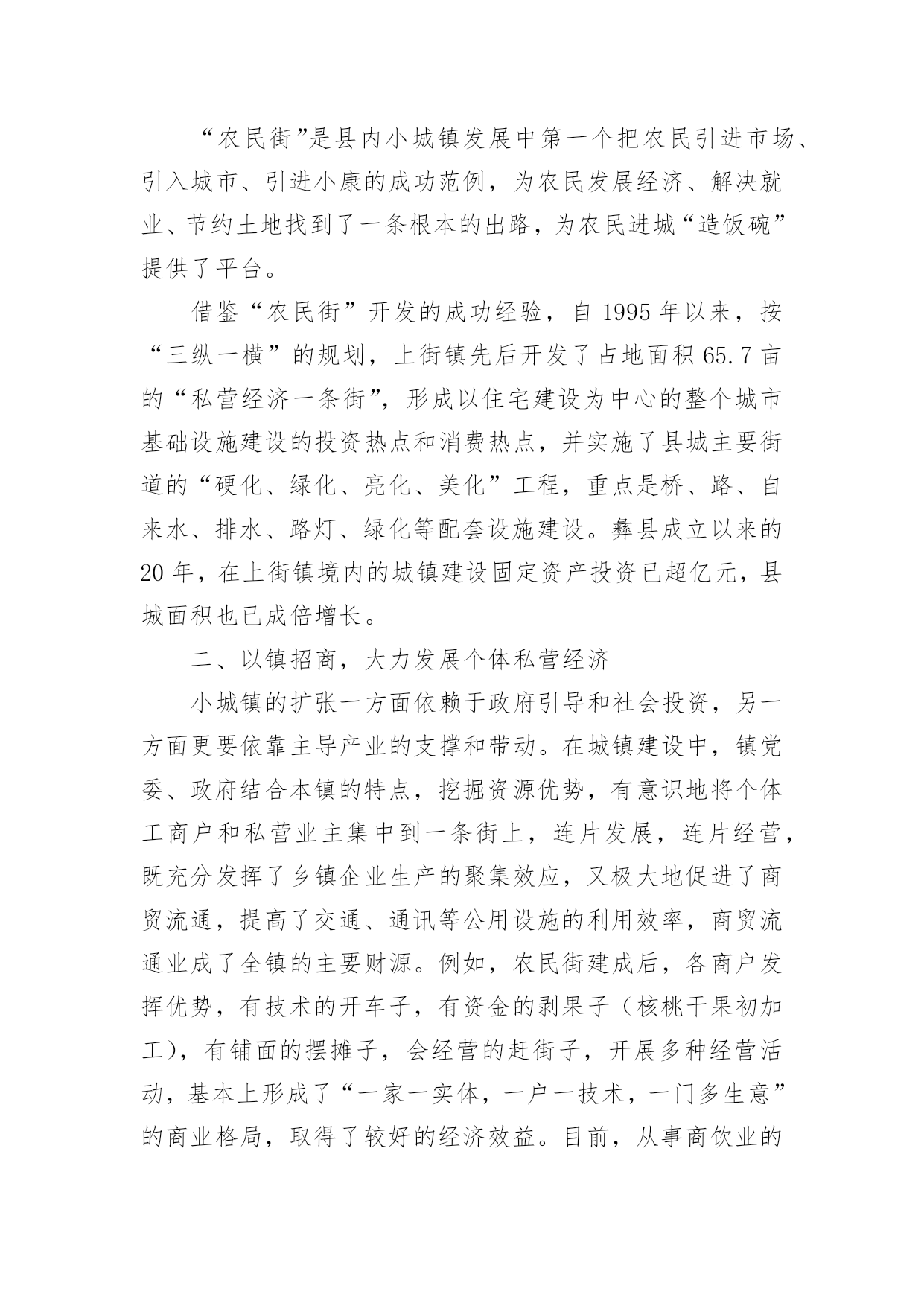 乡镇工作总结乡镇工作总结——发挥中心城镇作用加快城镇化进程上街镇位于县境中部偏北,东以点苍山脊为界交大理市,南接河西镇,西连富恒、太平二乡,北倚双涧乡、脉地镇。面积194平方千米。下设白章、白羊、淮安、石钟、美翕、密场、金星、上街8个村委会和1个社区,有103个农业合作社。人口23097人,有汉、彝、白、回、苗、傈僳等13个民族,彝族占总人口的26.60%。镇人民政府驻上街环城路北段,距州府(下关)32千米。上街始设于1926年。曾名“兴文”、“新化”、“化平”。1950年属化平区,1952年属第一区,1957年设上街乡,1958年漾濞县并入大理市后设上街公社,1961年复设漾濞县后分设漾濞、淮安、白羊三公社,1962年属漾濞公社,1963年属上街区,1966年将城镇人口划出设上街镇,农业人口连同其他农村大队同设淮安公社,1988年将淮安区、上街镇合并设今上街镇。上街镇居漾濞江河谷,是县内稻谷主产区之一。县城上街在本镇境内,省级公路平甸线穿越本镇,交通便捷,商贸繁华,土地资源、劳动力资源、生物资源富集。支柱产业为:核桃、特色作物、小水电、畜牧;当地知名产品(土特名产):核桃系列食品、腌生、卷粉等;自然景观主要有:百丈崖桥、白石悬钟、鹤峰仙迹、凤山雨霁等;人文景观主要有:千年古街、千年古桥、百年古寺等,民族风情主要有:回族风俗礼仪、彝族歌舞、“七月半”祭祀活动等。上街镇是全县交通、政治、经济、文化、生活的中心,是全县人口、科技金融活动、生产商贸活动、管理职能聚集的地方,具有技术辐射,资本、产业、服务扩散,生活样式和思想观念的示范作用。党的十一届三中全会以来,上街镇小城镇建设取得了一定成效,但由于受到经济发展水平、技术人才和制度等方面的严重制约,总体上仍处于规模小、设施差、功能弱的落后状况,难以承担带动全县经济社会快速发展的重任。为了建设新上街、繁荣新漾濞,彝县成立以来,上街镇历届党委、政府始终坚持把加快小城镇建设作为带动农村经济发展的“龙头”来抓,走“以地生财,以财建镇,以镇招商,以商带农”的路子,“三个文明”建设取得了显著成绩,全镇上下呈现出经济繁荣、社会安定、政治稳定、人民安居乐业的新气象。2004年末,全镇农村经济总收入5906.2万元,是1985年的7.03倍;年度固定资产总投资4160万元,是1988的2.70倍;财政总收入315.2万元,是1988年的5.96倍;粮食总产量724.1万千克,比1988年增52.30%;农民人均纯收入1369元,比1988年的206元增1163元,是1988年的6.65倍。一、以地生财,开发建设农民街、商业街上世纪90年代初期,上街镇上街村因县城建设需要被征用的农田越来越多,离开土地的农民也越来越多,全村人均占有耕地面积仅为全县平均数的四分之一。无论是土地锐减的农民还是离开土地的农民都要生存、发展,而如何吸纳民间资本,走农村集镇化道路,让离开土地的和土地资源已不能保障生活的农民迅速向第二、三产业转移,把更多的农民从土地上转移出来,这一问题便摆在了镇党委、政府的面前。面对新的形势和挑战,镇党委、政府结合实际提出了以“集体经营土地,农民投资开发”的方式建设商业型“农民街”的思路,得到了县委、县人民政府的肯定和县级有关部门的支持。1995年6月28日,县人民政府批准建设该项目。农民街的规划、开发、建设工作由上街村委会(村公所)统筹,即“三个统一”:统一征用、规划和利用土地,统一房屋图纸设计,统一招标施工建设。土地开发上,先由村公所统一征用并支付补偿费,统一规划分块并搞好“三通一平”和“三化”(硬化、绿化、美化)建设,后再分宗按成本价加级差为底价进行公开出让,出让金利润部分作为村公所集体资金用于其他公益事业。在房屋图纸设计上,按前店后厂、商宅合一,集贸易、加工、仓储、居住四功能为一体的思路,统一规格和模式,控制楼层下限(二层)。在施工建设上,主体建筑统一招标施工,各建设户按施工进度承担建设资金,由村公所强化工程监理,确保施工质量,确保按期建成。农民街工程于1995年11月1日破土动工,有72户农民和居民参与开发建设,1998年2月工程全面竣工。总占地面积36.15亩,其中商宅用地24.6亩,街道用地11.55亩。总投资1100万元,总建筑面积16060平方米,其中商业用房8600平方米,安居用房8060平方米。“农民街”是县内小城镇发展中第一个把农民引进市场、引入城市、引进小康的成功范例,为农民发展经济、解决就业、节约土地找到了一条根本的出路,为农民进城“造饭碗”提供了平台。借鉴“农民街”开发的成功经验,自1995年以来,按“三纵一横”的规划,上街镇先后开发了占地面积65.7亩的“私营经济一条街”,形成以住宅建设为中心的整个城市基础设施建设的投资热点和消费热点,并实施了县城主要街道的“硬化