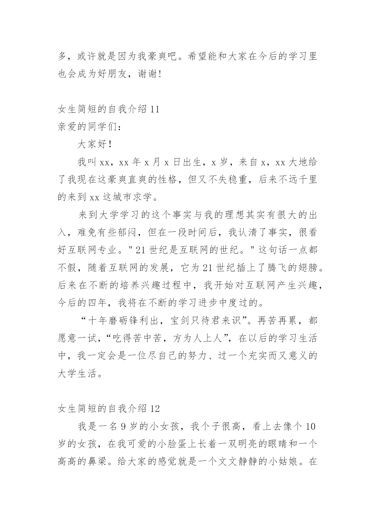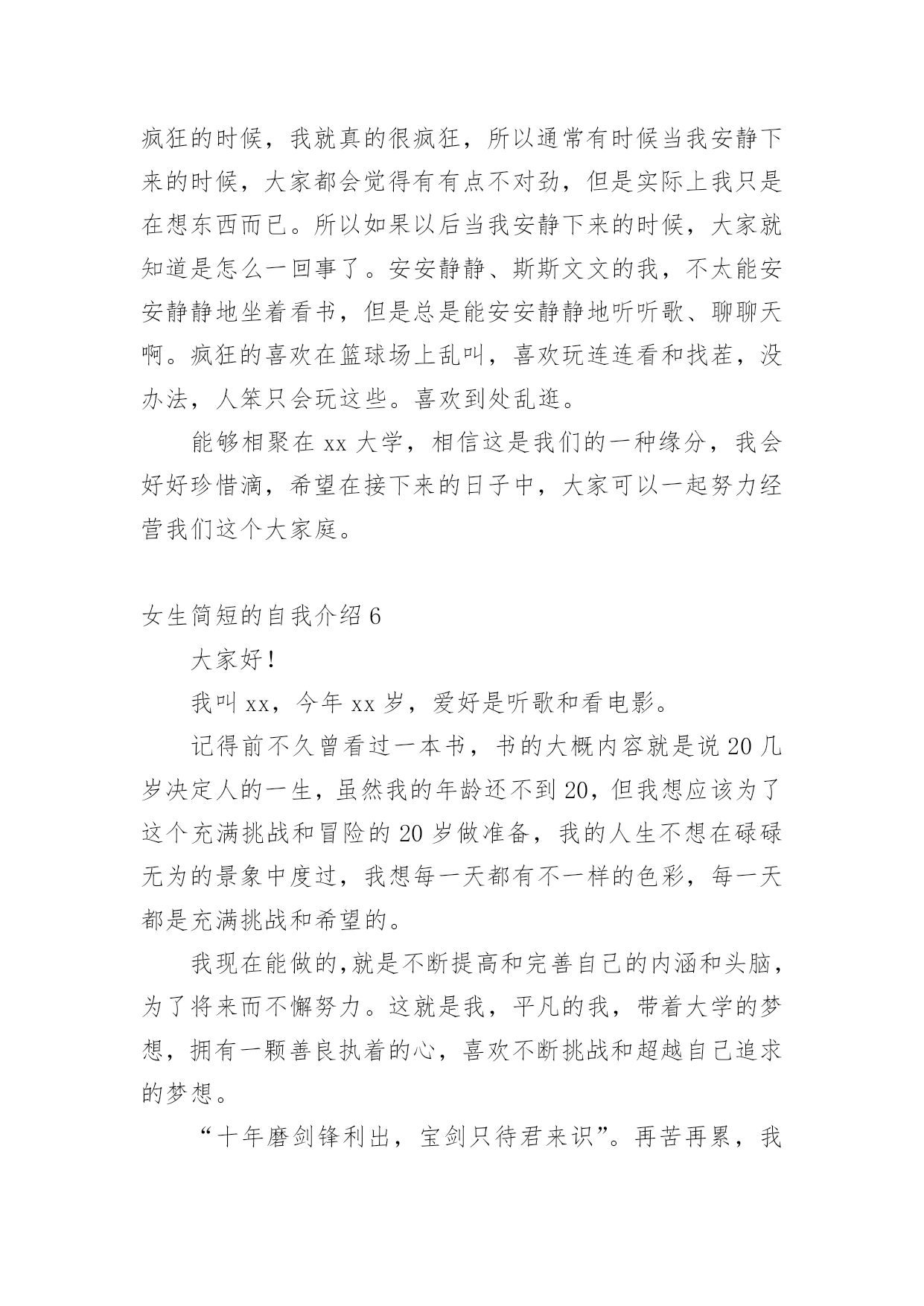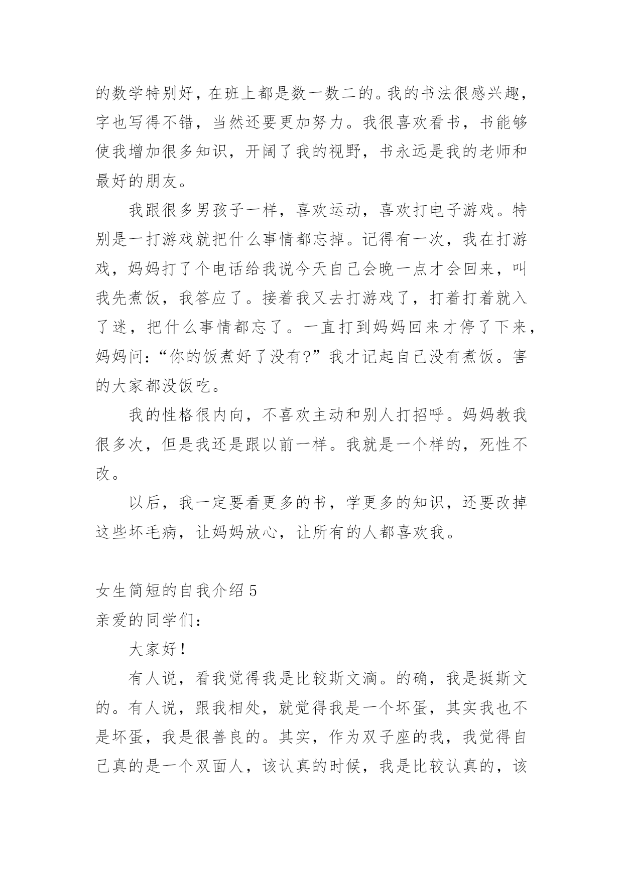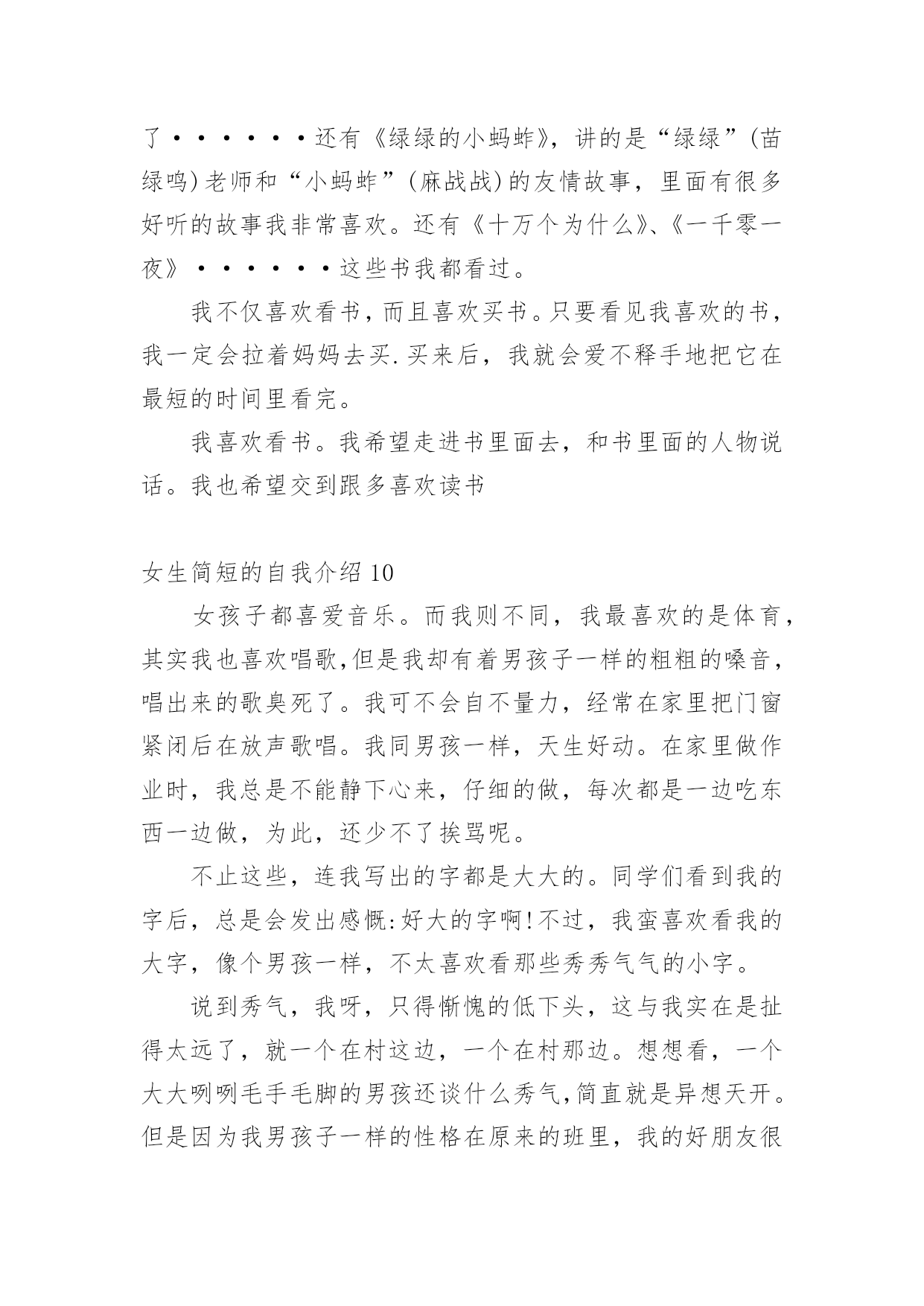 女生简短的自我介绍初到一个新的环境,我们不得不需要向他人介绍自己,自我介绍有助于自我宣传、自我展示。写起自我介绍来就毫无头绪?以下是小编为大家整理的女生简短的自我介绍,希望能够帮助到大家。女生简短的自我介绍1各位老师、同学,大家好:我叫xxx,刘畅的刘,刘畅的畅。幼年时曾作过许多色彩斑斓的梦,当个播音员、或者当一名电视节目主持人是我的梦想。于是,我利用一切机会学播音,练演讲,说相声,打快板,表演舞蹈,主持节目。我参加爸爸所在部队的春节文艺晚会,我表演的快板书绕口令受到战士们的热烈欢迎。我深深的明白,作一名合格的播音员或者电视节目主持人是一件十分不容易的事情,成长的道路上会有成功的喜悦,但更多的是失败的沮丧;会有收获的幸福,但更多的是耕耘的艰辛。但我有勇气、有决心去应对这一切。于是,这天,我站在了同学们中间。我和在座的同学们一样,渴望展翅高飞,渴望将来有更大的发展空间,有施展才华的更广阔的天地。我想,有耕耘就会有收获。未来的四年里,有各位老师的倾情传授,我们一定会有一个无限完美的未来。谢谢大家!女生简短的自我介绍2大家好!我自己叫xxx,来自xx。很高兴能够走入学术氛围浓厚的xxxx学院。毕竟,对于每一位学子来说,xx,都是一个值得用花季年华去拼搏的理想。如今,它更是成为青春的驿站,梦想的舞台,奋斗的蓝天。今天,终于来到了xx,来到了美丽的大学校园。当xx学院专业考试分数下来,全省第xx名的成绩也并没有给我带来喜悦。我自己还是在学习,在练琴,一丝一毫都不敢懈怠。老师说:你文化课成绩已经不错了,为什么还要搞艺术?同学说:你的小提琴水平早已通过了中国音乐学院8级考试,为什么还要练琴直到深夜呢?我自己不知道应该如何回答,只知道必须努力,甚至竭尽全力。为了梦想,为了能够步入大学的殿堂。终于梦想成真了,我自己热爱艺术,但我自己更热爱的是汉语言文学。尽管我自己放弃了艺术,但是曾经为艺术洒下的汗水并没有浪费,因为艺术本来就能够帮助我自己们更好的理解文学,使文学与艺术相结合,开出美丽的花,结出幸福的果。我真诚的希望在老师和同学的帮助下能够把自己在艺术领域的特长在汉语言文学专业上得到发挥。谢谢大家!女生简短的自我介绍3同学们大家好,我叫xxx,今年xx岁了。本人是一个活泼开朗的女孩,性格比较随和,下课后总会听到我愉快的笑声。下课后有时会帮成绩不好的同学讲一下题,我还会帮助别人做我应该做的事。我觉得帮助别人自己也会觉得高兴的!我从小就学弹琴,现在弹得还算好的哟!我还学过跳舞,我学了xx年了。我还在重庆的艺校考了舞蹈xx级的证书。这就是我,一个大方开朗的女孩!在今后的生活中,我会努力和大家成为好朋友,谢谢!女生简短的自我介绍4朋友们,你们认识我吗?我叫xxx,今年13岁,在xx学校上七年级,在中文学校读第八册。我的眼睛很大很有神,我的鼻子高高的,挺挺的,我的耳朵也很大,我的嘴巴不大不小正正好,我的样子不错吧!我做任何事情都很认真,早上起床根本不用妈妈叫,上学一直很准时,从不迟到早退,作业也很认真完成,我很节省,妈妈给我的零用钱,我一分钱也不会花,全都存到我的“小银行”(存钱罐),等妈妈有及用的`时候,我全都拿出来给妈妈。我非常爱学习,爱读书。因为一个人不学习读书就没有知识,没有知识就没有一切。妈妈说知识就是最大的财富,现在我的最大任务就是学习,努力学好各门知识,我的数学特别好,在班上都是数一数二的。我的书法很感兴趣,字也写得不错,当然还要更加努力。我很喜欢看书,书能够使我增加很多知识,开阔了我的视野,书永远是我的老师和最好的朋友。我跟很多男孩子一样,喜欢运动,喜欢打电子游戏。特别是一打游戏就把什么事情都忘掉。记得有一次,我在打游戏,妈妈打了个电话给我说今天自己会晚一点才会回来,叫我先煮饭,我答应了。接着我又去打游戏了,打着打着就入了迷,把什么事情都忘了。一直打到妈妈回来才停了下来,妈妈问:“你的饭煮好了没有?”我才记起自己没有煮饭。害的大家都没饭吃。我的性格很内向,不喜欢主动和别人打招呼。妈妈教我很多次,但是我还是跟以前一样。我就是一个样的,死性不改。以后,我一定要看更多的书,学更多的知识,还要改掉这些坏毛病,让妈妈放心,让所有的人都喜欢我。女生简短的自我介绍5亲爱的同学们:大家好!有人说,看我觉得我是比较斯文滴。的确,我是挺斯文的。有人说,跟我相处,就觉得我是一个坏蛋,其实我也不是坏蛋,我是很善良的。其实,作为双子座的我,我觉得自己真的是一个双面人,该认真的时候,我是比较认真的,该疯狂的时候,我就真的很疯狂,所以通常有时候当我安静下来的时候,大家都会觉得有有点不对劲,但是实际上我只是在想东西而已。所以如果以后当我安静下来的时候,大家就知道是怎么一回事了。安安静静、斯斯文文的我,不太能安安静静地坐着看书,但是总是能安安静静地听听歌、聊聊天啊。疯狂