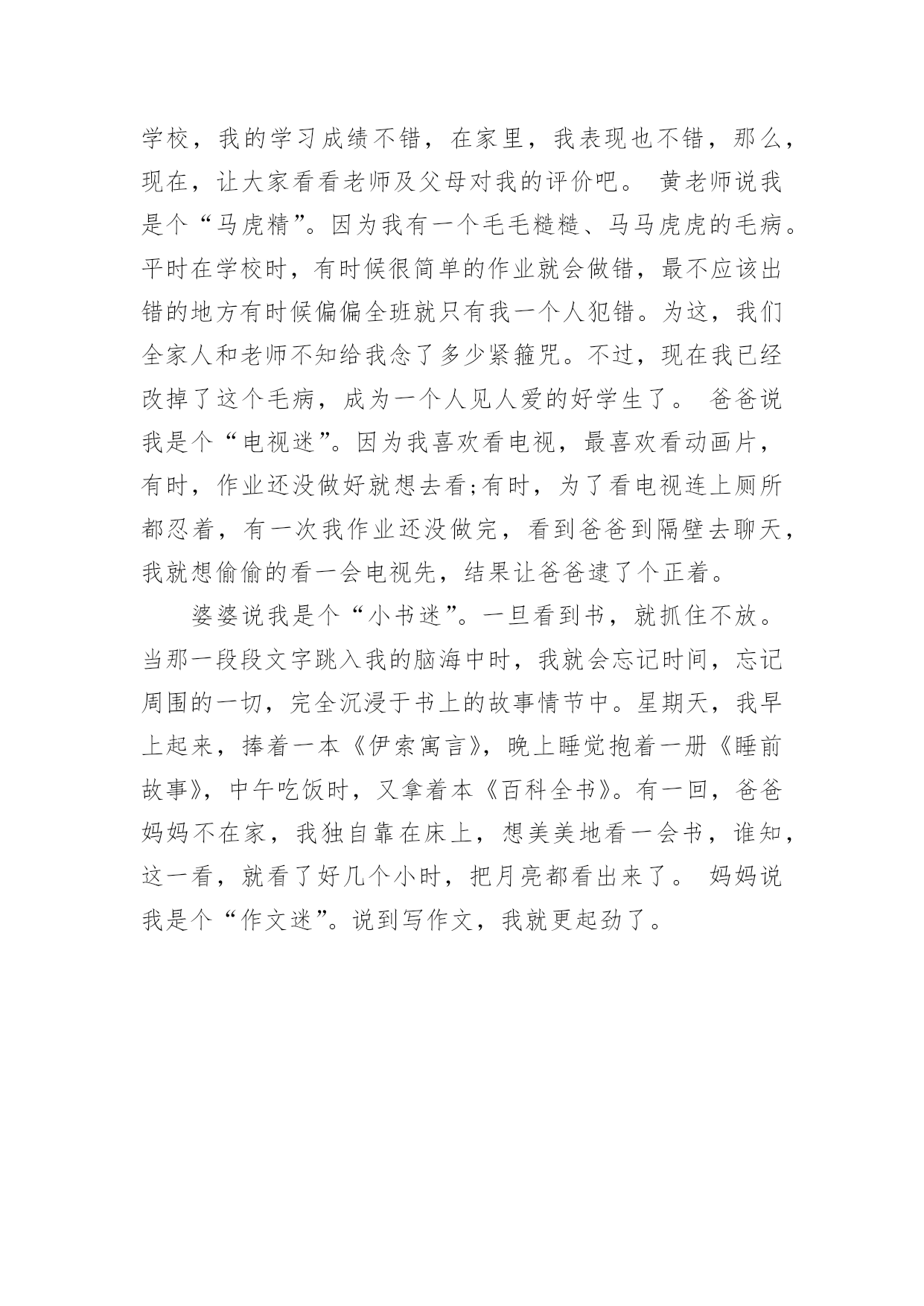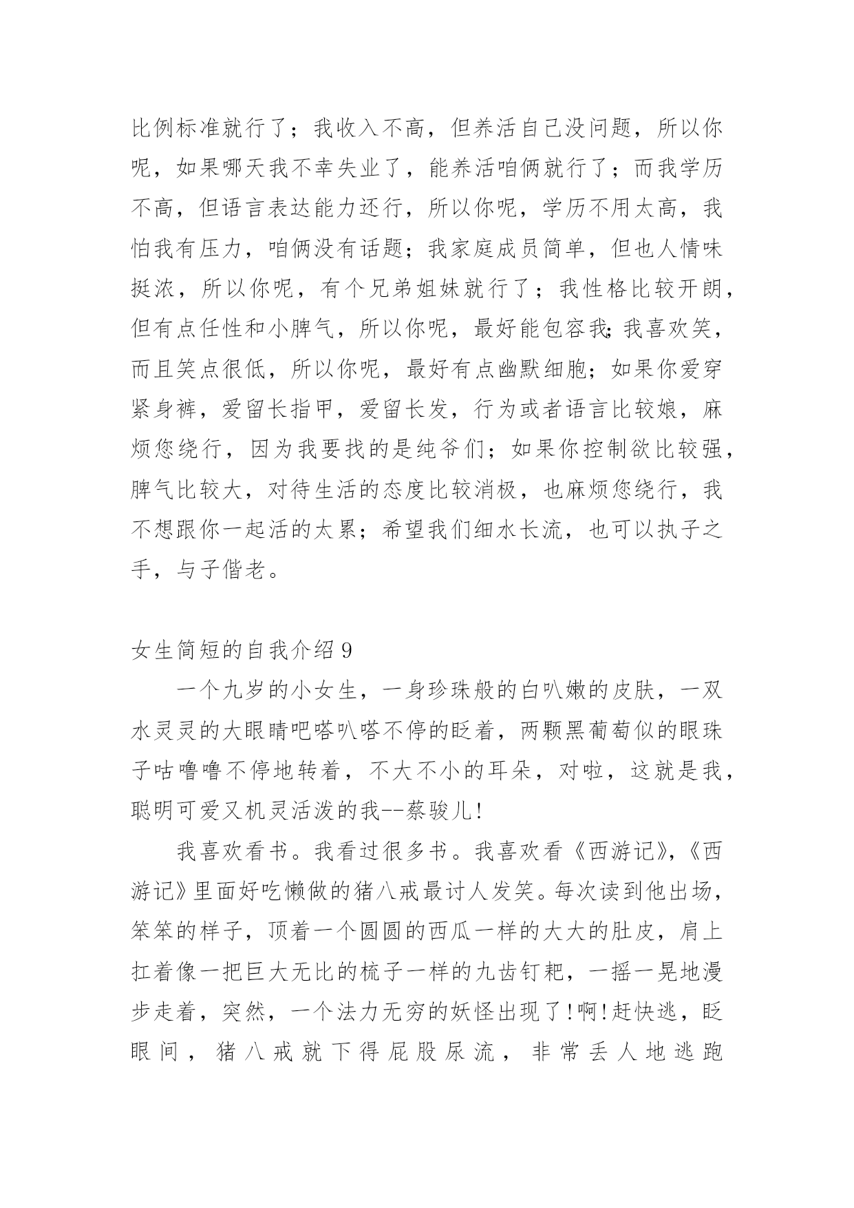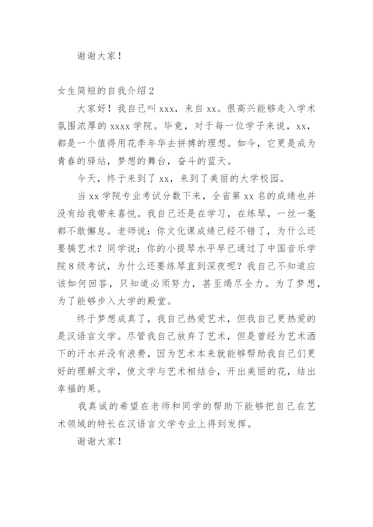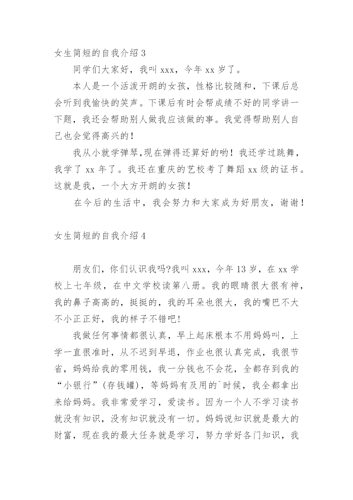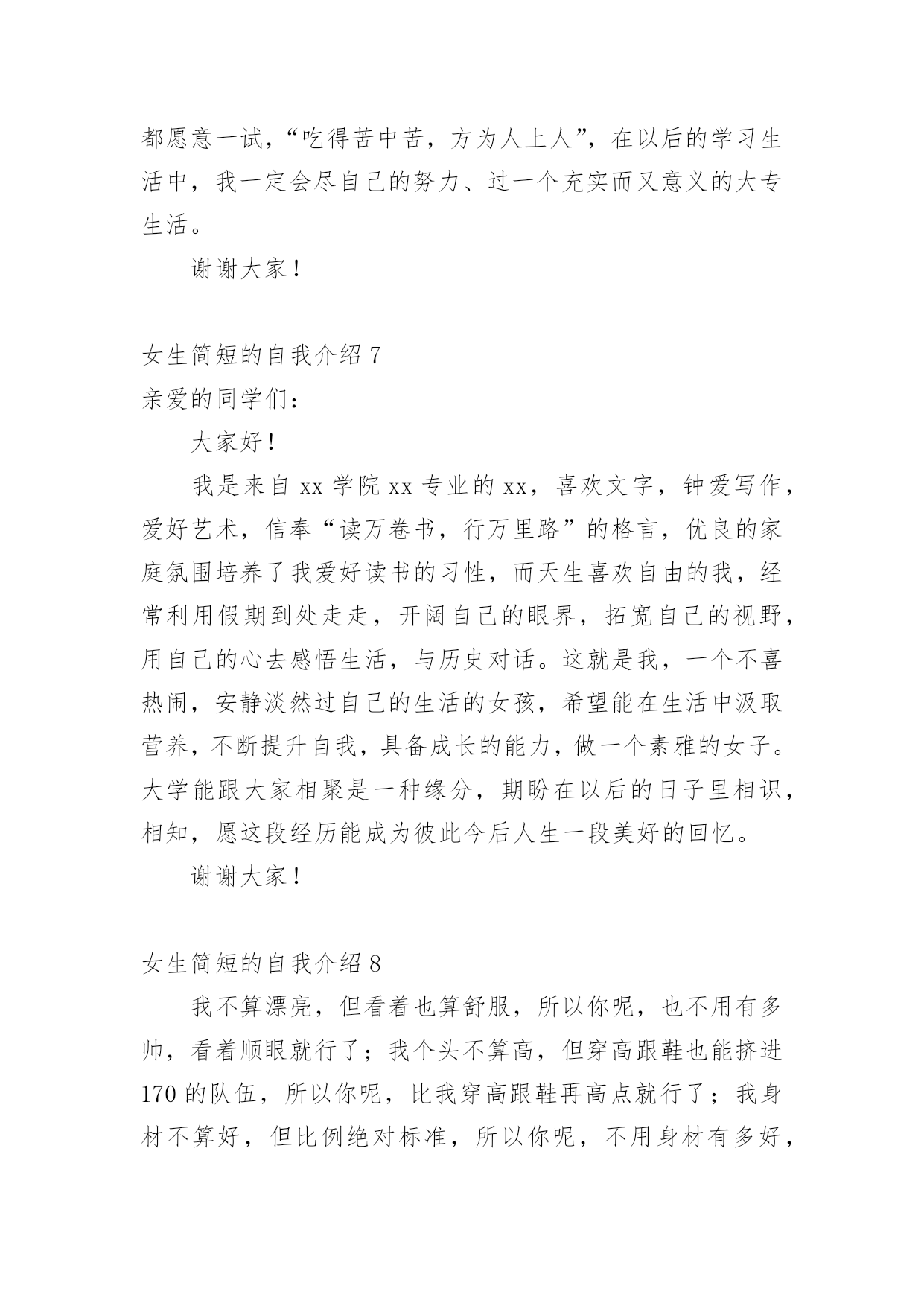 女生简短的自我介绍初到一个新的环境,我们不得不需要向他人介绍自己,自我介绍有助于自我宣传、自我展示。写起自我介绍来就毫无头绪?以下是小编为大家整理的女生简短的自我介绍,希望能够帮助到大家。女生简短的自我介绍1各位老师、同学,大家好:我叫xxx,刘畅的刘,刘畅的畅。幼年时曾作过许多色彩斑斓的梦,当个播音员、或者当一名电视节目主持人是我的梦想。于是,我利用一切机会学播音,练演讲,说相声,打快板,表演舞蹈,主持节目。我参加爸爸所在部队的春节文艺晚会,我表演的快板书绕口令受到战士们的热烈欢迎。我深深的明白,作一名合格的播音员或者电视节目主持人是一件十分不容易的事情,成长的道路上会有成功的喜悦,但更多的是失败的沮丧;会有收获的幸福,但更多的是耕耘的艰辛。但我有勇气、有决心去应对这一切。于是,这天,我站在了同学们中间。我和在座的同学们一样,渴望展翅高飞,渴望将来有更大的发展空间,有施展才华的更广阔的天地。我想,有耕耘就会有收获。未来的四年里,有各位老师的倾情传授,我们一定会有一个无限完美的未来。谢谢大家!女生简短的自我介绍2大家好!我自己叫xxx,来自xx。很高兴能够走入学术氛围浓厚的xxxx学院。毕竟,对于每一位学子来说,xx,都是一个值得用花季年华去拼搏的理想。如今,它更是成为青春的驿站,梦想的舞台,奋斗的蓝天。今天,终于来到了xx,来到了美丽的大学校园。当xx学院专业考试分数下来,全省第xx名的成绩也并没有给我带来喜悦。我自己还是在学习,在练琴,一丝一毫都不敢懈怠。老师说:你文化课成绩已经不错了,为什么还要搞艺术?同学说:你的小提琴水平早已通过了中国音乐学院8级考试,为什么还要练琴直到深夜呢?我自己不知道应该如何回答,只知道必须努力,甚至竭尽全力。为了梦想,为了能够步入大学的殿堂。终于梦想成真了,我自己热爱艺术,但我自己更热爱的是汉语言文学。尽管我自己放弃了艺术,但是曾经为艺术洒下的汗水并没有浪费,因为艺术本来就能够帮助我自己们更好的理解文学,使文学与艺术相结合,开出美丽的花,结出幸福的果。我真诚的希望在老师和同学的帮助下能够把自己在艺术领域的特长在汉语言文学专业上得到发挥。谢谢大家!女生简短的自我介绍3同学们大家好,我叫xxx,今年xx岁了。本人是一个活泼开朗的女孩,性格比较随和,下课后总会听到我愉快的笑声。下课后有时会帮成绩不好的同学讲一下题,我还会帮助别人做我应该做的事。我觉得帮助别人自己也会觉得高兴的!我从小就学弹琴,现在弹得还算好的哟!我还学过跳舞,我学了xx年了。我还在重庆的艺校考了舞蹈xx级的证书。这就是我,一个大方开朗的女孩!在今后的生活中,我会努力和大家成为好朋友,谢谢!女生简短的自我介绍4朋友们,你们认识我吗?我叫xxx,今年13岁,在xx学校上七年级,在中文学校读第八册。我的眼睛很大很有神,我的鼻子高高的,挺挺的,我的耳朵也很大,我的嘴巴不大不小正正好,我的样子不错吧!我做任何事情都很认真,早上起床根本不用妈妈叫,上学一直很准时,从不迟到早退,作业也很认真完成,我很节省,妈妈给我的零用钱,我一分钱也不会花,全都存到我的“小银行”(存钱罐),等妈妈有及用的`时候,我全都拿出来给妈妈。我非常爱学习,爱读书。因为一个人不学习读书就没有知识,没有知识就没有一切。妈妈说知识就是最大的财富,现在我的最大任务就是学习,努力学好各门知识,我的数学特别好,在班上都是数一数二的。我的书法很感兴趣,字也写得不错,当然还要更加努力。我很喜欢看书,书能够使我增加很多知识,开阔了我的视野,书永远是我的老师和最好的朋友。我跟很多男孩子一样,喜欢运动,喜欢打电子游戏。特别是一打游戏就把什么事情都忘掉。记得有一次,我在打游戏,妈妈打了个电话给我说今天自己会晚一点才会回来,叫我先煮饭,我答应了。接着我又去打游戏了,打着打着就入了迷,把什么事情都忘了。一直打到妈妈回来才停了下来,妈妈问:“你的饭煮好了没有?”我才记起自己没有煮饭。害的大家都没饭吃。我的性格很内向,不喜欢主动和别人打招呼。妈妈教我很多次,但是我还是跟以前一样。我就是一个样的,死性不改。以后,我一定要看更多的书,学更多的知识,还要改掉这些坏毛病,让妈妈放心,让所有的人都喜欢我。女生简短的自我介绍5亲爱的同学们:大家好!有人说,看我觉得我是比较斯文滴。的确,我是挺斯文的。有人说,跟我相处,就觉得我是一个坏蛋,其实我也不是坏蛋,我是很善良的。其实,作为双子座的我,我觉得自己真的是一个双面人,该认真的时候,我是比较认真的,该疯狂的时候,我就真的很疯狂,所以通常有时候当我安静下来的时候,大家都会觉得有有点不对劲,但是实际上我只是在想东西而已。所以如果以后当我安静下来的时候,大家就知道是怎么一回事了。安安静静、斯斯文文的我,不太能安安静静地坐着看书,但是总是能安安静静地听听歌、聊聊天啊。疯狂