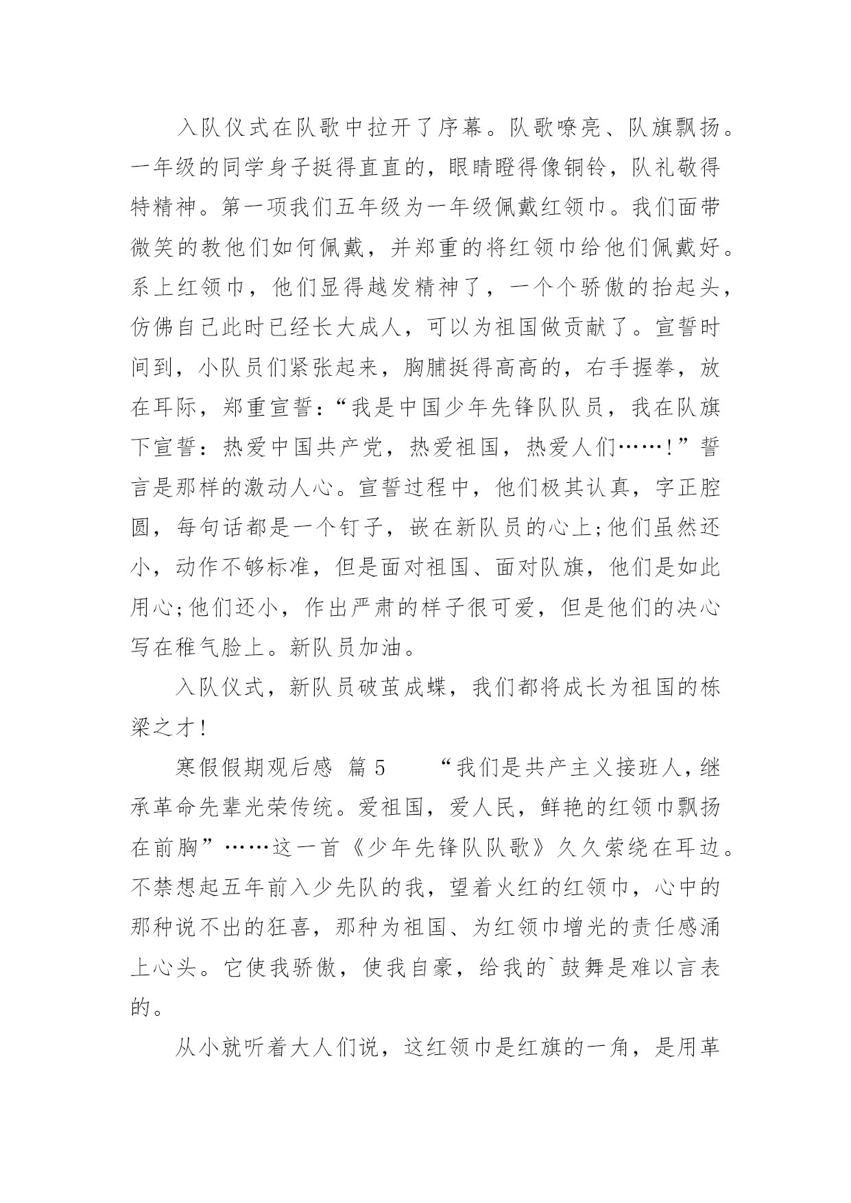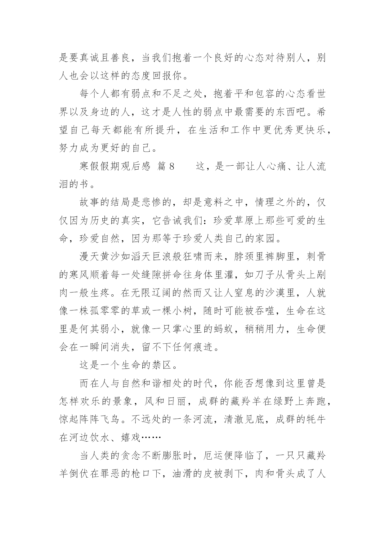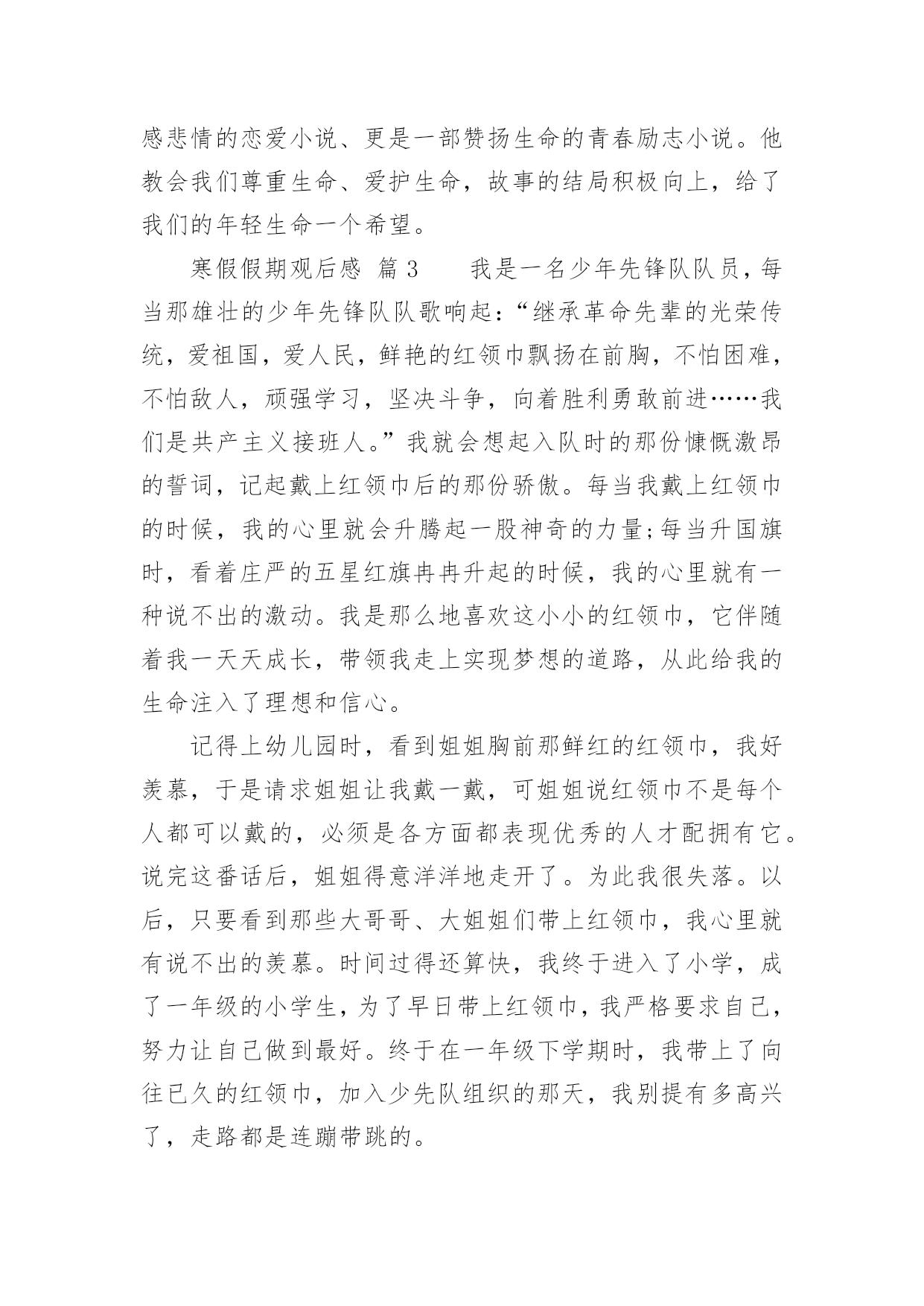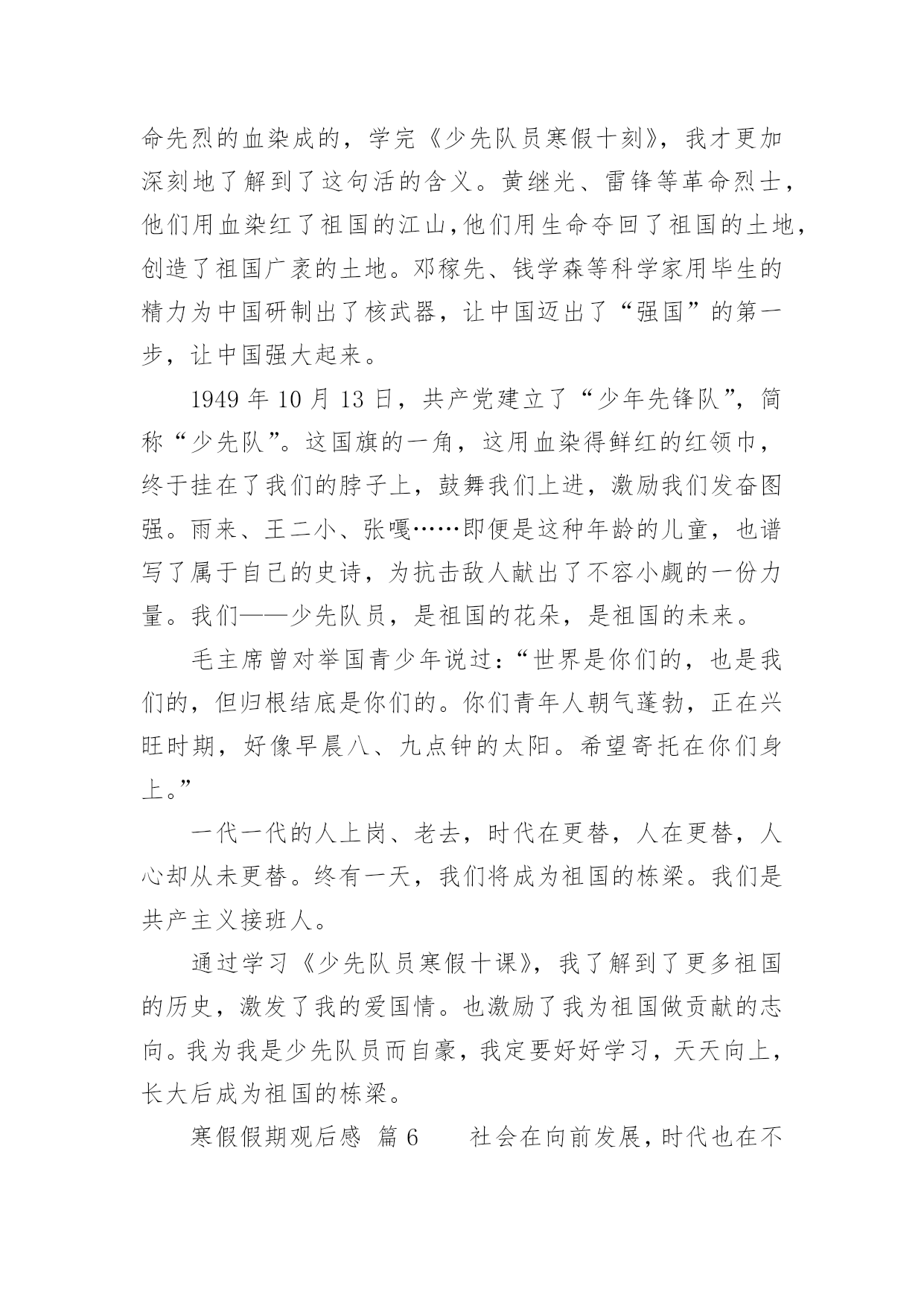 寒假假期观后感寒假假期观后感(通用30篇)当认真看完一部影视作品后,相信大家有很多值得分享的东西吧,为此就要认真思考观后感如何写了。那要怎么写好观后感呢?下面是小编收集整理的寒假假期观后感,仅供参考,欢迎大家阅读。寒假假期观后感篇1假期,是多彩的,是有趣的。每天假期来临,我便有一肚子说不完的趣事。今年,我第一次在大年初二就外出自驾游,而且,目的地还是我期盼已久的人间天堂——苏州!怀着兴奋的心情,我们坐这车子出发了,刚刚来到了高速公路口,我们要入住的宾馆传来了不好的消息:我们订的房间被取消了。姑父立即开到了加油站附近停了下来,查询了大半天,才勉强订了下来。经过两个半小时的路程,我们终于见识到了苏州的繁华,一到苏州,我就隐隐约约的`看到了那形似“秋裤”的建筑物。它的A大厦和B大厦,就仿佛是两条裤管一样,十分独特。第二天一早,我们就去SHOPPING了。我们由近到远,首先逛遍了星光天地,并在那吃到了别具一格的泰国料理,咖喱大虾,冬阴功汤、月亮虾饼、小吃拼盘、咖喱螃蟹……让我大饱口福。填饱了肚子,我们又来到了久光百货。在那里,我找到了梦寐以求的无印良品店,还看到了各种各样的服饰店,简直是应有尽有。晚上,我们又吃到了韩国烤肉和烧鹅心里真是乐不可支呢!到了第二天,我们又来到了梦幻小镇。在那里,我们来到了千鹊桥。恰巧,我们遇上了那里的新春活动,桥上人山人海,还有一只硕大的纸凤凰坐立在桥中央,周围还环绕许多喜鹊。那些喜鹊个个活灵活现,栩栩如生漂亮至极!这一次,我在苏州感受到了繁华大都市人们的热情好客,美食的可口……下次,我一定还要再故地重游美丽的苏州。寒假假期观后感篇2真正读这本书是在初中时,年纪太幼的我无法懂得生命对于每个人来说仅此一次,如此之宝贵。20岁的我刚上大学和渡边一样寄宿学校,他所经历的青春年华,不敢说是和自己如出一辙,但却感同身受。渡边的际遇很好,除了生病住在疗养院的直子对他好,还有那活泼开朗的绿子陪伴着。一个人最开心的莫过于有个红颜知己,在开心、落寞时寸步不离的陪伴。而渡边对于她俩来说不仅是知己,还是媒介一个和外边世界相连的介质。人一直感叹生命的伟大,甚至有时候渺小得无法掌控自己的生命。直子和木月都生活在"无人岛"上,虽然都试图融入外边的世界,但最终都因过程的艰辛,葬身在半途。直子以自杀结束了自己花样的年华,使这17岁黄金般的岁月戛然而止;木月也只能生活在看似平静的疗养院,最后也成了谜一样的死去。渡边看着身边至亲至爱的人的离去,自己却能在死亡的气息中坚强的活下来。他,一个有着顽强生命力的机体,才是最伟大的生命体。年轻的生命总是充满着挑战、迷茫、曲折的探索。只是生存方式因人而异,态度也不尽相同,有时面对死亡,我们充满着恐惧,怕自己死后一无所有。对于已逝世的亡者,我们感伤、我们悲痛,倒也是体现对亡者的怀念,若只是一味的哀伤而忘却自己生存的目的,那种哀痛唯有变成精神的腐蚀,让生者失去希望,甚至断送前程。这不就违背了我们一直推崇的"逝者安息,生者奋进"的激进态度吗?或许伤痛会让人不能自已。当新的希望出现,我们就不该为过去感伤,更该带着缅怀去直面人生。从另外的角度看,死的价值提醒我们,要冲破思想的囚笼、要逃脱对死亡的恐惧、要有重新迈向幸福的动力。毕竟就像渡边说的,无论怎样的哲理、怎样的真诚、怎样的`柔情,也无以排遣这种悲哀。我们唯一能做到的,就是从这片悲哀中挣脱出来,并从中领悟到某种哲理。小说不仅反映现实生活,还是我们播撒希望的一块净土。这篇小说将人生态度、青春的迷雾与追求未来贯穿于全书,虽悲情但又不失它的甜蜜。生命如此短暂,仿佛也能从这些短暂中悟出道理。准备打发和消磨生命的人,认为生命是漫长,并且以种.种的方式去回避生活。无视生命的人,失去后才知道它的珍贵。在短暂的人生旅途中,细细品味生命的美好,感悟青春的魅力,珍惜每一件事物,都是对自己负责、对生命负责的体现。渡边君的青春经历,是一曲缓缓煽情的乐曲、是一部伤感悲情的恋爱小说、更是一部赞扬生命的青春励志小说。他教会我们尊重生命、爱护生命,故事的结局积极向上,给了我们的年轻生命一个希望。寒假假期观后感篇3我是一名少年先锋队队员,每当那雄壮的少年先锋队队歌响起:“继承革命先辈的光荣传统,爱祖国,爱人民,鲜艳的红领巾飘扬在前胸,不怕困难,不怕敌人,顽强学习,坚决斗争,向着胜利勇敢前进……我们是共产主义接班人。”我就会想起入队时的那份慷慨激昂的誓词,记起戴上红领巾后的那份骄傲。每当我戴上红领巾的时候,我的心里就会升腾起一股神奇的力量;每当升国旗时,看着庄严的五星红旗冉冉升起的时候,我的心里就有一种说不出的激动。我是那么地喜欢这小小的红领巾,它伴随着我一天天成长,带领我走上实现梦想的道路,从此给我的生命注入了理想和信心。记得上幼儿园时,看到姐姐胸前那鲜