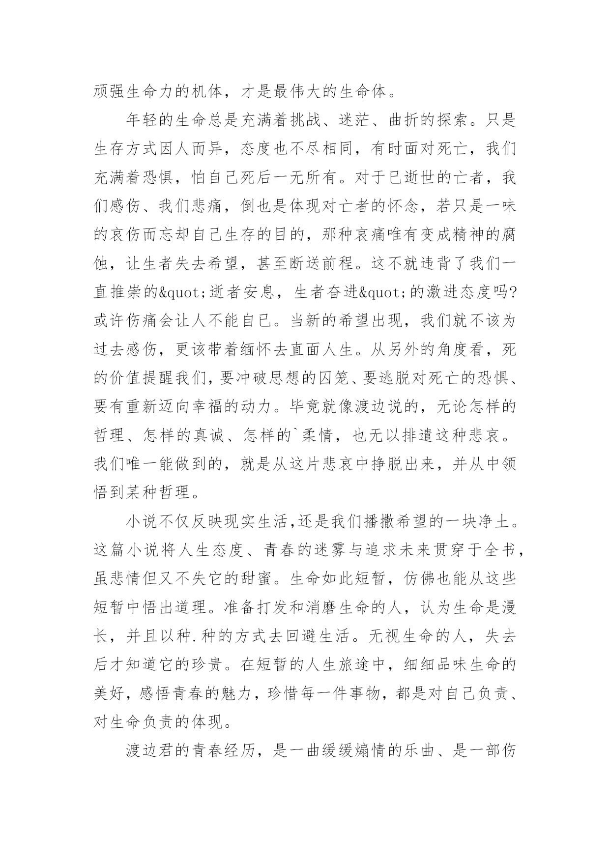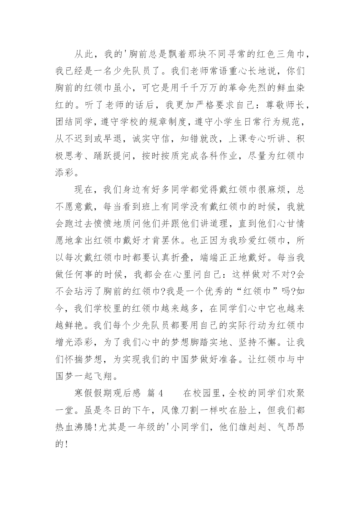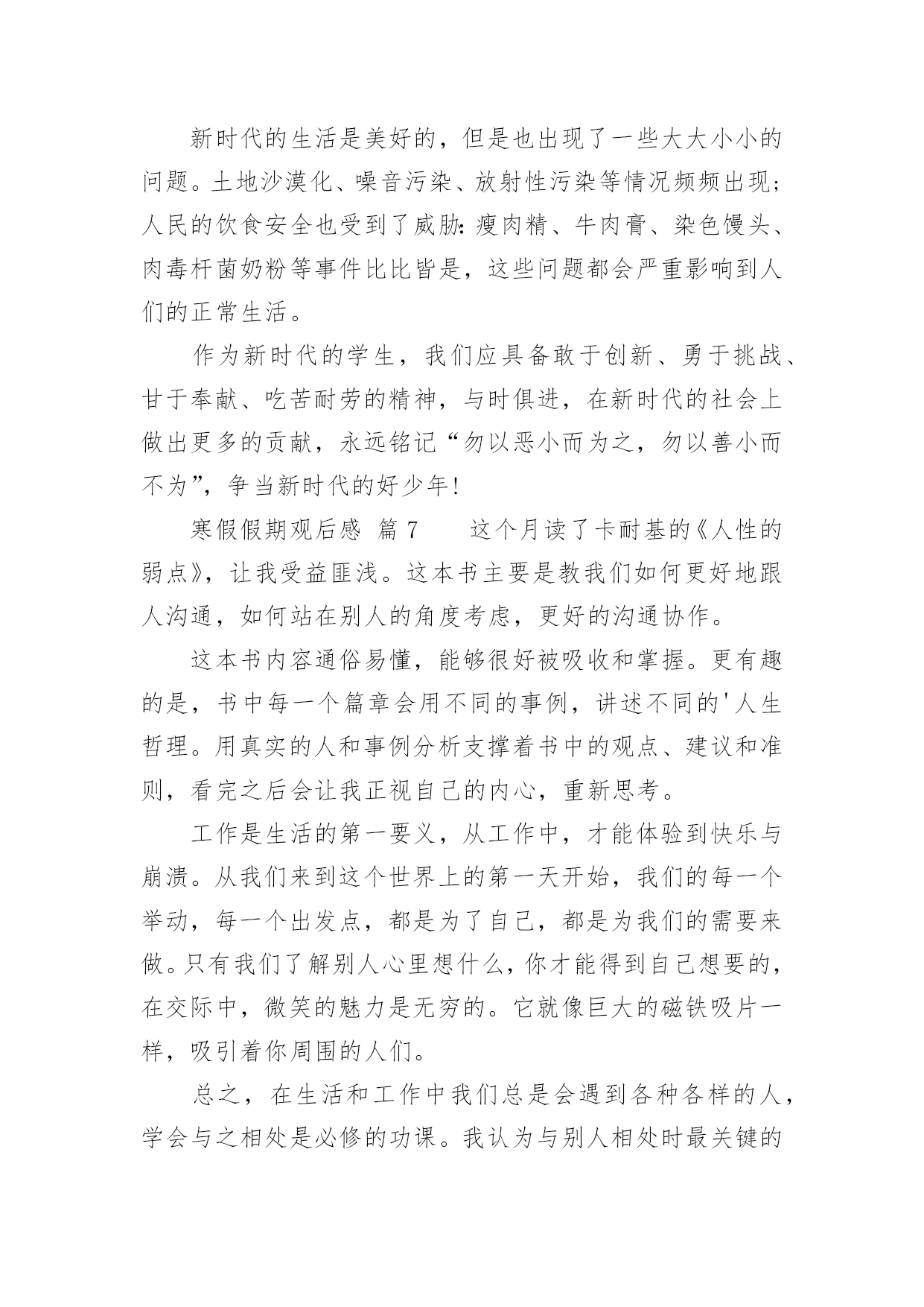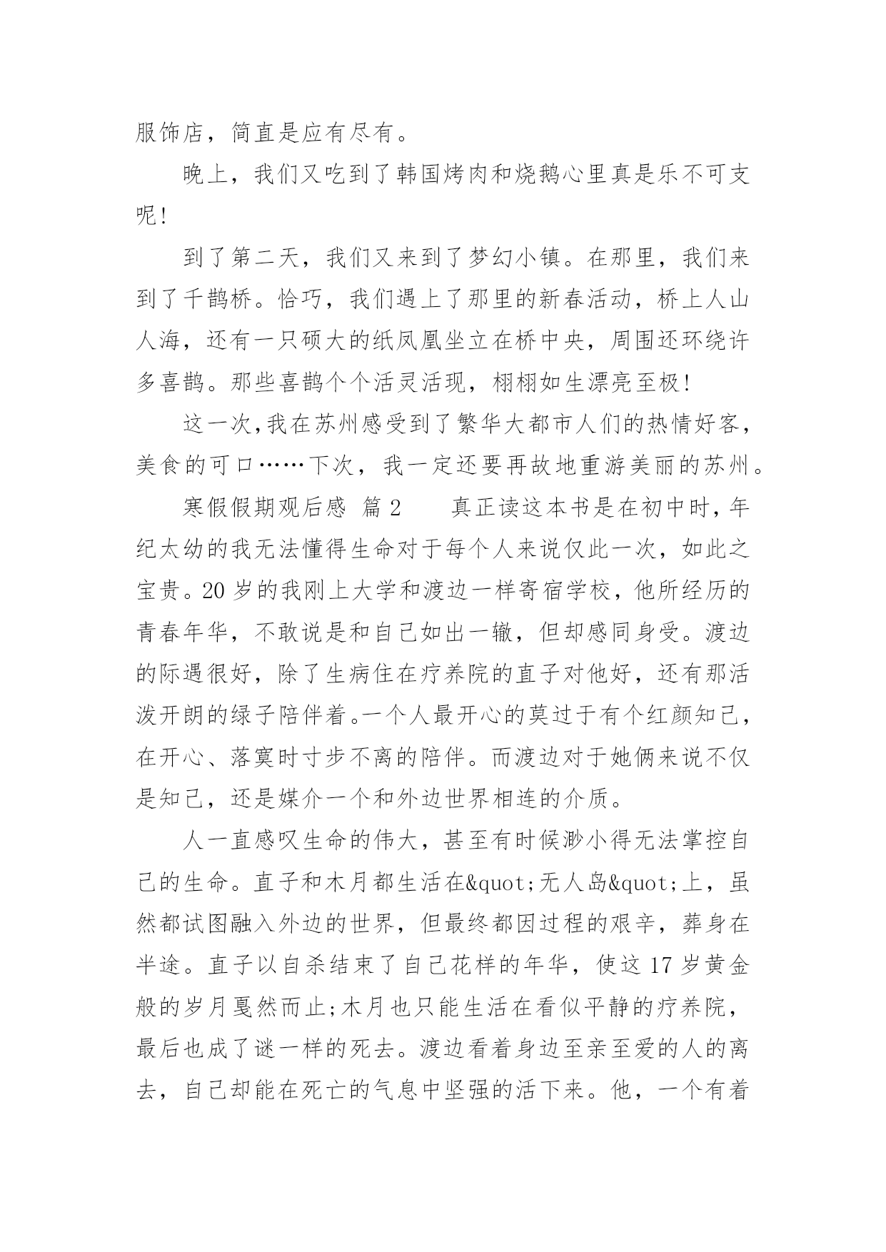 寒假假期观后感寒假假期观后感(通用30篇)当认真看完一部影视作品后,相信大家有很多值得分享的东西吧,为此就要认真思考观后感如何写了。那要怎么写好观后感呢?下面是小编收集整理的寒假假期观后感,仅供参考,欢迎大家阅读。寒假假期观后感篇1假期,是多彩的,是有趣的。每天假期来临,我便有一肚子说不完的趣事。今年,我第一次在大年初二就外出自驾游,而且,目的地还是我期盼已久的人间天堂——苏州!怀着兴奋的心情,我们坐这车子出发了,刚刚来到了高速公路口,我们要入住的宾馆传来了不好的消息:我们订的房间被取消了。姑父立即开到了加油站附近停了下来,查询了大半天,才勉强订了下来。经过两个半小时的路程,我们终于见识到了苏州的繁华,一到苏州,我就隐隐约约的`看到了那形似“秋裤”的建筑物。它的A大厦和B大厦,就仿佛是两条裤管一样,十分独特。第二天一早,我们就去SHOPPING了。我们由近到远,首先逛遍了星光天地,并在那吃到了别具一格的泰国料理,咖喱大虾,冬阴功汤、月亮虾饼、小吃拼盘、咖喱螃蟹……让我大饱口福。填饱了肚子,我们又来到了久光百货。在那里,我找到了梦寐以求的无印良品店,还看到了各种各样的服饰店,简直是应有尽有。晚上,我们又吃到了韩国烤肉和烧鹅心里真是乐不可支呢!到了第二天,我们又来到了梦幻小镇。在那里,我们来到了千鹊桥。恰巧,我们遇上了那里的新春活动,桥上人山人海,还有一只硕大的纸凤凰坐立在桥中央,周围还环绕许多喜鹊。那些喜鹊个个活灵活现,栩栩如生漂亮至极!这一次,我在苏州感受到了繁华大都市人们的热情好客,美食的可口……下次,我一定还要再故地重游美丽的苏州。寒假假期观后感篇2真正读这本书是在初中时,年纪太幼的我无法懂得生命对于每个人来说仅此一次,如此之宝贵。20岁的我刚上大学和渡边一样寄宿学校,他所经历的青春年华,不敢说是和自己如出一辙,但却感同身受。渡边的际遇很好,除了生病住在疗养院的直子对他好,还有那活泼开朗的绿子陪伴着。一个人最开心的莫过于有个红颜知己,在开心、落寞时寸步不离的陪伴。而渡边对于她俩来说不仅是知己,还是媒介一个和外边世界相连的介质。人一直感叹生命的伟大,甚至有时候渺小得无法掌控自己的生命。直子和木月都生活在"无人岛"上,虽然都试图融入外边的世界,但最终都因过程的艰辛,葬身在半途。直子以自杀结束了自己花样的年华,使这17岁黄金般的岁月戛然而止;木月也只能生活在看似平静的疗养院,最后也成了谜一样的死去。渡边看着身边至亲至爱的人的离去,自己却能在死亡的气息中坚强的活下来。他,一个有着顽强生命力的机体,才是最伟大的生命体。年轻的生命总是充满着挑战、迷茫、曲折的探索。只是生存方式因人而异,态度也不尽相同,有时面对死亡,我们充满着恐惧,怕自己死后一无所有。对于已逝世的亡者,我们感伤、我们悲痛,倒也是体现对亡者的怀念,若只是一味的哀伤而忘却自己生存的目的,那种哀痛唯有变成精神的腐蚀,让生者失去希望,甚至断送前程。这不就违背了我们一直推崇的"逝者安息,生者奋进"的激进态度吗?或许伤痛会让人不能自已。当新的希望出现,我们就不该为过去感伤,更该带着缅怀去直面人生。从另外的角度看,死的价值提醒我们,要冲破思想的囚笼、要逃脱对死亡的恐惧、要有重新迈向幸福的动力。毕竟就像渡边说的,无论怎样的哲理、怎样的真诚、怎样的`柔情,也无以排遣这种悲哀。我们唯一能做到的,就是从这片悲哀中挣脱出来,并从中领悟到某种哲理。小说不仅反映现实生活,还是我们播撒希望的一块净土。这篇小说将人生态度、青春的迷雾与追求未来贯穿于全书,虽悲情但又不失它的甜蜜。生命如此短暂,仿佛也能从这些短暂中悟出道理。准备打发和消磨生命的人,认为生命是漫长,并且以种.种的方式去回避生活。无视生命的人,失去后才知道它的珍贵。在短暂的人生旅途中,细细品味生命的美好,感悟青春的魅力,珍惜每一件事物,都是对自己负责、对生命负责的体现。渡边君的青春经历,是一曲缓缓煽情的乐曲、是一部伤感悲情的恋爱小说、更是一部赞扬生命的青春励志小说。他教会我们尊重生命、爱护生命,故事的结局积极向上,给了我们的年轻生命一个希望。寒假假期观后感篇3我是一名少年先锋队队员,每当那雄壮的少年先锋队队歌响起:“继承革命先辈的光荣传统,爱祖国,爱人民,鲜艳的红领巾飘扬在前胸,不怕困难,不怕敌人,顽强学习,坚决斗争,向着胜利勇敢前进……我们是共产主义接班人。”我就会想起入队时的那份慷慨激昂的誓词,记起戴上红领巾后的那份骄傲。每当我戴上红领巾的时候,我的心里就会升腾起一股神奇的力量;每当升国旗时,看着庄严的五星红旗冉冉升起的时候,我的心里就有一种说不出的激动。我是那么地喜欢这小小的红领巾,它伴随着我一天天成长,带领我走上实现梦想的道路,从此给我的生命注入了理想和信心。记得上幼儿园时,看到姐姐胸前那鲜