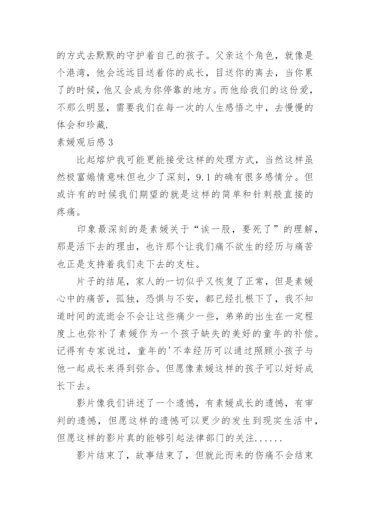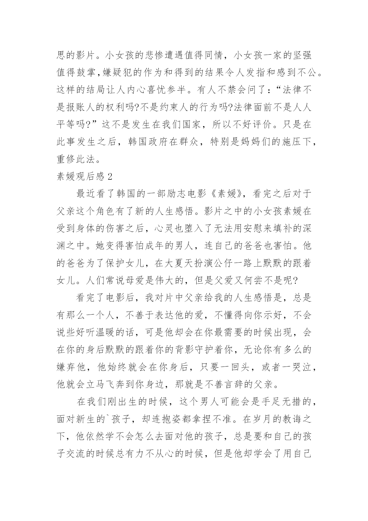 素媛观后感素媛观后感品味完一部作品后,相信大家有很多值得分享的东西吧,透过观影,我们可以发现一些深刻的感悟。是不是无从下笔、没有头绪?以下是小编为大家整理的素媛观后感,欢迎大家分享。素媛观后感1韩国影片《素媛》讲述的是一名叫素媛的小女孩如往常一样上学。那天早上下着很大的雨,素媛一人撑着伞走在路上,突然一个醉醺醺的大叔出现在她面前让她为他打伞。而后发生的一切让小女孩遭受到了此生不愿回忆的伤害。此事给素媛幼小的心里和肉体造成了难以磨灭的重创。同时,素媛的家庭也不得不承受来自社会各方的压力与冷漠。然而,人间仍有爱,素媛爸爸的.上司及其全家在经济和生活上大力帮助其一家,心理治疗师和女警察也伸出双手,全力帮助这家人走出阴霾。另一边,嫌疑人被抓后拒不认罪,自称是酒后行为,已经不记得事情发生的前后,让素媛一家失望、愤恨、无奈。因为当时的韩国,其中法律规定酒后行为可减轻罪行判定,最终嫌疑人本判十年刑期。但是生活还在继续,素媛一家只能将心中的悲痛压在深处,将希望寄托在明天。这是一部由真实事件改编的影片,也是一部值得深思的影片。小女孩的悲惨遭遇值得同情,小女孩一家的坚强值得鼓掌,嫌疑犯的作为和得到的结果令人发指和感到不公。这样的结局让人内心喜忧参半。有人不禁会问了:“法律不是报账人的权利吗?不是约束人的行为吗?法律面前不是人人平等吗?”这不是发生在我们国家,所以不好评价。只是在此事发生之后,韩国政府在群众,特别是妈妈们的施压下,重修此法。素媛观后感2最近看了韩国的一部励志电影《素媛》,看完之后对于父亲这个角色有了新的人生感悟。影片之中的小女孩素媛在受到身体的伤害之后,心灵也堕入了无法用安慰来填补的深渊之中。她变得害怕成年的男人,连自己的爸爸也害怕。他的爸爸为了保护女儿,在大夏天扮演公仔一路上默默的跟着女儿。人们常说母爱是伟大的,但是父爱又何尝不是呢?看完了电影后,我对片中父亲给我的人生感悟是,总是有那么一个人,不善于表达他的爱,不懂得向你示好,不会说些好听温暖的话,可是他却会在你最需要的时候出现,会在你的身后默默的跟着你的背影守护着你,无论你有多么的嫌弃他,他始终就会在你身后,只要一回头,或者一哭泣,他就会立马飞奔到你身边,那就是不善言辞的父亲。在我们刚出生的时候,这个男人可能会是手足无措的,面对新生的`孩子,却连抱姿都拿捏不准。在岁月的教诲之下,他依然学不会怎么去面对他的孩子,总是要和自己的孩子交流的时候总有力不从心的时候,但是他却学会了用自己的方式去默默的守护着自己的孩子。父亲这个角色,就像是个港湾,他会远远目送着你的成长,目送你的离去,当你累了的时候,他又会成为你停靠的地方。而他给我们的这份爱,不那么明显,需要我们在每一次的人生感悟之中,去慢慢的体会和珍藏.素媛观后感3比起熔炉我可能更能接受这样的处理方式,当然这样虽然极富煽情意味但也少了深刻,9.1的确有很多感情分。但或许有的时候我们期望的就是这样的简单和针刺般直接的疼痛。印象最深刻的是素媛关于“诶一股,要死了”的理解,那是活下去的理由,也许那个让我们痛不欲生的经历与痛苦也正是支持着我们走下去的支柱。片子的结尾,家人的一切似乎又恢复了正常,但是素媛心中的痛苦,孤独,恐惧与不安,都已经扎根下了,我不知道时间的流逝会不会让这些痛少一些,弟弟的出生在一定程度上也弥补了素媛作为一个孩子缺失的美好的童年的补偿。记得有专家说过,童年的'不幸经历可以通过照顾小孩子与他一起成长来得到弥合。但愿像素媛这样的孩子可以好好成长下去。影片像我们讲述了一个遗憾,有素媛成长的遗憾,有审判的遗憾,但愿这样的遗憾可以更少的发生到现实生活中,但愿这样的影片真的能够引起法律部门的关注......影片结束了,故事结束了,但就此而来的伤痛不会结束最后真心希望这样的案件可以结束。