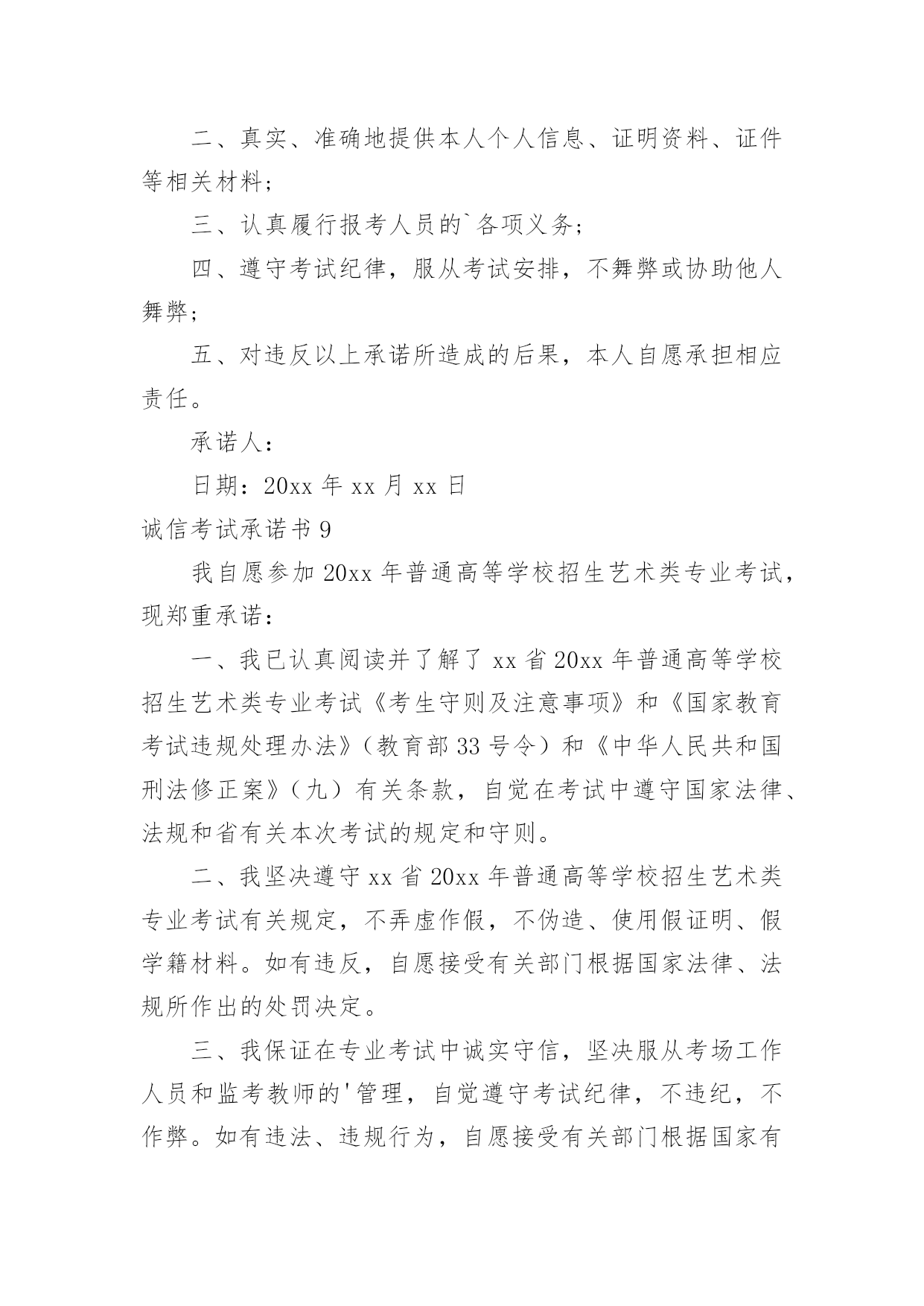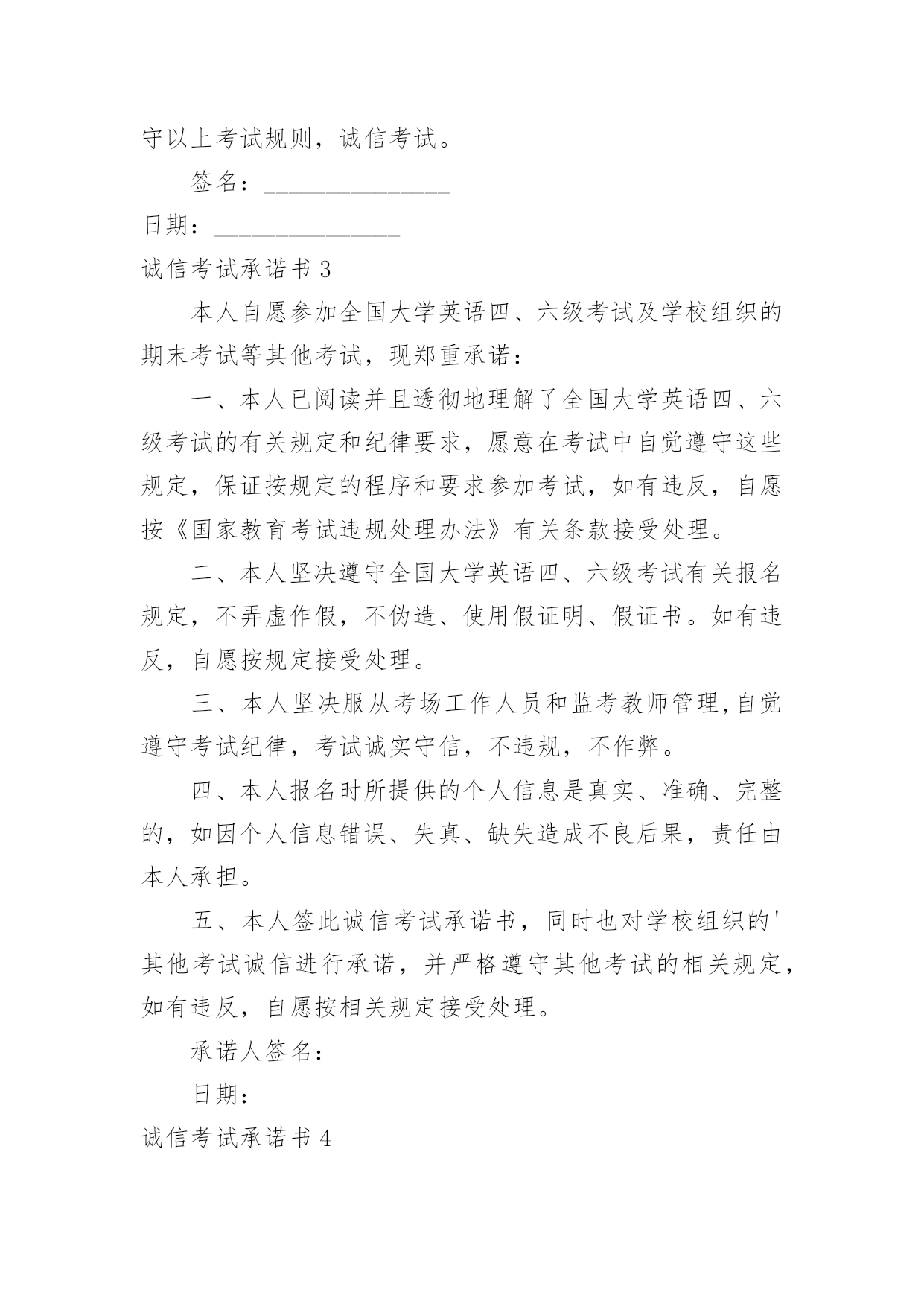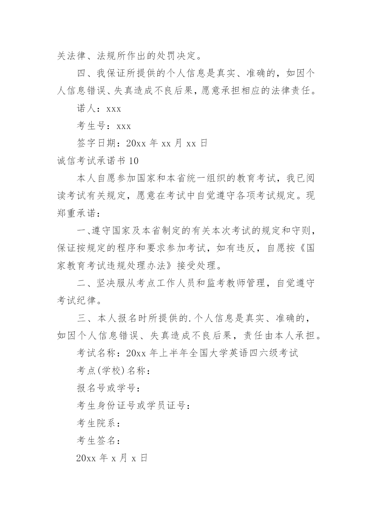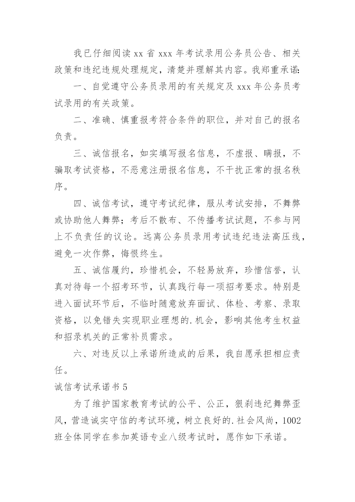 诚信考试承诺书诚信考试承诺书通用15篇在当下社会,很多地方都会使用到承诺书,承诺书是承诺人对要约完全的、单纯的同意,并以书面的形式表示。来参考自己需要的承诺书吧!下面是小编为大家收集的诚信考试承诺书,欢迎阅读,希望大家能够喜欢。诚信考试承诺书1期末考试将至,为创造诚信、公平、公正的考试环境,我系全体同学承诺如下:一、主动自愿签订诚信考试承诺书,严格遵照承诺书上承诺去准备每一场考试,杜绝考试作弊行为,做诚实守信的学生!二、正确认识考试对评价自己的.重要性。充分利用个人时间,认真复习,满怀信心地迎接考试。三、严格按照学院《考试规则》认真复习每一门功课,精心准备每一场考试,考出自己真实水平。做到我系期末考试“零作弊、零违纪”。四、尊重每一位监考老师,严格遵守考试、考场规则,杜绝一切考试作弊行为。五、树立与不良风气作斗争的勇气和决心,敢于检举揭发考试作弊行为。六、自觉携带学生证或考试证明参加考试。承诺人:xxx20xx年xx月xx日诚信考试承诺书2考试规则:一、考生必须按时进入考场,按指定座位就座。然后把本人考试证、身份证放在桌子左上角,以便监考教师验核。考试开始后15分钟仍未进入考场或考试进行中擅自离开考场者,然后作自动放弃考试论处。(考试30分钟后,方可离开考场。)二、考生进入考场后,应保持肃静,不得随意走动。有问题时,应向监考教师举手示意。有特殊情况,要离开考场时,必须经监考教师同意。三、考生进入考场,只准携带必要的文具,不将纸张、书、书包和通信工具等物品带入考场。四、答卷必须独立完成,严禁相互讨论、抄袭等。一经发现,然后立即取消考试资格(包括提供作弊条件者),勒令其退出考场,并报告考务中心,该考生本次本门课程考试成绩以零分记录,注明“作弊”字样,不予正常补考,并视情节严重予以批评教育,直至纪律处分。五、考生所有答卷必须在规定时间内完成,不得拖延。考生交卷后应立即离开考场。不得在考场内、外停留、喧哗、影响他人考试。本人承诺:不请他人,在考试过程中严于律己,自觉遵守以上考试规则,诚信考试。签名:_______________日期:_______________诚信考试承诺书3本人自愿参加全国大学英语四、六级考试及学校组织的期末考试等其他考试,现郑重承诺:一、本人已阅读并且透彻地理解了全国大学英语四、六级考试的有关规定和纪律要求,愿意在考试中自觉遵守这些规定,保证按规定的程序和要求参加考试,如有违反,自愿按《国家教育考试违规处理办法》有关条款接受处理。二、本人坚决遵守全国大学英语四、六级考试有关报名规定,不弄虚作假,不伪造、使用假证明、假证书。如有违反,自愿按规定接受处理。三、本人坚决服从考场工作人员和监考教师管理,自觉遵守考试纪律,考试诚实守信,不违规,不作弊。四、本人报名时所提供的个人信息是真实、准确、完整的,如因个人信息错误、失真、缺失造成不良后果,责任由本人承担。五、本人签此诚信考试承诺书,同时也对学校组织的'其他考试诚信进行承诺,并严格遵守其他考试的相关规定,如有违反,自愿按相关规定接受处理。承诺人签名:日期:诚信考试承诺书4我已仔细阅读xx省xxx年考试录用公务员公告、相关政策和违纪违规处理规定,清楚并理解其内容。我郑重承诺:一、自觉遵守公务员录用的有关规定及xxx年公务员考试录用的有关政策。二、准确、慎重报考符合条件的职位,并对自己的报名负责。三、诚信报名,如实填写报名信息,不虚报、瞒报,不骗取考试资格,不恶意注册报名信息,不干扰正常的报名秩序。四、诚信考试,遵守考试纪律,服从考试安排,不舞弊或协助他人舞弊;考后不散布、不传播考试试题,不参与网上不负责任的议论。远离公务员录用考试违纪违法高压线,避免一次作弊,悔恨终生。五、诚信履约,珍惜机会,不轻易放弃,珍惜信誉,认真对待每一个招考环节,认真践行每一项招考要求。特别是进入面试环节后,不临时随意放弃面试、体检、考察、录取资格,以免错失实现职业理想的.机会,影响其他考生权益和招录机关的正常补员需求。六、对违反以上承诺所造成的后果,我自愿承担相应责任。诚信考试承诺书5为了维护国家教育考试的公平、公正,狠刹违纪舞弊歪风,营造诚实守信的考试环境,树立良好的.社会风尚,1002班全体同学在参加英语专业八级考试时,愿作如下承诺。一、报考时,所提供的个人信息是真实、准确的。考前本人将积极备考,认真阅读《学生考试纪律》、《考场规则》并自觉遵守。考试时保证不请他人代替。二、进入考场时,保证不携带任何书刊、报纸和通讯工具(如手机、寻呼机等),或有存储、编程、查询功能的电子用品。只携带必需的文具,如钢笔、圆珠笔、铅笔、橡皮等。三、考试当日,将持准考证、居民身份证、学生证提前进入考场,并对号入座。入座后自觉将准考证和居民身份证、学生证放在桌面左上角,以便监考人员核查。四、考试时除在试卷上填写