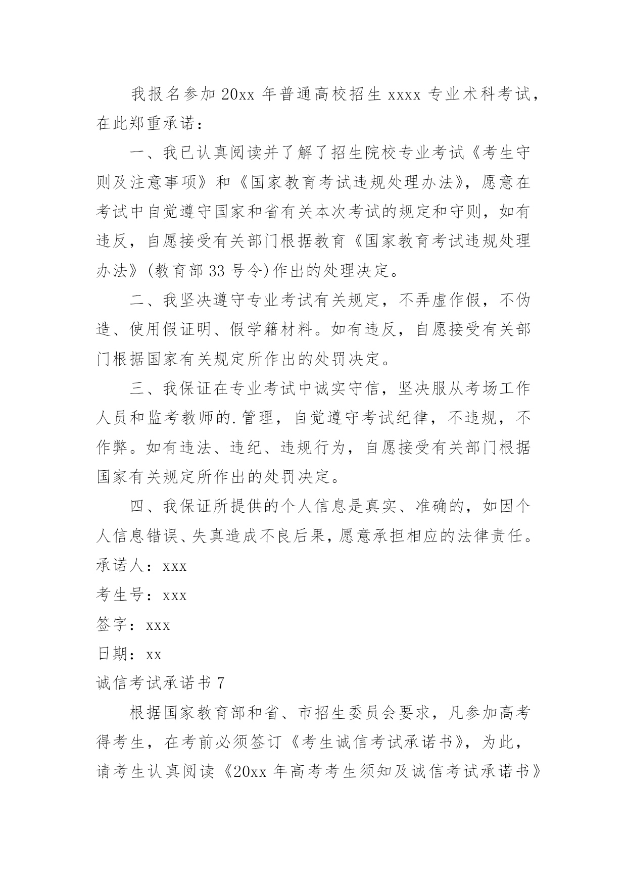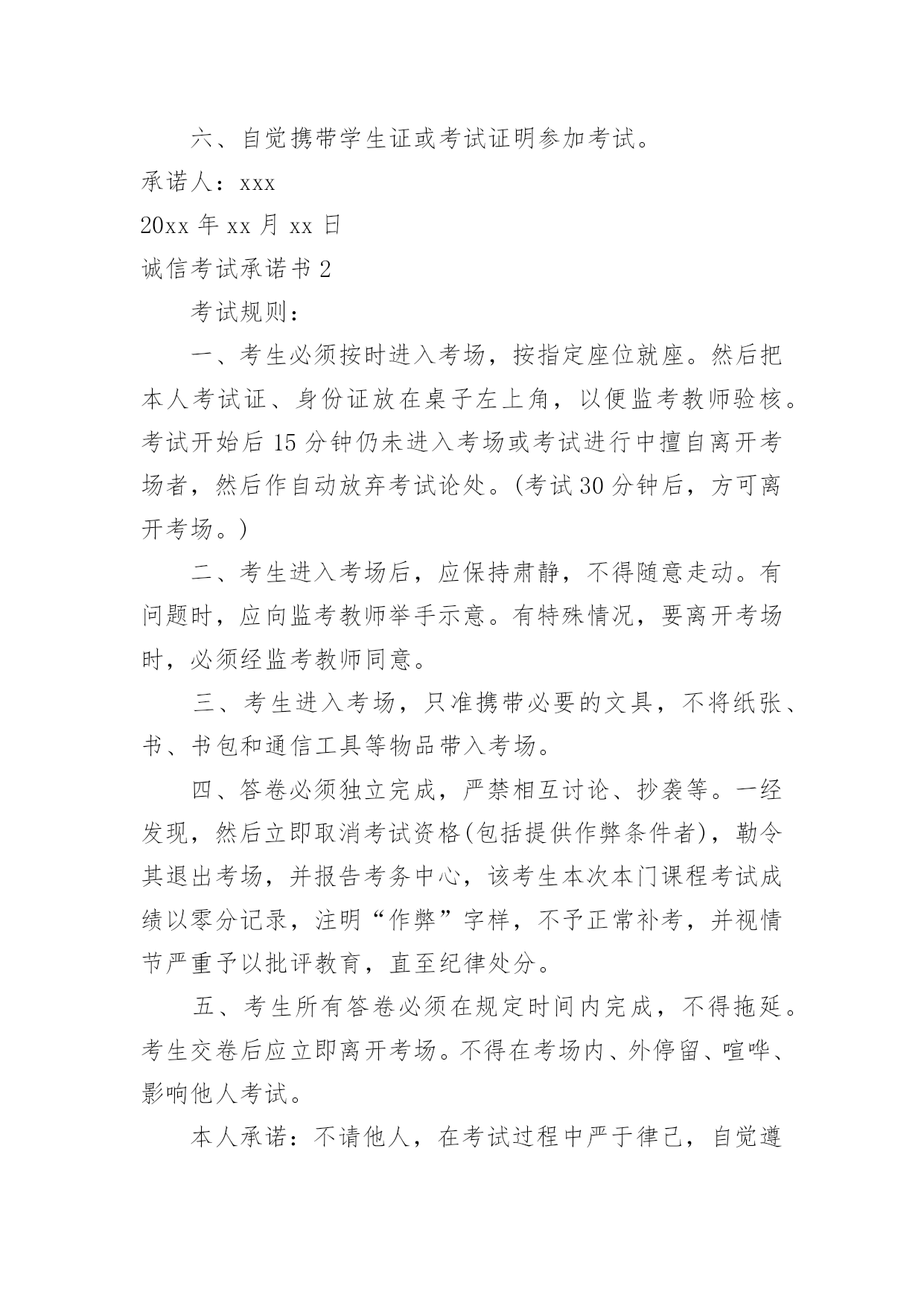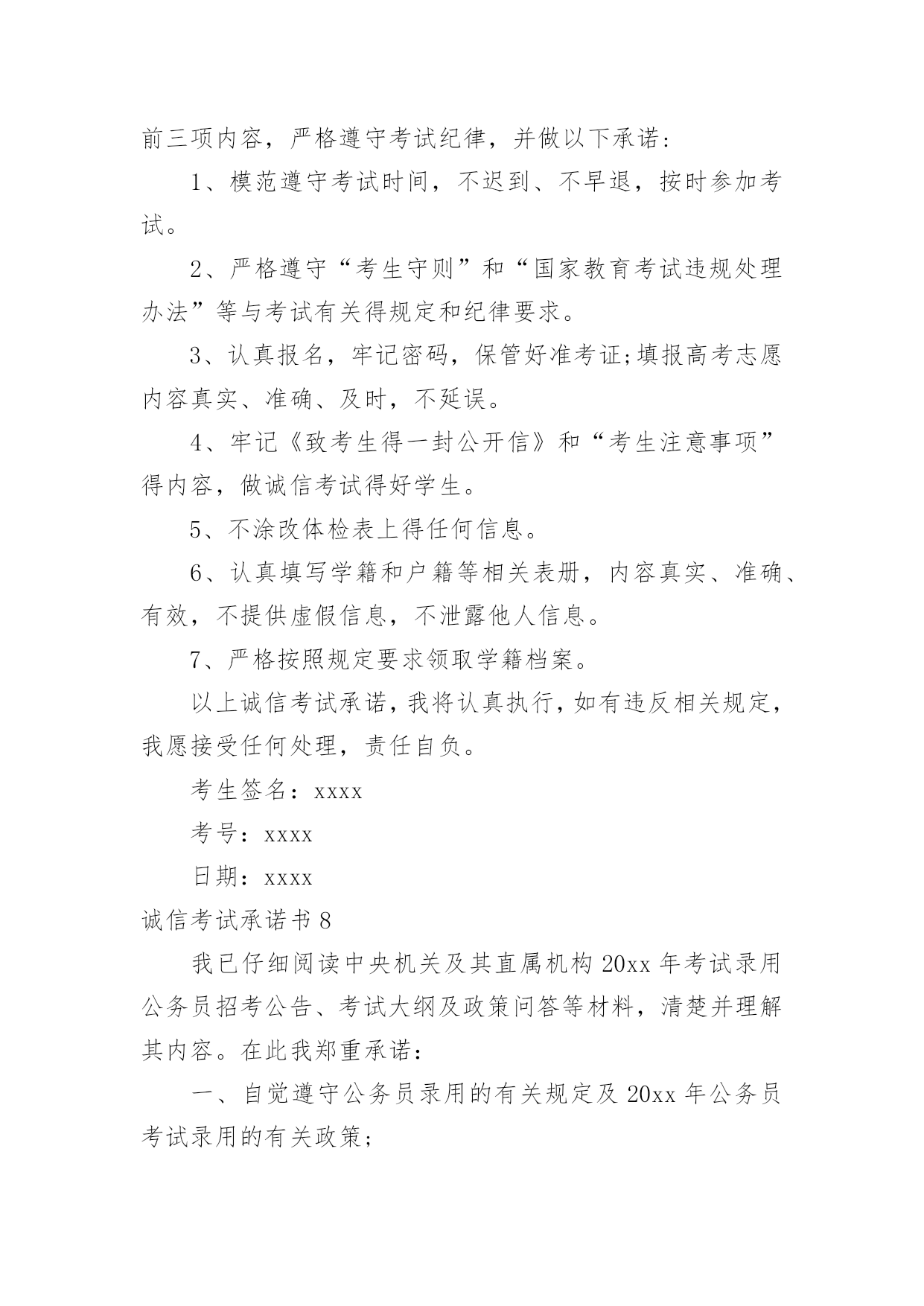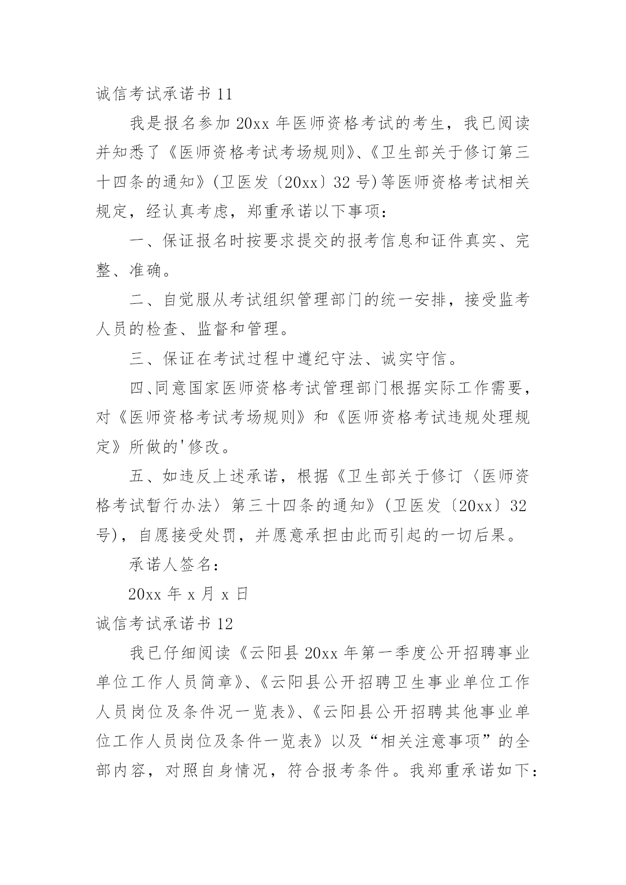 诚信考试承诺书诚信考试承诺书通用15篇在当下社会,很多地方都会使用到承诺书,承诺书是承诺人对要约完全的、单纯的同意,并以书面的形式表示。来参考自己需要的承诺书吧!下面是小编为大家收集的诚信考试承诺书,欢迎阅读,希望大家能够喜欢。诚信考试承诺书1期末考试将至,为创造诚信、公平、公正的考试环境,我系全体同学承诺如下:一、主动自愿签订诚信考试承诺书,严格遵照承诺书上承诺去准备每一场考试,杜绝考试作弊行为,做诚实守信的学生!二、正确认识考试对评价自己的.重要性。充分利用个人时间,认真复习,满怀信心地迎接考试。三、严格按照学院《考试规则》认真复习每一门功课,精心准备每一场考试,考出自己真实水平。做到我系期末考试“零作弊、零违纪”。四、尊重每一位监考老师,严格遵守考试、考场规则,杜绝一切考试作弊行为。五、树立与不良风气作斗争的勇气和决心,敢于检举揭发考试作弊行为。六、自觉携带学生证或考试证明参加考试。承诺人:xxx20xx年xx月xx日诚信考试承诺书2考试规则:一、考生必须按时进入考场,按指定座位就座。然后把本人考试证、身份证放在桌子左上角,以便监考教师验核。考试开始后15分钟仍未进入考场或考试进行中擅自离开考场者,然后作自动放弃考试论处。(考试30分钟后,方可离开考场。)二、考生进入考场后,应保持肃静,不得随意走动。有问题时,应向监考教师举手示意。有特殊情况,要离开考场时,必须经监考教师同意。三、考生进入考场,只准携带必要的文具,不将纸张、书、书包和通信工具等物品带入考场。四、答卷必须独立完成,严禁相互讨论、抄袭等。一经发现,然后立即取消考试资格(包括提供作弊条件者),勒令其退出考场,并报告考务中心,该考生本次本门课程考试成绩以零分记录,注明“作弊”字样,不予正常补考,并视情节严重予以批评教育,直至纪律处分。五、考生所有答卷必须在规定时间内完成,不得拖延。考生交卷后应立即离开考场。不得在考场内、外停留、喧哗、影响他人考试。本人承诺:不请他人,在考试过程中严于律己,自觉遵守以上考试规则,诚信考试。签名:_______________日期:_______________诚信考试承诺书3本人自愿参加全国大学英语四、六级考试及学校组织的期末考试等其他考试,现郑重承诺:一、本人已阅读并且透彻地理解了全国大学英语四、六级考试的有关规定和纪律要求,愿意在考试中自觉遵守这些规定,保证按规定的程序和要求参加考试,如有违反,自愿按《国家教育考试违规处理办法》有关条款接受处理。二、本人坚决遵守全国大学英语四、六级考试有关报名规定,不弄虚作假,不伪造、使用假证明、假证书。如有违反,自愿按规定接受处理。三、本人坚决服从考场工作人员和监考教师管理,自觉遵守考试纪律,考试诚实守信,不违规,不作弊。四、本人报名时所提供的个人信息是真实、准确、完整的,如因个人信息错误、失真、缺失造成不良后果,责任由本人承担。五、本人签此诚信考试承诺书,同时也对学校组织的'其他考试诚信进行承诺,并严格遵守其他考试的相关规定,如有违反,自愿按相关规定接受处理。承诺人签名:日期:诚信考试承诺书4我已仔细阅读xx省xxx年考试录用公务员公告、相关政策和违纪违规处理规定,清楚并理解其内容。我郑重承诺:一、自觉遵守公务员录用的有关规定及xxx年公务员考试录用的有关政策。二、准确、慎重报考符合条件的职位,并对自己的报名负责。三、诚信报名,如实填写报名信息,不虚报、瞒报,不骗取考试资格,不恶意注册报名信息,不干扰正常的报名秩序。四、诚信考试,遵守考试纪律,服从考试安排,不舞弊或协助他人舞弊;考后不散布、不传播考试试题,不参与网上不负责任的议论。远离公务员录用考试违纪违法高压线,避免一次作弊,悔恨终生。五、诚信履约,珍惜机会,不轻易放弃,珍惜信誉,认真对待每一个招考环节,认真践行每一项招考要求。特别是进入面试环节后,不临时随意放弃面试、体检、考察、录取资格,以免错失实现职业理想的.机会,影响其他考生权益和招录机关的正常补员需求。六、对违反以上承诺所造成的后果,我自愿承担相应责任。诚信考试承诺书5为了维护国家教育考试的公平、公正,狠刹违纪舞弊歪风,营造诚实守信的考试环境,树立良好的.社会风尚,1002班全体同学在参加英语专业八级考试时,愿作如下承诺。一、报考时,所提供的个人信息是真实、准确的。考前本人将积极备考,认真阅读《学生考试纪律》、《考场规则》并自觉遵守。考试时保证不请他人代替。二、进入考场时,保证不携带任何书刊、报纸和通讯工具(如手机、寻呼机等),或有存储、编程、查询功能的电子用品。只携带必需的文具,如钢笔、圆珠笔、铅笔、橡皮等。三、考试当日,将持准考证、居民身份证、学生证提前进入考场,并对号入座。入座后自觉将准考证和居民身份证、学生证放在桌面左上角,以便监考人员核查。四、考试时除在试卷上填写