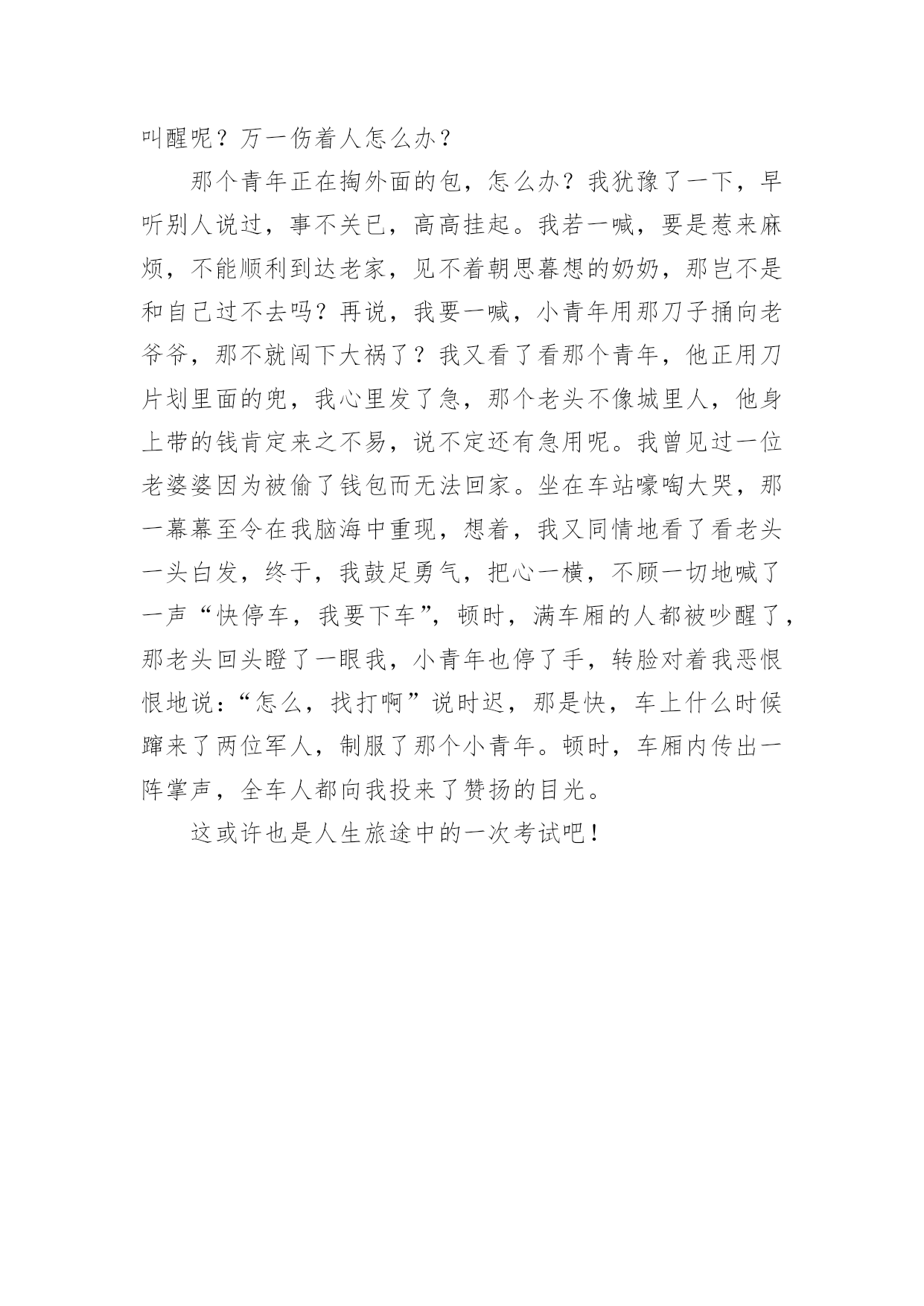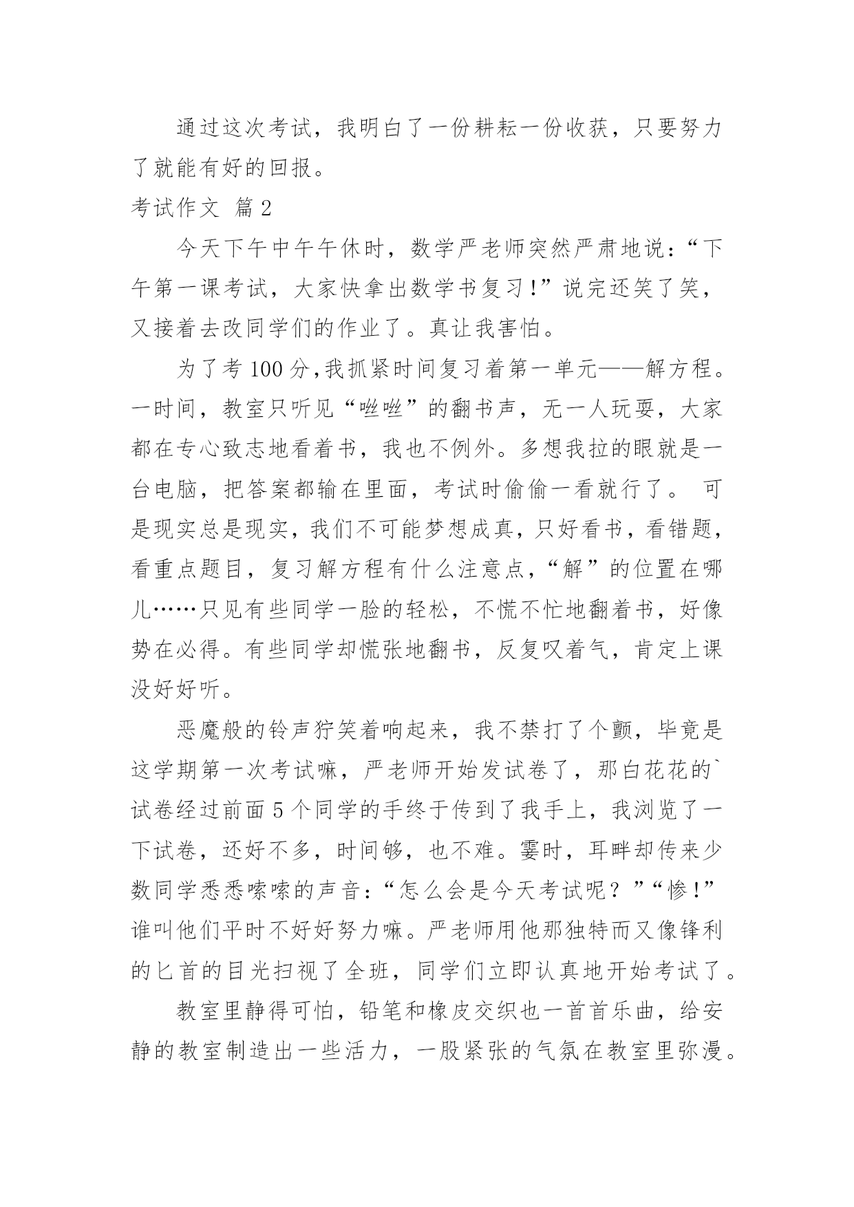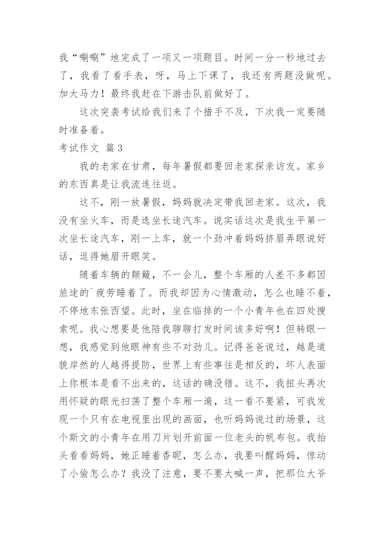 考试作文考试作文通用(3篇)在日复一日的学习、工作或生活中,大家或多或少都会接触过作文吧,作文根据写作时限的不同可以分为限时作文和非限时作文。那么一般作文是怎么写的呢?以下是小编收集整理的考试作文3篇,希望对大家有所帮助。考试作文篇1今天是一个特殊的日子,因为今天我要参加钢笔考试了!在考试之前我非常地紧张,心扑扑的跳,真希望自己能考出好成绩。过了一会儿,铃声响起,只听老师一声令下:“考试开始”,于是我赶紧拿起手中的钢笔写了起来,每写一个字,我都非常的用心,把自己平时最好的水平发挥出来。在平时我是班里写字最慢的,但我想我这次不能再落后了,我一定要在考试中拿出自己最快的速度和最好成绩,因为我对自己有信心,加油吧,顾张驰!时间一点点的.过去了,我也终于写完了最后几个字,老师起身把我的考卷收了起来,并让我们在教室里等成绩出来。到报分数的时候,我们都紧张起来,集中精神听着老师口中报出的名字:“顾张驰,94分。”太好了,我得了94分,此时我兴奋的跳了起来,激动的心情无法用语言来表达,真是太高兴了!通过这次考试,我明白了一份耕耘一份收获,只要努力了就能有好的回报。考试作文篇2今天下午中午午休时,数学严老师突然严肃地说:“下午第一课考试,大家快拿出数学书复习!”说完还笑了笑,又接着去改同学们的作业了。真让我害怕。为了考100分,我抓紧时间复习着第一单元——解方程。一时间,教室只听见“咝咝”的翻书声,无一人玩耍,大家都在专心致志地看着书,我也不例外。多想我拉的眼就是一台电脑,把答案都输在里面,考试时偷偷一看就行了。可是现实总是现实,我们不可能梦想成真,只好看书,看错题,看重点题目,复习解方程有什么注意点,“解”的位置在哪儿……只见有些同学一脸的轻松,不慌不忙地翻着书,好像势在必得。有些同学却慌张地翻书,反复叹着气,肯定上课没好好听。恶魔般的铃声狞笑着响起来,我不禁打了个颤,毕竟是这学期第一次考试嘛,严老师开始发试卷了,那白花花的`试卷经过前面5个同学的手终于传到了我手上,我浏览了一下试卷,还好不多,时间够,也不难。霎时,耳畔却传来少数同学悉悉嗦嗦的声音:“怎么会是今天考试呢?”“惨!”谁叫他们平时不好好努力嘛。严老师用他那独特而又像锋利的匕首的目光扫视了全班,同学们立即认真地开始考试了。教室里静得可怕,铅笔和橡皮交织也一首首乐曲,给安静的教室制造出一些活力,一股紧张的气氛在教室里弥漫。我“唰唰”地完成了一项又一项题目。时间一分一秒地过去了,我看了看手表,呀,马上下课了,我还有两题没做呢。加大马力!最终我赶在下游击队前做好了。这次突袭考试给我们来了个措手不及,下次我一定要随时准备着。考试作文篇3我的老家在甘肃,每年暑假都要回老家探亲访友。家乡的东西真是让我流连往返。这不,刚一放暑假,妈妈就决定带我回老家。这次,我没有坐火车,而是选坐长途汽车。说实话这次是我生平第一次坐长途汽车,刚一上车,就一个劲冲着妈妈挤眉弄眼说好话,逗得她眉开眼笑。随着车辆的颠簸,不一会儿,整个车厢的人差不多都因旅途的`疲劳睡着了。而我却因为心情激动,怎么也睡不着,不停地东张西望。此时,坐在临排的一个小青年也在四处搜索呢。我心想要是他陪我聊聊打发时间该多好啊!但转眼一想,我感觉到他眼神有些不对劲儿。记得爸爸说过,越是道貌岸然的人越得提防,世界上有些事往是相反的,坏人表面上你根本是看不出来的,这话的确没错。这不,我扭头再次用怀疑的眼光扫荡了整个车厢一遍,这一看不要紧,可我发现一个只有在电视里出现的画面,也听妈妈说过的场景,这个斯文的小青年在用刀片划开前面一位老头的帆布包。我抬头看看妈妈,她正睡着香昵,怎么办,我要叫醒妈妈,惊动了小偷怎么办?我没了注意,要不要大喊一声,把那位大爷叫醒呢?万一伤着人怎么办?那个青年正在掏外面的包,怎么办?我犹豫了一下,早听别人说过,事不关已,高高挂起。我若一喊,要是惹来麻烦,不能顺利到达老家,见不着朝思暮想的奶奶,那岂不是和自己过不去吗?再说,我要一喊,小青年用那刀子捅向老爷爷,那不就闯下大祸了?我又看了看那个青年,他正用刀片划里面的兜,我心里发了急,那个老头不像城里人,他身上带的钱肯定来之不易,说不定还有急用呢。我曾见过一位老婆婆因为被偷了钱包而无法回家。坐在车站嚎啕大哭,那一幕幕至令在我脑海中重现,想着,我又同情地看了看老头一头白发,终于,我鼓足勇气,把心一横,不顾一切地喊了一声“快停车,我要下车”,顿时,满车厢的人都被吵醒了,那老头回头瞪了一眼我,小青年也停了手,转脸对着我恶恨恨地说:“怎么,找打啊”说时迟,那是快,车上什么时候蹿来了两位军人,制服了那个小青年。顿时,车厢内传出一阵掌声,全车人都向我投来了赞扬的目光。这或许也是人生旅途中的一次考试吧!
