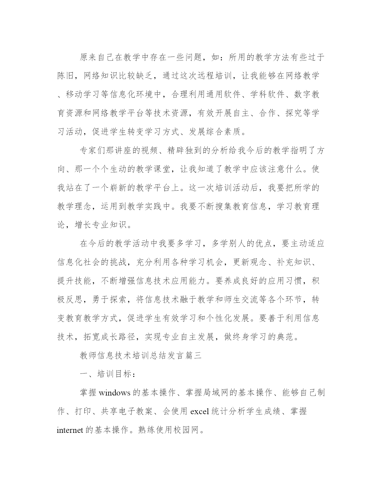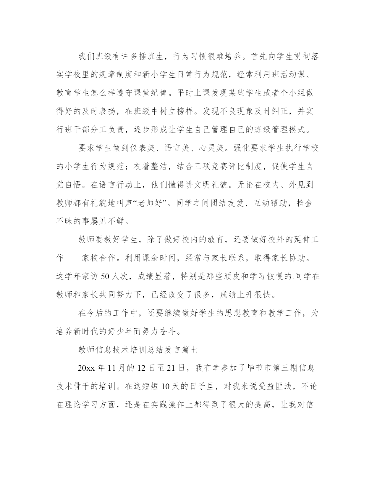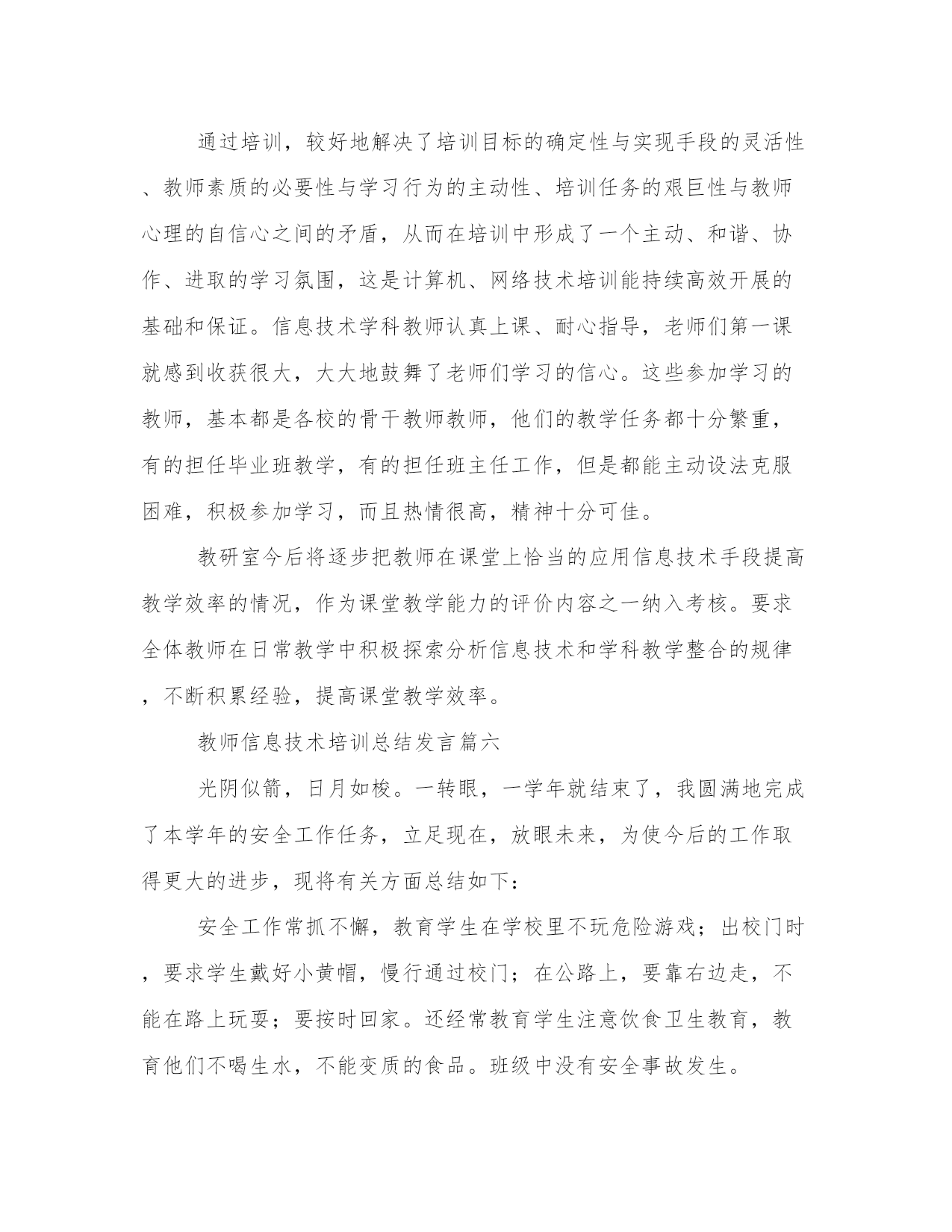 教师信息技术培训总结发言(实用10篇)总结的内容必须要完全忠于自身的客观实践,其材料必须以客观事实为依据,不允许东拼西凑,要真实、客观地分析情况、总结经验。那关于总结格式是怎样的呢?而个人总结又该怎么写呢?这里给大家分享一些最新的总结书范文,方便大家学习。教师信息技术培训总结发言篇一20__年11月的12日至21日,我有幸参加了uu市第三期信息技术骨干教师的培训。在这短短10天的日子里,对我来说受益非浅,不论在理论学习方面,还是在实践操作上都得到了很大的提高,让我对信息技术有了更新认识和学习兴趣。下面我就把这次培训,所学的点点滴滴与大家分享。1、通过本次的培训分清楚了教育技术和信息技术这两个概念。教育技术必须以信息技术为基础,但却并不同于信息技术。教育技术中的技术包括有形技术和无形技术。有形技术是教育技术的依托,无形技术是教育技术的灵魂。教育技术的有效运用,是要在先进的教育思想、理论的指导下合理地选择有形技术,将其有机的结合在一起,应用到实际教学中。而信息技术是指一切能够扩展人类有关器官功能的技术。我们在日常的教育教学中,要合理的运用现代教学技术为我们的课堂增添情趣,为我们的教育教学有一个良好的结果奠定基础。2、通过培训对信息技术的运用有了一个质的飞跃,一改过去的“多媒体可有可无”的落后思想,我们积极采用信息技术与各学科的整合并初显成效,可以说终于尝到了信息化教学的甜头。相信这些对课堂教学质量的提高提供了很好的保证。但是,信息化教学发展到目前为止已经有好几年了,在信息技术辅助教学方面的技巧和方法还需要我们在以后的教学工作中不断学习,不断积累,不断发展。那样才可以说是真正发挥到了教育信息化的优点。从而使信息技术更好地辅助我们的教学,提高我们的教学质量。3、教师具备良好的信息素养是终生学习、不断完善自身的需要。信息素养是终生学习者具有的特征。在信息社会,一名高素质的教师应具有现代化的教育思想、教学观念,掌握现代化的教学方法和教学手段,熟练运用信息工具(网络、电脑)对信息资源进行有效的收集、组织、运用;这些素质的养成就要求教师不断地学习,才能满足现代化教学的需要;信息素养成了终生学习的必备素质之一,如果教师没有良好的信息素养,就不能成为一名满足现代教学需要的高素质的教师。4、教师具备良好的信息素养是教育系统本身的需要。在迅猛发展的信息社会,信息日益成为社会各领域中最活跃、最具有决定意义的因素。在教育系统中,教育信息则成为最活跃的因素,成为连接教育系统各要素的一条主线;而教育系统的一项主要职能就是由教育者把教育信息传递给受教育者。因为从信息论的角度看,教学过程是一个教育者(主要是教师)对教育信息的整理、加工和传播的过程。教师是这一过程中主要的信源和传输者,在教育信息的准备和传递等方面起着举足轻重的作用。因此,教育系统本身要求教师具备一定的信息素养。培训时间虽然短暂,但使我们受益匪浅,其感触非一一能言尽。在以后的工作岗位上,我们一定扎实工作,努力学习,把用所学到的教育技术知识更好地应用教研教改中,做一名对学生负责,对学校负责,对社会负责的优秀教师。教师信息技术培训总结发言篇二在今后的教学活动中我要多学习,多学别人的优点,要主动适应信息化社会的挑战,充分利用各种学习机会,更新观念、补充知识、提升技能,以下是本站小编整理的教师远程信息技术培训总结,欢迎参考,更多详细内容请点击本站查看。作为一名工作了多年的老教师,自己在在这次远程研修学习中,能按时观摩学习了每一个专题的讲座,认真听取了专家们对小学科学教学的指导和解读。在这段时间的培训学习中,我通过看视频、听讲座、认真阅读了简报,学到了很多新知识,理解了信息技术对改进课堂教学的作用,具有主动运用信息技术优化课堂教学的意识。了解多媒体教学环境的类型与功能,熟练操作常用设备。探索使用支持学生自主、合作、探究学习的网络教学平台等技术资源。真是受益匪浅啊!原来自己在教学中存在一些问题,如:所用的教学方法有些过于陈旧,网络知识比较缺乏,通过这次远程培训,让我能够在网络教学、移动学习等信息化环境中,合理利用通用软件、学科软件、数字教育资源和网络教学平台等技术资源,有效开展自主、合作、探究等学习活动,促进学生转变学习方式、发展综合素质。专家们那讲座的视频、精辟独到的分析给我今后的教学指明了方向、那一个个生动的教学课堂,让我知道了教学中应该注意什么。使我站在了一个崭新的教学平台上。这一次培训活动后,我要把所学的教学理念,运用到教学实践中。我要不断搜集教育信息,学习教育理论,增长专业知识。在今后的教学活动中我要多学习,多学别人的优点,要主动适应信息化社会的挑战,充分利用各种学习机会,更新观念、补充知识、提升技能,不断增强信息技术应用能力。要养成良好的应用习惯,积极反思,勇于探索