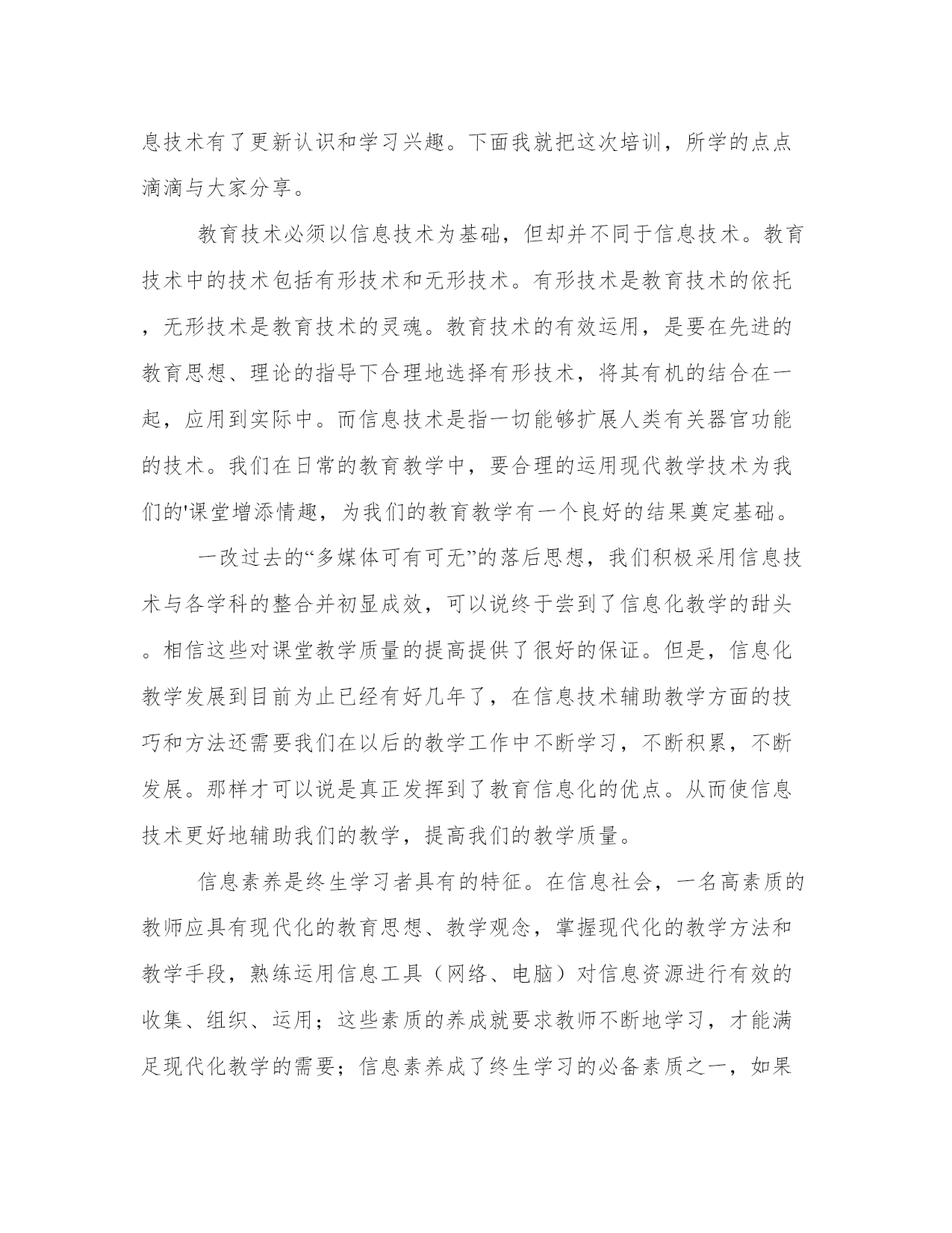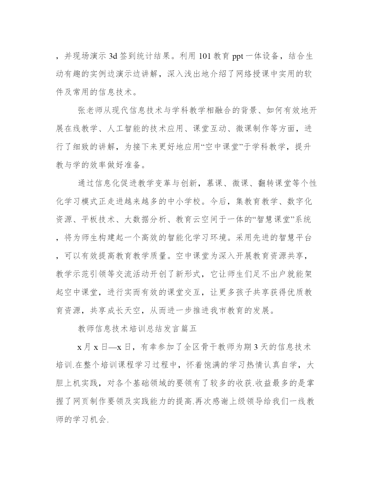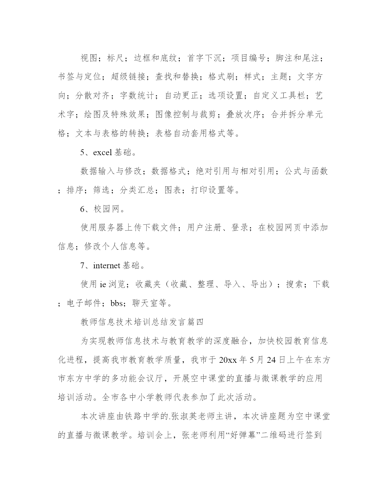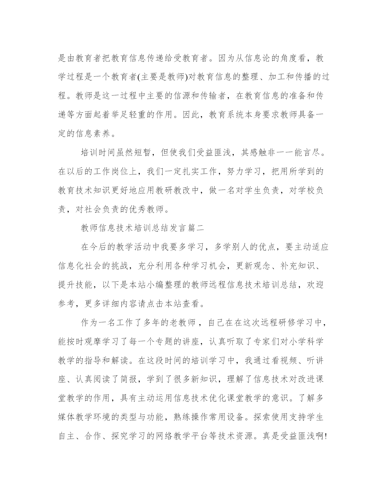 教师信息技术培训总结发言(实用10篇)总结的内容必须要完全忠于自身的客观实践,其材料必须以客观事实为依据,不允许东拼西凑,要真实、客观地分析情况、总结经验。那关于总结格式是怎样的呢?而个人总结又该怎么写呢?这里给大家分享一些最新的总结书范文,方便大家学习。教师信息技术培训总结发言篇一20__年11月的12日至21日,我有幸参加了uu市第三期信息技术骨干教师的培训。在这短短10天的日子里,对我来说受益非浅,不论在理论学习方面,还是在实践操作上都得到了很大的提高,让我对信息技术有了更新认识和学习兴趣。下面我就把这次培训,所学的点点滴滴与大家分享。1、通过本次的培训分清楚了教育技术和信息技术这两个概念。教育技术必须以信息技术为基础,但却并不同于信息技术。教育技术中的技术包括有形技术和无形技术。有形技术是教育技术的依托,无形技术是教育技术的灵魂。教育技术的有效运用,是要在先进的教育思想、理论的指导下合理地选择有形技术,将其有机的结合在一起,应用到实际教学中。而信息技术是指一切能够扩展人类有关器官功能的技术。我们在日常的教育教学中,要合理的运用现代教学技术为我们的课堂增添情趣,为我们的教育教学有一个良好的结果奠定基础。2、通过培训对信息技术的运用有了一个质的飞跃,一改过去的“多媒体可有可无”的落后思想,我们积极采用信息技术与各学科的整合并初显成效,可以说终于尝到了信息化教学的甜头。相信这些对课堂教学质量的提高提供了很好的保证。但是,信息化教学发展到目前为止已经有好几年了,在信息技术辅助教学方面的技巧和方法还需要我们在以后的教学工作中不断学习,不断积累,不断发展。那样才可以说是真正发挥到了教育信息化的优点。从而使信息技术更好地辅助我们的教学,提高我们的教学质量。3、教师具备良好的信息素养是终生学习、不断完善自身的需要。信息素养是终生学习者具有的特征。在信息社会,一名高素质的教师应具有现代化的教育思想、教学观念,掌握现代化的教学方法和教学手段,熟练运用信息工具(网络、电脑)对信息资源进行有效的收集、组织、运用;这些素质的养成就要求教师不断地学习,才能满足现代化教学的需要;信息素养成了终生学习的必备素质之一,如果教师没有良好的信息素养,就不能成为一名满足现代教学需要的高素质的教师。4、教师具备良好的信息素养是教育系统本身的需要。在迅猛发展的信息社会,信息日益成为社会各领域中最活跃、最具有决定意义的因素。在教育系统中,教育信息则成为最活跃的因素,成为连接教育系统各要素的一条主线;而教育系统的一项主要职能就是由教育者把教育信息传递给受教育者。因为从信息论的角度看,教学过程是一个教育者(主要是教师)对教育信息的整理、加工和传播的过程。教师是这一过程中主要的信源和传输者,在教育信息的准备和传递等方面起着举足轻重的作用。因此,教育系统本身要求教师具备一定的信息素养。培训时间虽然短暂,但使我们受益匪浅,其感触非一一能言尽。在以后的工作岗位上,我们一定扎实工作,努力学习,把用所学到的教育技术知识更好地应用教研教改中,做一名对学生负责,对学校负责,对社会负责的优秀教师。教师信息技术培训总结发言篇二在今后的教学活动中我要多学习,多学别人的优点,要主动适应信息化社会的挑战,充分利用各种学习机会,更新观念、补充知识、提升技能,以下是本站小编整理的教师远程信息技术培训总结,欢迎参考,更多详细内容请点击本站查看。作为一名工作了多年的老教师,自己在在这次远程研修学习中,能按时观摩学习了每一个专题的讲座,认真听取了专家们对小学科学教学的指导和解读。在这段时间的培训学习中,我通过看视频、听讲座、认真阅读了简报,学到了很多新知识,理解了信息技术对改进课堂教学的作用,具有主动运用信息技术优化课堂教学的意识。了解多媒体教学环境的类型与功能,熟练操作常用设备。探索使用支持学生自主、合作、探究学习的网络教学平台等技术资源。真是受益匪浅啊!原来自己在教学中存在一些问题,如:所用的教学方法有些过于陈旧,网络知识比较缺乏,通过这次远程培训,让我能够在网络教学、移动学习等信息化环境中,合理利用通用软件、学科软件、数字教育资源和网络教学平台等技术资源,有效开展自主、合作、探究等学习活动,促进学生转变学习方式、发展综合素质。专家们那讲座的视频、精辟独到的分析给我今后的教学指明了方向、那一个个生动的教学课堂,让我知道了教学中应该注意什么。使我站在了一个崭新的教学平台上。这一次培训活动后,我要把所学的教学理念,运用到教学实践中。我要不断搜集教育信息,学习教育理论,增长专业知识。在今后的教学活动中我要多学习,多学别人的优点,要主动适应信息化社会的挑战,充分利用各种学习机会,更新观念、补充知识、提升技能,不断增强信息技术应用能力。要养成良好的应用习惯,积极反思,勇于探索