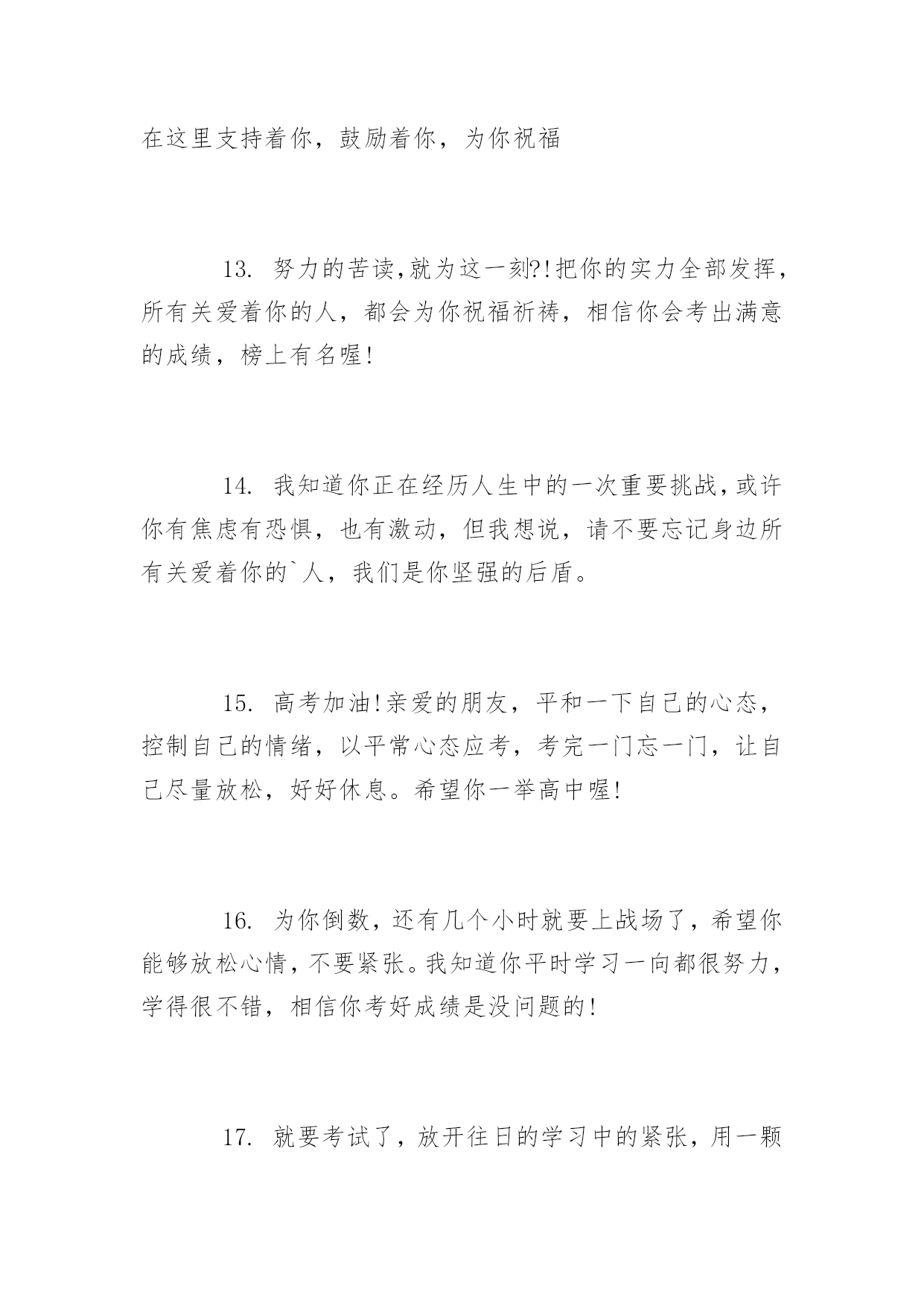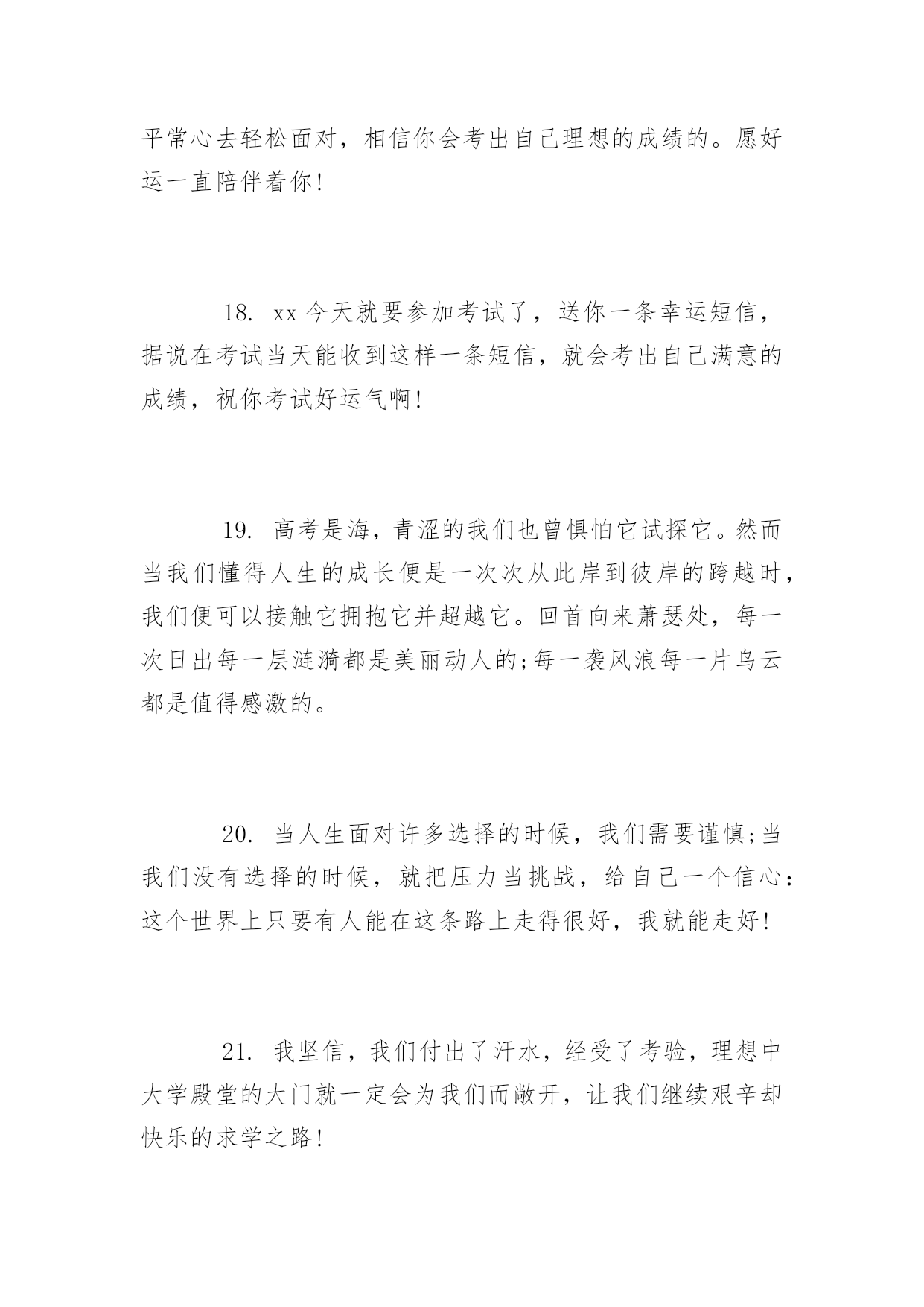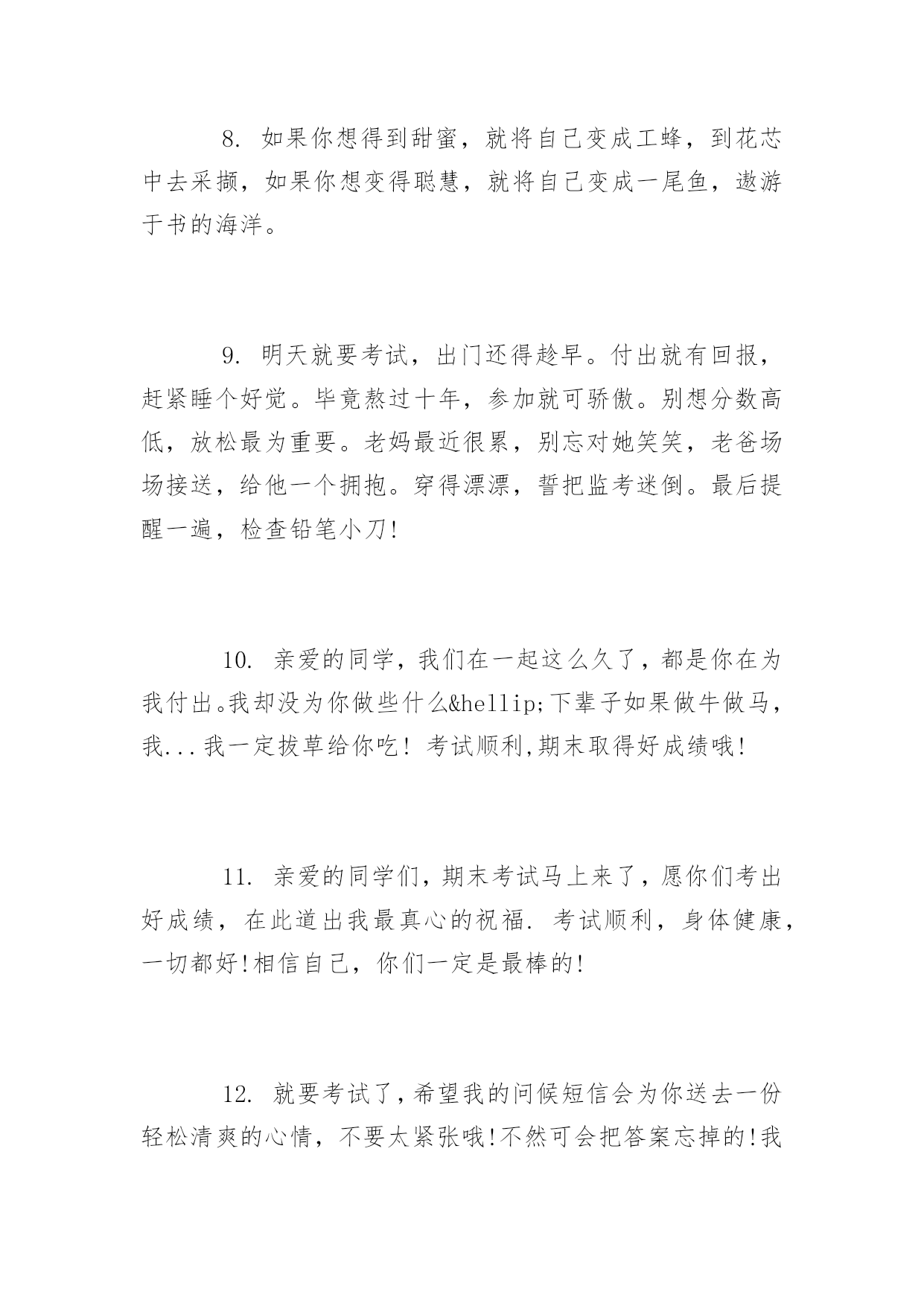 考试常用祝福语精选关于考试常用祝福语2017导语:健康身体是基础,良好学风是条件,勤奋刻苦是前提,学习方法是关键,心理素质是保证。下面是小编为大家整理的,考试祝福语,更多相关信息请关注文书帮!1.一次重要挑战,或许你有焦虑有恐惧,也有激动,但我想说,请不要忘记身边所有关爱着你的人,我们是你坚强的后盾。祝你考试顺利通过,万事如愿以偿啊。2.就要考试,希望我的问候短信,会为你送去一份,轻松清爽心情,不要太紧张哦!祝你考试过关啊。3.快到考试的日子了,希望你干自愿事,吃顺口饭,听轻松话,睡安心觉。使自己保持良好平静的心态,不要太紧张,相信你的梦想会实现的!4.当离别拉开窗帘,当回忆睡在胸前,要说再见真的很伤感,只有爱依旧灿烂!友谊万岁!考试顺利,共闯人生这一关!5.第一行歪斜的脚印,已被岁月的风尘抹平;而生活的道路呀,还在你的脚下延伸。我祝愿你:大步迈上新的征程,并留下一串串闪光的脚印!6.努力了,就无怨无悔!有道是:天道筹勤!相信自己吧!你是最棒的!我会永远支持你的!祝你期末大考取得好成绩!7.期末考即将来临,或许你有些焦急紧张,或许有些不安担心,或许正在为一道数学题而绞尽脑汁,或许我帮不上什么忙,就祝你期末顺利吧!~用平常心对待,问心无愧,尽力就好!~加油!~8.如果你想得到甜蜜,就将自己变成工蜂,到花芯中去采撷,如果你想变得聪慧,就将自己变成一尾鱼,遨游于书的海洋。9.明天就要考试,出门还得趁早。付出就有回报,赶紧睡个好觉。毕竟熬过十年,参加就可骄傲。别想分数高低,放松最为重要。老妈最近很累,别忘对她笑笑,老爸场场接送,给他一个拥抱。穿得漂漂,誓把监考迷倒。最后提醒一遍,检查铅笔小刀!10.亲爱的同学,我们在一起这么久了,都是你在为我付出。我却没为你做些什么…下辈子如果做牛做马,我...我一定拔草给你吃!考试顺利,期末取得好成绩哦!11.亲爱的同学们,期末考试马上来了,愿你们考出好成绩,在此道出我最真心的祝福.考试顺利,身体健康,一切都好!相信自己,你们一定是最棒的!12.就要考试了,希望我的问候短信会为你送去一份轻松清爽的心情,不要太紧张哦!不然可会把答案忘掉的!我在这里支持着你,鼓励着你,为你祝福13.努力的苦读,就为这一刻?!把你的实力全部发挥,所有关爱着你的人,都会为你祝福祈祷,相信你会考出满意的成绩,榜上有名喔!14.我知道你正在经历人生中的一次重要挑战,或许你有焦虑有恐惧,也有激动,但我想说,请不要忘记身边所有关爱着你的`人,我们是你坚强的后盾。15.高考加油!亲爱的朋友,平和一下自己的心态,控制自己的情绪,以平常心态应考,考完一门忘一门,让自己尽量放松,好好休息。希望你一举高中喔!16.为你倒数,还有几个小时就要上战场了,希望你能够放松心情,不要紧张。我知道你平时学习一向都很努力,学得很不错,相信你考好成绩是没问题的!17.就要考试了,放开往日的学习中的紧张,用一颗平常心去轻松面对,相信你会考出自己理想的成绩的。愿好运一直陪伴着你!18.xx今天就要参加考试了,送你一条幸运短信,据说在考试当天能收到这样一条短信,就会考出自己满意的成绩,祝你考试好运气啊!19.高考是海,青涩的我们也曾惧怕它试探它。然而当我们懂得人生的成长便是一次次从此岸到彼岸的跨越时,我们便可以接触它拥抱它并超越它。回首向来萧瑟处,每一次日出每一层涟漪都是美丽动人的;每一袭风浪每一片乌云都是值得感激的。20.当人生面对许多选择的时候,我们需要谨慎;当我们没有选择的时候,就把压力当挑战,给自己一个信心:这个世界上只要有人能在这条路上走得很好,我就能走好!21.我坚信,我们付出了汗水,经受了考验,理想中大学殿堂的大门就一定会为我们而敞开,让我们继续艰辛却快乐的求学之路!22.高三不再有,()劝君珍惜之。一年之经历,终身之财富。23.生命之中最快乐的是拼搏,而非成功,生命之中最痛苦的是懒散,而非失败。24.圣人与常人之间往往只相差一小步,而这一小步却往往需要非凡的毅力才能赶上。25.一分耕耘,一分收获,未必;九分耕耘,会有收获,一定!26.名列前茅是银,日新月异是金。27.平日从严,高考坦然。28.考试如此多焦,无数考生尽通宵,唐宗宋祖,不得不抄。一代天骄,成吉思汗,只把白卷交。批完乎,数风流人物,全部重考!29.高考着实是一种丰收,它包蕴着太多的内涵。无论高考成绩如何,你的成长与成熟是任何人无法改变的事实,这三年的辛勤走过,你获得的太多太多。30.嗨,你还有空看短信呢?证明你没用功学习:不过既然你看到的这条短信,我还是想把我一直想说的话告诉你:考试顺利,一起努力!31.考试过后好好玩一把吧,用放纵的快乐把考试复习的那些功课统统忘掉!32.明天考试啦,以后不用点起床啦