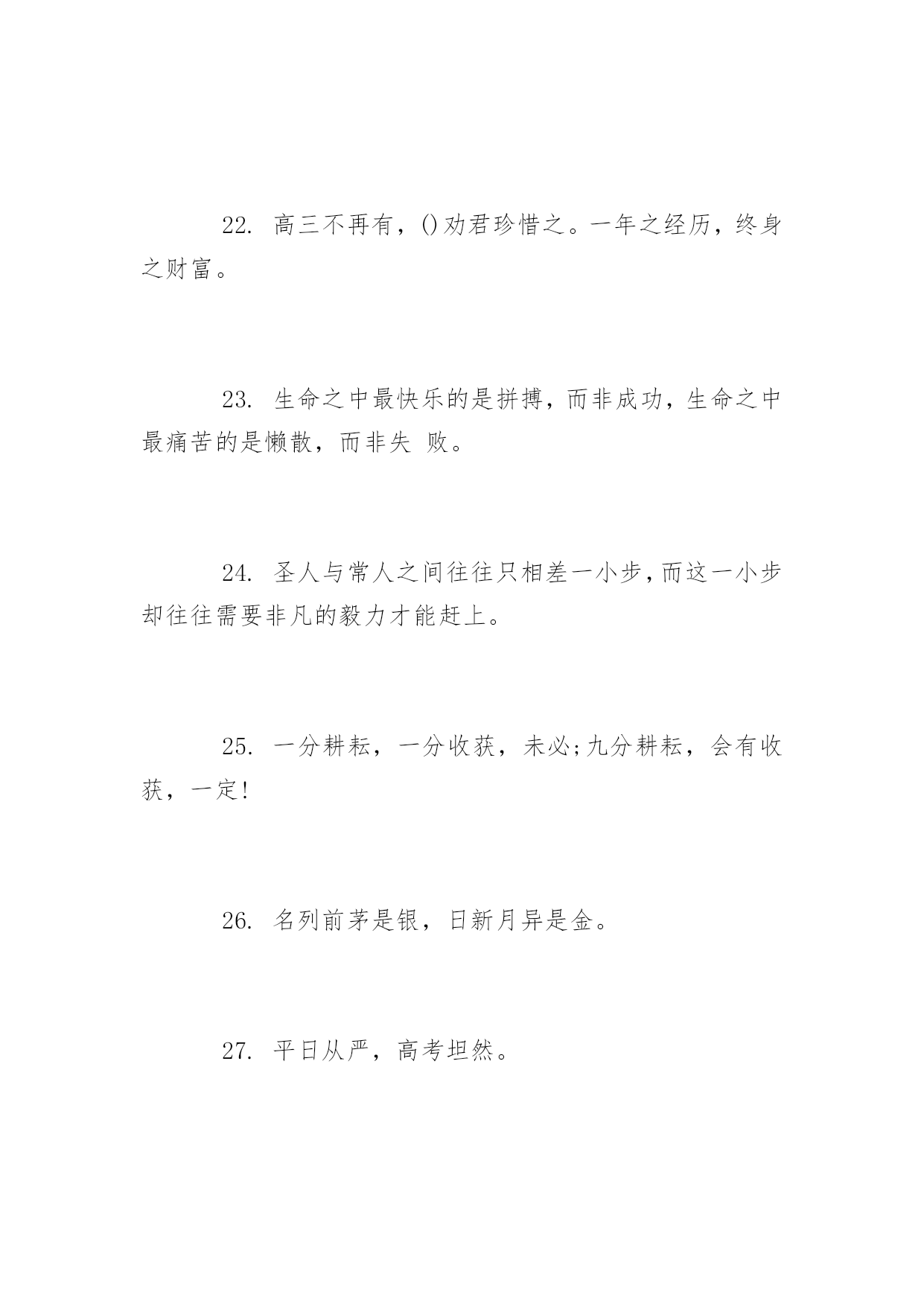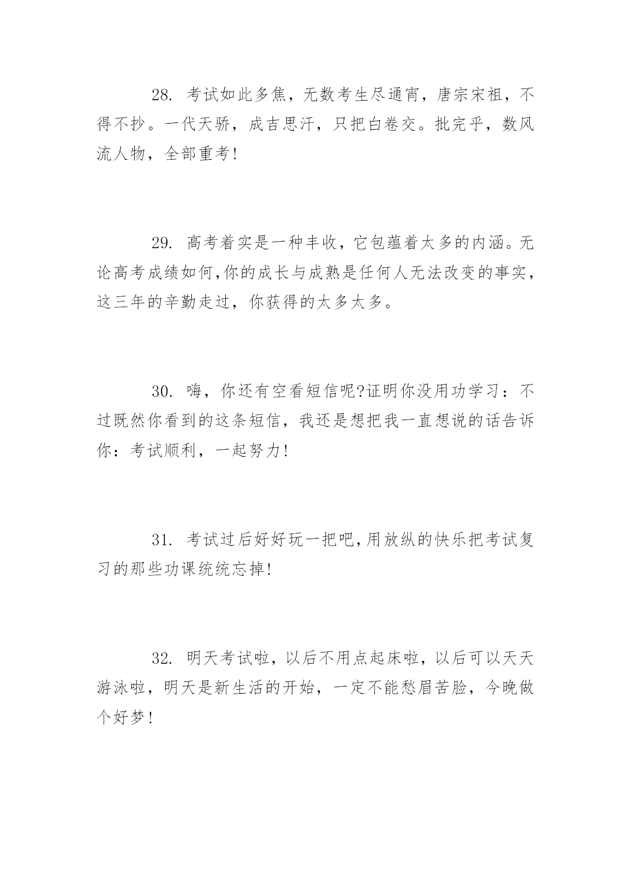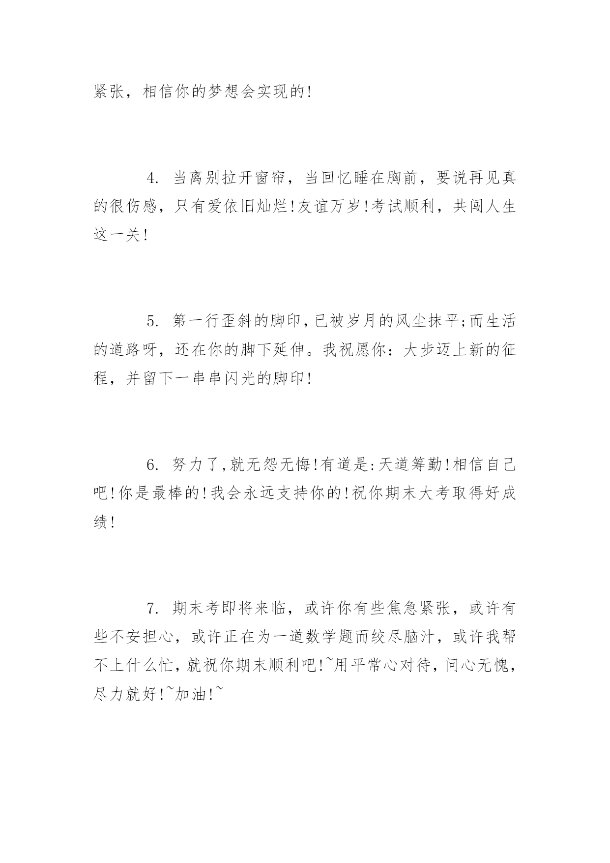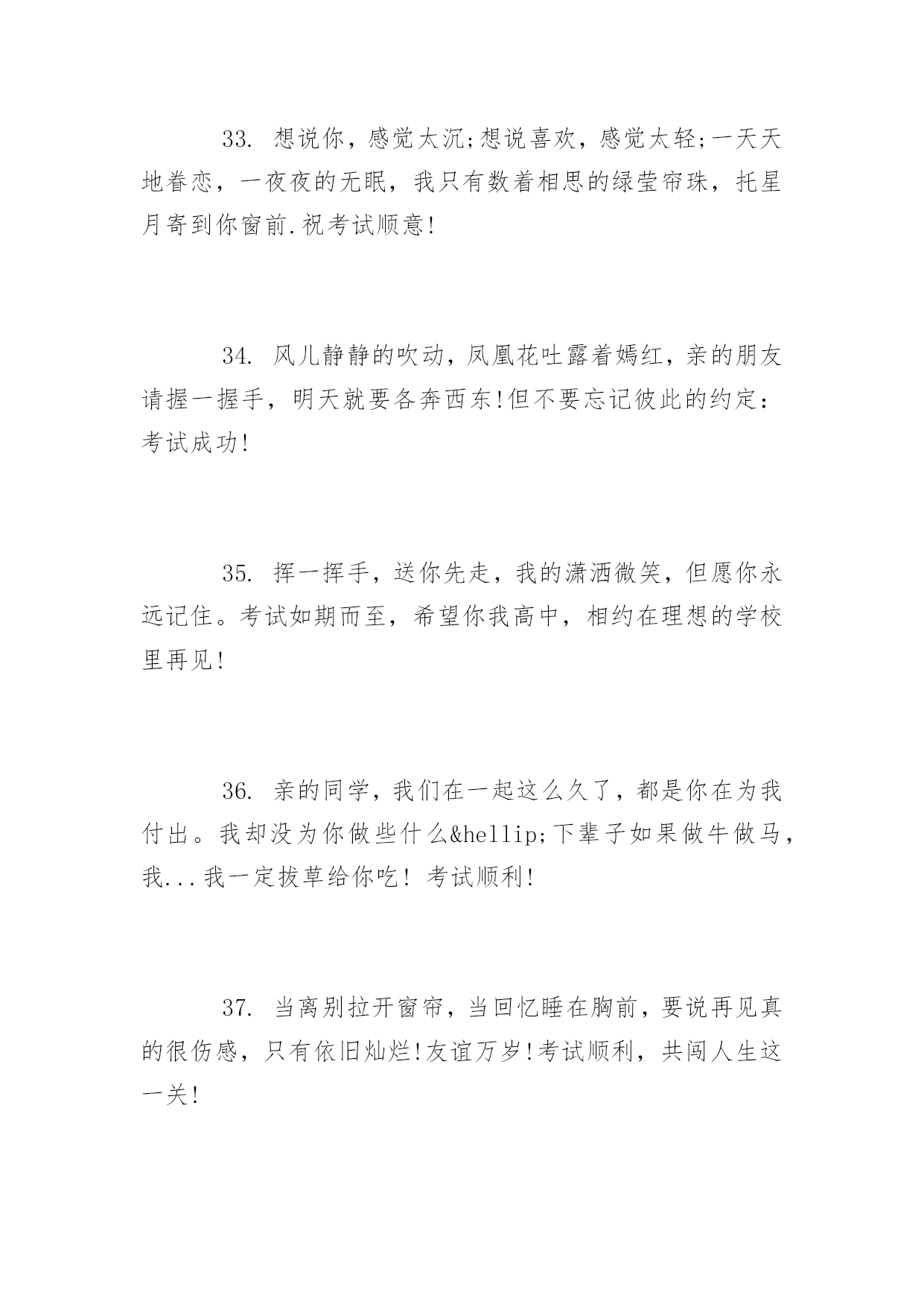考试常用祝福语精选关于考试常用祝福语2017导语:健康身体是基础,良好学风是条件,勤奋刻苦是前提,学习方法是关键,心理素质是保证。下面是小编为大家整理的,考试祝福语,更多相关信息请关注文书帮!1.一次重要挑战,或许你有焦虑有恐惧,也有激动,但我想说,请不要忘记身边所有关爱着你的人,我们是你坚强的后盾。祝你考试顺利通过,万事如愿以偿啊。2.就要考试,希望我的问候短信,会为你送去一份,轻松清爽心情,不要太紧张哦!祝你考试过关啊。3.快到考试的日子了,希望你干自愿事,吃顺口饭,听轻松话,睡安心觉。使自己保持良好平静的心态,不要太紧张,相信你的梦想会实现的!4.当离别拉开窗帘,当回忆睡在胸前,要说再见真的很伤感,只有爱依旧灿烂!友谊万岁!考试顺利,共闯人生这一关!5.第一行歪斜的脚印,已被岁月的风尘抹平;而生活的道路呀,还在你的脚下延伸。我祝愿你:大步迈上新的征程,并留下一串串闪光的脚印!6.努力了,就无怨无悔!有道是:天道筹勤!相信自己吧!你是最棒的!我会永远支持你的!祝你期末大考取得好成绩!7.期末考即将来临,或许你有些焦急紧张,或许有些不安担心,或许正在为一道数学题而绞尽脑汁,或许我帮不上什么忙,就祝你期末顺利吧!~用平常心对待,问心无愧,尽力就好!~加油!~8.如果你想得到甜蜜,就将自己变成工蜂,到花芯中去采撷,如果你想变得聪慧,就将自己变成一尾鱼,遨游于书的海洋。9.明天就要考试,出门还得趁早。付出就有回报,赶紧睡个好觉。毕竟熬过十年,参加就可骄傲。别想分数高低,放松最为重要。老妈最近很累,别忘对她笑笑,老爸场场接送,给他一个拥抱。穿得漂漂,誓把监考迷倒。最后提醒一遍,检查铅笔小刀!10.亲爱的同学,我们在一起这么久了,都是你在为我付出。我却没为你做些什么…下辈子如果做牛做马,我...我一定拔草给你吃!考试顺利,期末取得好成绩哦!11.亲爱的同学们,期末考试马上来了,愿你们考出好成绩,在此道出我最真心的祝福.考试顺利,身体健康,一切都好!相信自己,你们一定是最棒的!12.就要考试了,希望我的问候短信会为你送去一份轻松清爽的心情,不要太紧张哦!不然可会把答案忘掉的!我在这里支持着你,鼓励着你,为你祝福13.努力的苦读,就为这一刻?!把你的实力全部发挥,所有关爱着你的人,都会为你祝福祈祷,相信你会考出满意的成绩,榜上有名喔!14.我知道你正在经历人生中的一次重要挑战,或许你有焦虑有恐惧,也有激动,但我想说,请不要忘记身边所有关爱着你的`人,我们是你坚强的后盾。15.高考加油!亲爱的朋友,平和一下自己的心态,控制自己的情绪,以平常心态应考,考完一门忘一门,让自己尽量放松,好好休息。希望你一举高中喔!16.为你倒数,还有几个小时就要上战场了,希望你能够放松心情,不要紧张。我知道你平时学习一向都很努力,学得很不错,相信你考好成绩是没问题的!17.就要考试了,放开往日的学习中的紧张,用一颗平常心去轻松面对,相信你会考出自己理想的成绩的。愿好运一直陪伴着你!18.xx今天就要参加考试了,送你一条幸运短信,据说在考试当天能收到这样一条短信,就会考出自己满意的成绩,祝你考试好运气啊!19.高考是海,青涩的我们也曾惧怕它试探它。然而当我们懂得人生的成长便是一次次从此岸到彼岸的跨越时,我们便可以接触它拥抱它并超越它。回首向来萧瑟处,每一次日出每一层涟漪都是美丽动人的;每一袭风浪每一片乌云都是值得感激的。20.当人生面对许多选择的时候,我们需要谨慎;当我们没有选择的时候,就把压力当挑战,给自己一个信心:这个世界上只要有人能在这条路上走得很好,我就能走好!21.我坚信,我们付出了汗水,经受了考验,理想中大学殿堂的大门就一定会为我们而敞开,让我们继续艰辛却快乐的求学之路!22.高三不再有,()劝君珍惜之。一年之经历,终身之财富。23.生命之中最快乐的是拼搏,而非成功,生命之中最痛苦的是懒散,而非失败。24.圣人与常人之间往往只相差一小步,而这一小步却往往需要非凡的毅力才能赶上。25.一分耕耘,一分收获,未必;九分耕耘,会有收获,一定!26.名列前茅是银,日新月异是金。27.平日从严,高考坦然。28.考试如此多焦,无数考生尽通宵,唐宗宋祖,不得不抄。一代天骄,成吉思汗,只把白卷交。批完乎,数风流人物,全部重考!29.高考着实是一种丰收,它包蕴着太多的内涵。无论高考成绩如何,你的成长与成熟是任何人无法改变的事实,这三年的辛勤走过,你获得的太多太多。30.嗨,你还有空看短信呢?证明你没用功学习:不过既然你看到的这条短信,我还是想把我一直想说的话告诉你:考试顺利,一起努力!31.考试过后好好玩一把吧,用放纵的快乐把考试复习的那些功课统统忘掉!32.明天考试啦,以后不用点起床啦