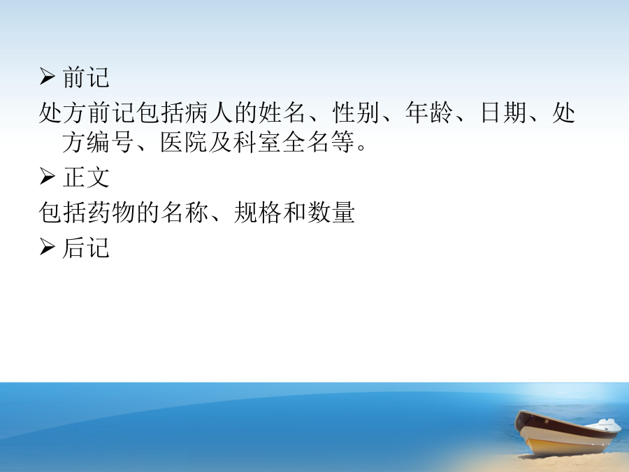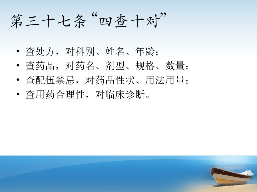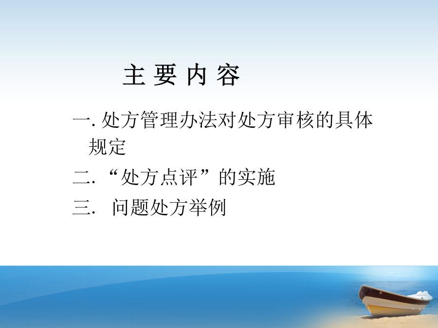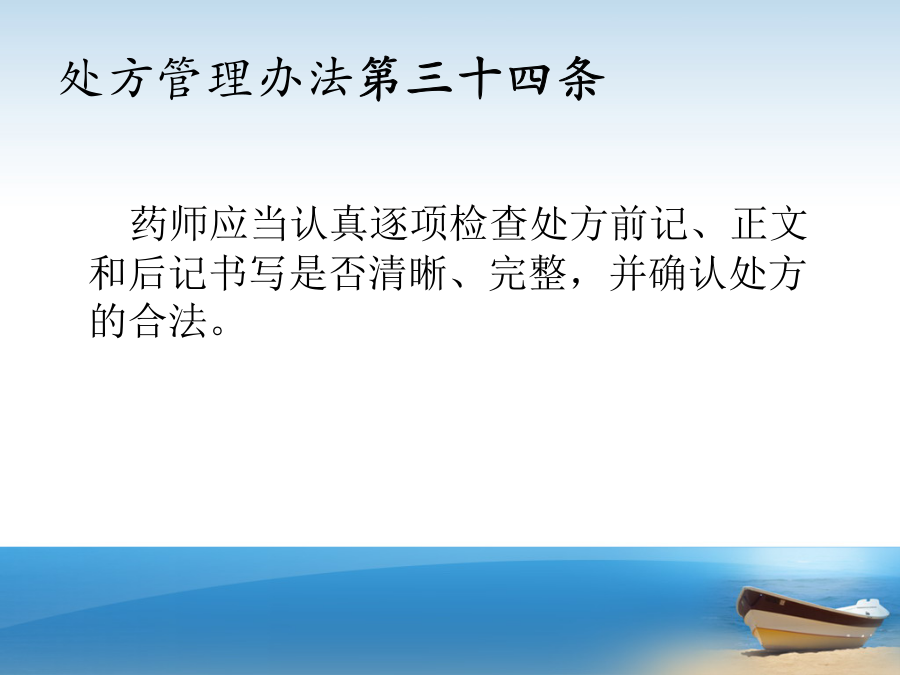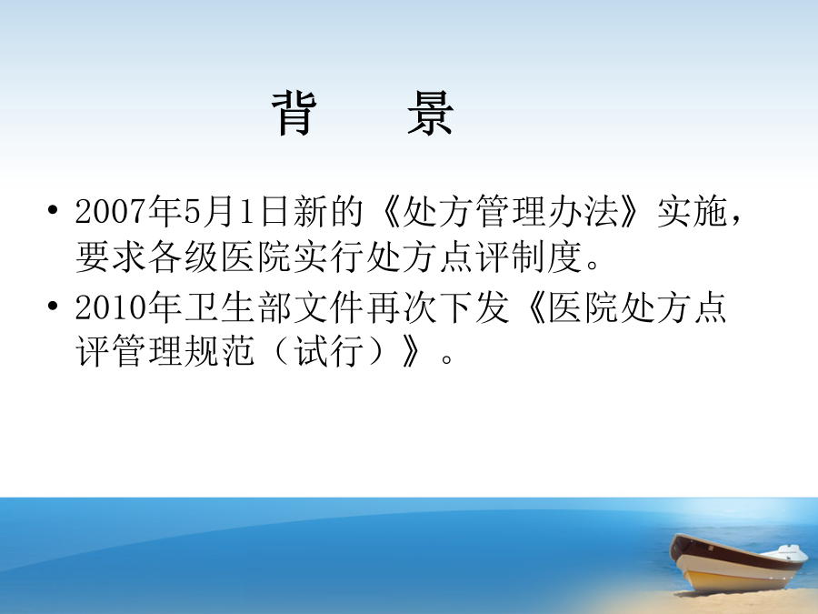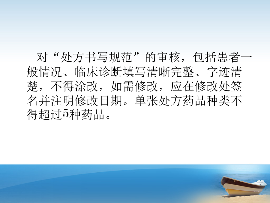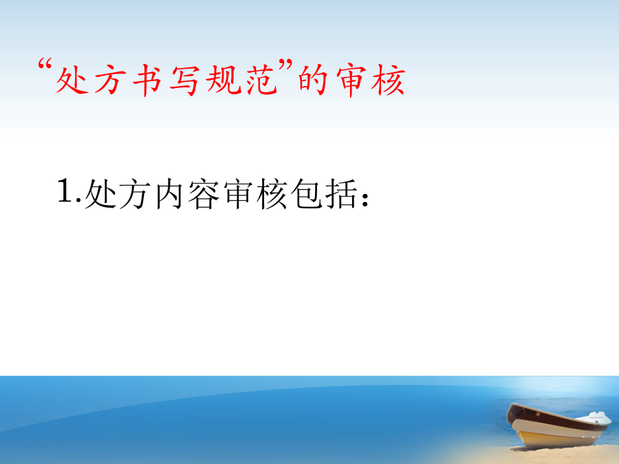冯立红天津市武清区人民医院主要内容背景处方管理办法第三十四条第三十七条“四查十对”“处方书写规范”的审核处方用量审核处方用量审核处方用量审核处方用量审核处方用量审核第二十六条对于需要特别加强管制的麻醉药品盐酸二氢埃托啡处方为一次常用量,仅限二级以上医院内使用;盐酸哌替啶处方为一次常用量,仅限医疗机构内使用。世界卫生组织推荐的癌痛治疗《医生用药指导原则》,不推荐使用的药物为度冷丁。因为:1.杜冷丁的代谢产物叫去甲哌替啶,有严重的肾毒性且半衰期长达10几个小时,长期使用肾毒性很大。2.度冷丁止痛作用欠佳,以镇痛效果评价,度冷丁的止痛作用仅为吗啡的十分之一至八分之一。3.杜冷丁有天花板效应,就是加到一定浓度止痛效果不会再增加。4.长期肌肉注射将造成局部肌肉组织纤维化,而使局部肌肉组织失去对药物的吸收功能。(五)是否有重复给药现象;(六)是否有潜在临床意义的药物相互作用和配伍禁忌;药物相互作用的概念:是指同时或在一定时间内先后应用两种或两种以上药物后,药物在机体内因彼此之间的交互作用而产生的复合效应,可表现为药效加强或副作用减轻,也可表现为药效减弱或毒副作用增强,甚至出现一些新的不良表现。配伍禁忌的概念:是指两种或多种药物在体外同一容器中配伍时发生可见或不可见的物理或化学方面的变化,如出现沉淀或变色,或产生新的成分,导致药物疗效降低、消失或产生新的毒性。药物相互作用和配伍禁忌的区别:药物相互作用的发生要借助于机体的因素,包括药物的吸收、分布、代谢和排泄相关的酶等。简单的说,如果离开了机体因素就不会出现这种相互作用。而配伍禁忌的发生不需要机体因素的参与,可借助环境因素,发生的是理化性质的改变。因此配伍禁忌的内容不属于药物相互作用的范畴。简单说就是(体内、体外)处方点评定义《处方管理办法》第四十四条:处方点评的定位处方点评组织管理处方点评工作成员处方点评的实施处方点评的内容处方点评依据处方点评的结果不规范处方不规范处方不规范处方用药不适宜处方超常处方不合理用药的干预方式行政干预方式处方点评工作流程关于“专项处方点评”专项点评内容:以国家基本药物、血液制品、中药注射剂、肠外营养制剂、抗菌药物、辅助治疗药物、激素类药物,以及围手术期用药、超说明书用药重点监控项目容易发生问题的高风险药物关注容易发生问题的特殊人群三.问题处方举例头孢地嗪用5%葡萄糖250ml做溶媒。说明书规定以40ml稀释后静点。说明书“本品平均蛋白结合率为81~88%,随浓度增高而降低”。250ml会使药物浓度降低,影响疗效。诊断手挫裂伤选用头孢地尼。外伤应主要预防G+菌,应选用一代头孢预防。男78诊断高血压选用伪麻黄碱缓释胶囊伪麻黄碱有升高血压的作用,高血压病人慎用,特别是老年高血压病人。诊断阑尾炎选用夫西地酸夫西地酸抗菌谱主要为G+菌,特别是葡萄球菌,而阑尾炎的主要致病菌多为G-菌,所以抗菌谱不合适。诊断肠炎选用克拉霉素联合替硝克拉霉素抗菌谱主要为G+菌,替硝唑抗菌谱主要为厌氧菌,而肠炎的主要致病菌多为G-菌,所以抗菌谱不合适。诊断低血压选用银杏达莫注射液银杏达莫注射液含银杏总黄酮和双嘧达莫两药均有血管扩张药作用。双嘧达莫说明书注意事项中:可引起外周血管扩张,故低血压患者应慎用。诊断滑膜炎选用头孢地尼诊断头外伤选用硫酸依替米星外伤应主要预防G+菌,应选用一、二代头孢预防。头孢呋辛3.0每次头孢呋辛说明书中明确规定:成人常用量每次0.75-1.5g(q8h),儿童一日50-100mg/kg碘造影剂+二甲双胍如检查的过程中需要注射碘造影剂,此时,患者必须暂时停服二甲双胍。因为碘造影剂会损害肾脏。如果患者肾脏一旦受到损害,服用的二甲双胍将不能及时通过肾脏排出。在这种情况下,如患者仍继续服用二甲双胍,药物在血液中就会越积越多,极有可能引起乳酸酸中毒。【建议】应在造影检查前48h至检查后48h内停用二甲双胍。在检查48h后,应检查肾功能,如结果正常,可恢复服用二甲双胍。辛伐他汀+克拉霉素胶囊克拉霉素会升高需要经过细胞色素P450系统代谢的药物的血清浓度(如阿司咪唑、华法林、麦角生物碱、三唑仑、咪达唑仑、环孢素、奥美拉唑、雷尼替丁、苯妥因、溴隐亭、阿芬他尼、海索比妥、丙吡胺、洛伐他汀、他克莫司等)。与HMG—CoA还原酶抑制药(如洛伐他汀、辛伐他汀等)合用,有横纹肌溶解的报道。感谢聆听请批评指正