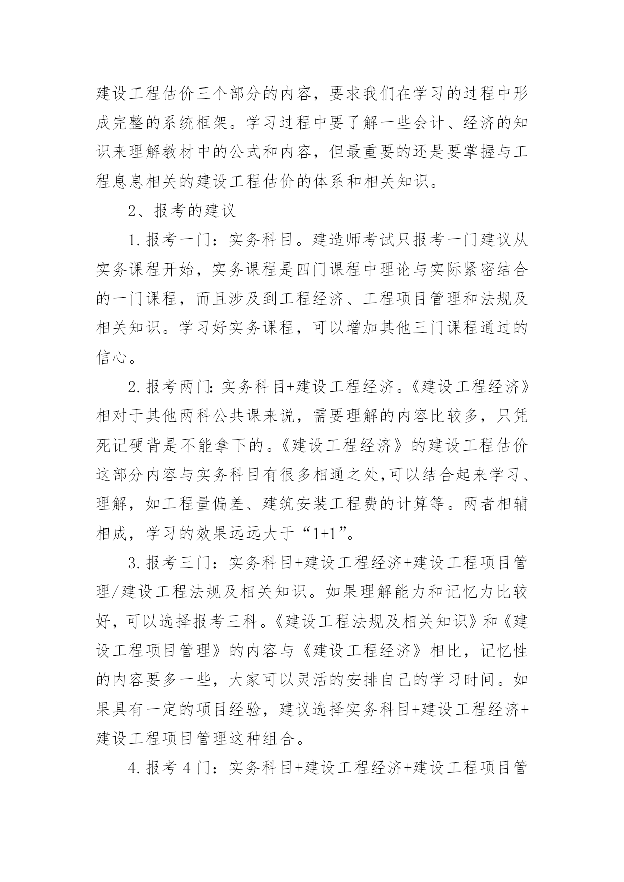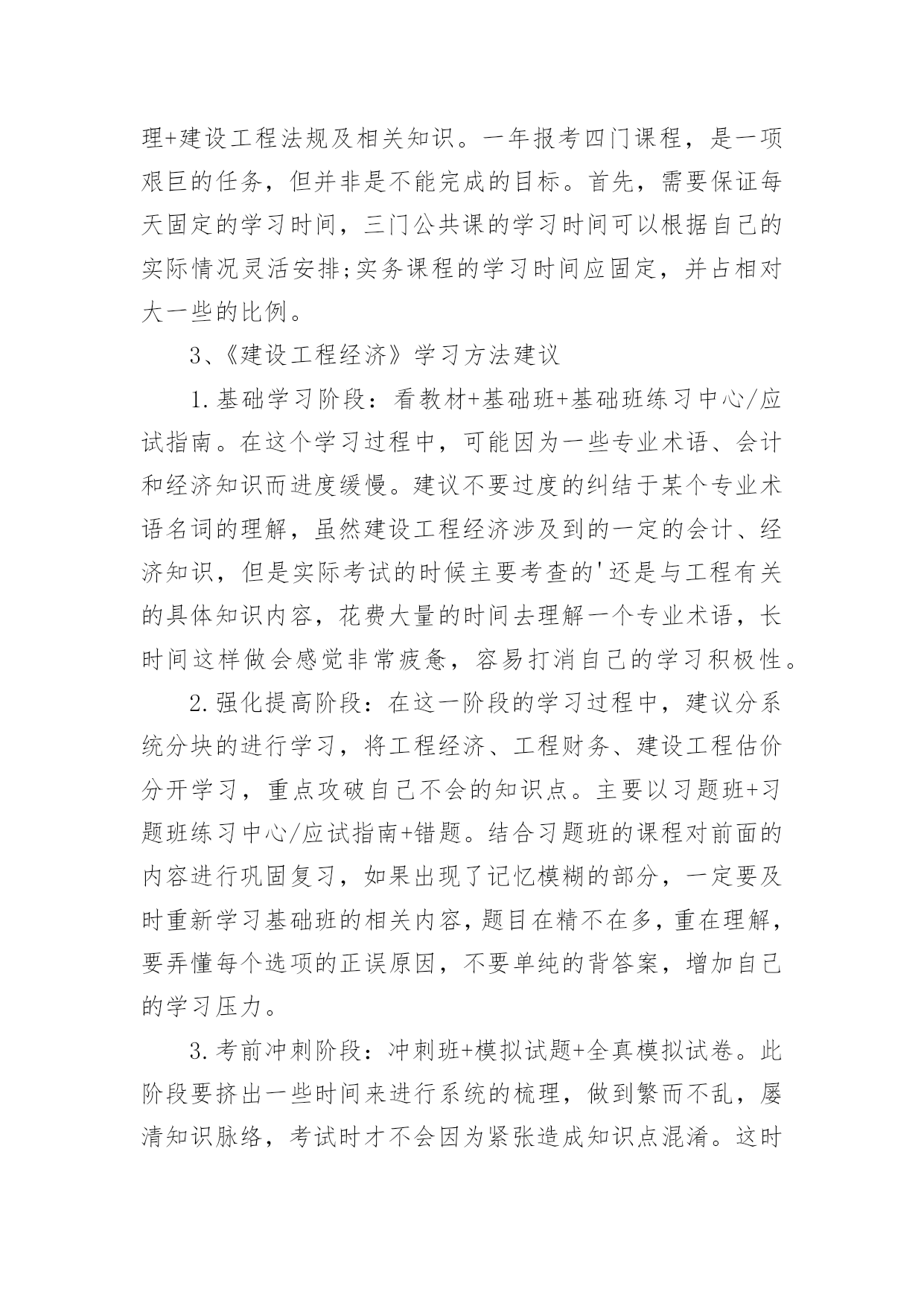 一建《建设工程经济》复习指导一级建造师的《建设工程经济》是区别于其他公共科目的一大特色,同时也是最容易得分的地方。下面是小编分享的一建《建设工程经济》复习指导,一起来看一下吧。一、分值分布:单项选择题60题,每题1分,共计60分;多项选择题20题,每题2分,共计40分;共计100分。二、考试目标:(1)工程经济,包括资金时间价值的计算及应用、技术方案的经济效果评价和不确定性分析、技术方案现金流量表的编制、设备更新分析、设备租赁与购买方案的比选分析、价值工程在工程建设中的应用、新技术、新工艺和新材料应用方案的技术经济分析。(2)工程财务,包括财务会计基础、成本与费用、收入、利润和所得税费用、企业财务报表、财务分析、筹资管理、流动资产财务管理。(3)建设工程估价,包括建设工程项目投资、建筑安装工程费用项目的组成与计算、建设工程定额、建设工程项目设计概算、建设工程项目施工图预算、工程量清单编制、工程量清单计价、计量与支付、国际工程投标报价。三、科目特点:1、《建设工程经济》科目特点《建设工程经济》这门课程涉及到工程经济、工程财务、建设工程估价三个部分的内容,要求我们在学习的过程中形成完整的系统框架。学习过程中要了解一些会计、经济的知识来理解教材中的公式和内容,但最重要的还是要掌握与工程息息相关的建设工程估价的体系和相关知识。2、报考的建议1.报考一门:实务科目。建造师考试只报考一门建议从实务课程开始,实务课程是四门课程中理论与实际紧密结合的一门课程,而且涉及到工程经济、工程项目管理和法规及相关知识。学习好实务课程,可以增加其他三门课程通过的信心。2.报考两门:实务科目+建设工程经济。《建设工程经济》相对于其他两科公共课来说,需要理解的内容比较多,只凭死记硬背是不能拿下的。《建设工程经济》的建设工程估价这部分内容与实务科目有很多相通之处,可以结合起来学习、理解,如工程量偏差、建筑安装工程费的计算等。两者相辅相成,学习的效果远远大于“1+1”。3.报考三门:实务科目+建设工程经济+建设工程项目管理/建设工程法规及相关知识。如果理解能力和记忆力比较好,可以选择报考三科。《建设工程法规及相关知识》和《建设工程项目管理》的内容与《建设工程经济》相比,记忆性的内容要多一些,大家可以灵活的安排自己的学习时间。如果具有一定的项目经验,建议选择实务科目+建设工程经济+建设工程项目管理这种组合。4.报考4门:实务科目+建设工程经济+建设工程项目管理+建设工程法规及相关知识。一年报考四门课程,是一项艰巨的任务,但并非是不能完成的目标。首先,需要保证每天固定的学习时间,三门公共课的学习时间可以根据自己的实际情况灵活安排;实务课程的学习时间应固定,并占相对大一些的比例。3、《建设工程经济》学习方法建议1.基础学习阶段:看教材+基础班+基础班练习中心/应试指南。在这个学习过程中,可能因为一些专业术语、会计和经济知识而进度缓慢。建议不要过度的纠结于某个专业术语名词的理解,虽然建设工程经济涉及到的一定的会计、经济知识,但是实际考试的时候主要考查的'还是与工程有关的具体知识内容,花费大量的时间去理解一个专业术语,长时间这样做会感觉非常疲惫,容易打消自己的学习积极性。2.强化提高阶段:在这一阶段的学习过程中,建议分系统分块的进行学习,将工程经济、工程财务、建设工程估价分开学习,重点攻破自己不会的知识点。主要以习题班+习题班练习中心/应试指南+错题。结合习题班的课程对前面的内容进行巩固复习,如果出现了记忆模糊的部分,一定要及时重新学习基础班的相关内容,题目在精不在多,重在理解,要弄懂每个选项的正误原因,不要单纯的背答案,增加自己的学习压力。3.考前冲刺阶段:冲刺班+模拟试题+全真模拟试卷。此阶段要挤出一些时间来进行系统的梳理,做到繁而不乱,屡清知识脉络,考试时才不会因为紧张造成知识点混淆。这时的错题集是个宝,重点复习错题和涉及的知识点是提高成绩的关键。
