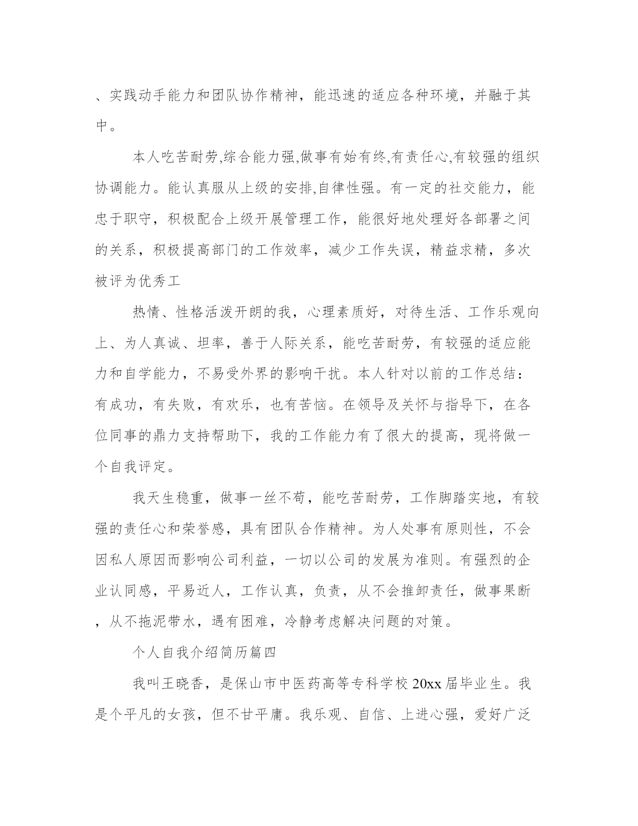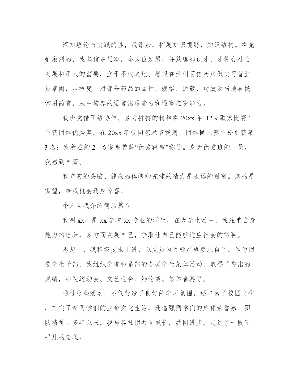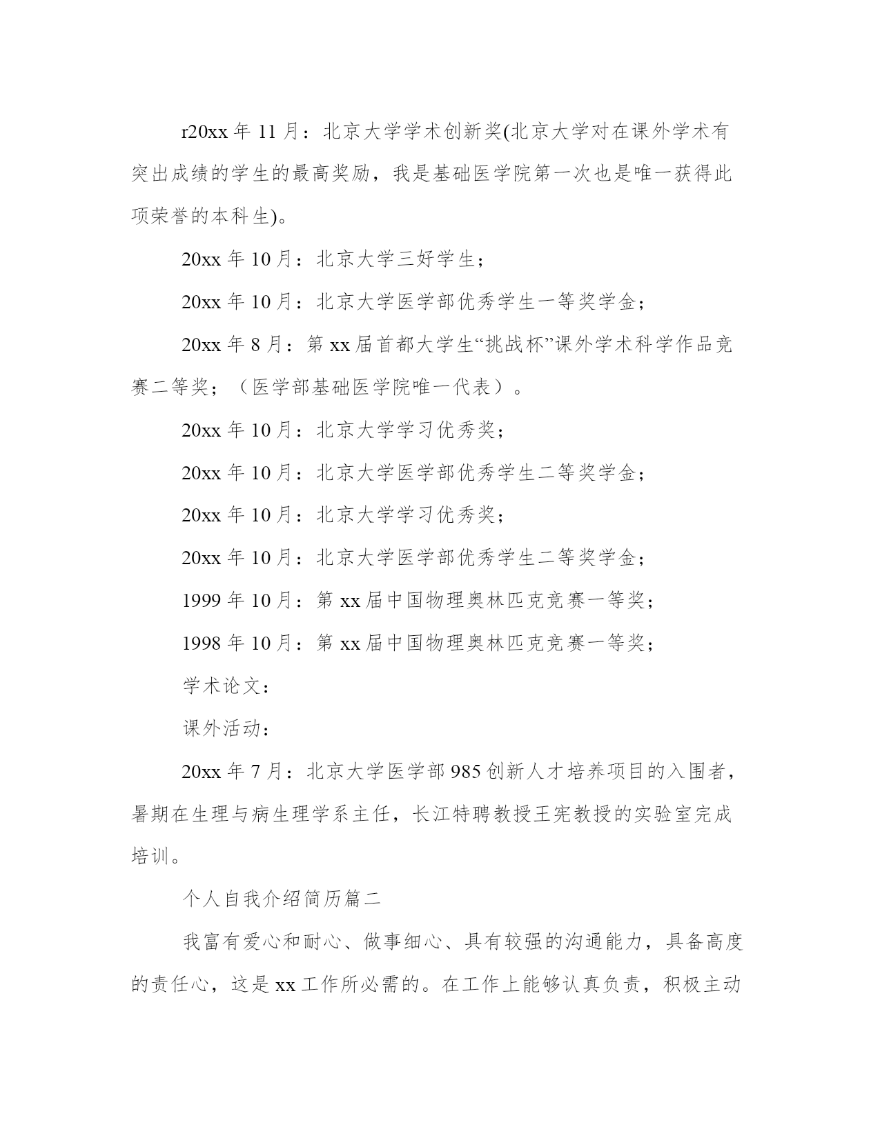 个人自我介绍简历个人简历自我介绍(优秀8篇)无论是身处学校还是步入社会,大家都尝试过写作吧,借助写作也可以提高我们的语言组织能力。范文怎么写才能发挥它最大的作用呢?下面我给大家整理了一些优秀范文,希望能够帮助到大家,我们一起来看一看吧。个人自我介绍简历篇一姓别:男。民族:汉。籍贯:湖北。出生:1982.2.1。教育背景:20xx—至今:北京大学医学部临床七年制(现大四)。1994—20xx:湖北黄石。第二中学。奖励:20xx年4月:北京大学第xx届挑战杯—五四学术科学竞赛本科生理科第四名,二等奖第一名;(挑战杯—五四学术科学竞赛是北京大学规模最大的全校性质的面向各个专业、各个年级(本、硕、博)的学术科学竞赛,我是今年医学部唯一进入前20名决赛答辩的学生)。r20xx年11月:北京大学学术创新奖(北京大学对在课外学术有突出成绩的学生的最高奖励,我是基础医学院第一次也是唯一获得此项荣誉的本科生)。20xx年10月:北京大学三好学生;20xx年10月:北京大学医学部优秀学生一等奖学金;20xx年8月:第xx届首都大学生“挑战杯”课外学术科学作品竞赛二等奖;(医学部基础医学院唯一代表)。20xx年10月:北京大学学习优秀奖;20xx年10月:北京大学医学部优秀学生二等奖学金;20xx年10月:北京大学学习优秀奖;20xx年10月:北京大学医学部优秀学生二等奖学金;1999年10月:第xx届中国物理奥林匹克竞赛一等奖;1998年10月:第xx届中国物理奥林匹克竞赛一等奖;学术论文:课外活动:20xx年7月:北京大学医学部985创新人才培养项目的入围者,暑期在生理与病生理学系主任,长江特聘教授王宪教授的实验室完成培训。个人自我介绍简历篇二我富有爱心和耐心、做事细心、具有较强的沟通能力,具备高度的责任心,这是xx工作所必需的。在工作上能够认真负责,积极主动,善于团队工作,能够服从领导的安排,能够积极主动完成各项工作,努力做到最好。在工作中能够不断的进行学习,努力提高自己的xx技能。通过在校期间的刻苦学习,掌握了扎实的xx知识和专业技能。在实习期间,在不同的工作岗位上恪尽职守,踏实、认真的完成每一项任务,抱着对自己、对顾客负责态度,工作中更加加深了对xx行业的认识,同时也锻炼了专业技能,丰富了阅历,为以后更好的工作打下了比较坚实的基础。我热爱xx这个职业,如果我有幸成为一名xx公司的.员工,我将会用我的知识和能力踏踏实实工作,为单位的发展尽职尽责,做一名合格的xx员工。个人自我介绍简历篇三本人具有良好协调沟通能力,适应力强,反应快、积极、灵活,勤勉上进,认真细致,踏实肯干,对工作认真负责,善于团队合作学习注重理论与实践的结合,己具备了相当的社会实践操作能力,有很强的事业心和责任感,能够面对任何困难和挑战。本人性格开朗,待人真诚,对工作有上进心,有很强的适应能力和团结精神,并能很好地同事相处并协同工作。在4年的工作中,以谨慎的工作作风,认真积极的工作态度,细心完成本职工作。本人工作踏实,刻苦耐劳,如有幸被录用我将会竭尽全力为贵单位创造效益,以尽情体现自身能力和价值。本人性格开朗、稳重、有活力,待人热情、真诚。工作认真负责,积极主动,能吃苦耐劳。自信心强。思想活跃。有较强的组织能力、实践动手能力和团队协作精神,能迅速的适应各种环境,并融于其中。本人吃苦耐劳,综合能力强,做事有始有终,有责任心,有较强的组织协调能力。能认真服从上级的安排,自律性强。有一定的社交能力,能忠于职守,积极配合上级开展管理工作,能很好地处理好各部署之间的关系,积极提高部门的工作效率,减少工作失误,精益求精,多次被评为优秀工热情、性格活泼开朗的我,心理素质好,对待生活、工作乐观向上、为人真诚、坦率,善于人际关系,能吃苦耐劳,有较强的适应能力和自学能力,不易受外界的影响干扰。本人针对以前的工作总结:有成功,有失败,有欢乐,也有苦恼。在领导及关怀与指导下,在各位同事的鼎力支持帮助下,我的工作能力有了很大的提高,现将做一个自我评定。我天生稳重,做事一丝不苟,能吃苦耐劳,工作脚踏实地,有较强的责任心和荣誉感,具有团队合作精神。为人处事有原则性,不会因私人原因而影响公司利益,一切以公司的发展为准则。有强烈的企业认同感,平易近人,工作认真,负责,从不会推卸责任,做事果断,从不拖泥带水,遇有困难,冷静考虑解决问题的对策。个人自我介绍简历篇四我叫王晓香,是保山市中医药高等专科学校20xx届毕业生。我是个平凡的女孩,但不甘平庸。我乐观、自信、上进心强,爱好广泛,能够很好地处理人际关系,并且有很强的责任心与使命感。现在在我面临新的选择,面对新的人生挑战,我信心十足。从学习这门专业开始,我就特别注重在认真学好专业课的同时