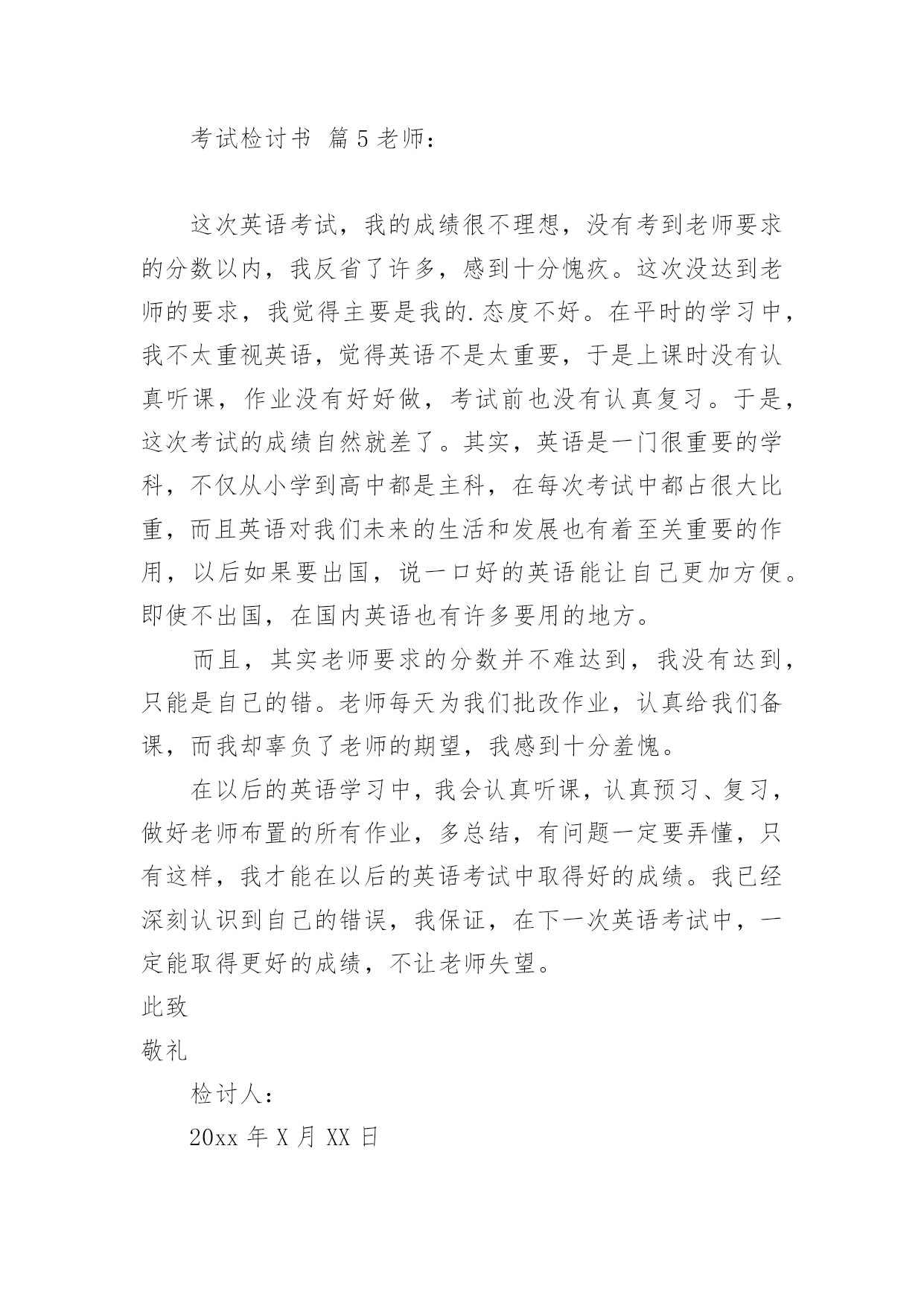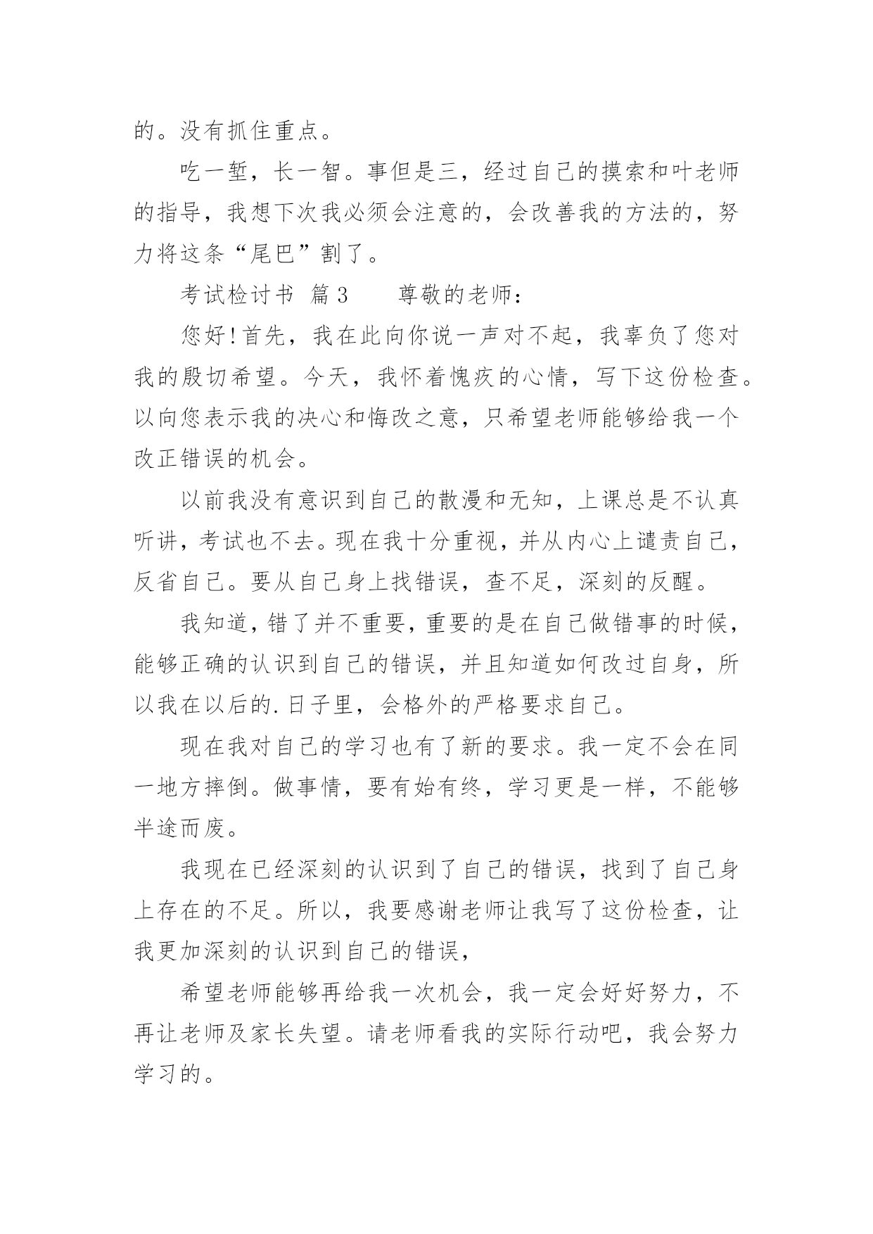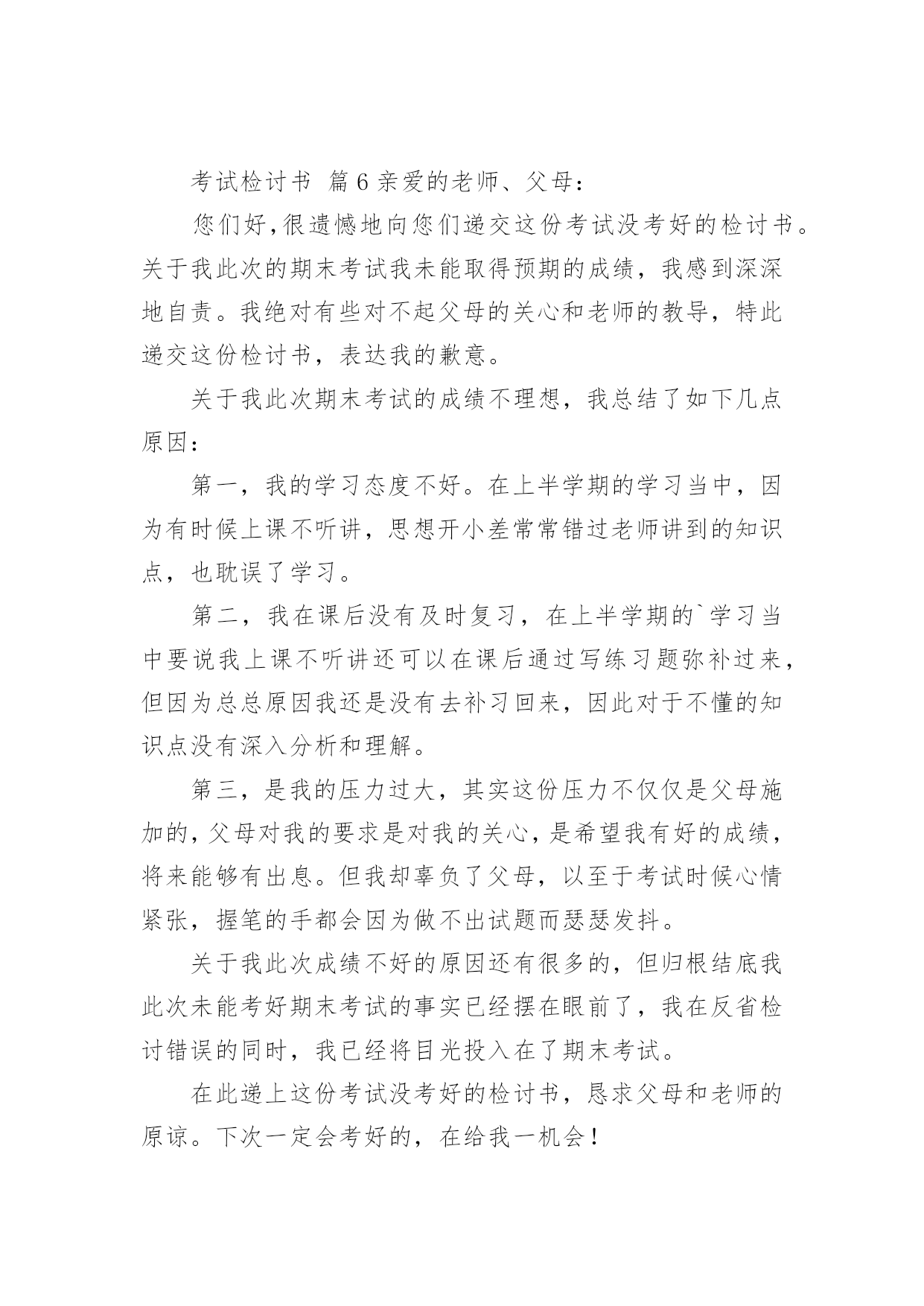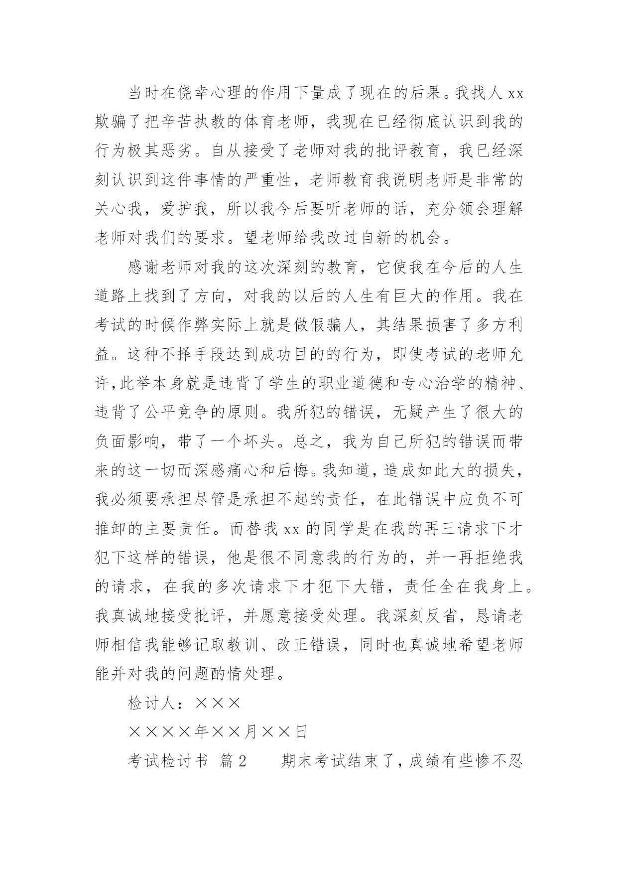 考试检讨书考试检讨书【精选】在不小心犯错后,为了避免再犯,为此要写检讨书来自我反省,写检讨书是为了能够不断提醒自己。写检讨书需要注意哪些问题呢?下面是小编整理的考试检讨书,希望能够帮助到大家。考试检讨书篇1尊敬的老师:您好!我由于在体育考试的时候找人xx,造成了作弊行为,当时体育老师对我进行了教育,本人从中认识到这件事情的严重性,意识到自己犯的错误的严重后果。错误的性质是严重的。我在考试的时候找人xx,在课堂上造成极坏的影响。这种行为,即使是没有被发现,仍然是不对的,此举本身就是违背了做考试的原则。我只是顾着自己的利益,和一时的想法,完全不理会体育老师的感受。这也是不对的,人是社会的人,大家不应该只是想着自己,我这样做,看似逃避了这次考试,实际上是在害自己。而且,考试的时候作弊本身也是对体育老师的不尊重。其次,我考试作弊的行为也是一种对老师的.工作不尊敬的表现。不单单是老师,无论对任何人,我们都应该尊重他,尊重他的劳动,他的劳动成果。我这样做,直接造成了不尊重老师,不尊重他人,不尊重他人劳动的恶劣影响。当时在侥幸心理的作用下量成了现在的后果。我找人xx欺骗了把辛苦执教的体育老师,我现在已经彻底认识到我的行为极其恶劣。自从接受了老师对我的批评教育,我已经深刻认识到这件事情的严重性,老师教育我说明老师是非常的关心我,爱护我,所以我今后要听老师的话,充分领会理解老师对我们的要求。望老师给我改过自新的机会。感谢老师对我的这次深刻的教育,它使我在今后的人生道路上找到了方向,对我的以后的人生有巨大的作用。我在考试的时候作弊实际上就是做假骗人,其结果损害了多方利益。这种不择手段达到成功目的的行为,即使考试的老师允许,此举本身就是违背了学生的职业道德和专心治学的精神、违背了公平竞争的原则。我所犯的错误,无疑产生了很大的负面影响,带了一个坏头。总之,我为自己所犯的错误而带来的这一切而深感痛心和后悔。我知道,造成如此大的损失,我必须要承担尽管是承担不起的责任,在此错误中应负不可推卸的主要责任。而替我xx的同学是在我的再三请求下才犯下这样的错误,他是很不同意我的行为的,并一再拒绝我的请求,在我的多次请求下才犯下大错,责任全在我身上。我真诚地接受批评,并愿意接受处理。我深刻反省,恳请老师相信我能够记取教训、改正错误,同时也真诚地希望老师能并对我的问题酌情处理。检讨人:×××××××年××月××日考试检讨书篇2期末考试结束了,成绩有些惨不忍睹,情绪一下降到最低点。其实刚开始时,我还有那么一些信心,因为试卷还算能够,比较细,难称不上,然后估计班级的平均分就应在80分以上吧,可谁明白结果竟然是76·6分。不及格的有2个(1个为随班跟读),及格为10人,良好为26人,优秀为2人。这样的成绩有些丢人,心中的怒火也抑制不住了,以至晚饭都吃不下(此刻有点饿了,后悔啊),躺在床上半天后,整理了下情绪,好多了,也最后想通了。谢谢叶老师,每次都会指导我一下,但是好像晚了点。叶老师的这盆冷水泼的好,“你在帮谁复习”“好学生还是学困生”“有效果吗”当时我还不以为然,理直气壮的对他说:“我已经很认真的复习了,只要听了,做了作业的,就没什么问题了,他们那些作业不做的,家长都不管,我能怎样办。”此刻想想真的很好笑,叶老师说的真的很对,我要复习的对象只是学困生,然后好学生回家后自己也会看书的,不需要你多说什么的,而学困生呢他们在家本来就缺少家长的管教,导致作业完成不是很好,压根就没复习到什么,上课的`效率也很差,所以这样的复习效果微乎其微。我将成绩翻看了一下,发现期末一向不做作业的3个成绩分别是51·5,60,61。还有5个作业也时常拖拉和完成不认真的也都在74分以下。此刻我最后明白叶老师说的“复习是要帮学困生复习。”而我一向“一视同仁”,结果却导致了这样的结果,不得不说我很失败。至少复习阶段是很失败的。没有抓住重点。吃一堑,长一智。事但是三,经过自己的摸索和叶老师的指导,我想下次我必须会注意的,会改善我的方法的,努力将这条“尾巴”割了。考试检讨书篇3尊敬的老师:您好!首先,我在此向你说一声对不起,我辜负了您对我的殷切希望。今天,我怀着愧疚的心情,写下这份检查。以向您表示我的决心和悔改之意,只希望老师能够给我一个改正错误的机会。以前我没有意识到自己的散漫和无知,上课总是不认真听讲,考试也不去。现在我十分重视,并从内心上谴责自己,反省自己。要从自己身上找错误,查不足,深刻的反醒。我知道,错了并不重要,重要的是在自己做错事的时候,能够正确的认识到自己的错误,并且知道如何改过自身,所以我在以后的.日子里,会格外的严格要求自己。现在我对自己的学习也有了新的要求。我一定不会在同一地方摔倒。做事情,要有始有终,学习更是一样,不能够半途而废。我现在已经深刻的认识到了自己的错误,找到了自己身上