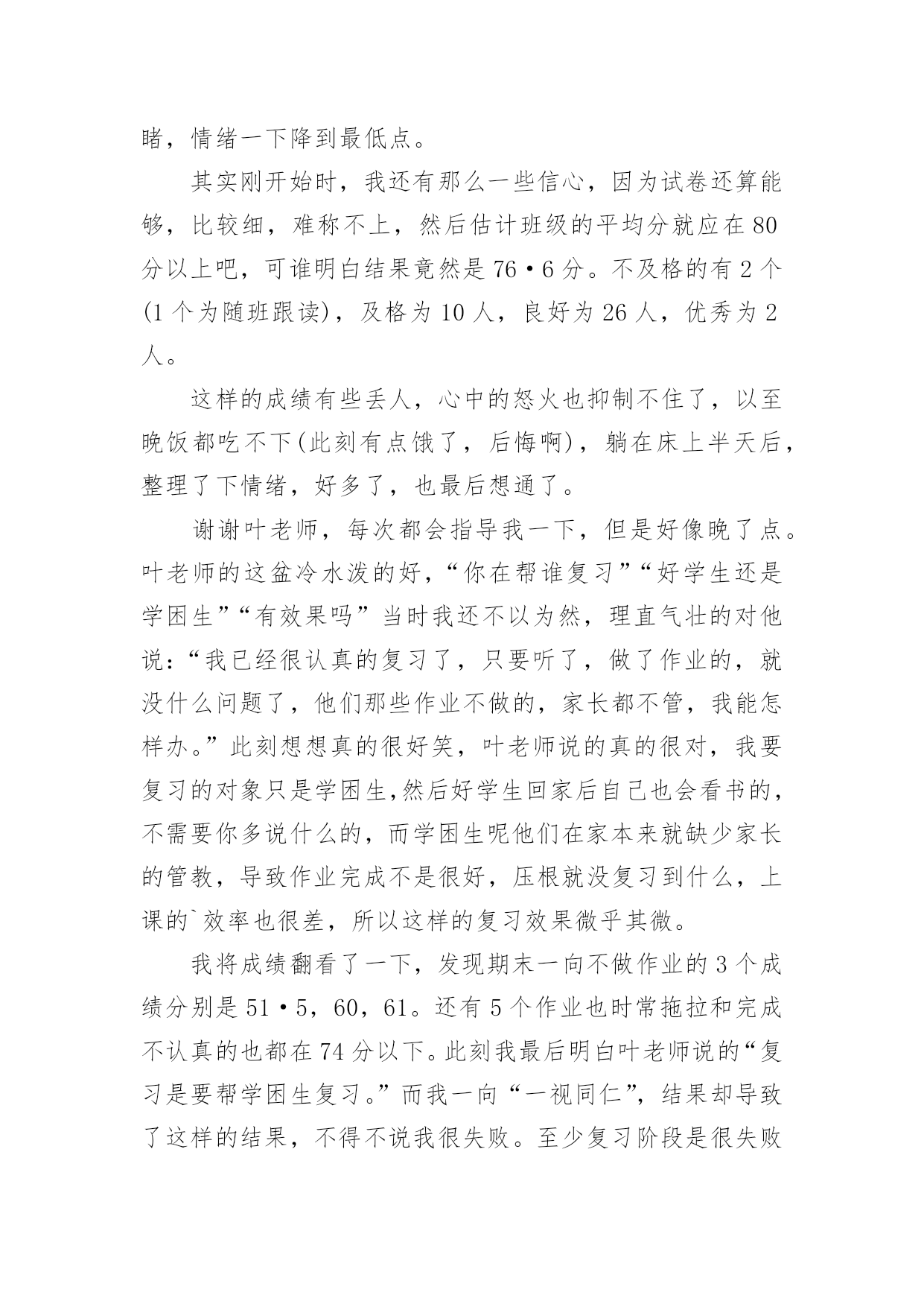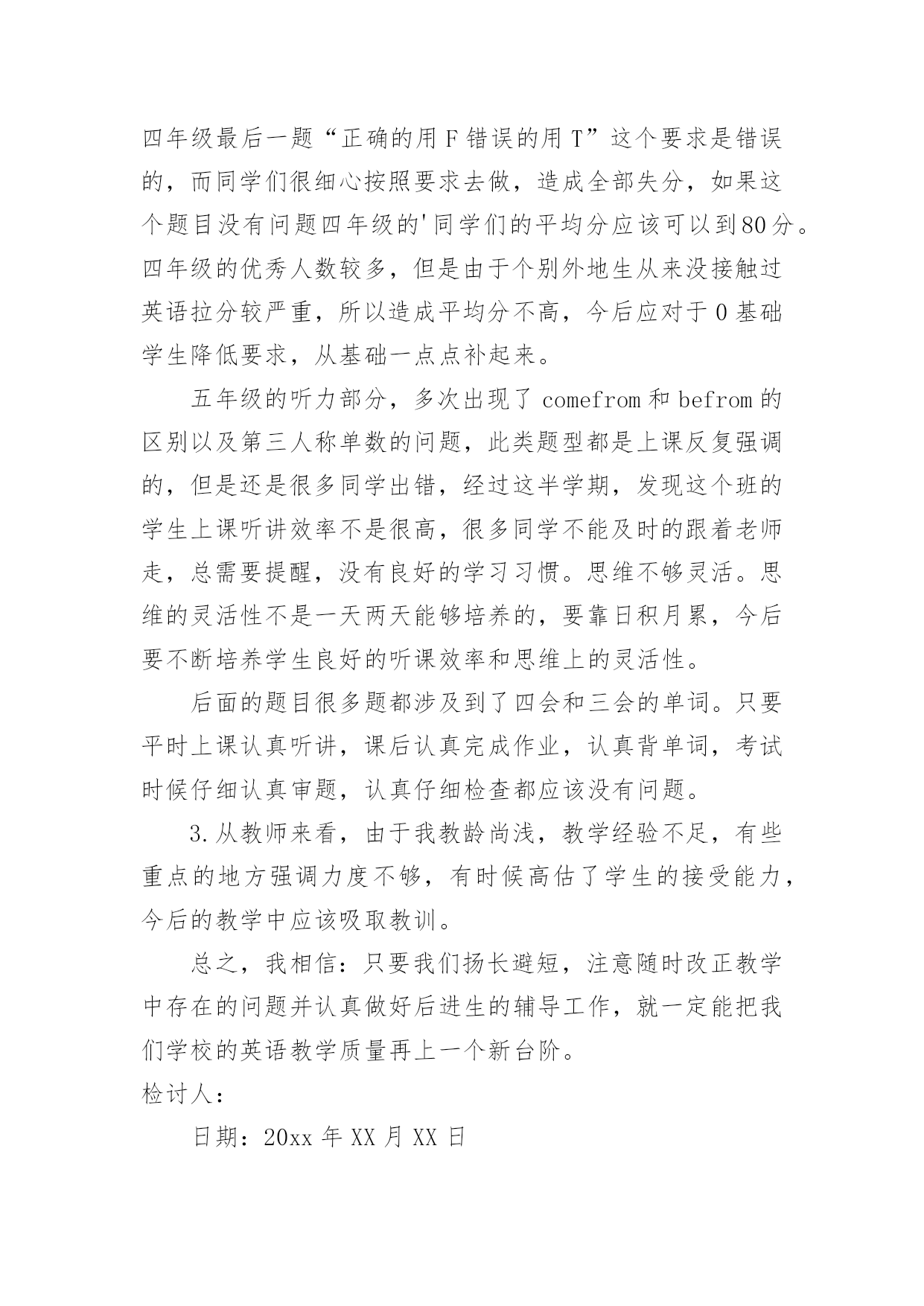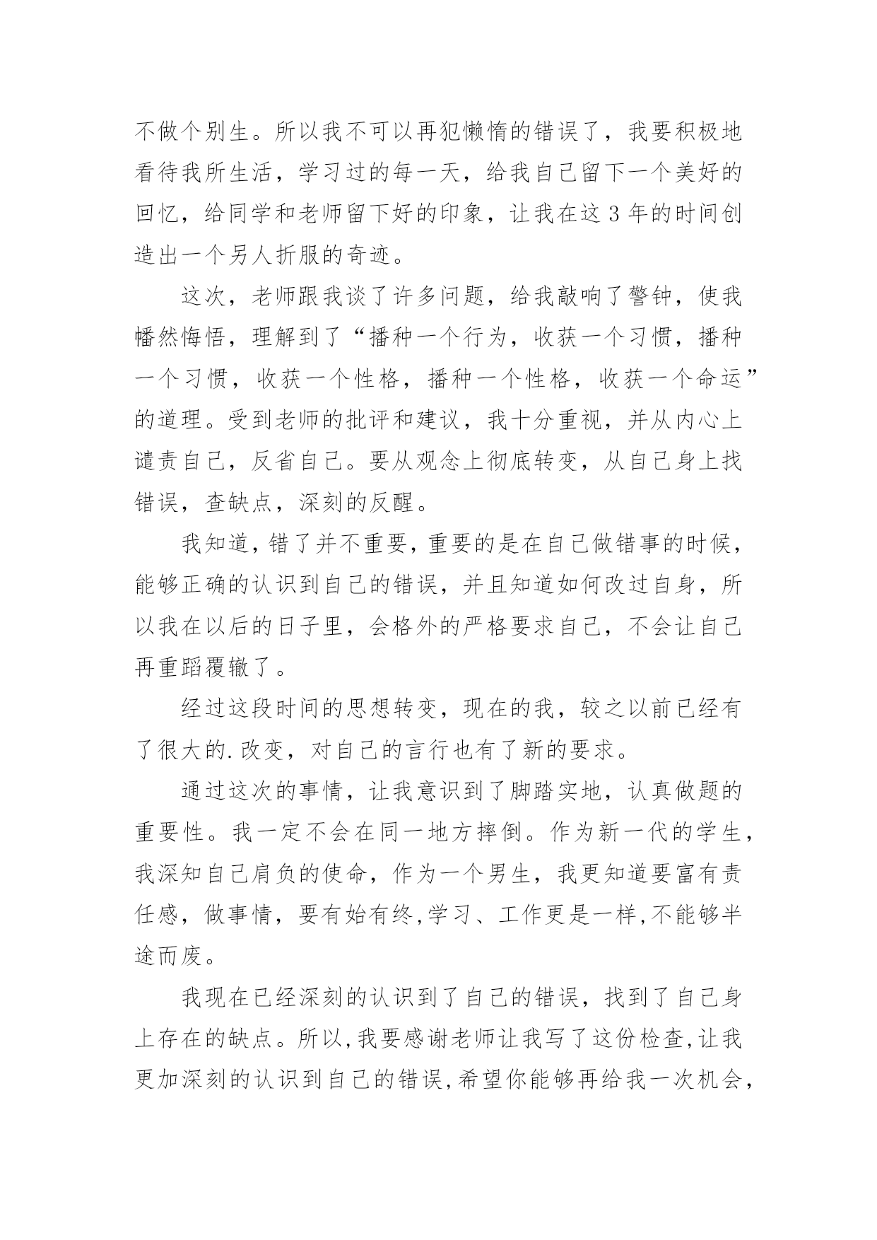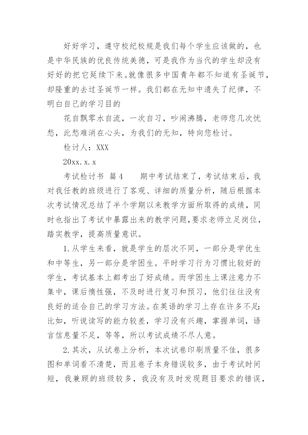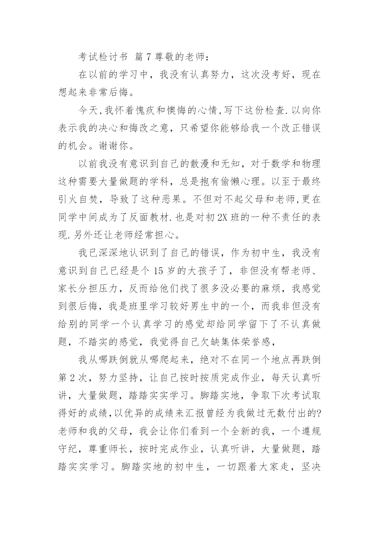 考试检讨书考试检讨书【精选】在不小心犯错后,为了避免再犯,为此要写检讨书来自我反省,写检讨书是为了能够不断提醒自己。写检讨书需要注意哪些问题呢?下面是小编整理的考试检讨书,希望能够帮助到大家。考试检讨书篇1尊敬的老师:您好!我由于在体育考试的时候找人xx,造成了作弊行为,当时体育老师对我进行了教育,本人从中认识到这件事情的严重性,意识到自己犯的错误的严重后果。错误的性质是严重的。我在考试的时候找人xx,在课堂上造成极坏的影响。这种行为,即使是没有被发现,仍然是不对的,此举本身就是违背了做考试的原则。我只是顾着自己的利益,和一时的想法,完全不理会体育老师的感受。这也是不对的,人是社会的人,大家不应该只是想着自己,我这样做,看似逃避了这次考试,实际上是在害自己。而且,考试的时候作弊本身也是对体育老师的不尊重。其次,我考试作弊的行为也是一种对老师的.工作不尊敬的表现。不单单是老师,无论对任何人,我们都应该尊重他,尊重他的劳动,他的劳动成果。我这样做,直接造成了不尊重老师,不尊重他人,不尊重他人劳动的恶劣影响。当时在侥幸心理的作用下量成了现在的后果。我找人xx欺骗了把辛苦执教的体育老师,我现在已经彻底认识到我的行为极其恶劣。自从接受了老师对我的批评教育,我已经深刻认识到这件事情的严重性,老师教育我说明老师是非常的关心我,爱护我,所以我今后要听老师的话,充分领会理解老师对我们的要求。望老师给我改过自新的机会。感谢老师对我的这次深刻的教育,它使我在今后的人生道路上找到了方向,对我的以后的人生有巨大的作用。我在考试的时候作弊实际上就是做假骗人,其结果损害了多方利益。这种不择手段达到成功目的的行为,即使考试的老师允许,此举本身就是违背了学生的职业道德和专心治学的精神、违背了公平竞争的原则。我所犯的错误,无疑产生了很大的负面影响,带了一个坏头。总之,我为自己所犯的错误而带来的这一切而深感痛心和后悔。我知道,造成如此大的损失,我必须要承担尽管是承担不起的责任,在此错误中应负不可推卸的主要责任。而替我xx的同学是在我的再三请求下才犯下这样的错误,他是很不同意我的行为的,并一再拒绝我的请求,在我的多次请求下才犯下大错,责任全在我身上。我真诚地接受批评,并愿意接受处理。我深刻反省,恳请老师相信我能够记取教训、改正错误,同时也真诚地希望老师能并对我的问题酌情处理。检讨人:×××××××年××月××日考试检讨书篇2期末考试结束了,成绩有些惨不忍睹,情绪一下降到最低点。其实刚开始时,我还有那么一些信心,因为试卷还算能够,比较细,难称不上,然后估计班级的平均分就应在80分以上吧,可谁明白结果竟然是76·6分。不及格的有2个(1个为随班跟读),及格为10人,良好为26人,优秀为2人。这样的成绩有些丢人,心中的怒火也抑制不住了,以至晚饭都吃不下(此刻有点饿了,后悔啊),躺在床上半天后,整理了下情绪,好多了,也最后想通了。谢谢叶老师,每次都会指导我一下,但是好像晚了点。叶老师的这盆冷水泼的好,“你在帮谁复习”“好学生还是学困生”“有效果吗”当时我还不以为然,理直气壮的对他说:“我已经很认真的复习了,只要听了,做了作业的,就没什么问题了,他们那些作业不做的,家长都不管,我能怎样办。”此刻想想真的很好笑,叶老师说的真的很对,我要复习的对象只是学困生,然后好学生回家后自己也会看书的,不需要你多说什么的,而学困生呢他们在家本来就缺少家长的管教,导致作业完成不是很好,压根就没复习到什么,上课的`效率也很差,所以这样的复习效果微乎其微。我将成绩翻看了一下,发现期末一向不做作业的3个成绩分别是51·5,60,61。还有5个作业也时常拖拉和完成不认真的也都在74分以下。此刻我最后明白叶老师说的“复习是要帮学困生复习。”而我一向“一视同仁”,结果却导致了这样的结果,不得不说我很失败。至少复习阶段是很失败的。没有抓住重点。吃一堑,长一智。事但是三,经过自己的摸索和叶老师的指导,我想下次我必须会注意的,会改善我的方法的,努力将这条“尾巴”割了。考试检讨书篇3尊敬的老师:您好!首先,我在此向你说一声对不起,我辜负了您对我的殷切希望。今天,我怀着愧疚的心情,写下这份检查。以向您表示我的决心和悔改之意,只希望老师能够给我一个改正错误的机会。以前我没有意识到自己的散漫和无知,上课总是不认真听讲,考试也不去。现在我十分重视,并从内心上谴责自己,反省自己。要从自己身上找错误,查不足,深刻的反醒。我知道,错了并不重要,重要的是在自己做错事的时候,能够正确的认识到自己的错误,并且知道如何改过自身,所以我在以后的.日子里,会格外的严格要求自己。现在我对自己的学习也有了新的要求。我一定不会在同一地方摔倒。做事情,要有始有终,学习更是一样,不能够半途而废。我现在已经深刻的认识到了自己的错误,找到了自己身上