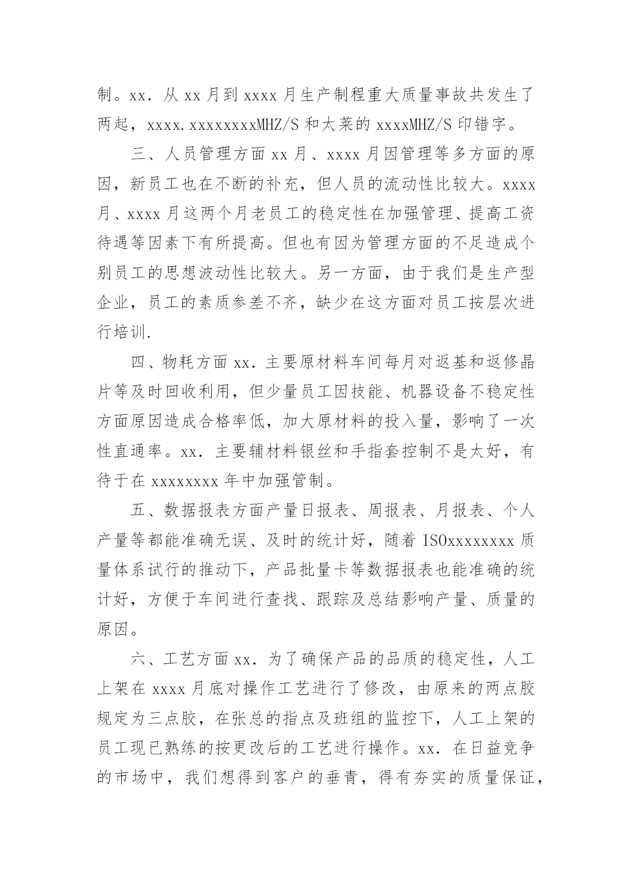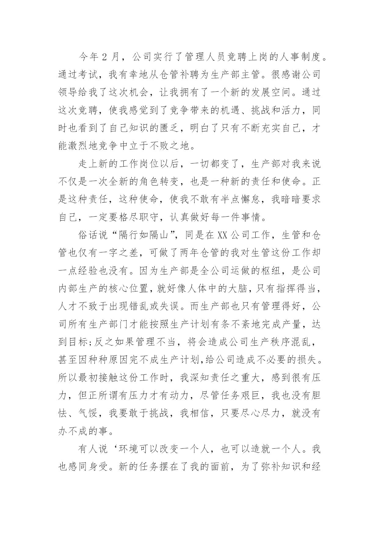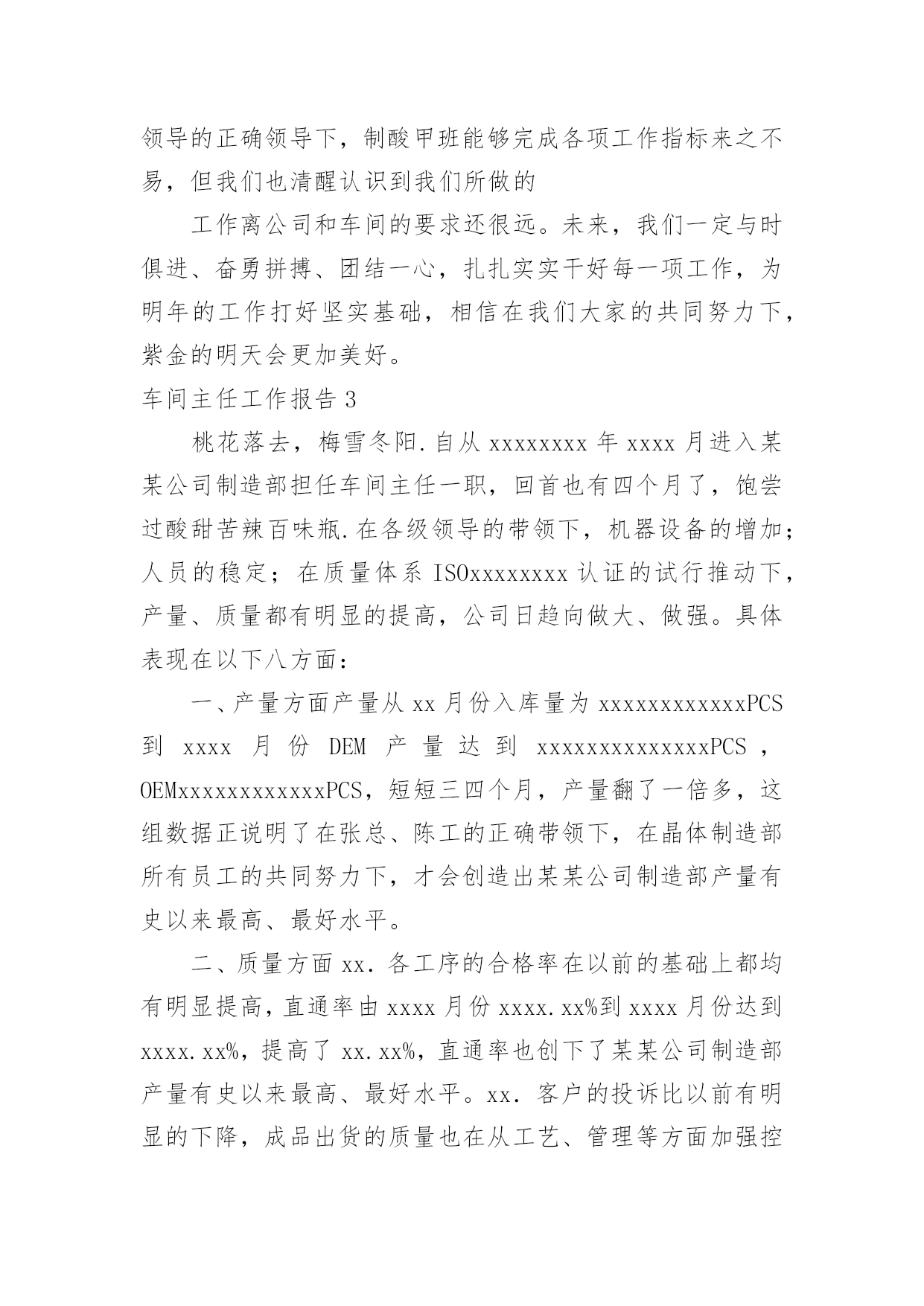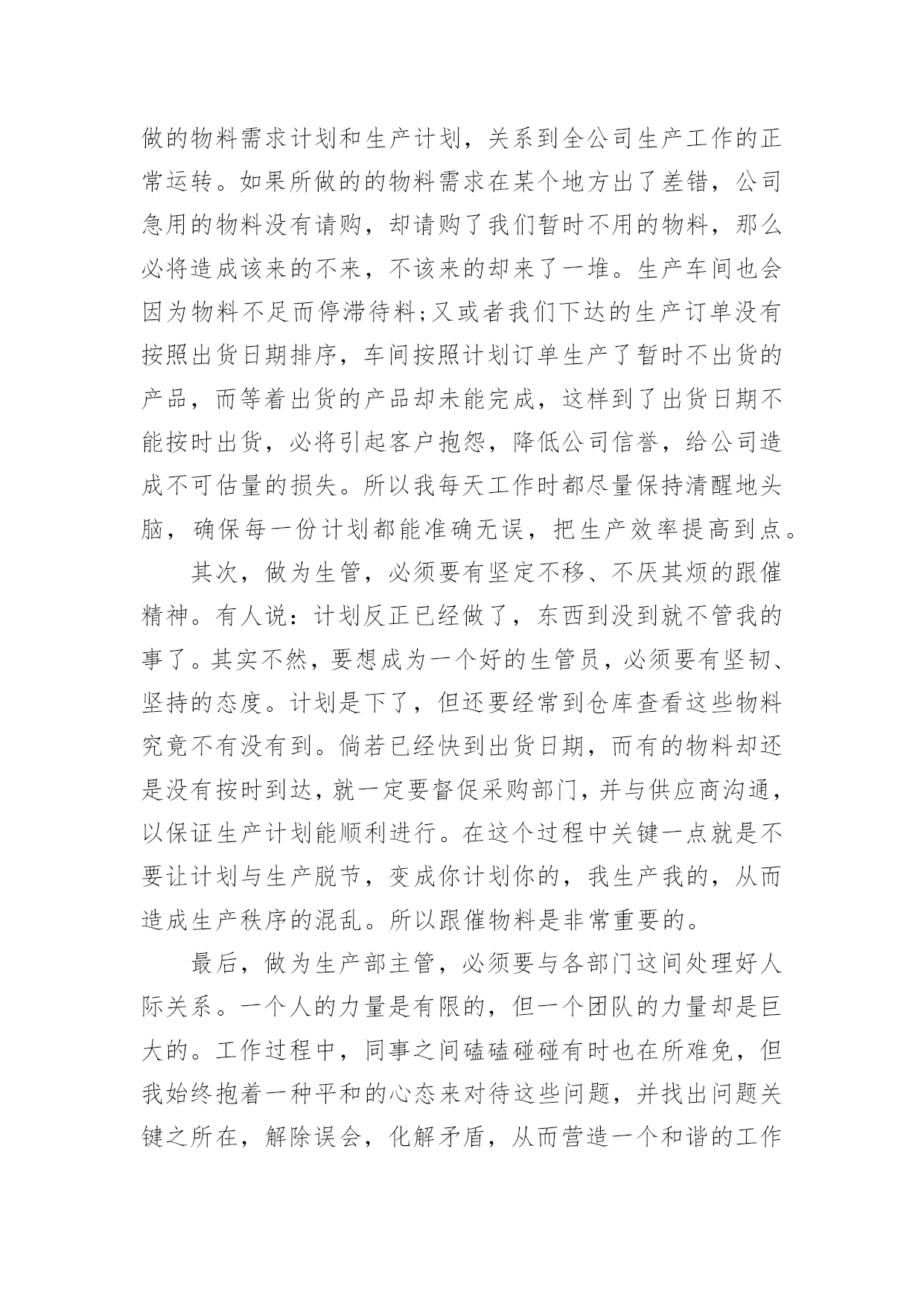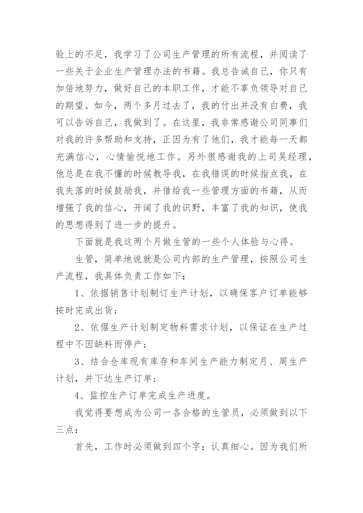 车间主任工作报告车间主任工作报告在人们越来越注重自身素养的今天,接触并使用报告的人越来越多,报告具有双向沟通性的特点。相信很多朋友都对写报告感到非常苦恼吧,以下是小编为大家收集的车间主任工作报告,欢迎阅读与收藏。车间主任工作报告1尊敬的领导、亲爱的同事们:大家好!岁月如梭,时间一晃而过,转眼间我在公司工作已八个多月,回想走过的历程,令人难忘,沥沥在目。工作的辛苦,收获的甘露,就像一杯陈年老酒,直浇心田,回味无穷!也许对有的人来说,这只是生活的一次经历或者体验,但对我而言,它更似一笔生活的财富,是我人生路上一次不可缺少的历炼。假日的夜晚总有几分喧嚣后的宁静,但也因为这样,我才得以有空闲、有心情整理思绪,回忆过去。生活需要思索,万物都是在不断地在实践中总结,吸取经验,扬长补短,再实践再总结,这样才能清楚地发现自己的不足,并加以改正,从而也看到了进步和成功的希望。现将我这些日子的工作情况简要汇报如下,敬请各位领导评议。今年2月,公司实行了管理人员竞聘上岗的人事制度。通过考试,我有幸地从仓管补聘为生产部主管。很感谢公司领导给我了这次机会,让我拥有了一个新的发展空间。通过这次竞聘,使我感觉到了竞争带来的机遇、挑战和活力,同时也看到了自己知识的匮乏,明白了只有不断充实自己,才能激烈地竞争中立于不败之地。走上新的工作岗位以后,一切都变了,生产部对我来说不仅是一次全新的角色转变,也是一种新的责任和使命。正是这种责任,这种使命,使我不敢有半点懈怠,我暗暗要求自己,一定要格尽职守,认真做好每一件事情。俗话说“隔行如隔山”,同是在XX公司工作,生管和仓管也仅有一字之差,可做了两年仓管的我对生管这份工作却一点经验也没有。因为生产部是全公司运做的枢纽,是公司内部生产的核心位置,就好像人体中的大脑,只有指挥得当,人才不致于出现错乱或失误。而生产部也只有管理得好,公司所有生产部门才能按照生产计划有条不紊地完成产量,达到目标;反之如果管理不当,将会造成公司生产秩序混乱,甚至因种种原因完不成生产计划,给公司造成不必要的损失。所以最初接触这份工作时,我深知责任之重大,感到很有压力,但正所谓有压力才有动力,尽管任务艰巨,我也没有胆怯、气馁,我要敢于挑战,我相信,只要尽心尽力,就没有办不成的事。有人说‘环境可以改变一个人,也可以造就一个人。我也感同身受。新的任务摆在了我的面前,为了弥补知识和经验上的不足,我学习了公司生产管理的所有流程,并阅读了一些关于企业生产管理办法的书籍。我总告诫自己,你只有加倍地努力,做好自己的本职工作,才能不辜负领导对自己的期望。如今,两个多月过去了,我的付出并没有白费,我可以告诉自己,我做到了。在这里,我非常感谢公司同事们对我的许多帮助和支持,正因为有了他们,我才能每一天都充满信心,心情愉悦地工作。另外很感谢我的上司吴经理,他总是在我不懂的时候教导我,在我错误的时候指点我,在我失落的时候鼓励我,并借给我一些管理方面的书籍,从而增强了我的信心,开阔了我的识野,丰富了我的知识,使我的思想得到了进一步的提升。下面就是我这两个月做生管的一些个人体验与心得。生管,简单地说就是公司内部的生产管理,按照公司生产流程,我具体负责工作如下:1、依据销售计划制订生产计划,以确保客户订单能够按时完成出货;2、依倨生产计划制定物料需求计划,以保证在生产过程中不因缺料而停产;3、结合仓库现有库存和车间生产能力制定月、周生产计划,并下达生产订单;4、监控生产订单完成生产进度。我觉得要想成为公司一各合格的生管员,必须做到以下三点:首先,工作时必须做到四个字:认真细心。因为我们所做的物料需求计划和生产计划,关系到全公司生产工作的正常运转。如果所做的的物料需求在某个地方出了差错,公司急用的物料没有请购,却请购了我们暂时不用的物料,那么必将造成该来的不来,不该来的却来了一堆。生产车间也会因为物料不足而停滞待料;又或者我们下达的生产订单没有按照出货日期排序,车间按照计划订单生产了暂时不出货的产品,而等着出货的产品却未能完成,这样到了出货日期不能按时出货,必将引起客户抱怨,降低公司信誉,给公司造成不可估量的损失。所以我每天工作时都尽量保持清醒地头脑,确保每一份计划都能准确无误,把生产效率提高到点。其次,做为生管,必须要有坚定不移、不厌其烦的跟催精神。有人说:计划反正已经做了,东西到没到就不管我的事了。其实不然,要想成为一个好的生管员,必须要有坚韧、坚持的态度。计划是下了,但还要经常到仓库查看这些物料究竟不有没有到。倘若已经快到出货日期,而有的物料却还是没有按时到达,就一定要督促采购部门,并与供应商沟通,以保证生产计划能顺利进行。在这个过程中关键一点就是不要让计划与生产脱节,变成你计划你的,我生产我的,从而造成生产秩序的混乱。所以跟催物料是非常重要的。最后,做为生产部主管,必须