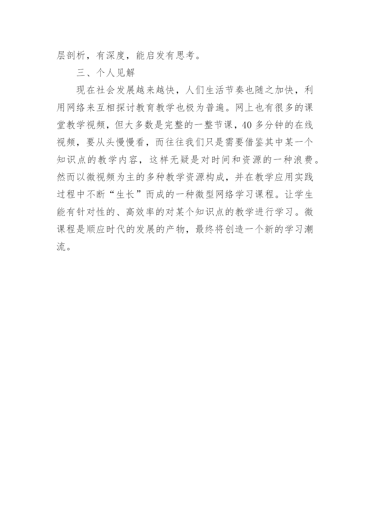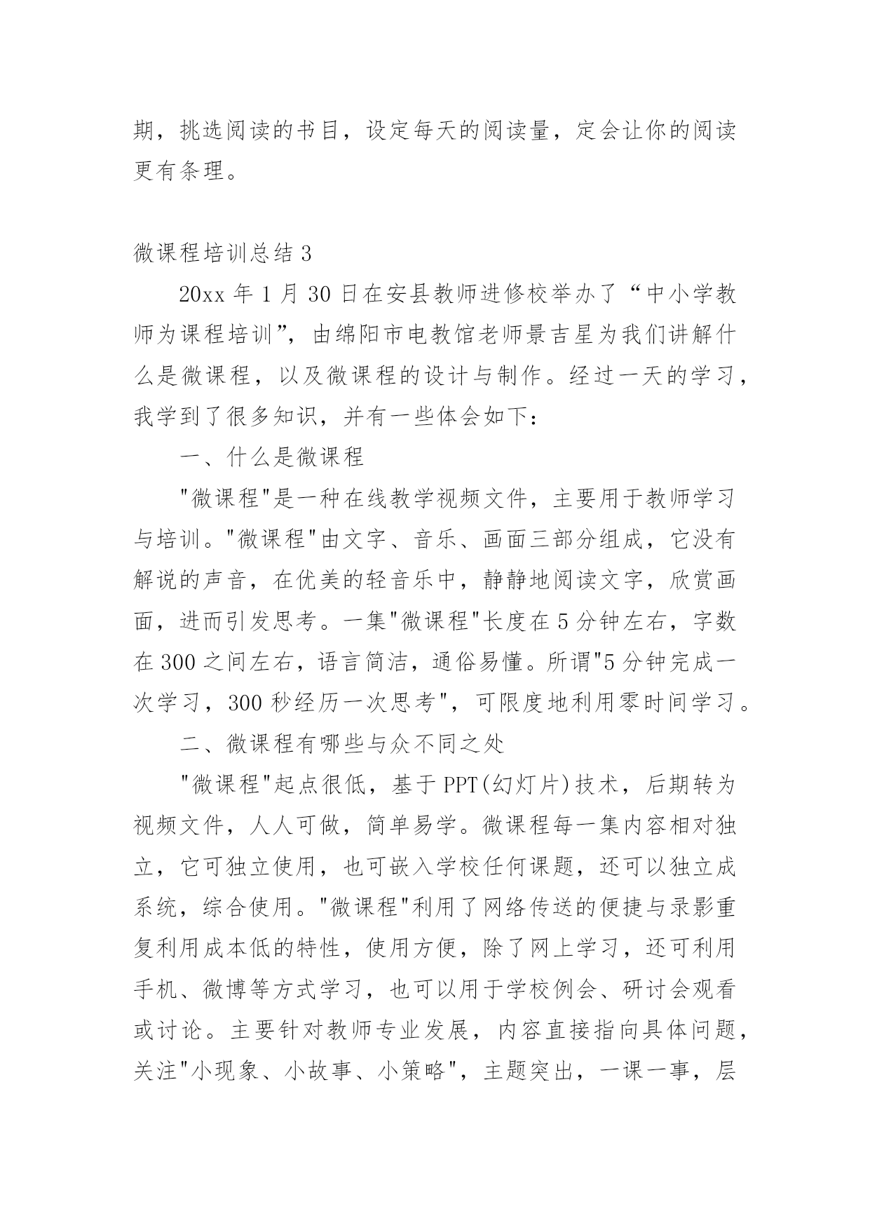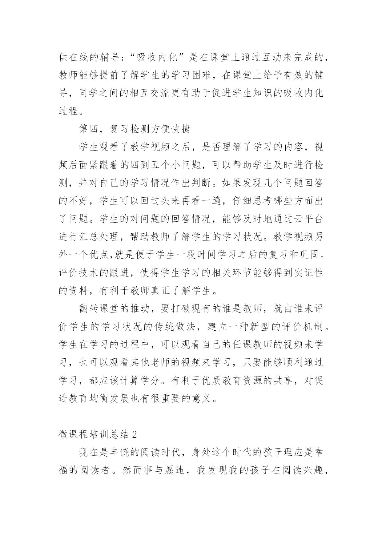 微课程培训总结总结是对某一特定时间段内的学习和工作生活等表现情况加以回顾和分析的一种书面材料,它能使我们及时找出错误并改正,因此我们需要回头归纳,写一份总结了。那么如何把总结写出新花样呢?下面是小编收集整理的微课程培训总结,欢迎大家分享。微课程培训总结1金馆长先利用一段介绍可汗学院的视频让我们真切地感受了什么是翻转课堂,接着结合视频,用互动的方式阐述了翻转课堂究竟翻转了什么。随着金馆长的讲解,我对微课程的慢慢有了一些了解,弄清了微课与微课程的区别,了解了微课程开发的基本方法。金陵馆长的讲座对我们来说无疑是一次头脑风暴。利用视频来实施教学,在多年以前人们就进行过探索。在上世纪的50年代,世界上很多国家所进行的广播电视教育就是明证。为什么当年所做的探索没有对传统的教学模式带来多大的影响,而“翻转课堂”却倍受关注呢?这是因为“翻转课堂”有如下几个鲜明的特点:第一,教学视频短小精悍不论是萨尔曼·汗的数学辅导视频,还是乔纳森·伯尔曼和亚伦·萨姆斯所做的化学学科教学视频,一个共同的特点就是短小精悍。大多数的视频都只有几分钟的时间,比较长的视频也只有十几分钟。每一个视频都针对一个特定的问题,有较强的针对性,查找起来也比较方便;视频的长度控制在在学生注意力能比较集中的时间范围内,符合学生身心发展特征;通过网络发布的视频,具有暂停、回放等多种功能,可以自我控制,有利于学生的自主学习。第二,教学信息清晰明确萨尔曼·汗的教学视频有一个显著的特点,就是在视频中唯一能够看到的就是他的手,不断地书写一些数学的符号,并缓慢地填满整个屏幕。除此之外,就是配合书写进行讲解的画外音。用萨尔曼·汗自己的话语来说:“这种方式。它似乎并不像我站在讲台上为你讲课,它让人感到贴心,就像我们同坐在一张桌子面前,一起学习,并把内容写在一张纸上。”这是“翻转课堂”的教学视频与传统的教学录像作为不同之处。视频中的出现的教师的头像、以及教室里的各种物品摆设,都会分散学生的注意力,特别是在学生自主学习的情况下。第三,重新建构学习流程通常情况下,学生的学习过程由两个阶段组成:第一阶段是“信息传递”,是通过教师和学生、学生和学生之间的互动来实现的;第二个阶段是“吸收内化”,是在课后由学生自己来完成的。由于缺少教师的支持和同伴的帮助,“吸收内化”阶段常常会让学生感到挫败,丧失学习的动机和成就感。“翻转课堂”对学生的'学习过程进行了重构。“信息传递”是学生在课前进行的,老师不仅提供了视频,还可以提供在线的辅导;“吸收内化”是在课堂上通过互动来完成的,教师能够提前了解学生的学习困难,在课堂上给予有效的辅导,同学之间的相互交流更有助于促进学生知识的吸收内化过程。第四,复习检测方便快捷学生观看了教学视频之后,是否理解了学习的内容,视频后面紧跟着的四到五个小问题,可以帮助学生及时进行检测,并对自己的学习情况作出判断。如果发现几个问题回答的不好,学生可以回过头来再看一遍,仔细思考哪些方面出了问题。学生的对问题的回答情况,能够及时地通过云平台进行汇总处理,帮助教师了解学生的学习状况。教学视频另外一个优点,就是便于学生一段时间学习之后的复习和巩固。评价技术的跟进,使得学生学习的相关环节能够得到实证性的资料,有利于教师真正了解学生。翻转课堂的推动,要打破现有的谁是教师,就由谁来评价学生的学习状况的传统做法,建立一种新型的评价机制。学生在学习的过程中,可以观看自己的任课教师的视频来学习,也可以观看其他老师的视频来学习,只要能够顺利通过学习,都应该计算学分。有利于优质教育资源的共享,对促进教育均衡发展也有很重要的意义。微课程培训总结2现在是丰饶的阅读时代,身处这个时代的孩子理应是幸福的阅读者。然而事与愿违,我发现我的孩子在阅读兴趣,阅读数量以及阅读面等方面都不尽如人意。如何让孩子喜欢阅读呢?透过看《阅读策略》雷夫老师的智慧让我有所感触。没有一个良好的阅读氛围,现在因为升学压力大,很多家长不太鼓励学生进行课外阅读,认为这是不必要的浪费时间。因此在家庭中没有形成良好的阅读氛围,我们的孩子又怎么会爱上阅读呢?同时,孩子阅读不只是个体行为,更需要能有人与之交流,共谈阅读心得,分享阅读的体验和快乐。但现在的学生,缺少玩伴以及与父母交流的时间,陪伴他们有时只有冰冷的电脑。如果仅仅依靠网络这一平台进行交流,便很难让学生静下心来,走进书本。在家庭中感受家长陪伴阅读的乐趣1.也许你不太读书,但爱看金庸的武侠小说,那就让他陪你一起读读《天龙八部》,与家长一起读一本他们认可的书,是一件有趣的事。2.也许你一天读不了很多页的书,但务必持之以恒,细水长流,脑海里要有阅读即是精神饮食的意识。每天抽出一定的时间和孩子一起阅读,无须太多,30分钟即可。3.读书时的信手涂鸦其实很宝贵,千万不要轻易丢掉,经常和孩子互写一些阅读感受,集页成册,