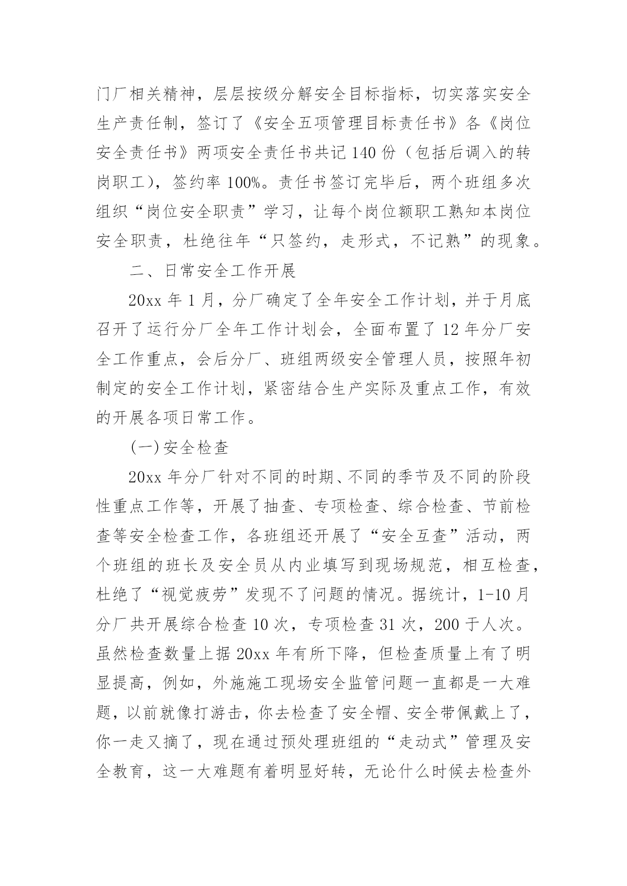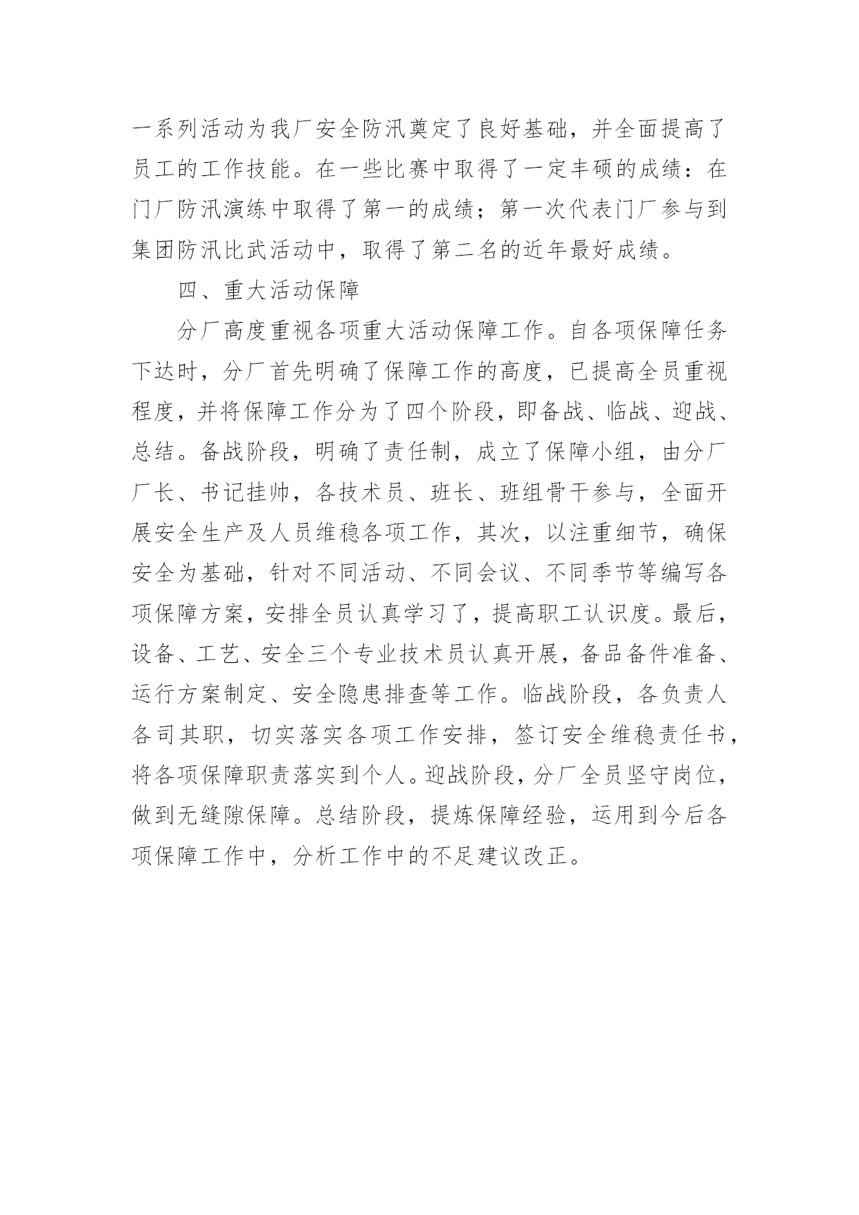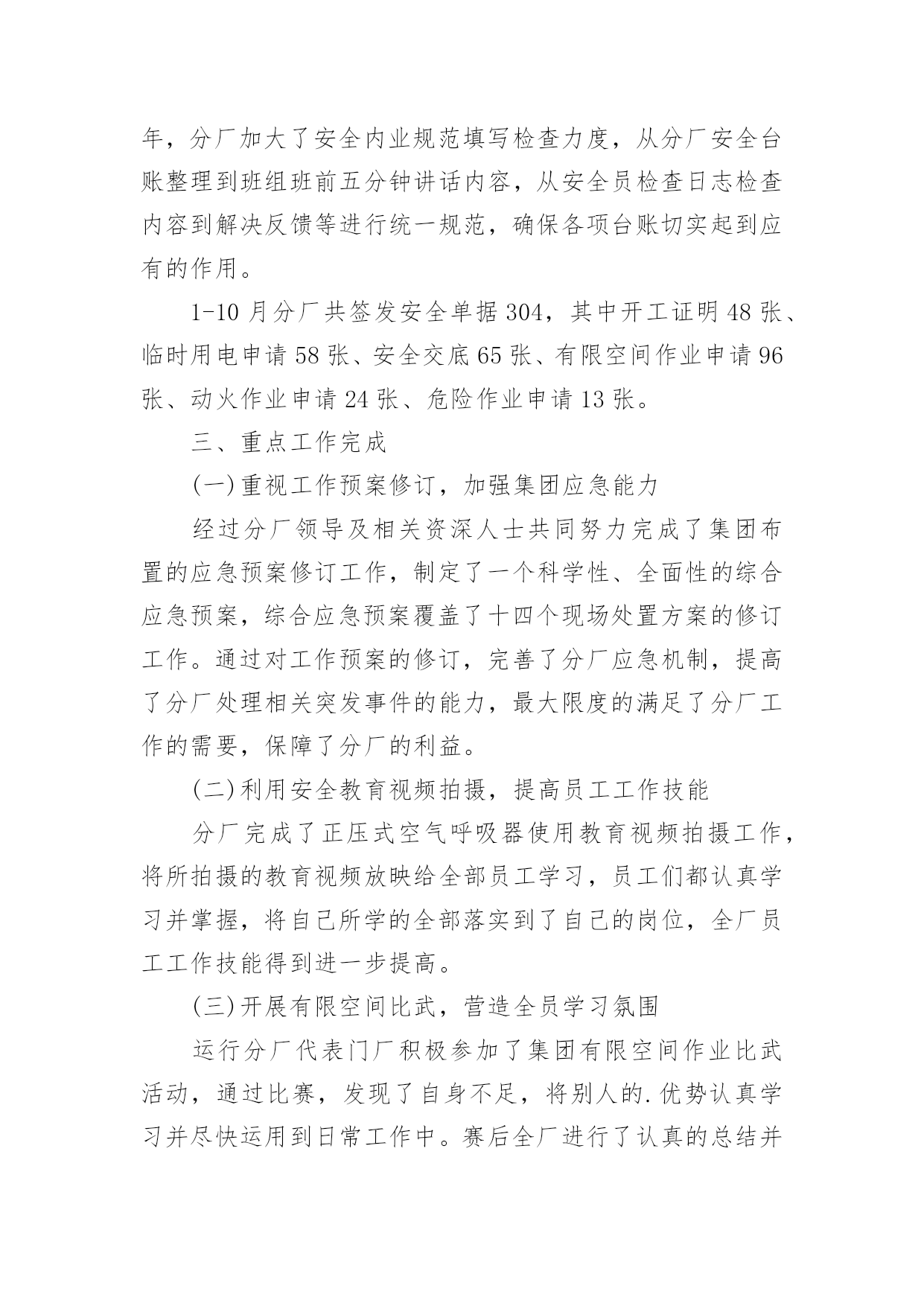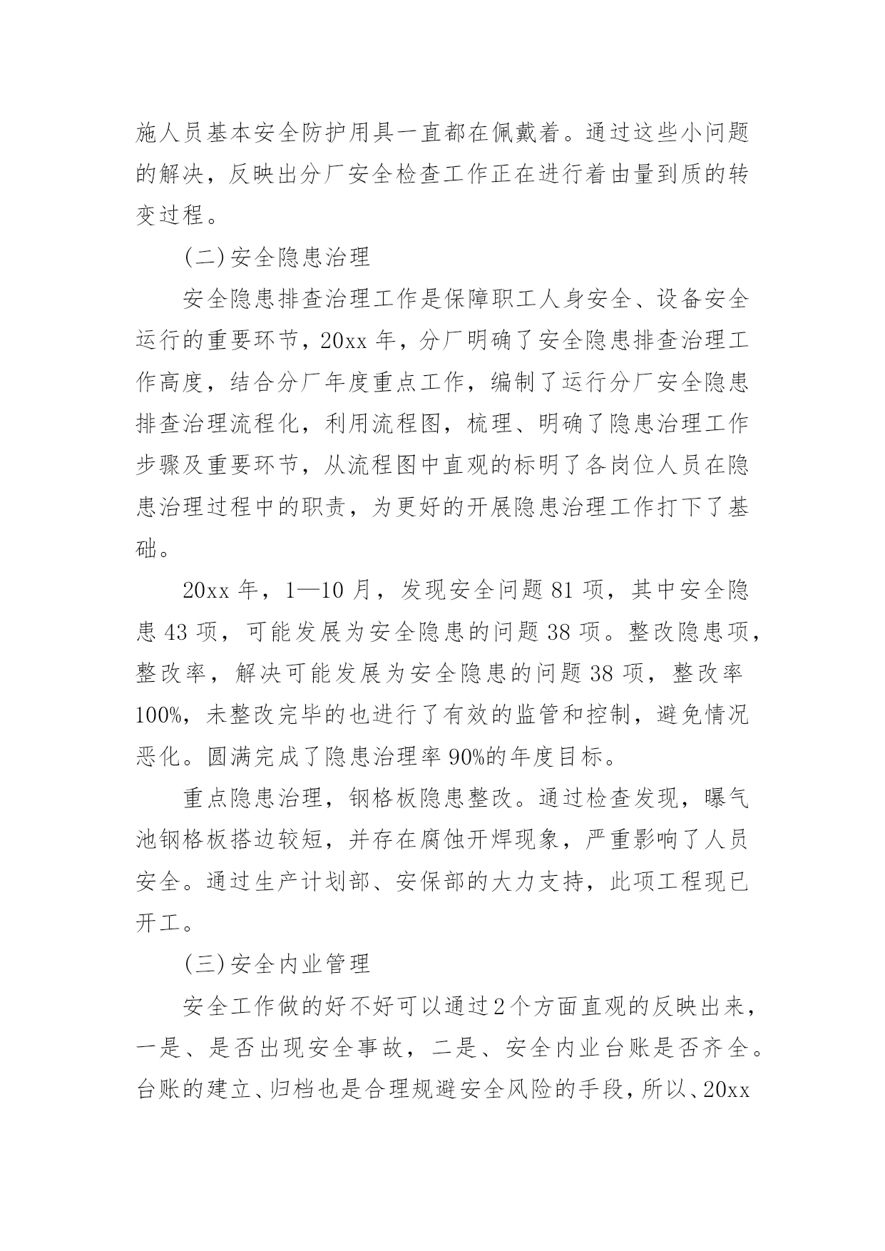 门厂安全运行工作报告门厂安全运行工作报告在我们平凡的日常里,报告的适用范围越来越广泛,其在写作上有一定的技巧。相信很多朋友都对写报告感到非常苦恼吧,以下是小编整理的门厂安全运行工作报告,欢迎阅读,希望大家能够喜欢。20xx年,运行安全生产工作在集团及门厂高度重视下,全面落实安全生产责任制,紧紧围绕集团及门厂安全工作的总体部署,从以安全管理“重、细、严”三字入手,全面深入的开展了安全检查、隐患治理、应急保障、教育视频拍摄等工作,以加强安全意识教育、关键工序控制为重点,夯实基层安全管理工作基础,圆满完成了20xx年各项工作部署,并深入分析“得与失”,延续、吸收好的经验,改正、规避错的方法,为20xx年安全工作奠定了基础。下面我将从以下几个方面,对运行分厂20xx年各项安全工作进行总结:(重:全员重视,细:管理细致,严:严格落实)一、落实安全责任制我认为,安全生产责任制的落实工作是所有安全工作的基本保障,是合理规避安全风险的重要手段之一。所以,分厂自领导到职工高度重视此项工作,20xx年底就着手准备安全责任书的修订与签订工作,12年初,分厂严格按照集团及门厂相关精神,层层按级分解安全目标指标,切实落实安全生产责任制,签订了《安全五项管理目标责任书》各《岗位安全责任书》两项安全责任书共记140份(包括后调入的转岗职工),签约率100%。责任书签订完毕后,两个班组多次组织“岗位安全职责”学习,让每个岗位额职工熟知本岗位安全职责,杜绝往年“只签约,走形式,不记熟”的现象。二、日常安全工作开展20xx年1月,分厂确定了全年安全工作计划,并于月底召开了运行分厂全年工作计划会,全面布置了12年分厂安全工作重点,会后分厂、班组两级安全管理人员,按照年初制定的安全工作计划,紧密结合生产实际及重点工作,有效的开展各项日常工作。(一)安全检查20xx年分厂针对不同的时期、不同的季节及不同的阶段性重点工作等,开展了抽查、专项检查、综合检查、节前检查等安全检查工作,各班组还开展了“安全互查”活动,两个班组的班长及安全员从内业填写到现场规范,相互检查,杜绝了“视觉疲劳”发现不了问题的情况。据统计,1-10月分厂共开展综合检查10次,专项检查31次,200于人次。虽然检查数量上据20xx年有所下降,但检查质量上有了明显提高,例如,外施施工现场安全监管问题一直都是一大难题,以前就像打游击,你去检查了安全帽、安全带佩戴上了,你一走又摘了,现在通过预处理班组的“走动式”管理及安全教育,这一大难题有着明显好转,无论什么时候去检查外施人员基本安全防护用具一直都在佩戴着。通过这些小问题的解决,反映出分厂安全检查工作正在进行着由量到质的转变过程。(二)安全隐患治理安全隐患排查治理工作是保障职工人身安全、设备安全运行的重要环节,20xx年,分厂明确了安全隐患排查治理工作高度,结合分厂年度重点工作,编制了运行分厂安全隐患排查治理流程化,利用流程图,梳理、明确了隐患治理工作步骤及重要环节,从流程图中直观的标明了各岗位人员在隐患治理过程中的职责,为更好的开展隐患治理工作打下了基础。20xx年,1—10月,发现安全问题81项,其中安全隐患43项,可能发展为安全隐患的问题38项。整改隐患项,整改率,解决可能发展为安全隐患的问题38项,整改率100%,未整改完毕的也进行了有效的监管和控制,避免情况恶化。圆满完成了隐患治理率90%的年度目标。重点隐患治理,钢格板隐患整改。通过检查发现,曝气池钢格板搭边较短,并存在腐蚀开焊现象,严重影响了人员安全。通过生产计划部、安保部的大力支持,此项工程现已开工。(三)安全内业管理安全工作做的好不好可以通过2个方面直观的反映出来,一是、是否出现安全事故,二是、安全内业台账是否齐全。台账的建立、归档也是合理规避安全风险的手段,所以、20xx年,分厂加大了安全内业规范填写检查力度,从分厂安全台账整理到班组班前五分钟讲话内容,从安全员检查日志检查内容到解决反馈等进行统一规范,确保各项台账切实起到应有的作用。1-10月分厂共签发安全单据304,其中开工证明48张、临时用电申请58张、安全交底65张、有限空间作业申请96张、动火作业申请24张、危险作业申请13张。三、重点工作完成(一)重视工作预案修订,加强集团应急能力经过分厂领导及相关资深人士共同努力完成了集团布置的应急预案修订工作,制定了一个科学性、全面性的综合应急预案,综合应急预案覆盖了十四个现场处置方案的修订工作。通过对工作预案的修订,完善了分厂应急机制,提高了分厂处理相关突发事件的能力,最大限度的满足了分厂工作的需要,保障了分厂的利益。(二)利用安全教育视频拍摄,提高员工工作技能分厂完成了正压式空气呼吸器使用教育视频拍摄工作,将所拍摄的教育视频放映给全部员工学习,员工们都认真学习并掌握,将自己所学的全部