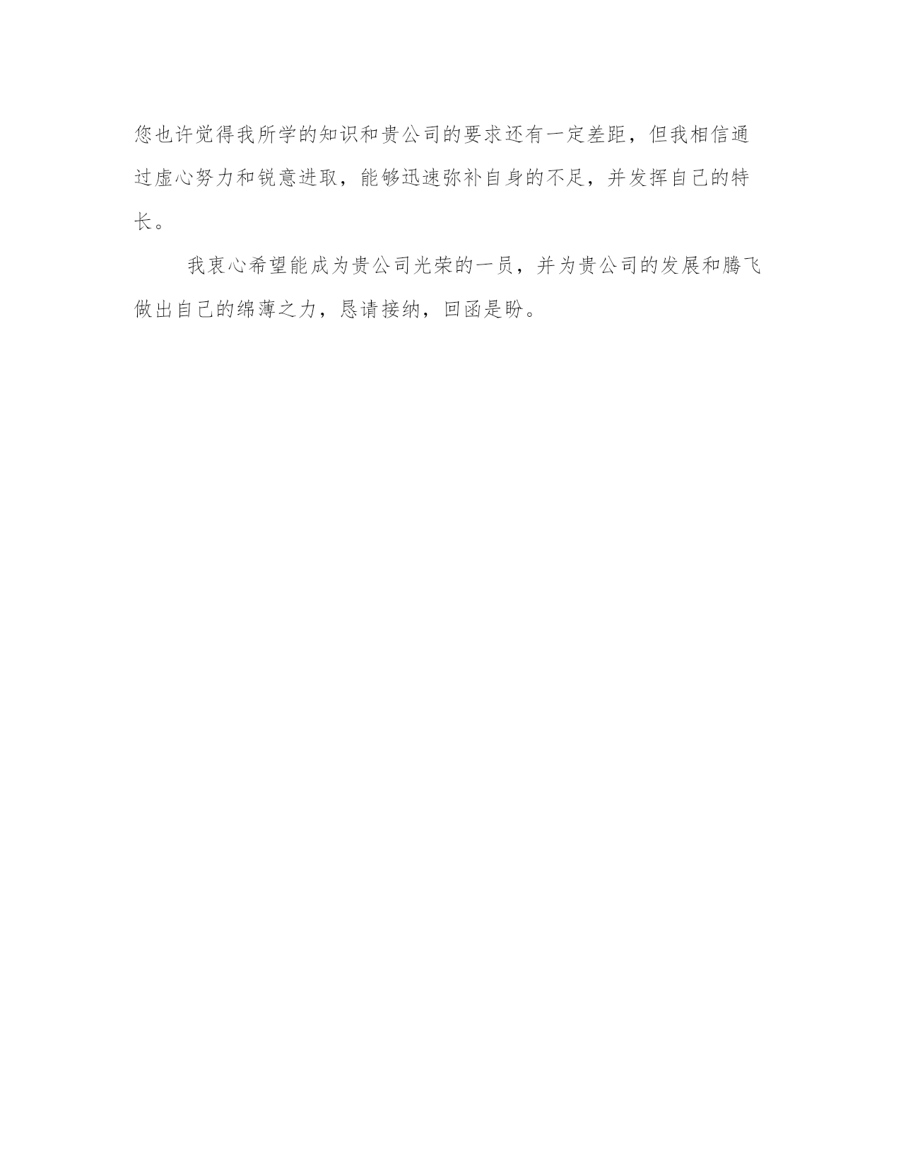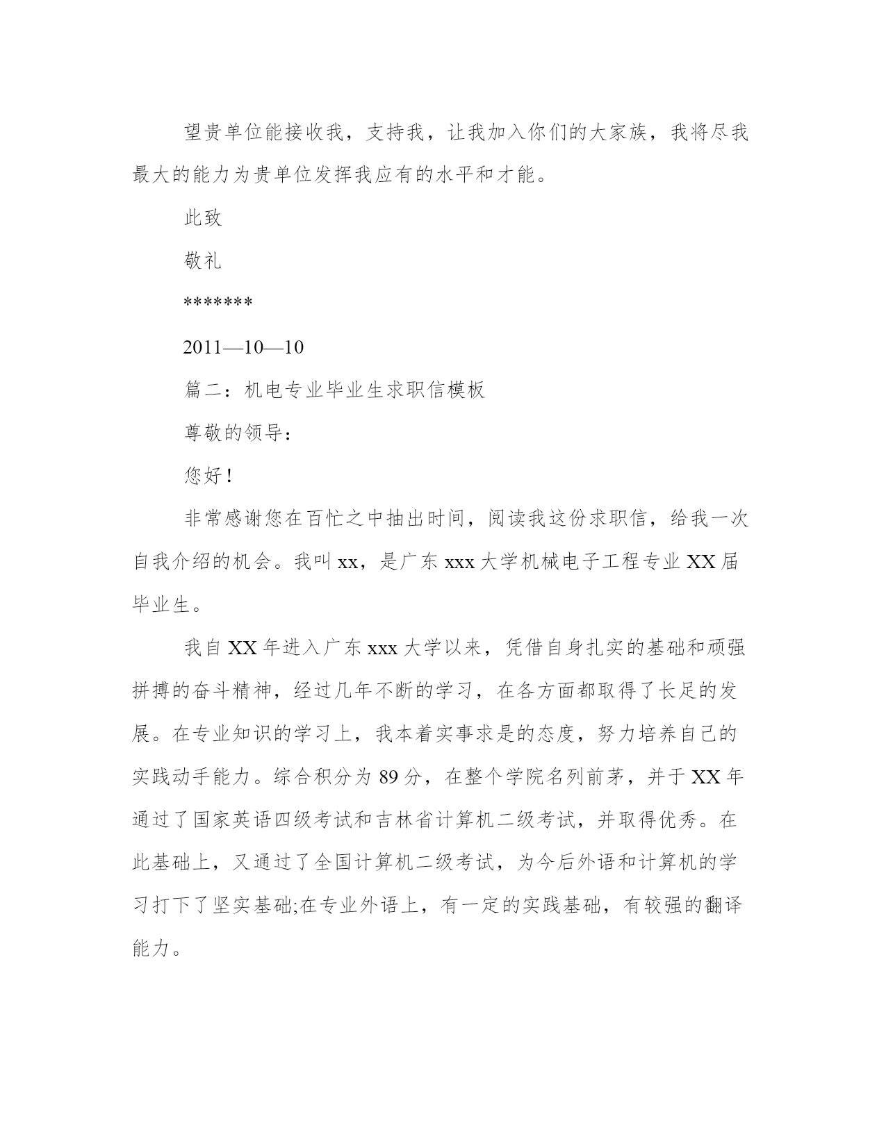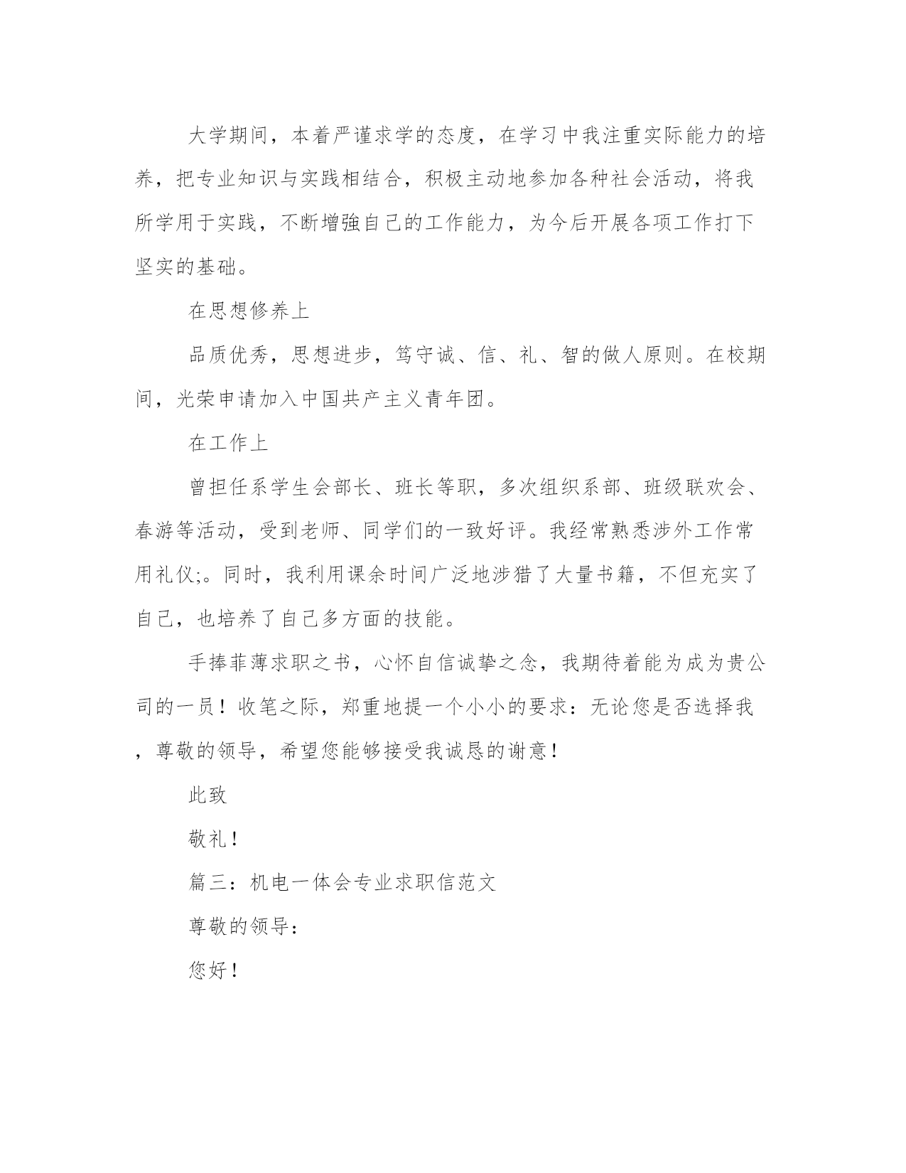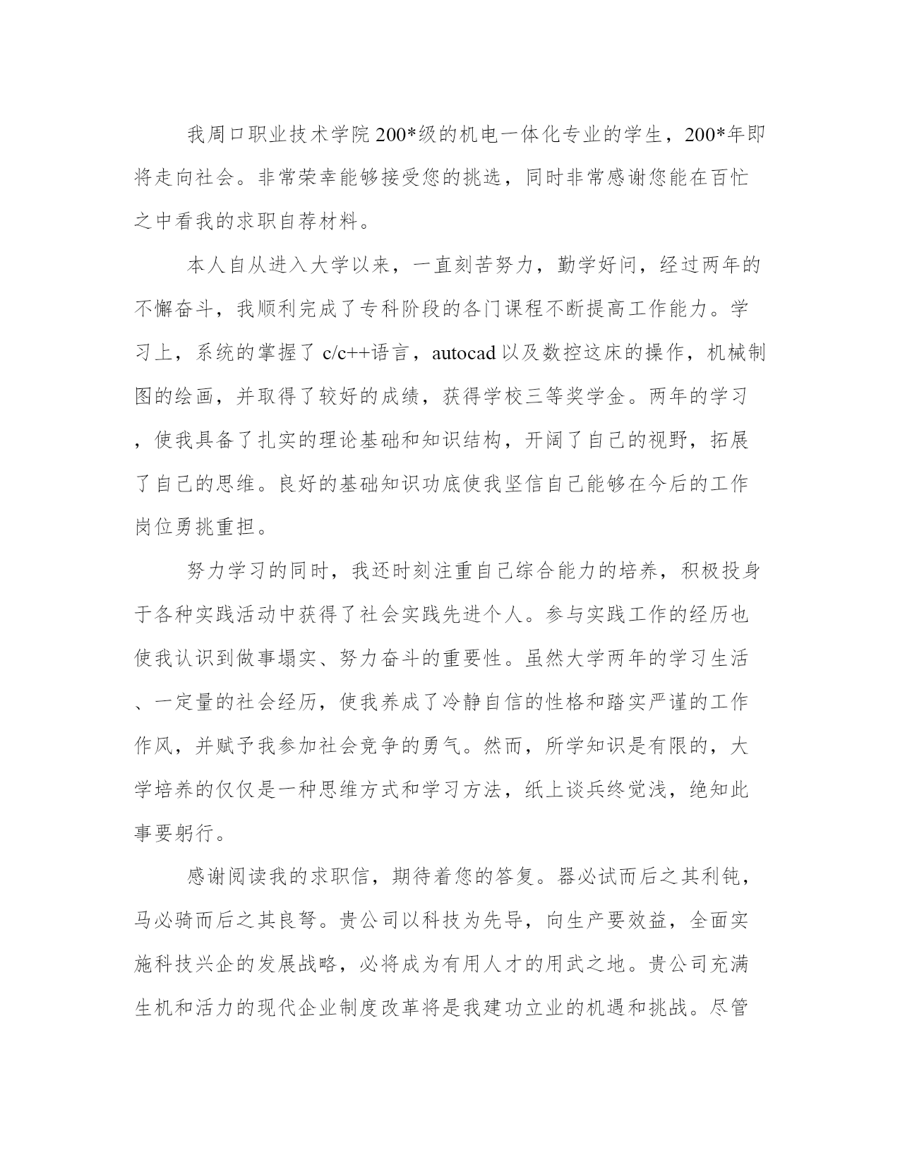 简短的机电专业求职信范文尊敬的领导:你好!感谢你在百忙之中抽空审阅我的材料,希望给我一个机会!物识一个掌握扎实专业知识并具有一定工作能力和组织能力的部下,是你的愿望。谋求一个充分发挥自己专业特长的工作单位,并能得到你的关照,是我的期盼;得力的助手,有助于你工作顺心;合适的工作单位,有助于我施展才华。或许我们会为着一个共同的目标而站在一起,那就是:将贵单位的辉煌历史写得更加缤纷!愿为贵单位工作,并奉献自己的青春和才华。期盼和感谢你的选择!作为大三毕业的学生,虽然工作经验不足,但我会虚心学习、积极工作、尽忠尽责做好本职工作。诚恳希望得到贵单位的接约或给予面试的机会,以期进一步考查我的能力。大学生活并不是我们想象中的乐园,更不是我们理想中的天堂,而是一个锻炼人的大火炉。值此锻炼机会来临之际,特试向贵单位自荐,给我一个就业锻炼的会,还你一份成绩。一颗真诚的心在期望你的信任。一个人的人生在等你的改变。望贵单位能接收我,支持我,让我加入你们的大家族,我将尽我最大的能力为贵单位发挥我应有的水平和才能。此致敬礼*******2011—10—10篇二:机电专业毕业生求职信模板尊敬的领导:您好!非常感谢您在百忙之中抽出时间,阅读我这份求职信,给我一次自我介绍的机会。我叫xx,是广东xxx大学机械电子工程专业XX届毕业生。我自XX年进入广东xxx大学以来,凭借自身扎实的基础和顽强拼搏的奋斗精神,经过几年不断的学习,在各方面都取得了长足的发展。在专业知识的学习上,我本着实事求是的态度,努力培养自己的实践动手能力。综合积分为89分,在整个学院名列前茅,并于XX年通过了国家英语四级考试和吉林省计算机二级考试,并取得优秀。在此基础上,又通过了全国计算机二级考试,为今后外语和计算机的学习打下了坚实基础;在专业外语上,有一定的实践基础,有较强的翻译能力。大学期间,本着严谨求学的态度,在学习中我注重实际能力的培养,把专业知识与实践相结合,积极主动地参加各种社会活动,将我所学用于实践,不断增強自己的工作能力,为今后开展各项工作打下坚实的基础。在思想修养上品质优秀,思想进步,笃守诚、信、礼、智的做人原则。在校期间,光荣申请加入中国共产主义青年团。在工作上曾担任系学生会部长、班长等职,多次组织系部、班级联欢会、春游等活动,受到老师、同学们的一致好评。我经常熟悉涉外工作常用礼仪;。同时,我利用课余时间广泛地涉猎了大量书籍,不但充实了自己,也培养了自己多方面的技能。手捧菲薄求职之书,心怀自信诚挚之念,我期待着能为成为贵公司的一员!收笔之际,郑重地提一个小小的要求:无论您是否选择我,尊敬的领导,希望您能够接受我诚恳的谢意!此致敬礼!篇三:机电一体会专业求职信范文尊敬的领导:您好!我周口职业技术学院200*级的机电一体化专业的学生,200*年即将走向社会。非常荣幸能够接受您的挑选,同时非常感谢您能在百忙之中看我的求职自荐材料。本人自从进入大学以来,一直刻苦努力,勤学好问,经过两年的不懈奋斗,我顺利完成了专科阶段的各门课程不断提高工作能力。学习上,系统的掌握了c/c++语言,autocad以及数控这床的操作,机械制图的绘画,并取得了较好的成绩,获得学校三等奖学金。两年的学习,使我具备了扎实的理论基础和知识结构,开阔了自己的视野,拓展了自己的思维。良好的基础知识功底使我坚信自己能够在今后的工作岗位勇挑重担。努力学习的同时,我还时刻注重自己综合能力的培养,积极投身于各种实践活动中获得了社会实践先进个人。参与实践工作的经历也使我认识到做事塌实、努力奋斗的重要性。虽然大学两年的学习生活、一定量的社会经历,使我养成了冷静自信的性格和踏实严谨的工作作风,并赋予我参加社会竞争的勇气。然而,所学知识是有限的,大学培养的仅仅是一种思维方式和学习方法,纸上谈兵终觉浅,绝知此事要躬行。感谢阅读我的求职信,期待着您的答复。器必试而后之其利钝,马必骑而后之其良弩。贵公司以科技为先导,向生产要效益,全面实施科技兴企的发展战略,必将成为有用人才的用武之地。贵公司充满生机和活力的现代企业制度改革将是我建功立业的机遇和挑战。尽管您也许觉得我所学的知识和贵公司的要求还有一定差距,但我相信通过虚心努力和锐意进取,能够迅速弥补自身的不足,并发挥自己的特长。我衷心希望能成为贵公司光荣的一员,并为贵公司的发展和腾飞做出自己的绵薄之力,恳请接纳,回函是盼。