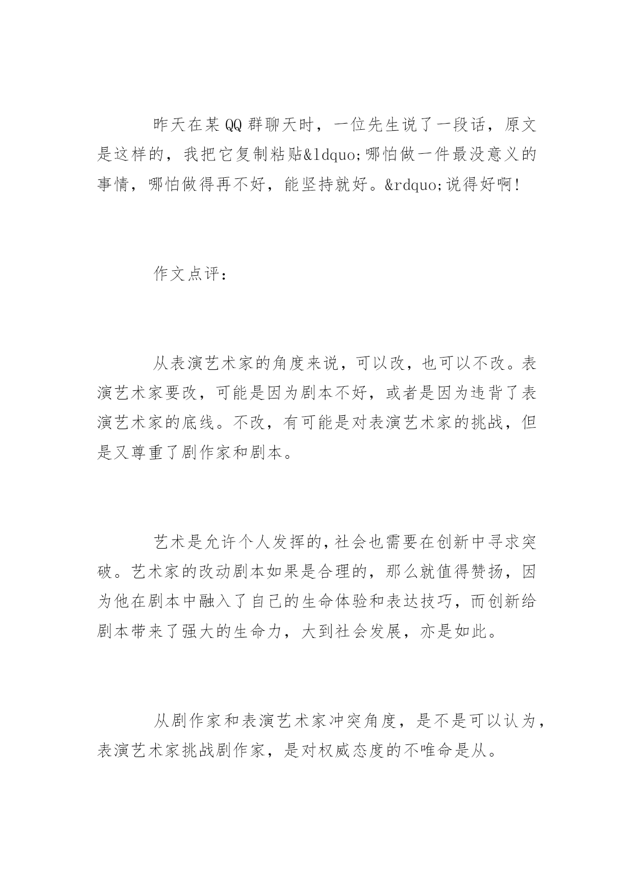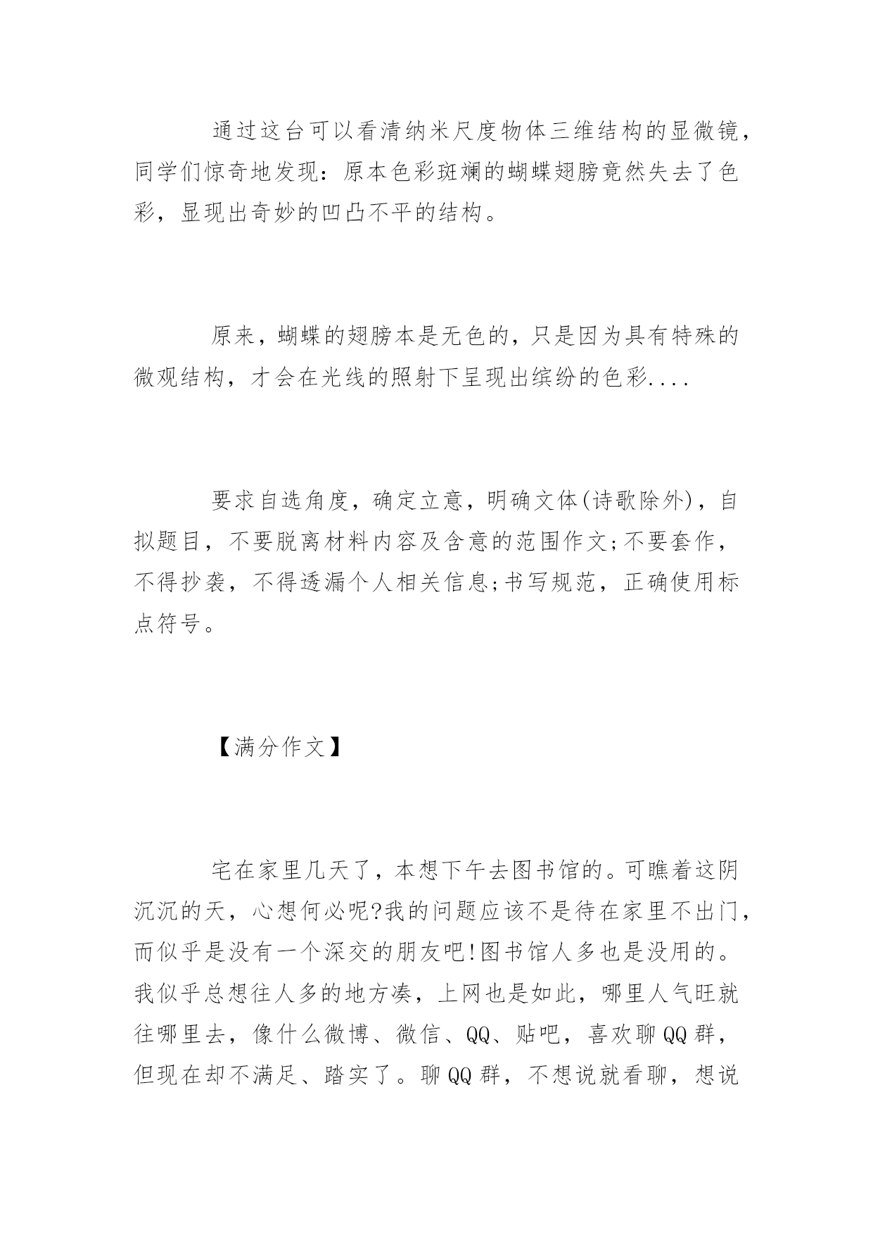 安徽省高考作文真题解析及点评现在总说互联网+,可以说互联网创造了宅生活。比如这博客,就是互联网的产物,是自媒体。下面是小编整理的安徽高考满分作文及点评,希望对大家有帮助!【作文题目】阅读下面的材料,根据要求写一篇不少于800字的文章。(60分)为了丰富中小学生的课余生活,让同学们领略科技的魅力,过一把尖端科技的瘾,中科院某研究所推出了公众开放日系列科普活动。活动期间,科研人员特地设计了一个有趣的实验,让同学们亲手操作扫描式电子显微镜,观察蝴蝶的翅膀。通过这台可以看清纳米尺度物体三维结构的显微镜,同学们惊奇地发现:原本色彩斑斓的蝴蝶翅膀竟然失去了色彩,显现出奇妙的凹凸不平的结构。原来,蝴蝶的翅膀本是无色的,只是因为具有特殊的微观结构,才会在光线的照射下呈现出缤纷的色彩....要求自选角度,确定立意,明确文体(诗歌除外),自拟题目,不要脱离材料内容及含意的范围作文;不要套作,不得抄袭,不得透漏个人相关信息;书写规范,正确使用标点符号。【满分作文】宅在家里几天了,本想下午去图书馆的。可瞧着这阴沉沉的天,心想何必呢?我的问题应该不是待在家里不出门,而似乎是没有一个深交的朋友吧!图书馆人多也是没用的。我似乎总想往人多的地方凑,上网也是如此,哪里人气旺就往哪里去,像什么微博、微信、QQ、贴吧,喜欢聊QQ群,但现在却不满足、踏实了。聊QQ群,不想说就看聊,想说了就说一句,没人聊就只有不说话了,哪能想聊就聊?聊的时候,也就是插科打诨,调口味。有个茶叶店主建的微信群里,有个大学教授(我叫他教授他没否认),没聊多久就向我卖起了茶壶。可我的问题又是因为没有深交的朋友吗?又到哪里去找深交的朋友呢?大学同学都在微信群里,每天或者早上,或者晚上,有时候就没有,群主读报,若干则经济新闻后,一段“心灵闪点”,鼓舞群友人心,抚慰同学心灵。读完报后的就是几个表情,有时候是搞笑视频,或者分享的。仅此而已,我每天就是去发个表情签到。也许我的问题是没有一件坚持做下去的事情。我坚持阅读有5年了,也许这还不够,也许博客要坚持写下去。想到这里,我在床上躺不下去了。吃过午饭,我要小憩一会。有时候却睡了两个小时。今天躺了不到半小时,我爬了起来,图书馆也不去了,打开电脑写博客。现在总说互联网+,可以说互联网创造了宅生活。比如这博客,就是互联网的产物,是自媒体。我在想我宅在家里都干些什么?除了看书、看电视,就是上网了。上网除了聊天就是看新闻,发帖回帖,分享。我曾经想,我要放弃宅生活,可我想到能去的地方就只剩下图书馆了,于是有些日子早上吃过早饭,我带着纸笔,还有一杯茶,泡在图书馆。明天是周一,新的一周又开始了,对我来说,也是如此。那么明天我该干点什么呢?上午、下午、晚上,分为三个时段,看书占去一个时段,如果泡图书馆再占去一个时段,那还有一个时段可以让我泡在网上。泡图书馆也是看书,是不是可以干点别的?我有时候为这为那感到纠结。现在我想我该干的事应该是阅读、写作、社交。今天写了博客,明天恐怕还得来看看。而我又想和网友聊聊天,再加上看书的时间,明天竟不用出门了!如果有时间而且天气允许的话,出门也该散散步,身体健康也重要。那么,人的一生什么最重要?是他的社会关系吗?现在喝的茶是白茶,可不是安吉白茶,而是福鼎白茶。安吉白茶其实是绿茶,福鼎白茶才是真正的白茶。平常看湖南茶频道,在茶市扫描中看到,福鼎白茶价最高,我暂时也不会买来喝。这茶也是看茶频道节目蹭来的。就像节目中所说的那样,不蹭茶非茶人,我就当一回茶人。白茶喝起来微香柔和、不苦不涩。天空亮堂了许多,对考生来说是好事。今天是今年高考第一天,没有雨水的侵扰,考试就会更顺利些吧!至于说气温嘛,就不能对我们这一代人抱怨了,我们那时可是7月考试,正是骄阳似火、热气蒸腾的时候。想想真是岁月如梭、光阴似箭啊!昨天在某QQ群聊天时,一位先生说了一段话,原文是这样的,我把它复制粘贴“哪怕做一件最没意义的事情,哪怕做得再不好,能坚持就好。”说得好啊!作文点评:从表演艺术家的角度来说,可以改,也可以不改。表演艺术家要改,可能是因为剧本不好,或者是因为违背了表演艺术家的底线。不改,有可能是对表演艺术家的挑战,但是又尊重了剧作家和剧本。艺术是允许个人发挥的,社会也需要在创新中寻求突破。艺术家的改动剧本如果是合理的,那么就值得赞扬,因为他在剧本中融入了自己的生命体验和表达技巧,而创新给剧本带来了强大的生命力,大到社会发展,亦是如此。从剧作家和表演艺术家冲突角度,是不是可以认为,表演艺术家挑战剧作家,是对权威态度的不唯命是从。