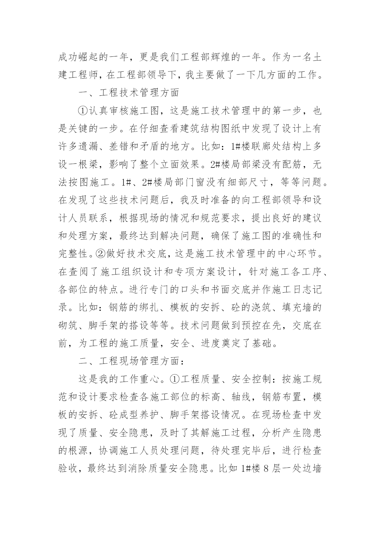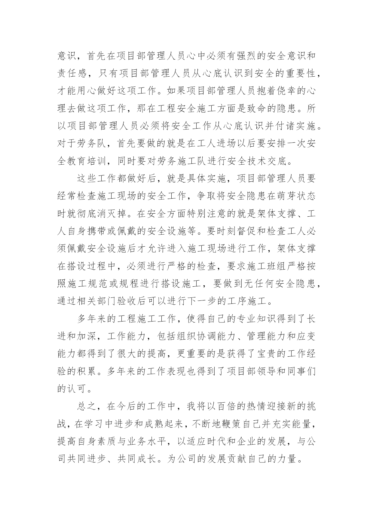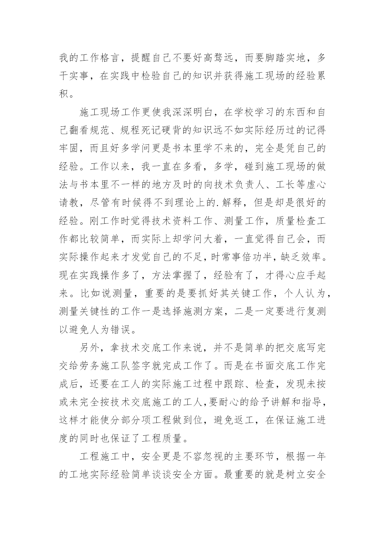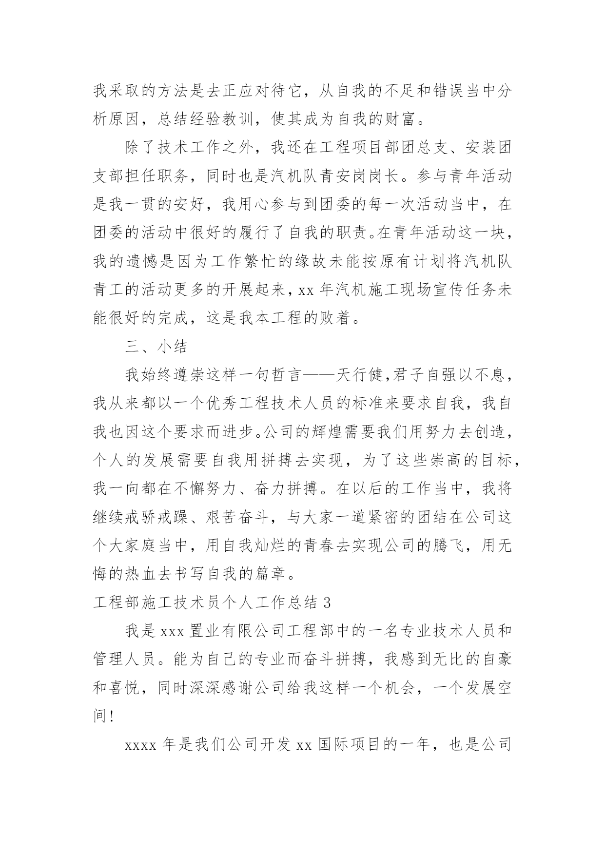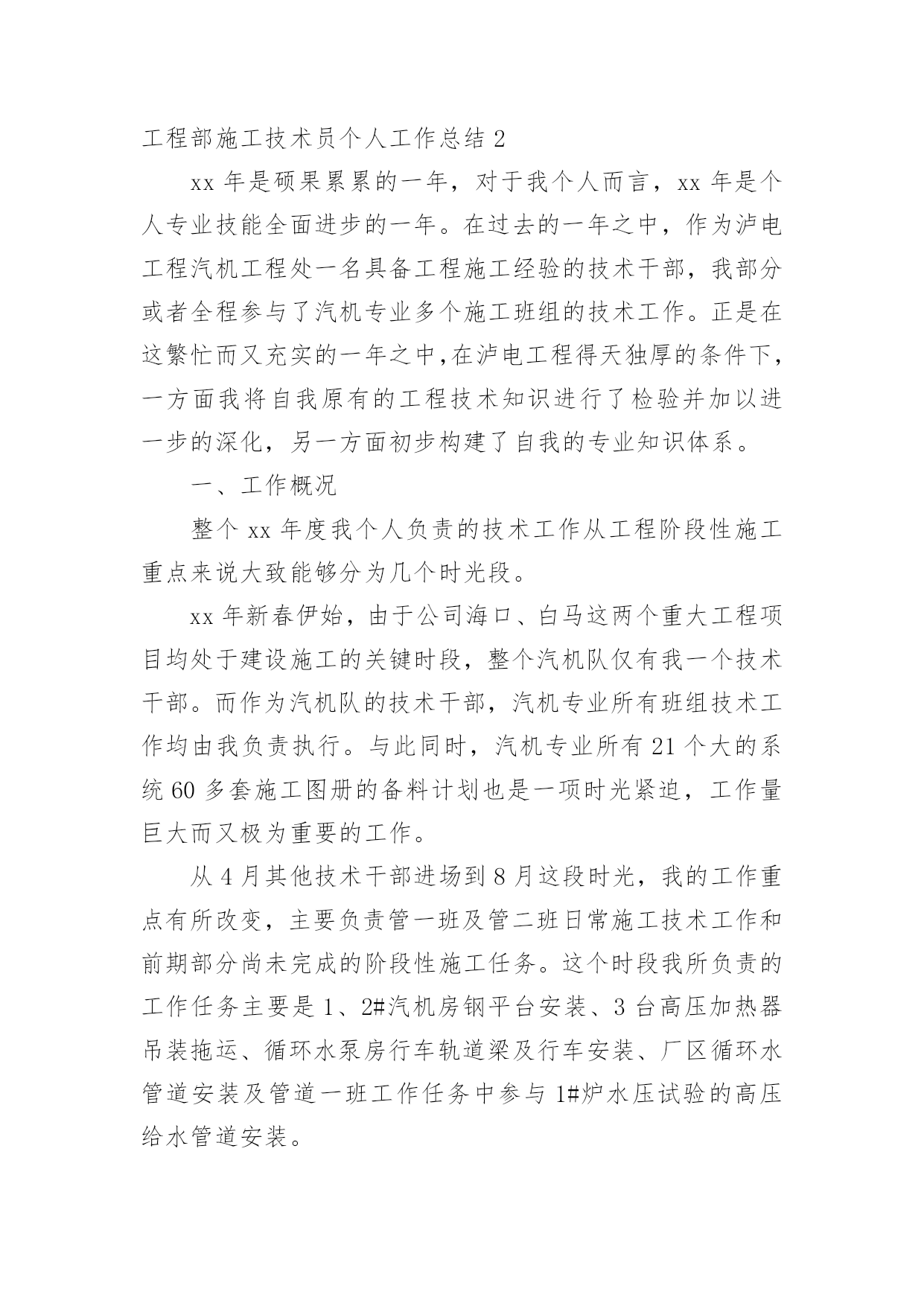 工程部施工技术员个人工作总结工程部施工技术员个人工作总结3篇总结是事后对某一阶段的学习、工作或其完成情况加以回顾和分析的一种书面材料,它可以明确下一步的工作方向,少走弯路,少犯错误,提高工作效益,不如我们来制定一份总结吧。总结你想好怎么写了吗?以下是小编帮大家整理的工程部施工技术员个人工作总结,仅供参考,大家一起来看看吧。工程部施工技术员个人工作总结1参加工作已多年了,根据自身工作的实际情况,我对自己的工作做出分析评定,总结经验教训,提出改进方法,以便自己在今后的工作中扬长避短,为今后不断改进工作方法,提高工作效率提供依据,下面就本人的工作总结如下:作为一名技术人员,我将工作定位为协助好技术负责人的工作和不断的自我学习充实,在参与建设的工程中,在完成工程的施工测量放线的同时,还协助技术负责人编制施工方案、技术交底,并负责工程技术资料的指导与编制,和施工员一起进行现场质量检查,以及协助安全员落实、督促、检查施工现场安全工作。在工程施工过程中,我一直以积极的心态认真地对待自己的工作,在从事的各项工作中,都能尽职尽责,以求圆满的完成工作任务。“不要急于出成绩,埋下头来干工作”,是我的工作格言,提醒自己不要好高骛远,而要脚踏实地,多干实事,在实践中检验自己的知识并获得施工现场的经验累积。施工现场工作更使我深深明白,在学校学习的东西和自己翻看规范、规程死记硬背的知识远不如实际经历过的记得牢固,而且好多学问更是书本里学不来的,完全是凭自己的经验。工作以来,我一直在多看,多学,碰到施工现场的做法与书本里不一样的地方及时的向技术负责人、工长等虚心请教,尽管有时候得不到理论上的.解释,但是却是很好的经验。刚工作时觉得技术资料工作、测量工作,质量检查工作都比较简单,而实际上却学问大着,一直觉得自己会,而实际操作起来才发觉自己的不足,时常事倍功半,缺乏效率。现在实践操作多了,方法掌握了,经验有了,才得心应手起来。比如说测量,重要的是要抓好其关键工作,个人认为,测量关键性的工作一是选择施测方案,二是一定要进行复测以避免人为错误。另外,拿技术交底工作来说,并不是简单的把交底写完交给劳务施工队签字就完成工作了。而是在书面交底工作完成后,还要在工人的实际施工过程中跟踪、检查,发现未按或未完全按技术交底施工的工人,要耐心的给予讲解和指导,这样才能使分部分项工程做到位,避免返工,在保证施工进度的同时也保证了工程质量。工程施工中,安全更是不容忽视的主要环节,根据一年的工地实际经验简单谈谈安全方面。最重要的就是树立安全意识,首先在项目部管理人员心中必须有强烈的安全意识和责任感,只有项目部管理人员从心底认识到安全的重要性,才能用心做好这项工作。如果项目部管理人员抱着侥幸的心理去做这项工作,那在工程安全施工方面是致命的隐患。所以项目部管理人员必须将安全工作从心底认识并付诸实施。对于劳务队,首先要做的就是在工人进场以后要安排一次安全教育培训,同时要对劳务施工队进行安全技术交底。这些工作都做好后,就是具体实施,项目部管理人员要经常检查施工现场的安全工作,争取将安全隐患在萌芽状态时就彻底消灭掉。在安全方面特别注意的就是架体支撑、工人自身携带或佩戴的安全设施等。要时刻督促和检查工人必须佩戴安全设施后才允许进入施工现场进行工作,架体支撑在搭设过程中,必须进行严格的检查,要求施工班组严格按照施工规范或规程进行搭设施工,要做到无任何安全隐患,通过相关部门验收后可以进行下一步的工序施工。多年来的工程施工工作,使得自己的专业知识得到了长进和加深,工作能力,包括组织协调能力、管理能力和应变能力都得到了很大的提高,更重要的是获得了宝贵的工作经验的积累。多年来的工作表现也得到了项目部领导和同事们的认可。总之,在今后的工作中,我将以百倍的热情迎接新的挑战,在学习中进步和成熟起来,不断地鞭策自己并充实能量,提高自身素质与业务水平,以适应时代和企业的发展,与公司共同进步、共同成长。为公司的发展贡献自己的力量。工程部施工技术员个人工作总结2xx年是硕果累累的一年,对于我个人而言,xx年是个人专业技能全面进步的一年。在过去的一年之中,作为泸电工程汽机工程处一名具备工程施工经验的技术干部,我部分或者全程参与了汽机专业多个施工班组的技术工作。正是在这繁忙而又充实的一年之中,在泸电工程得天独厚的条件下,一方面我将自我原有的工程技术知识进行了检验并加以进一步的深化,另一方面初步构建了自我的专业知识体系。一、工作概况整个xx年度我个人负责的技术工作从工程阶段性施工重点来说大致能够分为几个时光段。xx年新春伊始,由于公司海口、白马这两个重大工程项目均处于建设施工的关键时段,整个汽机队仅有我一个技术干部。而作为汽机队的技术干部,汽机专业所有班组技术工作均由我负责执行。与此同时,汽机专业所有21个大的系统60多套