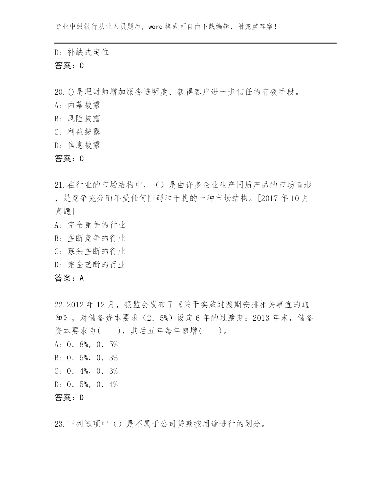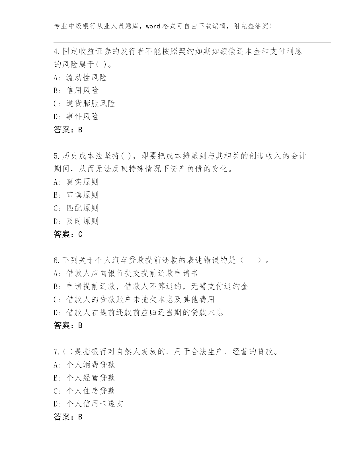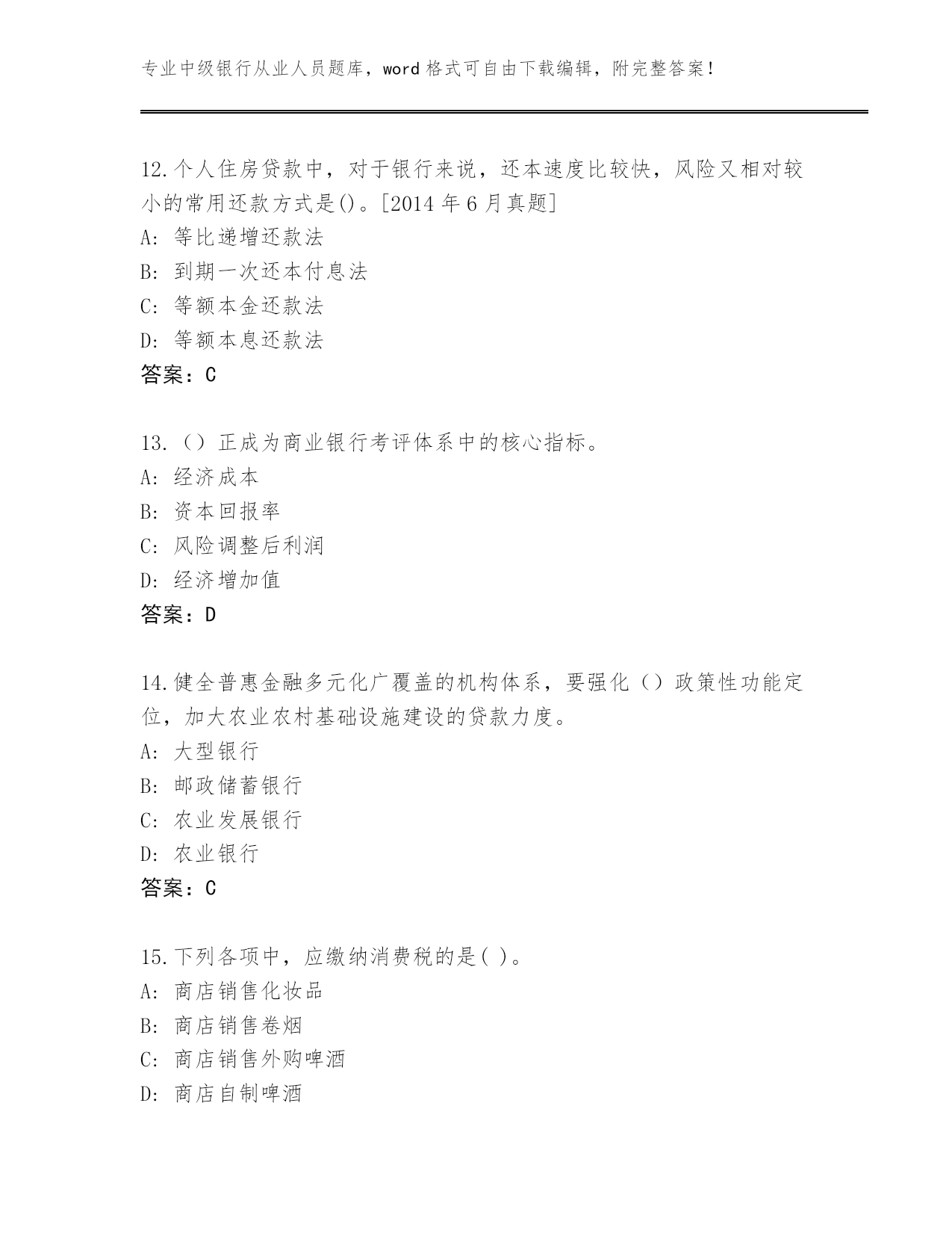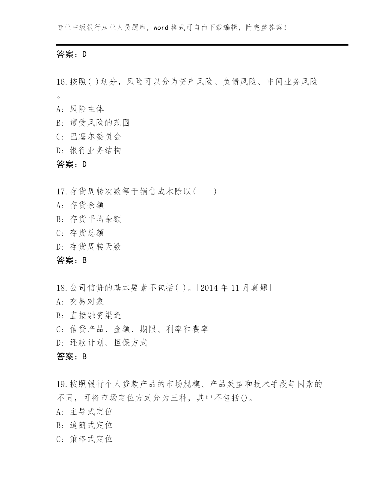 专业中级银行从业人员题库,word格式可自由下载编辑,附完整答案!四川省成华区内部使用中级银行从业人员真题及答案(真题汇编)第I部分单选题(100题)1.交易账户头寸高于表内外资产总额的____或者超过____亿元人民币的商业银行必须计提市场风险资本。()A:8%;85B:10%;100C:10%;85D:8%;100答案:C2.()是指银行为单位客户和个人客户采用票据、汇款、托收、信用证、信用卡等结算方式进行货币支付及资金清算提供的服务。A:托管B:支付结算业务C:理财业务D:咨询顾问答案:B3.当企业经营周转资金出现缺口,可以申请的贷款是()。A:房地产贷款B:固定资产贷款C:流动资金贷款D:项目贷款答案:C4.固定收益证券的发行者不能按照契约如期如额偿还本金和支付利息的风险属于()。A:流动性风险B:信用风险C:通货膨胀风险D:事件风险答案:B5.历史成本法坚持(),即要把成本摊派到与其相关的创造收入的会计期间,从而无法反映特殊情况下资产负债的变化。A:真实原则B:审慎原则C:匹配原则D:及时原则答案:C6.下列关于个人汽车贷款提前还款的表述错误的是()。A:借款人应向银行提交提前还款申请书B:申请提前还款,借款人不算违约,无需支付违约金C:借款人的贷款账户未拖欠本息及其他费用D:借款人在提前还款前应归还当期的贷款本息答案:B7.()是指银行对自然人发放的、用于合法生产、经营的贷款。A:个人消费贷款B:个人经营贷款C:个人住房贷款D:个人信用卡透支答案:B8.按照产品用途的不同,个人贷款产品包括()。A:个人信用贷款E个人经营类贷款B:个人质押贷款C:个人消费类贷款D:个人保证贷款答案:C9.关于可保利益的构成要件,下列说法不正确的是()。A:可保利益应为合法的利益B:可保利益应为所有的利益C:可保利益应为客观的确定的利益D:可保利益应为经济上的利益答案:B10.遗嘱继承人的范围是()。A:公民、法人、国家或其他组织B:与法定继承人的范围不同C:公民或法人D:与法定继承人的范围相同答案:D11.()是财务公司资产业务的一部分,是财务公司主业的延伸和派生。包括有价证券投资和金融机构股权投资两大类业务。A:财务公司投资业务B:财务公司同业拆出C:买入返售D:成员单位产品的融资租赁业务答案:A12.个人住房贷款中,对于银行来说,还本速度比较快,风险又相对较小的常用还款方式是()。[2014年6月真题]A:等比递增还款法B:到期一次还本付息法C:等额本金还款法D:等额本息还款法答案:C13.()正成为商业银行考评体系中的核心指标。A:经济成本B:资本回报率C:风险调整后利润D:经济增加值答案:D14.健全普惠金融多元化广覆盖的机构体系,要强化()政策性功能定位,加大农业农村基础设施建设的贷款力度。A:大型银行B:邮政储蓄银行C:农业发展银行D:农业银行答案:C15.下列各项中,应缴纳消费税的是()。A:商店销售化妆品B:商店销售卷烟C:商店销售外购啤酒D:商店自制啤酒答案:D16.按照()划分,风险可以分为资产风险、负债风险、中间业务风险。A:风险主体B:遭受风险的范围C:巴塞尔委员会D:银行业务结构答案:D17.存货周转次数等于销售成本除以()A:存货余额B:存货平均余额C:存货总额D:存货周转天数答案:B18.公司信贷的基本要素不包括()。[2014年11月真题]A:交易对象B:直接融资渠道C:信贷产品、金额、期限、利率和费率D:还款计划、担保方式答案:B19.按照银行个人贷款产品的市场规模、产品类型和技术手段等因素的不同,可将市场定位方式分为三种,其中不包括()。A:主导式定位B:追随式定位C:策略式定位D:补缺式定位答案:C20.()是理财师增加服务透明度、获得客户进一步信任的有效手段。A:内幕披露B:风险披露C:利益披露D:信息披露答案:C21.在行业的市场结构中,()是由许多企业生产同质产品的市场情形,是竞争充分而不受任何阻碍和干扰的一种市场结构。[2017年10月真题]A:完全竞争的行业B:垄断竞争的行业C:寡头垄断的行业D:完全垄断的行业答案:A22.2012年12月,银监会发布了《关于实施过渡期安排相关事宜的通知》,对储备资本要求(2.5%)设定6年的过渡期:2013年末,储备资本要求为(),其后五年每年递增()。A:0.8%,0.5%B:0.5%,0.3%C:0.4%,0.3%D:0.5%,0.