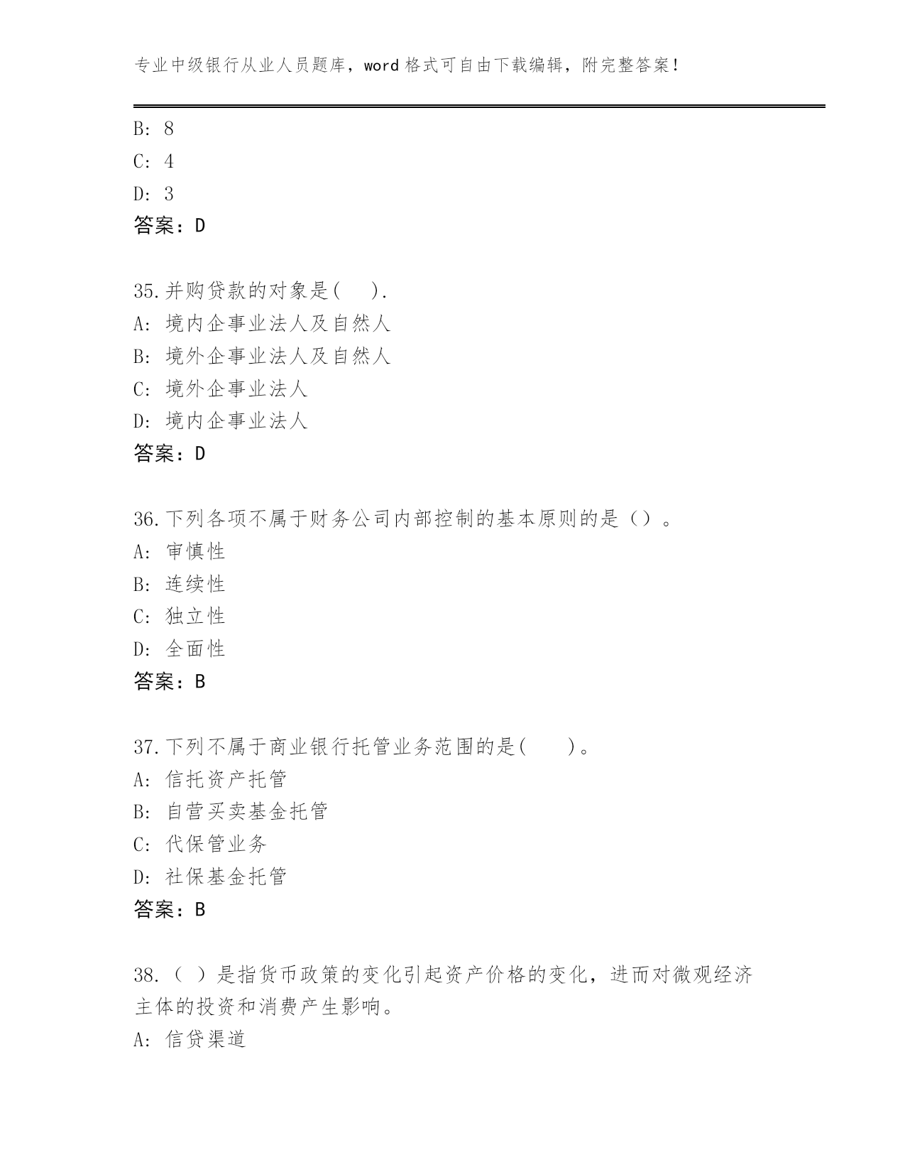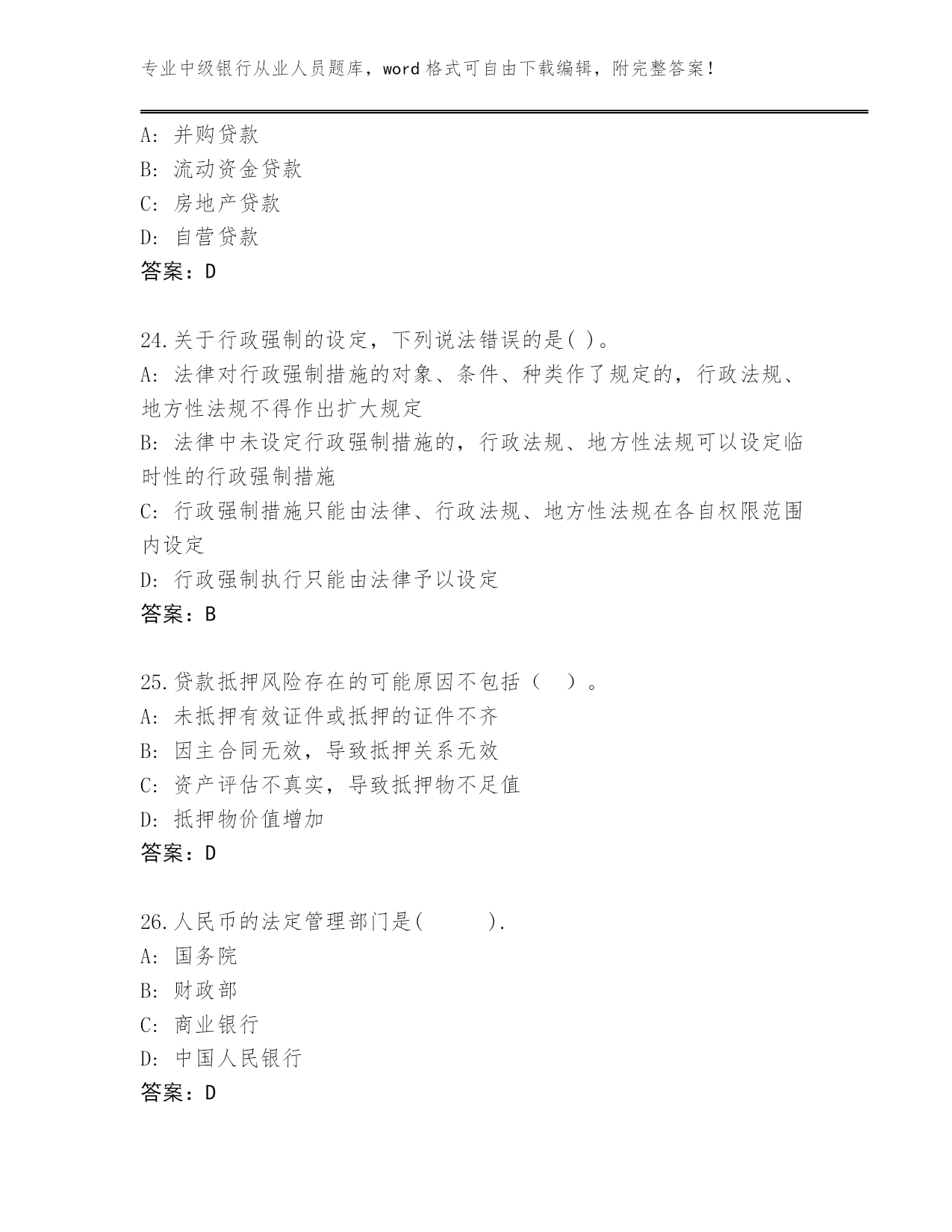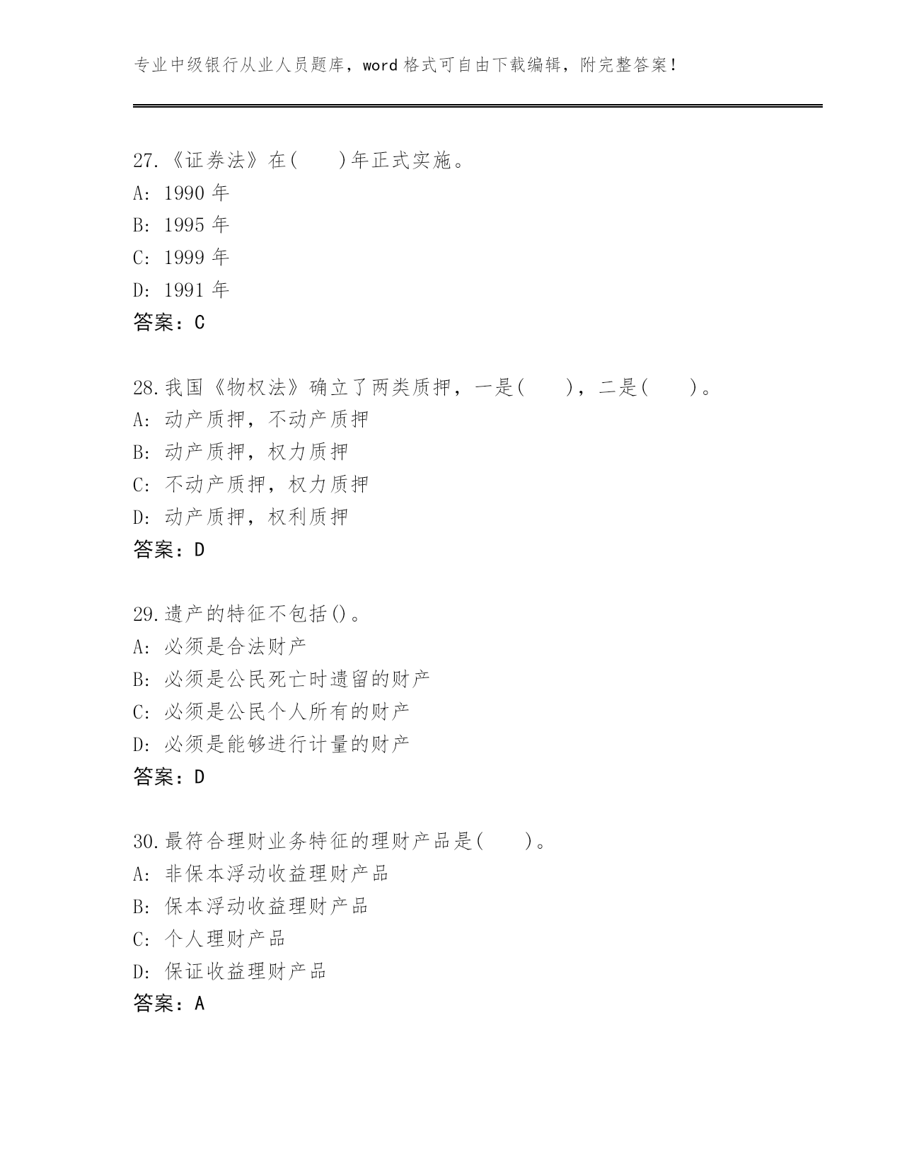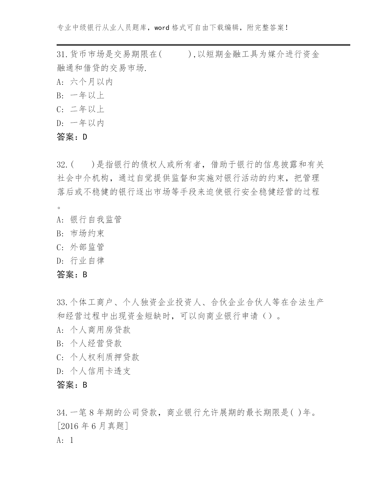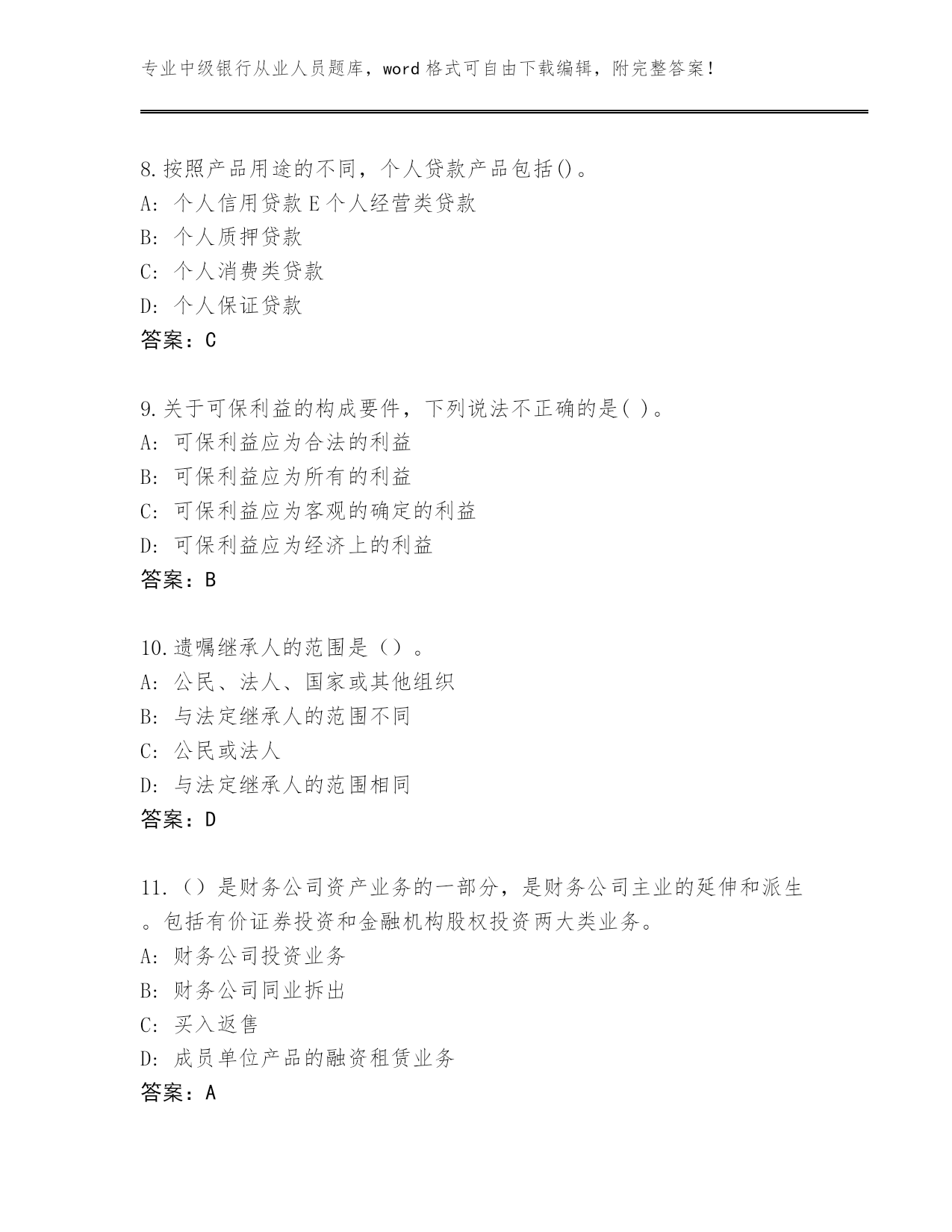 专业中级银行从业人员题库,word格式可自由下载编辑,附完整答案!四川省成华区内部使用中级银行从业人员真题及答案(真题汇编)第I部分单选题(100题)1.交易账户头寸高于表内外资产总额的____或者超过____亿元人民币的商业银行必须计提市场风险资本。()A:8%;85B:10%;100C:10%;85D:8%;100答案:C2.()是指银行为单位客户和个人客户采用票据、汇款、托收、信用证、信用卡等结算方式进行货币支付及资金清算提供的服务。A:托管B:支付结算业务C:理财业务D:咨询顾问答案:B3.当企业经营周转资金出现缺口,可以申请的贷款是()。A:房地产贷款B:固定资产贷款C:流动资金贷款D:项目贷款答案:C4.固定收益证券的发行者不能按照契约如期如额偿还本金和支付利息的风险属于()。A:流动性风险B:信用风险C:通货膨胀风险D:事件风险答案:B5.历史成本法坚持(),即要把成本摊派到与其相关的创造收入的会计期间,从而无法反映特殊情况下资产负债的变化。A:真实原则B:审慎原则C:匹配原则D:及时原则答案:C6.下列关于个人汽车贷款提前还款的表述错误的是()。A:借款人应向银行提交提前还款申请书B:申请提前还款,借款人不算违约,无需支付违约金C:借款人的贷款账户未拖欠本息及其他费用D:借款人在提前还款前应归还当期的贷款本息答案:B7.()是指银行对自然人发放的、用于合法生产、经营的贷款。A:个人消费贷款B:个人经营贷款C:个人住房贷款D:个人信用卡透支答案:B8.按照产品用途的不同,个人贷款产品包括()。A:个人信用贷款E个人经营类贷款B:个人质押贷款C:个人消费类贷款D:个人保证贷款答案:C9.关于可保利益的构成要件,下列说法不正确的是()。A:可保利益应为合法的利益B:可保利益应为所有的利益C:可保利益应为客观的确定的利益D:可保利益应为经济上的利益答案:B10.遗嘱继承人的范围是()。A:公民、法人、国家或其他组织B:与法定继承人的范围不同C:公民或法人D:与法定继承人的范围相同答案:D11.()是财务公司资产业务的一部分,是财务公司主业的延伸和派生。包括有价证券投资和金融机构股权投资两大类业务。A:财务公司投资业务B:财务公司同业拆出C:买入返售D:成员单位产品的融资租赁业务答案:A12.个人住房贷款中,对于银行来说,还本速度比较快,风险又相对较小的常用还款方式是()。[2014年6月真题]A:等比递增还款法B:到期一次还本付息法C:等额本金还款法D:等额本息还款法答案:C13.()正成为商业银行考评体系中的核心指标。A:经济成本B:资本回报率C:风险调整后利润D:经济增加值答案:D14.健全普惠金融多元化广覆盖的机构体系,要强化()政策性功能定位,加大农业农村基础设施建设的贷款力度。A:大型银行B:邮政储蓄银行C:农业发展银行D:农业银行答案:C15.下列各项中,应缴纳消费税的是()。A:商店销售化妆品B:商店销售卷烟C:商店销售外购啤酒D:商店自制啤酒答案:D16.按照()划分,风险可以分为资产风险、负债风险、中间业务风险。A:风险主体B:遭受风险的范围C:巴塞尔委员会D:银行业务结构答案:D17.存货周转次数等于销售成本除以()A:存货余额B:存货平均余额C:存货总额D:存货周转天数答案:B18.公司信贷的基本要素不包括()。[2014年11月真题]A:交易对象B:直接融资渠道C:信贷产品、金额、期限、利率和费率D:还款计划、担保方式答案:B19.按照银行个人贷款产品的市场规模、产品类型和技术手段等因素的不同,可将市场定位方式分为三种,其中不包括()。A:主导式定位B:追随式定位C:策略式定位D:补缺式定位答案:C20.()是理财师增加服务透明度、获得客户进一步信任的有效手段。A:内幕披露B:风险披露C:利益披露D:信息披露答案:C21.在行业的市场结构中,()是由许多企业生产同质产品的市场情形,是竞争充分而不受任何阻碍和干扰的一种市场结构。[2017年10月真题]A:完全竞争的行业B:垄断竞争的行业C:寡头垄断的行业D:完全垄断的行业答案:A22.2012年12月,银监会发布了《关于实施过渡期安排相关事宜的通知》,对储备资本要求(2.5%)设定6年的过渡期:2013年末,储备资本要求为(),其后五年每年递增()。A:0.8%,0.5%B:0.5%,0.3%C:0.4%,0.3%D:0.5%,0.