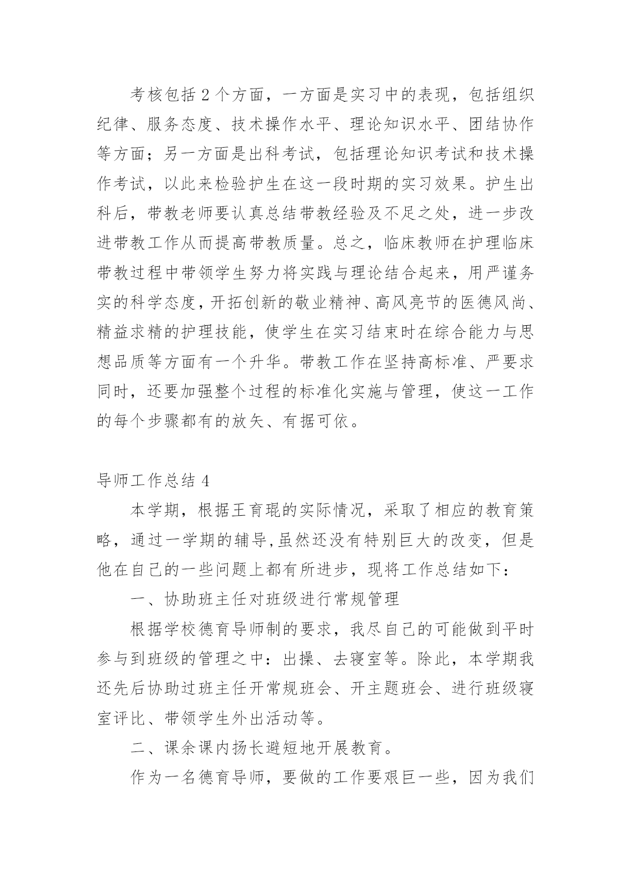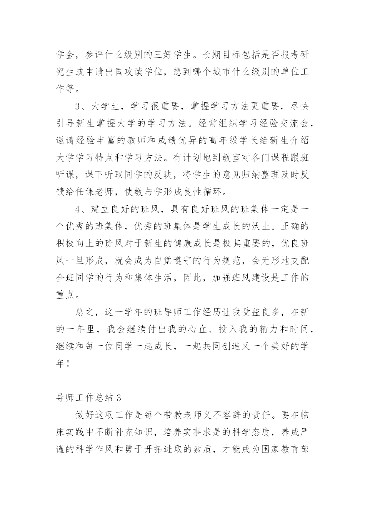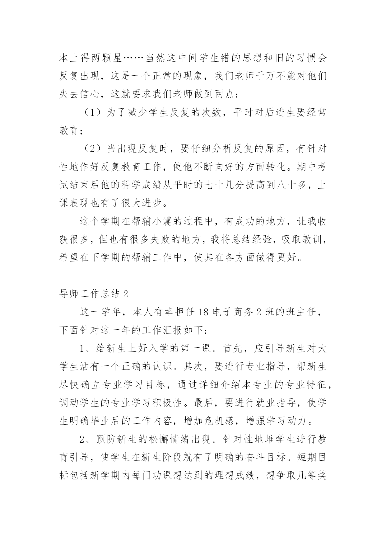 导师工作总结总结是对取得的成绩、存在的问题及得到的经验和教训等方面情况进行评价与描述的一种书面材料,它可以明确下一步的工作方向,少走弯路,少犯错误,提高工作效益,让我们来为自己写一份总结吧。我们该怎么去写总结呢?以下是小编帮大家整理的导师工作总结,希望能够帮助到大家。导师工作总结1本学期我继续参于我校的德育导师工作,时间飞快,一个学期即将接近尾声,在这个学期中我帮辅的对象是我们六(6)班的小震。经过一个学期的努力和深入工作,无论在学习还是纪律方面,他都有了较大的进步,为了下学期能更好的做好德育导师工作,我对这学期的工作做如下总结。—、了解学生,关心学生在一次与英语老师的聊天中,我发现小震的英语学习成绩相对较差,因为他是一个很懒的学生,懒得做作业,懒得学习。因为是副班主任,我接触学生也比较多,无论是平常下课,还是在我的科学课堂上,我发现他是一个聪明,开朗的学生,有自己的观点,会举手发言,科学成绩在中等水平。相对而言,语文,英语方面成绩差了一点,因为太懒惰了,不肯花功夫。那么,整体而言,他在学习上他还有很大的进步空间,选择他,本着教育为主,更好发展的想法,希望他有所进步。本学期学校安排了家长会活动,正好借这个机会对这个孩子的家庭有更进一步地了解。要开家长会的前一天,我跟小震说,要跟他的家长好好聊一聊。他有些惊讶:老师会不会向我爸妈告状啊!于是立马上课就端正起来了。看来家长的作用还是很大的。通过聊天我了解到:孩子父母平时工作很忙,但是对于孩子的学习,家长还是很重视的。为了培养孩子及时做作业的好习惯,需要家长与老师的共同努力。只要有空,他做作业时,他爸爸就在旁边督促,只有完成后才能看会电视。二、发现闪光点,及时表扬心理学家威廉。詹姆斯有句名言:“人性最深刻的原则就是希望别人对自己加以赏识”。作为科学任课老师,在平时生活中我细心地观察,捕捉其身上的闪光点,及时地肯定表扬,即使是小小的进步,也要及时鼓励,以此激发孩子的内驱力。小震比较懒,懒得学习。之前与他一起坐的是小辉,也是一个懒洋洋的孩子。两人上课的状态有点类似,没有兴趣时,精神不佳,经常走神。或者是有了好玩的玩具,就自己一个人在那摆弄,完全没有进入课堂。有时候让他回答问题,提醒他一下,但是总体还是如此。这次换了座位,跟小强一起坐。小强是一个蛮有威信的孩子,很会管人,有了他的提醒,小震上课倒变得精神起来了。有一次,我上课提问:一根塑料绳有哪几种重新使用的方法?对于这样生活化的问题,他就特别有灵感,爱举手发言。叫了三次后,我就当着全班学生的面表扬他是一个爱动脑筋,爱发言的好学生。那一刻我发现他第一次坐得这么端正。接下来的一段时间,他在学习上变得主动了,以前常常因为玩而忘了写作业,现在他常会来主动告诉老师他已经写完作业了,一下课就把作业本上交了,我也常会用“做得真好”来继续鼓励他。可见,一味地批评,只会让孩子越来越反感,不乐意接受,不如利用孩子身上的闪光点,好好表扬一番,让其感受到表扬带来的喜悦,让孩子更有信心改掉身上的其他坏习惯和不良行为,如果能得到全班孩子和家长的肯定与鼓励,我想会取得更好的效果。三、耐心,坚持,反复抓良好的学习习惯的养成,不是一朝一夕的,这是一个循序渐进的过程,要一步步来,不能操之过急。而且如果对他提出过高的要求,反而会让他的自尊心再一次受到打击,到时候老师再想进行帮助就真的是难上加难了。所以作为老师,要有足够的耐心,根据他自身的特点,在不同的阶段,提出不同的要求,使他们“跳一跳,摸得着”,经过努力能逐步达到,一步一个脚印地前进,慢慢恢复他们的自信心。我经常跟他说,我觉得你是个很聪明的学生,很会动脑筋,上次的用纸做一座桥做得特别棒,特别有想法。对于你特别喜欢的事情你很热爱做,而且能够做得很好。那么其它的时候呢,能不能也参与进去,跟着老师的思路,动脑筋,一起讨论。谈心,然后提出一些要求。第一个要求:上课不要玩玩具,第二个要求:举手发言二次,第三个要求:做作本上得两颗星……当然这中间学生错的思想和旧的习惯会反复出现,这是一个正常的现象,我们老师千万不能对他们失去信心,这就要求我们老师做到两点:(1)为了减少学生反复的次数,平时对后进生要经常教育;(2)当出现反复时,要仔细分析反复的原因,有针对性地作好反复教育工作,使他不断向好的方面转化。期中考试结束后他的科学成绩从平时的七十几分提高到八十多,上课表现也有了很大进步。这个学期在帮辅小震的过程中,有成功的地方,让我收获很多,但也有很多失败的地方,我将总结经验,吸取教训,希望在下学期的帮辅工作中,使其在各方面做得更好。导师工作总结2这一学年,本人有幸担任18电子商务2班的班主任,下面针对这一年的工作汇报如下:1、给新生上好入学的第一课。首先,应引导新生对大学生活有一个正确的认识。其次,要进行专业指导,帮新生尽快确立专业学习