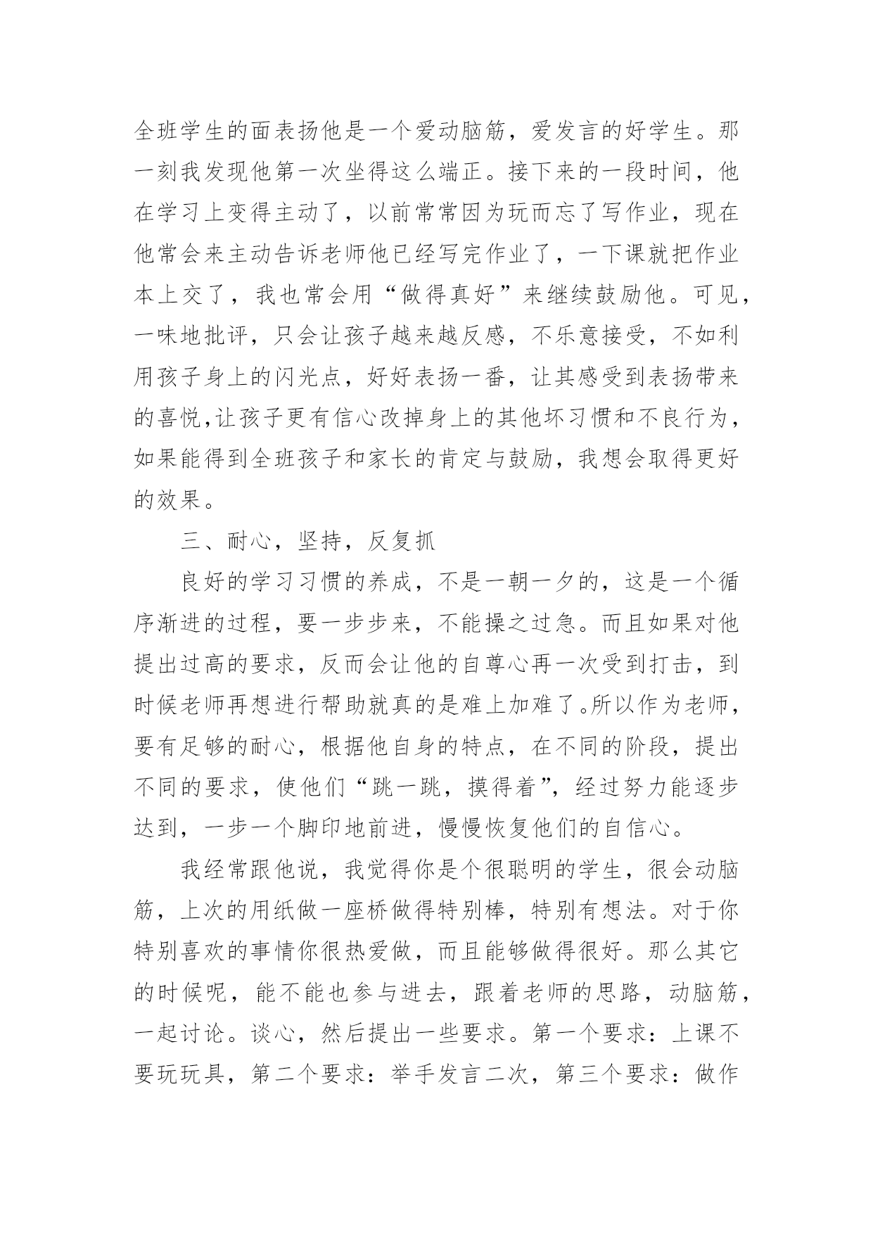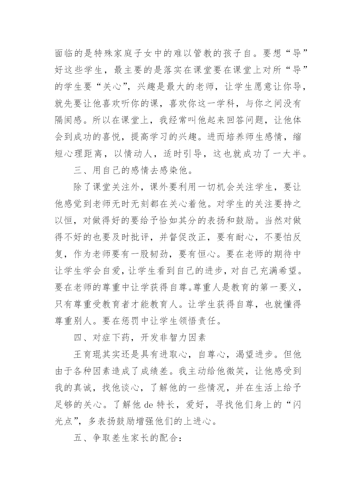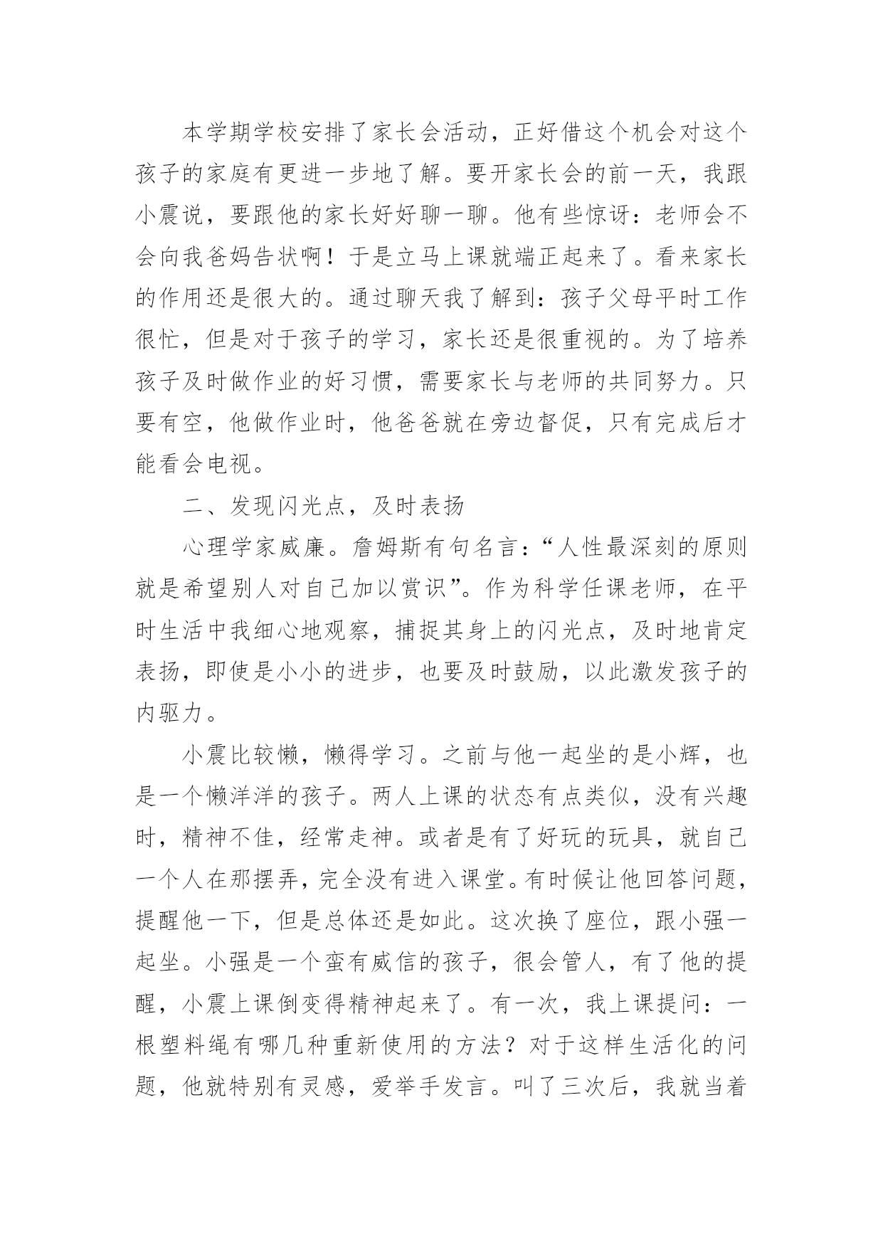 导师工作总结总结是对取得的成绩、存在的问题及得到的经验和教训等方面情况进行评价与描述的一种书面材料,它可以明确下一步的工作方向,少走弯路,少犯错误,提高工作效益,让我们来为自己写一份总结吧。我们该怎么去写总结呢?以下是小编帮大家整理的导师工作总结,希望能够帮助到大家。导师工作总结1本学期我继续参于我校的德育导师工作,时间飞快,一个学期即将接近尾声,在这个学期中我帮辅的对象是我们六(6)班的小震。经过一个学期的努力和深入工作,无论在学习还是纪律方面,他都有了较大的进步,为了下学期能更好的做好德育导师工作,我对这学期的工作做如下总结。—、了解学生,关心学生在一次与英语老师的聊天中,我发现小震的英语学习成绩相对较差,因为他是一个很懒的学生,懒得做作业,懒得学习。因为是副班主任,我接触学生也比较多,无论是平常下课,还是在我的科学课堂上,我发现他是一个聪明,开朗的学生,有自己的观点,会举手发言,科学成绩在中等水平。相对而言,语文,英语方面成绩差了一点,因为太懒惰了,不肯花功夫。那么,整体而言,他在学习上他还有很大的进步空间,选择他,本着教育为主,更好发展的想法,希望他有所进步。本学期学校安排了家长会活动,正好借这个机会对这个孩子的家庭有更进一步地了解。要开家长会的前一天,我跟小震说,要跟他的家长好好聊一聊。他有些惊讶:老师会不会向我爸妈告状啊!于是立马上课就端正起来了。看来家长的作用还是很大的。通过聊天我了解到:孩子父母平时工作很忙,但是对于孩子的学习,家长还是很重视的。为了培养孩子及时做作业的好习惯,需要家长与老师的共同努力。只要有空,他做作业时,他爸爸就在旁边督促,只有完成后才能看会电视。二、发现闪光点,及时表扬心理学家威廉。詹姆斯有句名言:“人性最深刻的原则就是希望别人对自己加以赏识”。作为科学任课老师,在平时生活中我细心地观察,捕捉其身上的闪光点,及时地肯定表扬,即使是小小的进步,也要及时鼓励,以此激发孩子的内驱力。小震比较懒,懒得学习。之前与他一起坐的是小辉,也是一个懒洋洋的孩子。两人上课的状态有点类似,没有兴趣时,精神不佳,经常走神。或者是有了好玩的玩具,就自己一个人在那摆弄,完全没有进入课堂。有时候让他回答问题,提醒他一下,但是总体还是如此。这次换了座位,跟小强一起坐。小强是一个蛮有威信的孩子,很会管人,有了他的提醒,小震上课倒变得精神起来了。有一次,我上课提问:一根塑料绳有哪几种重新使用的方法?对于这样生活化的问题,他就特别有灵感,爱举手发言。叫了三次后,我就当着全班学生的面表扬他是一个爱动脑筋,爱发言的好学生。那一刻我发现他第一次坐得这么端正。接下来的一段时间,他在学习上变得主动了,以前常常因为玩而忘了写作业,现在他常会来主动告诉老师他已经写完作业了,一下课就把作业本上交了,我也常会用“做得真好”来继续鼓励他。可见,一味地批评,只会让孩子越来越反感,不乐意接受,不如利用孩子身上的闪光点,好好表扬一番,让其感受到表扬带来的喜悦,让孩子更有信心改掉身上的其他坏习惯和不良行为,如果能得到全班孩子和家长的肯定与鼓励,我想会取得更好的效果。三、耐心,坚持,反复抓良好的学习习惯的养成,不是一朝一夕的,这是一个循序渐进的过程,要一步步来,不能操之过急。而且如果对他提出过高的要求,反而会让他的自尊心再一次受到打击,到时候老师再想进行帮助就真的是难上加难了。所以作为老师,要有足够的耐心,根据他自身的特点,在不同的阶段,提出不同的要求,使他们“跳一跳,摸得着”,经过努力能逐步达到,一步一个脚印地前进,慢慢恢复他们的自信心。我经常跟他说,我觉得你是个很聪明的学生,很会动脑筋,上次的用纸做一座桥做得特别棒,特别有想法。对于你特别喜欢的事情你很热爱做,而且能够做得很好。那么其它的时候呢,能不能也参与进去,跟着老师的思路,动脑筋,一起讨论。谈心,然后提出一些要求。第一个要求:上课不要玩玩具,第二个要求:举手发言二次,第三个要求:做作本上得两颗星……当然这中间学生错的思想和旧的习惯会反复出现,这是一个正常的现象,我们老师千万不能对他们失去信心,这就要求我们老师做到两点:(1)为了减少学生反复的次数,平时对后进生要经常教育;(2)当出现反复时,要仔细分析反复的原因,有针对性地作好反复教育工作,使他不断向好的方面转化。期中考试结束后他的科学成绩从平时的七十几分提高到八十多,上课表现也有了很大进步。这个学期在帮辅小震的过程中,有成功的地方,让我收获很多,但也有很多失败的地方,我将总结经验,吸取教训,希望在下学期的帮辅工作中,使其在各方面做得更好。导师工作总结2这一学年,本人有幸担任18电子商务2班的班主任,下面针对这一年的工作汇报如下:1、给新生上好入学的第一课。首先,应引导新生对大学生活有一个正确的认识。其次,要进行专业指导,帮新生尽快确立专业学习