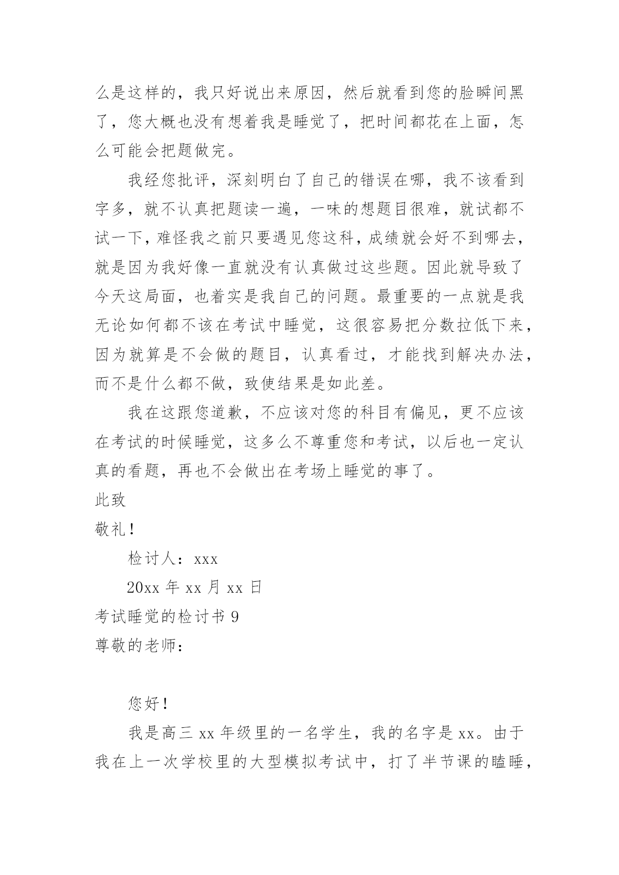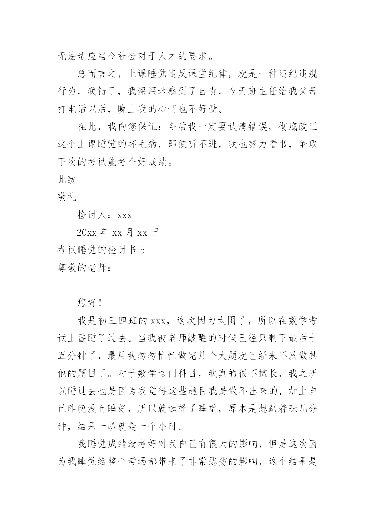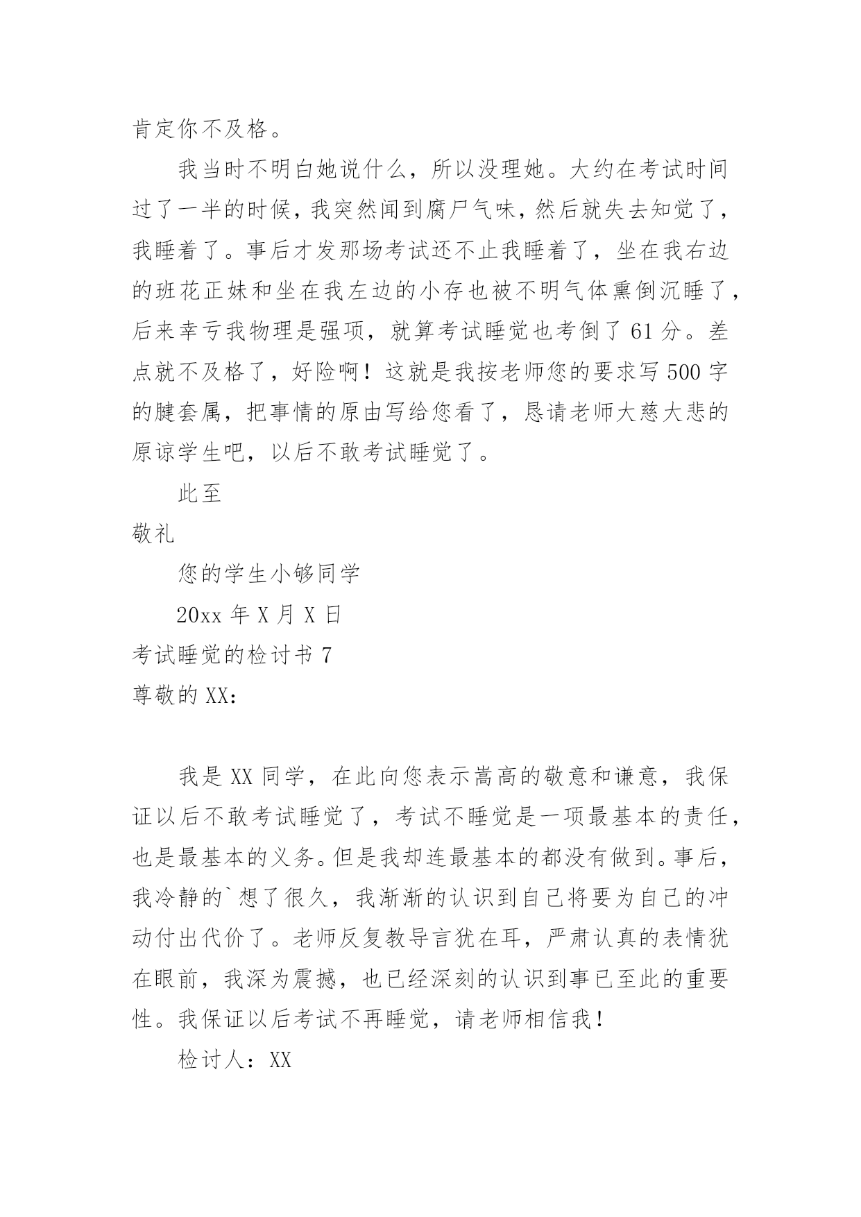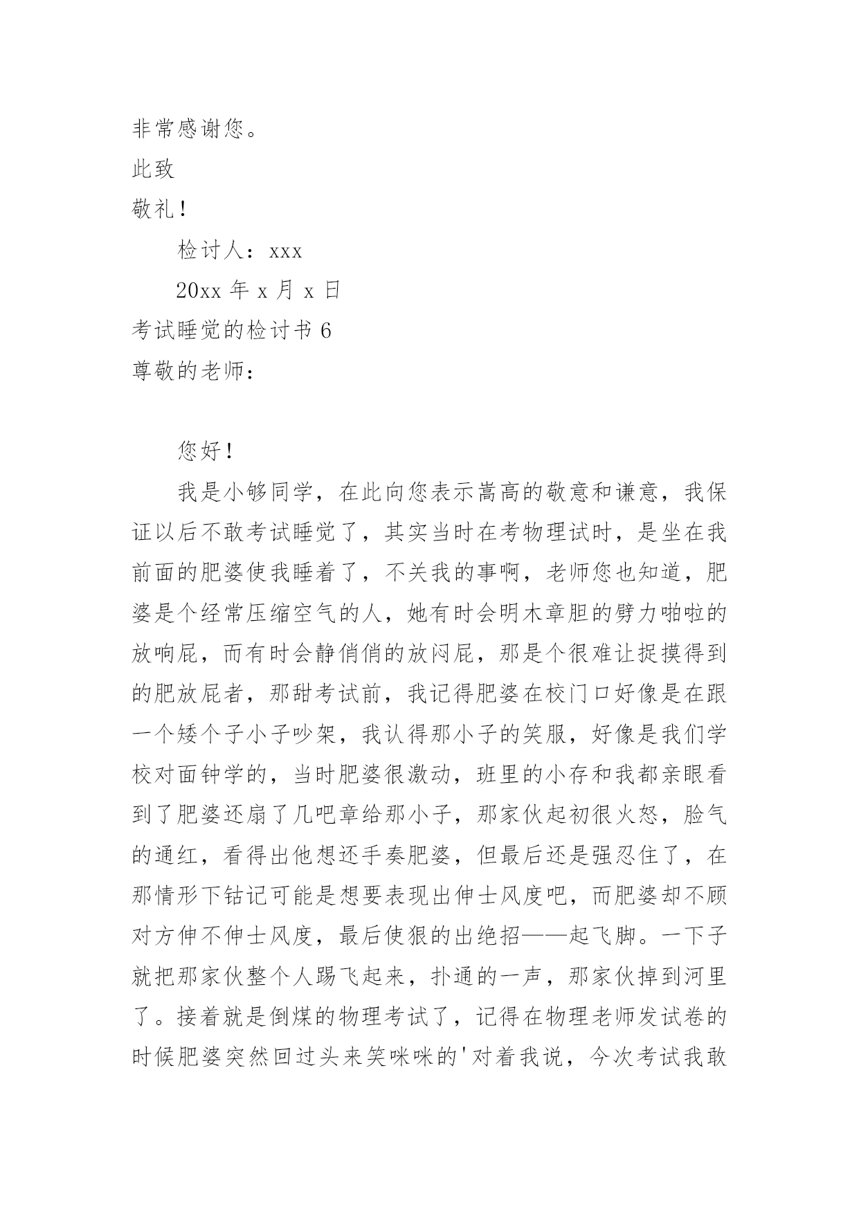 考试睡觉的检讨书考试睡觉的检讨书在有过错的情况下,为了避免再犯,往往要写检讨书来自我反思,写检讨书的时候一定要有承认错误的意识。那么问题来了,到底应如何写检讨书呢?以下是小编整理的考试睡觉的检讨书,欢迎阅读,希望大家能够喜欢。考试睡觉的检讨书1尊敬的老师:您好!我在这次的考试里面,没有认真的去做题目,反而觉得是考不好的,所以也是懒散,不去仔细的思考,反而趴在桌子上睡觉,我这样对待考试的行为是很不好,也是无法让自己成绩提高的,反而会养成不好的习惯,对此我也是要检讨,要认真的反省。虽然我学的是比较的糟糕,但是其实如果认真的去考试,可能成绩也是不好,但是也是能看到我到底是哪些地方没有学好,哪些知识点是学了的,这样就更加的清晰,清楚知道自己应该怎么样来进步,而不是说不认真的去对待考试,在考场上睡觉,这不但是让自己没有把时间珍惜起来,同时也是不知道自己到底哪方面是没有学好的,以后也是没有进步,考试是为了检测我们平时所学的,也是希望我们认识到自己要在哪些方面去提升的,如果考试都不去做好,那么平时的学习其实也是会很糟糕,我也是如此,平时学习就不够认真,考试更是感觉得到自己考不了好的分数,所以也是比较的敷衍,老师开始也是以为我休息一下,然后再来做题目,可是我却一直睡了下去,也是让老师来叫醒我了。而我起来之后也是没有认真的做试卷,而今想想的`确当初浪费了很多的时间,考试结束之后,老师您也是把我叫到了办公室,和我说了很多,我也是清楚老师之所以那么的关心我,批评我,也是希望我能有进步,不想放弃我,而我自己之前却是放弃了自己,对自己的未来没有去负责,而今我还是高一的阶段,还有时间,其实努力也是会有收获的。而不能养成这样不好的习惯,懒散的状态是无法把学习给搞好的,如果我认真的来做,完全能学好,特别是考试,更是要重视起来,老师也是说过,分数并不是那么的重要,目前的阶段是要清楚自己哪些方面学好了,哪些方面的知识还需要去提升,而只有认真的去做题目,才能知道自己的不足,而不好好做,其实也是不知道自己哪些学好了,哪些又是该再努力一些去学的,想要进步,对待学习,对待考试都是要认真。错误我也是意识到了,以后不能再这样懒散,而是要认真的来对待学习之中的每一件事情,无论是上课,做作业,或者是考试,都是认真才行,也是请老师您放心,我经过这次事情,老师讲了之后,也是意识到了,会在今后重视,去认真学的。此致敬礼!检讨人:xxx20xx年x月x日考试睡觉的检讨书2尊敬的.XX:我在上课考试的时候,不小心睡着了,由于我昨天做了太激烈的运动,导致了失眠,我感到非常的后悔和羞耻。我保证以后:1、好好安排时间表。2、早睡早起不熬夜。3、做运动保持身体健康。4、适量娱乐减轻压力。5、努力学习把书读好保证以后考试不再睡觉而交白卷。检讨人:XXXXXX年XX月XX日考试睡觉的检讨书3尊敬的学校领导:您好!对于我在考试时睡觉这一行为,我感到深深的'自责,我不仅没用好的态度对待考试,还是对老师的不尊,我对于自己的行为向您递交检讨书,我觉得自己已经没有脸再见您了,只希望您能原谅我,给我一次机会。回顾错误,我主要犯了几点错误:1、我昨天晚上没有睡好。2、我今天早上没有吃早饭。学生考试睡觉检讨书范本学生考试睡觉检讨书范本。3、我没有将这次考试重视起来。检讨人:XXXXXX年XX月XX日考试睡觉的检讨书4尊敬的学校老师:您好!关于今天考试的时候睡觉的事情,我感到非常后悔,对于自身所犯的错误感到深深的烦恼与内疚,特此检讨!回顾错误,我当时由于感到题目困难,慢慢地就产生了倦意就爬在桌子上睡了起来。面对错误,这已经不是我第一次在考场上睡觉了,我的考试睡觉行为给周围同学做了非常不好的范例,让周围同学受到了我的影响,扰乱了考场纪律,进一步来说让全班同学都受到了我的'不好影响。面对错误,我感到愧疚。经过领导的批评以后,我更是认识到了自身错误的严重性。我屡教不改,经常违反学校纪律,充分说明我是一个不懂事的青年,没有意识到“遵守纪律,积极上进”才是一名青年学生的正途。而我这样上课睡觉,也充分暴露出我“怕懒得、不求学”的不好学习品行,我这样的品行倘若继续存在,在今后就很难立足社会,更是无法适应当今社会对于人才的要求。总而言之,上课睡觉违反课堂纪律,就是一种违纪违规行为,我错了,我深深地感到了自责,今天班主任给我父母打电话以后,晚上我的心情也不好受。在此,我向您保证:今后我一定要认清错误,彻底改正这个上课睡觉的坏毛病,即使听不进,我也努力看书,争取下次的考试能考个好成绩。此致敬礼检讨人:xxx20xx年xx月xx日考试睡觉的检讨书5尊敬的老师:您好!我是初三四班的xxx,这次因为太困了,所以在数学考试上昏睡了过去。当我被老师敲醒的时候已经只剩下最后十五分钟了,最后我匆匆忙忙做完几个大题就已经来不及做其他的题目了。对于数