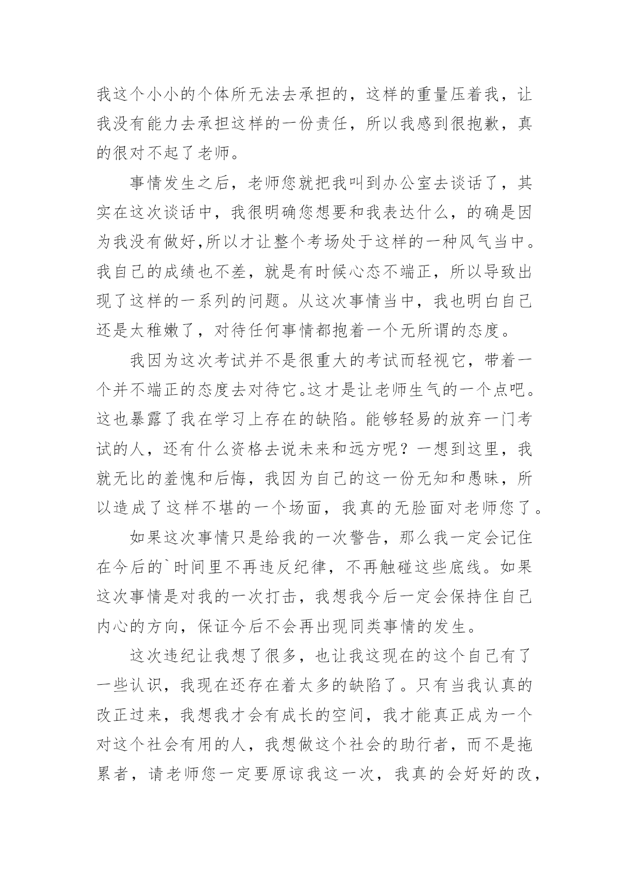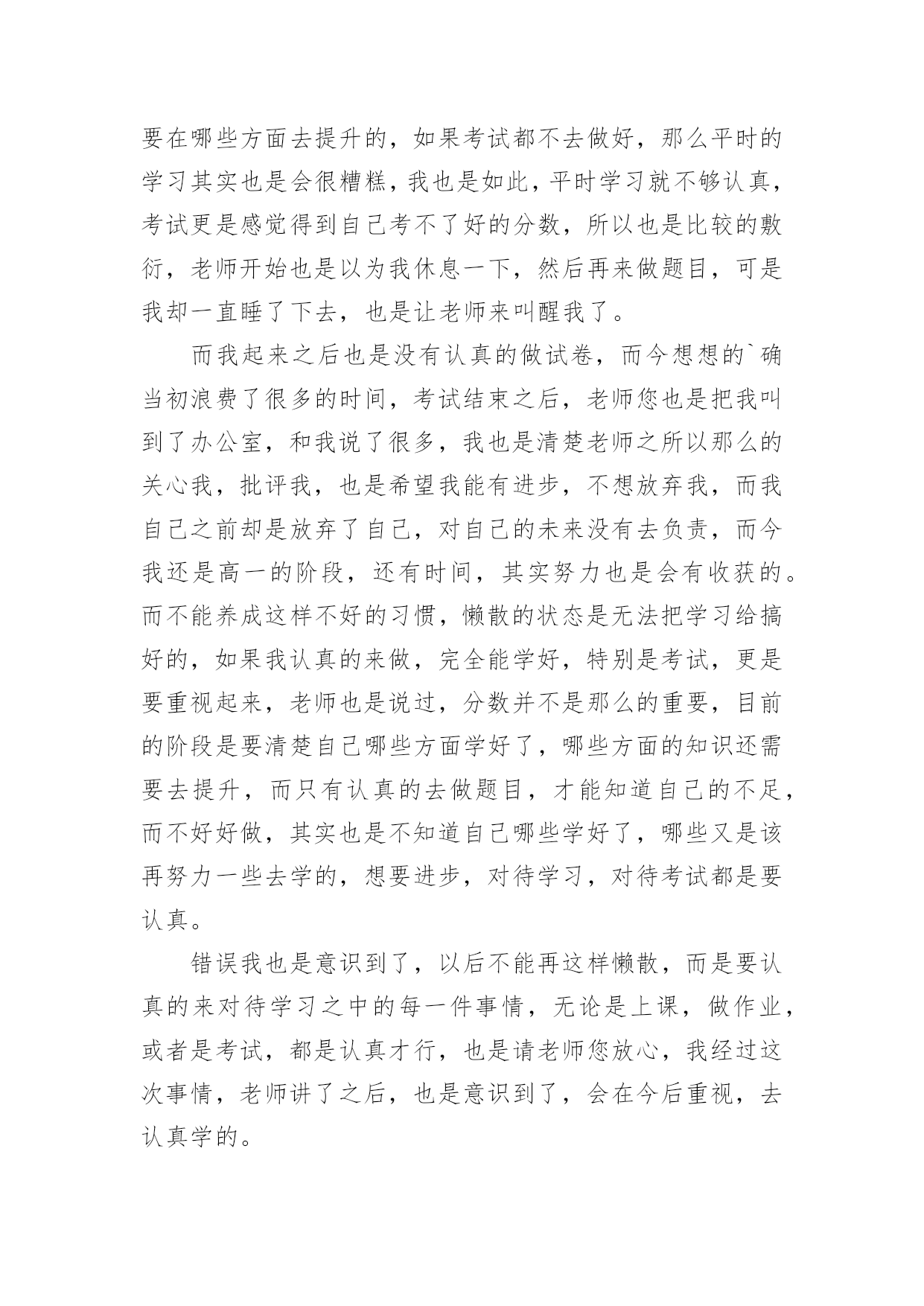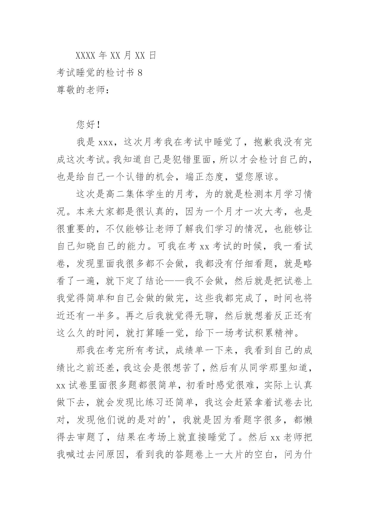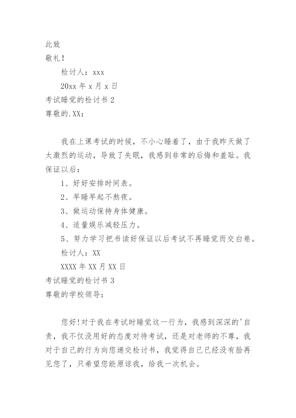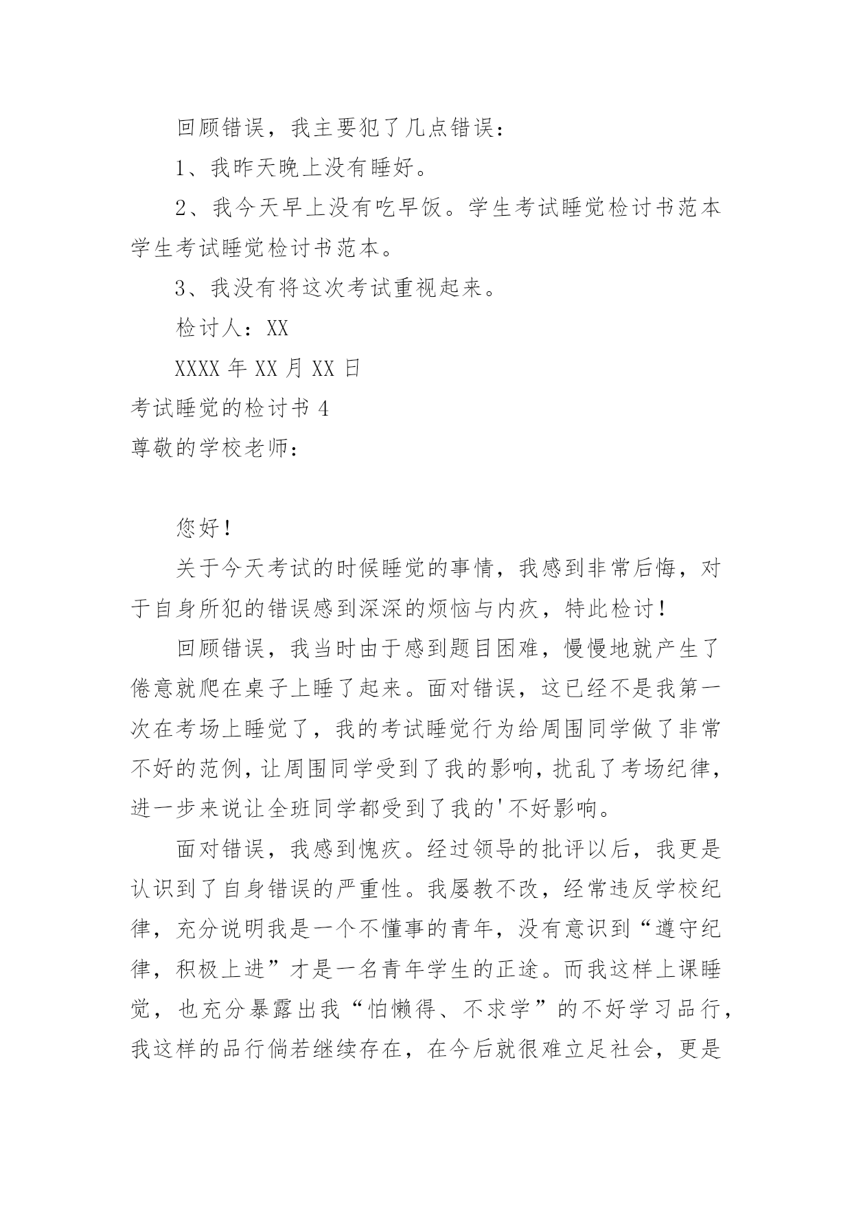 考试睡觉的检讨书考试睡觉的检讨书在有过错的情况下,为了避免再犯,往往要写检讨书来自我反思,写检讨书的时候一定要有承认错误的意识。那么问题来了,到底应如何写检讨书呢?以下是小编整理的考试睡觉的检讨书,欢迎阅读,希望大家能够喜欢。考试睡觉的检讨书1尊敬的老师:您好!我在这次的考试里面,没有认真的去做题目,反而觉得是考不好的,所以也是懒散,不去仔细的思考,反而趴在桌子上睡觉,我这样对待考试的行为是很不好,也是无法让自己成绩提高的,反而会养成不好的习惯,对此我也是要检讨,要认真的反省。虽然我学的是比较的糟糕,但是其实如果认真的去考试,可能成绩也是不好,但是也是能看到我到底是哪些地方没有学好,哪些知识点是学了的,这样就更加的清晰,清楚知道自己应该怎么样来进步,而不是说不认真的去对待考试,在考场上睡觉,这不但是让自己没有把时间珍惜起来,同时也是不知道自己到底哪方面是没有学好的,以后也是没有进步,考试是为了检测我们平时所学的,也是希望我们认识到自己要在哪些方面去提升的,如果考试都不去做好,那么平时的学习其实也是会很糟糕,我也是如此,平时学习就不够认真,考试更是感觉得到自己考不了好的分数,所以也是比较的敷衍,老师开始也是以为我休息一下,然后再来做题目,可是我却一直睡了下去,也是让老师来叫醒我了。而我起来之后也是没有认真的做试卷,而今想想的`确当初浪费了很多的时间,考试结束之后,老师您也是把我叫到了办公室,和我说了很多,我也是清楚老师之所以那么的关心我,批评我,也是希望我能有进步,不想放弃我,而我自己之前却是放弃了自己,对自己的未来没有去负责,而今我还是高一的阶段,还有时间,其实努力也是会有收获的。而不能养成这样不好的习惯,懒散的状态是无法把学习给搞好的,如果我认真的来做,完全能学好,特别是考试,更是要重视起来,老师也是说过,分数并不是那么的重要,目前的阶段是要清楚自己哪些方面学好了,哪些方面的知识还需要去提升,而只有认真的去做题目,才能知道自己的不足,而不好好做,其实也是不知道自己哪些学好了,哪些又是该再努力一些去学的,想要进步,对待学习,对待考试都是要认真。错误我也是意识到了,以后不能再这样懒散,而是要认真的来对待学习之中的每一件事情,无论是上课,做作业,或者是考试,都是认真才行,也是请老师您放心,我经过这次事情,老师讲了之后,也是意识到了,会在今后重视,去认真学的。此致敬礼!检讨人:xxx20xx年x月x日考试睡觉的检讨书2尊敬的.XX:我在上课考试的时候,不小心睡着了,由于我昨天做了太激烈的运动,导致了失眠,我感到非常的后悔和羞耻。我保证以后:1、好好安排时间表。2、早睡早起不熬夜。3、做运动保持身体健康。4、适量娱乐减轻压力。5、努力学习把书读好保证以后考试不再睡觉而交白卷。检讨人:XXXXXX年XX月XX日考试睡觉的检讨书3尊敬的学校领导:您好!对于我在考试时睡觉这一行为,我感到深深的'自责,我不仅没用好的态度对待考试,还是对老师的不尊,我对于自己的行为向您递交检讨书,我觉得自己已经没有脸再见您了,只希望您能原谅我,给我一次机会。回顾错误,我主要犯了几点错误:1、我昨天晚上没有睡好。2、我今天早上没有吃早饭。学生考试睡觉检讨书范本学生考试睡觉检讨书范本。3、我没有将这次考试重视起来。检讨人:XXXXXX年XX月XX日考试睡觉的检讨书4尊敬的学校老师:您好!关于今天考试的时候睡觉的事情,我感到非常后悔,对于自身所犯的错误感到深深的烦恼与内疚,特此检讨!回顾错误,我当时由于感到题目困难,慢慢地就产生了倦意就爬在桌子上睡了起来。面对错误,这已经不是我第一次在考场上睡觉了,我的考试睡觉行为给周围同学做了非常不好的范例,让周围同学受到了我的影响,扰乱了考场纪律,进一步来说让全班同学都受到了我的'不好影响。面对错误,我感到愧疚。经过领导的批评以后,我更是认识到了自身错误的严重性。我屡教不改,经常违反学校纪律,充分说明我是一个不懂事的青年,没有意识到“遵守纪律,积极上进”才是一名青年学生的正途。而我这样上课睡觉,也充分暴露出我“怕懒得、不求学”的不好学习品行,我这样的品行倘若继续存在,在今后就很难立足社会,更是无法适应当今社会对于人才的要求。总而言之,上课睡觉违反课堂纪律,就是一种违纪违规行为,我错了,我深深地感到了自责,今天班主任给我父母打电话以后,晚上我的心情也不好受。在此,我向您保证:今后我一定要认清错误,彻底改正这个上课睡觉的坏毛病,即使听不进,我也努力看书,争取下次的考试能考个好成绩。此致敬礼检讨人:xxx20xx年xx月xx日考试睡觉的检讨书5尊敬的老师:您好!我是初三四班的xxx,这次因为太困了,所以在数学考试上昏睡了过去。当我被老师敲醒的时候已经只剩下最后十五分钟了,最后我匆匆忙忙做完几个大题就已经来不及做其他的题目了。对于数