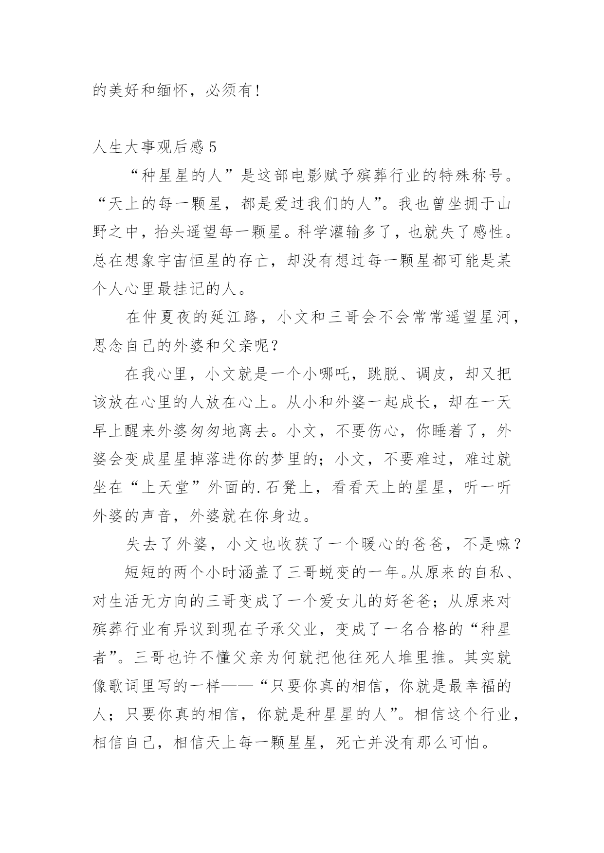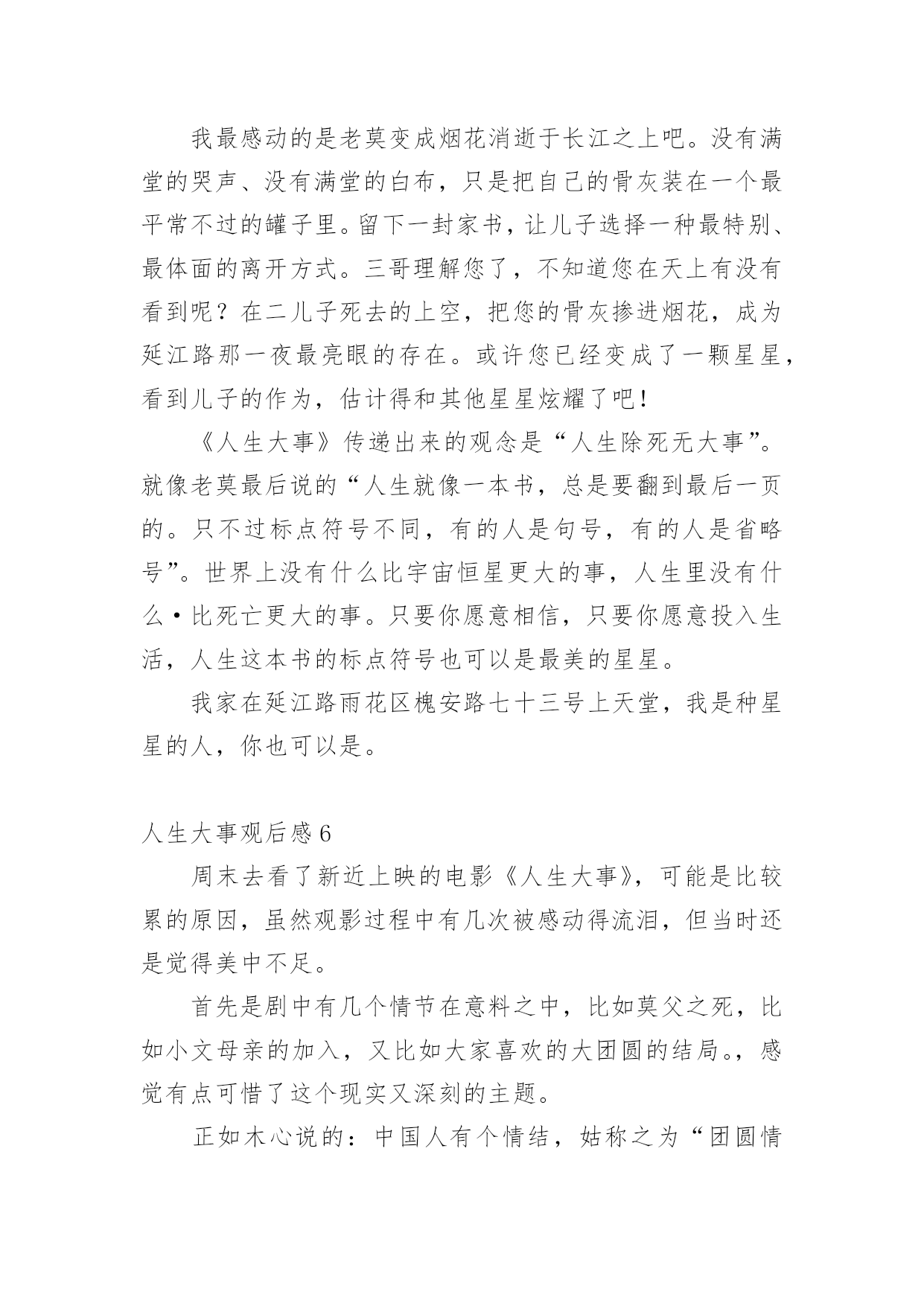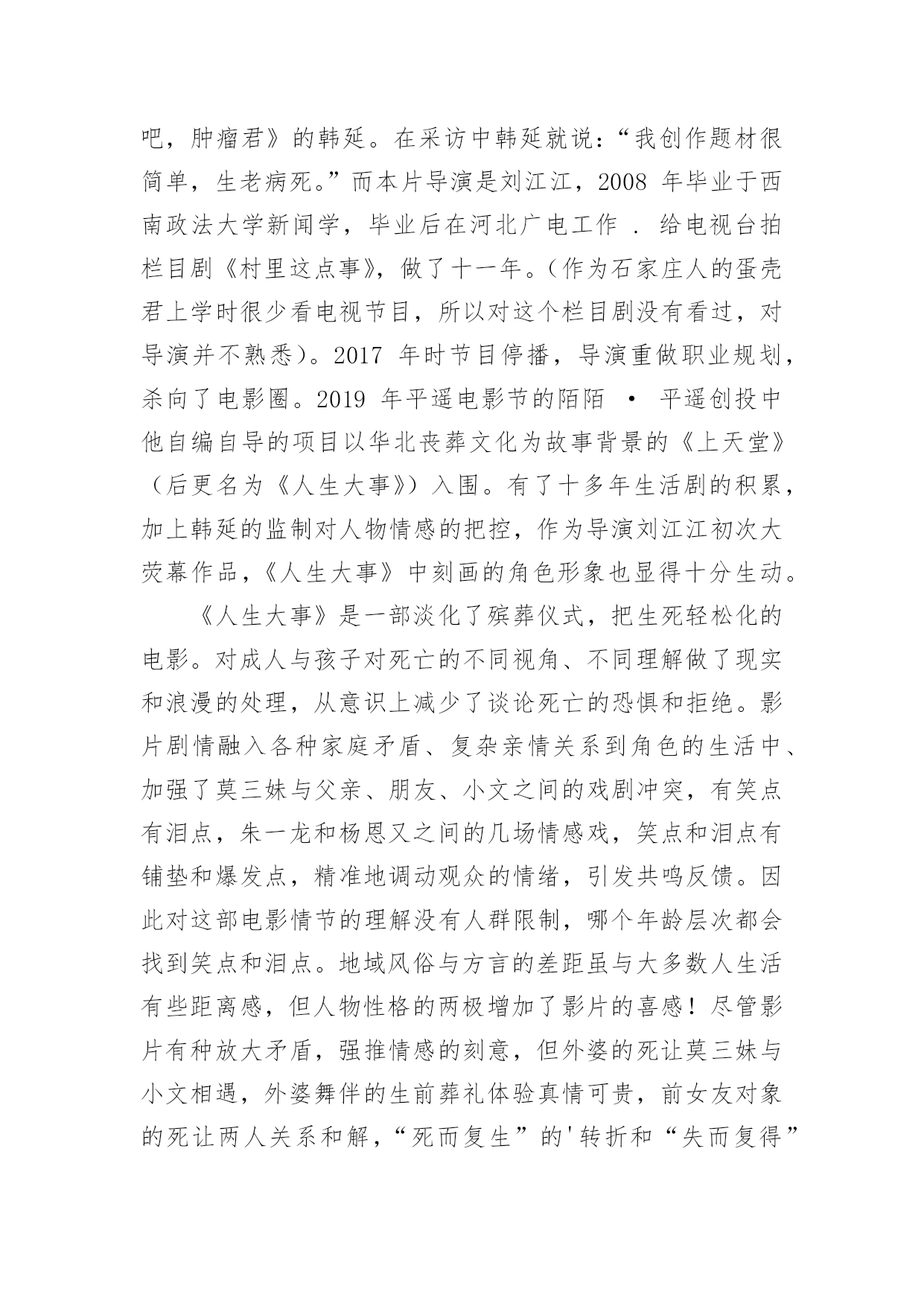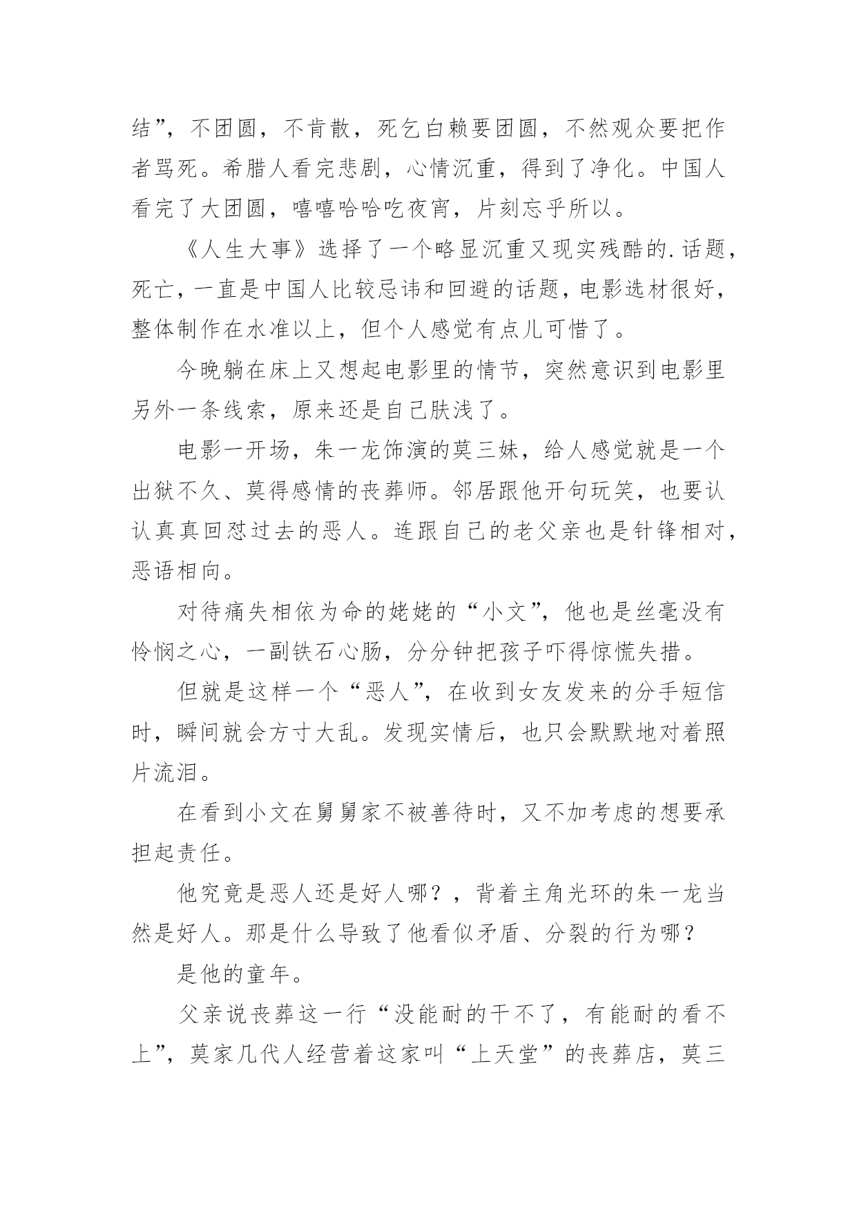 人生大事观后感当品味完一部影视作品后,一定有不少感悟吧,这时候十分有必须要写一篇观后感了!但是观后感有什么要求呢?以下是小编精心整理的人生大事观后感,仅供参考,大家一起来看看吧。人生大事观后感1最近新上映的《人生大事》获得一致好评,在朋友的推荐下,昨天下班便奔向影院一睹为快了。这是我第一次看殡葬题材的电影。或是觉得自己正值青春年少,死亡离自己还比较遥远;或是觉得自己阅历不够多,生死这类相对比较有人生高度的电影,自己一个人也看不明白,便很少主动去接触观看。但是看了之后,打破了我对这个电影原有的看法。电影主要讲述的是:朱一龙饰演的殡葬师莫三妹在刑满释放不久后的一次出殡中,遇到了杨恩又饰演的'孤儿武小文。在三妹和小文后面的接触相处中,两人之间经历了很多事情,慢慢地产生了别样的感情,小文的出现,也意外地改变了莫三妹对职业和生活的态度。本以为这类电影在看的过程中会比较压抑和悲伤,结果完全没有。前期比较轻快欢乐,先从莫三妹的出场上看:剃了个寸头、胡子拉碴、身穿花衬衫大裤衩、脚踩拖鞋、脖子上还戴着个粗链子,一口武汉方言并时不时说个粗话,俨然一副混混模样,很有喜感,也给我们一种反差,感觉和传统印象中严肃庄重的殡葬师形象不符。电影后面部分就挺打动人,我以前自诩“菠萝头”,但还是忍不住哭得稀里哗啦的,呜呜呜,怎么就给整破防了呀!第一次哭,是半夜小文独自起来,坐在外面看着夜空中的星星,然后在儿童手表里翻播着外婆给她发的语音,听完一段又一段,那时候小小的她还不明白外婆已经永远地离开了她。第二次哭,是小文过生日,三哥四处找人帮她把手表里面的数据修复好,再缝制在玩偶里面送给小文,或许小文已经忘了外婆的模样,但是能让她听听外婆的声音,有个牵挂也好。第三次哭,小文的亲生母亲来找回小文,面对小文的离开,同时又收到父亲离世的消息,三哥一个人躺在床上,悲痛不已。电影整体的情感真实且感人,并不是强行煽情让你哭。除了对生与死的思索,更多对剧中人物父子情、父女情、婆孙情、母女情等亲情的刻画,用简简单单又真实的故事打动人。现在还记得小文在学校对三哥职业的称呼是“种星星的人”。这大概是我见过对于殡葬行业工作者最温柔的称呼了吧,小孩子是真的很美好呀!有人说:这是一部讲述死亡的电影,却满眼都是活着的珍贵。不由得感慨,我们都要好好珍惜眼前人,给身边的亲人爱人友人多些陪伴与关怀,人生就这一趟,当然要活得温暖而又热烈!人生大事观后感2平常,人们都说“人生百味”。可我却观察到,百味中,多半都没有淡这一说法。淡,或许在很多人看来,它是平淡无奇,是孤独寂寞,是没有任何性格的人,感受着没有任何感觉的事,直至最后的死亡。我就有一个性格特别内向的“淡”朋友。可是我知道,他并不是在过无趣孤独的人生,只是他选择去默默地感受这个丰富多彩的世界而已。有人不就说,“安静和宁静的心灵,往往总比浮躁的心灵更容易倾听这个世界”吗?有些人,表面像一湾宁静的湖,可是如果你往湖面下去探索,有可能发现下面还隐藏着一片海洋,海洋里深藏的事物,远超于你的认知。是的,就算有人真的曾经坐在一个无人的角落,感受着他自己的孤独,这不也是另一种独特的酸味吗?每种性格,每种滋味,都有它独特的特性。我就拥有非常活泼的性格,我却认为,我比安静一些的性格更身临其境地触碰到了这个世界呢。哈哈。物各有性而已。糖很甜,但是吃多了就会腻,而且容易得一些病。橙子是酸的,但它补充得了大量的维生素C,避免了很多人的坏血病。人的一生,不该只尝一种滋味,更不该都是一种风味。现在我们经历的,不管是甜还是苦,都是我们一生必须要尝的东西。只有当你渴时,你才能从没有任何味道的“淡”水里感受到丰富的味道。懂得了这点,一次又一次“挫折”的苦,就可以使你更加努力去克服。我的羽毛球,一开始满怀期待,接着就是经历挫折、再接再厉、差点放弃、看到希望、再次失败,努力拼搏、再创高度,又遇挫折,走向突破,再次挫折……这真是羽球人生带给我的百般的“有滋有味”。但是,几年如一日的羽毛球训练,才是我感受到最常态的“淡”滋味。我的偶像超级丹,他终将退役。人生辉煌过后或许就是落寞。之后年老,死亡。对,死亡,这是生命最后必须回归的`淡了。问题不是淡了,是你在你的生命海洋中有没有体味过更新奇的味道?我们来到这个世界,并不是全是为了简单去享受。探索和体验到更新奇的滋味,你才会自然享受它。这种享受和内在体验才最美妙。我写这篇文章的目的并不是来说明什么人生大道理。只是我觉得,人生百味里,在一切归于“淡”之前,可以先成为一个完整的人,体味该体味的滋味。这样死了,会没有遗憾。因为这个时候的死亡,才不是苍白无力的“淡”。不是生命的句号,而是给自己的人生杂入了百味的省略号……人生,就该酸甜苦辣咸淡,多味调和,才能共存相生,百味纷呈。人生大事观后感3《人生大事》监制是导演了《送你一朵小红花》、《滚蛋吧,肿瘤君
