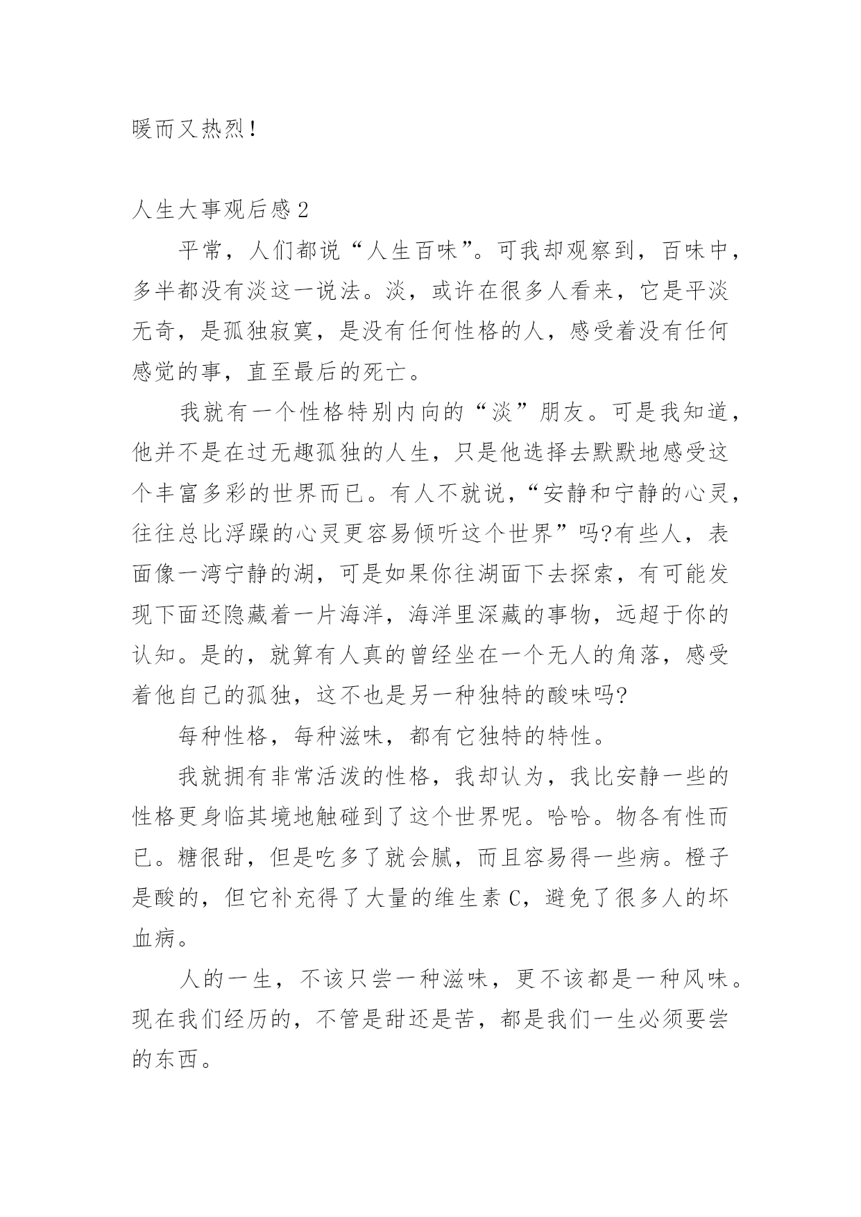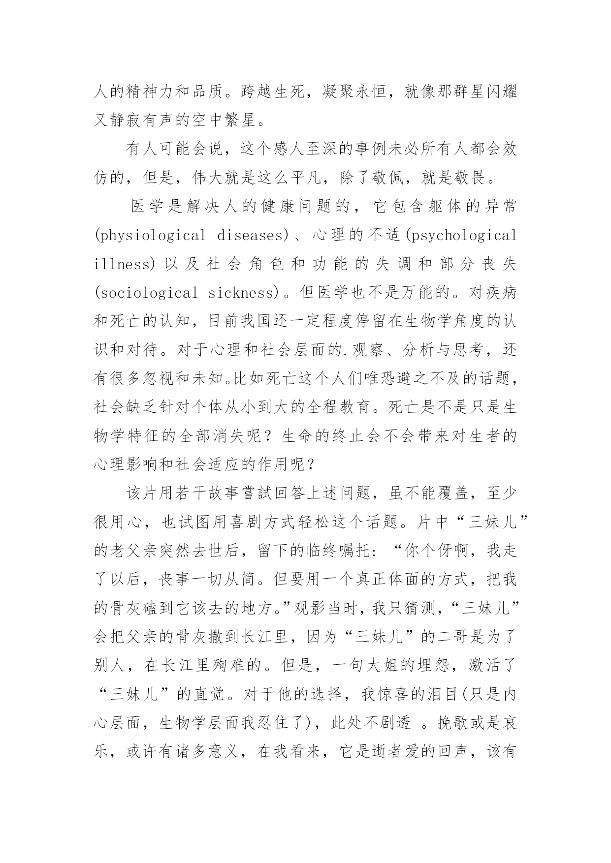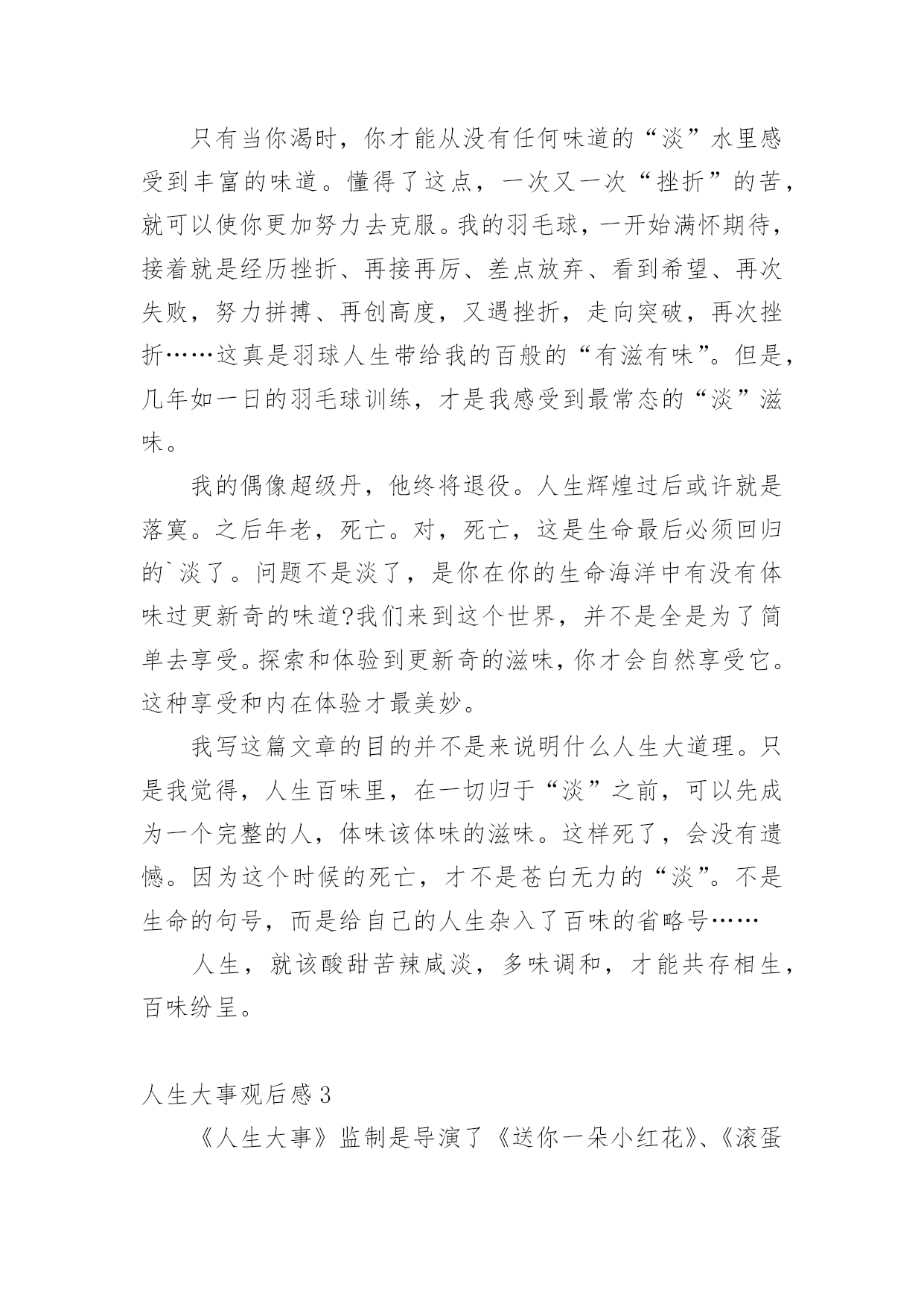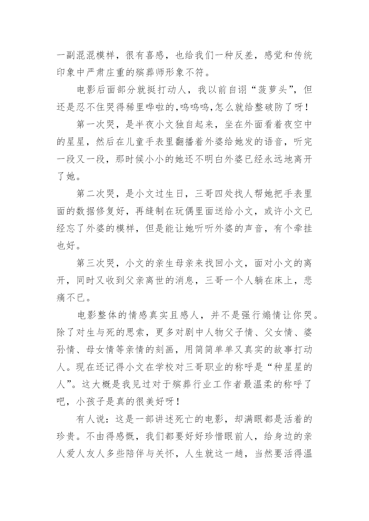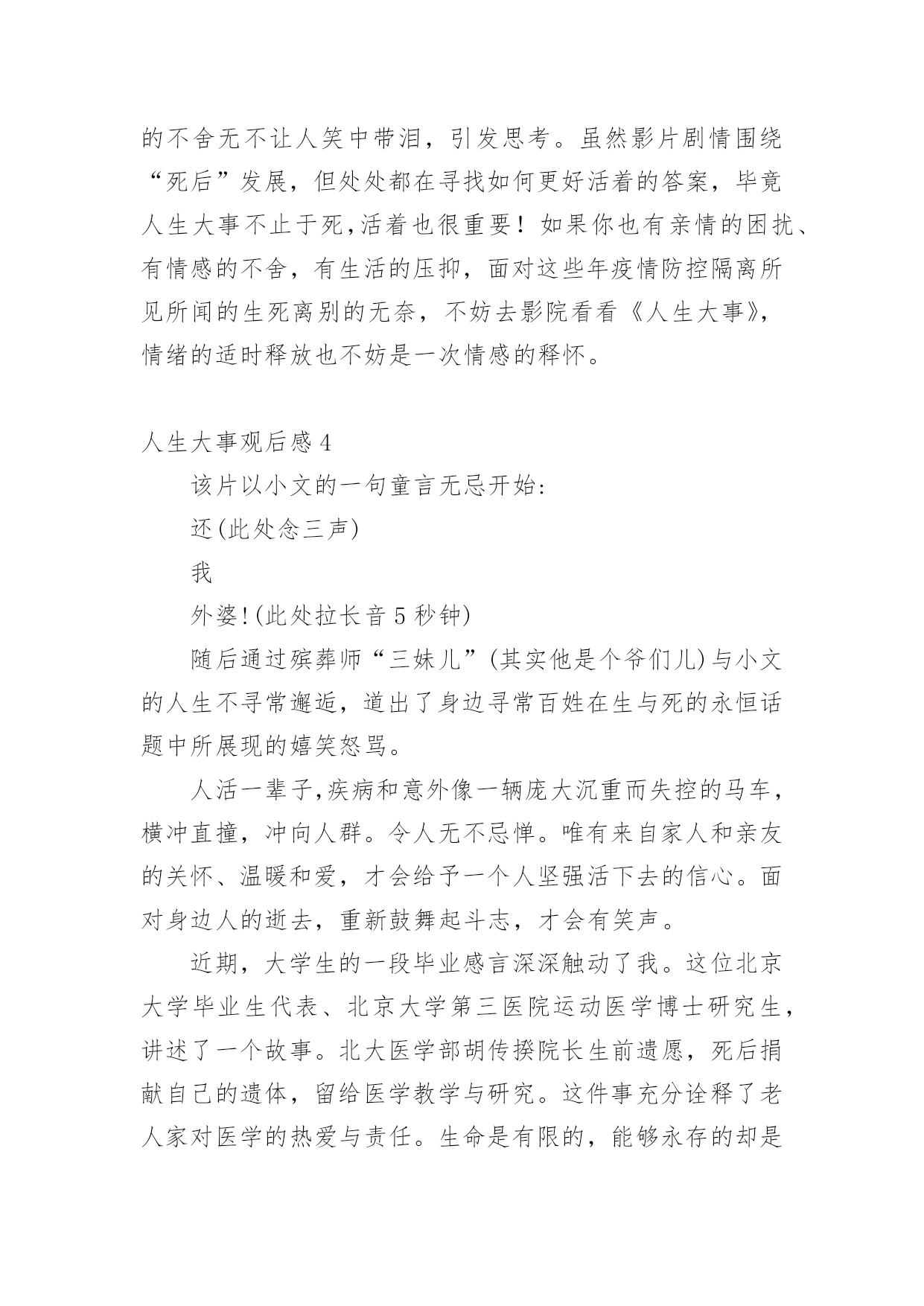 人生大事观后感当品味完一部影视作品后,一定有不少感悟吧,这时候十分有必须要写一篇观后感了!但是观后感有什么要求呢?以下是小编精心整理的人生大事观后感,仅供参考,大家一起来看看吧。人生大事观后感1最近新上映的《人生大事》获得一致好评,在朋友的推荐下,昨天下班便奔向影院一睹为快了。这是我第一次看殡葬题材的电影。或是觉得自己正值青春年少,死亡离自己还比较遥远;或是觉得自己阅历不够多,生死这类相对比较有人生高度的电影,自己一个人也看不明白,便很少主动去接触观看。但是看了之后,打破了我对这个电影原有的看法。电影主要讲述的是:朱一龙饰演的殡葬师莫三妹在刑满释放不久后的一次出殡中,遇到了杨恩又饰演的'孤儿武小文。在三妹和小文后面的接触相处中,两人之间经历了很多事情,慢慢地产生了别样的感情,小文的出现,也意外地改变了莫三妹对职业和生活的态度。本以为这类电影在看的过程中会比较压抑和悲伤,结果完全没有。前期比较轻快欢乐,先从莫三妹的出场上看:剃了个寸头、胡子拉碴、身穿花衬衫大裤衩、脚踩拖鞋、脖子上还戴着个粗链子,一口武汉方言并时不时说个粗话,俨然一副混混模样,很有喜感,也给我们一种反差,感觉和传统印象中严肃庄重的殡葬师形象不符。电影后面部分就挺打动人,我以前自诩“菠萝头”,但还是忍不住哭得稀里哗啦的,呜呜呜,怎么就给整破防了呀!第一次哭,是半夜小文独自起来,坐在外面看着夜空中的星星,然后在儿童手表里翻播着外婆给她发的语音,听完一段又一段,那时候小小的她还不明白外婆已经永远地离开了她。第二次哭,是小文过生日,三哥四处找人帮她把手表里面的数据修复好,再缝制在玩偶里面送给小文,或许小文已经忘了外婆的模样,但是能让她听听外婆的声音,有个牵挂也好。第三次哭,小文的亲生母亲来找回小文,面对小文的离开,同时又收到父亲离世的消息,三哥一个人躺在床上,悲痛不已。电影整体的情感真实且感人,并不是强行煽情让你哭。除了对生与死的思索,更多对剧中人物父子情、父女情、婆孙情、母女情等亲情的刻画,用简简单单又真实的故事打动人。现在还记得小文在学校对三哥职业的称呼是“种星星的人”。这大概是我见过对于殡葬行业工作者最温柔的称呼了吧,小孩子是真的很美好呀!有人说:这是一部讲述死亡的电影,却满眼都是活着的珍贵。不由得感慨,我们都要好好珍惜眼前人,给身边的亲人爱人友人多些陪伴与关怀,人生就这一趟,当然要活得温暖而又热烈!人生大事观后感2平常,人们都说“人生百味”。可我却观察到,百味中,多半都没有淡这一说法。淡,或许在很多人看来,它是平淡无奇,是孤独寂寞,是没有任何性格的人,感受着没有任何感觉的事,直至最后的死亡。我就有一个性格特别内向的“淡”朋友。可是我知道,他并不是在过无趣孤独的人生,只是他选择去默默地感受这个丰富多彩的世界而已。有人不就说,“安静和宁静的心灵,往往总比浮躁的心灵更容易倾听这个世界”吗?有些人,表面像一湾宁静的湖,可是如果你往湖面下去探索,有可能发现下面还隐藏着一片海洋,海洋里深藏的事物,远超于你的认知。是的,就算有人真的曾经坐在一个无人的角落,感受着他自己的孤独,这不也是另一种独特的酸味吗?每种性格,每种滋味,都有它独特的特性。我就拥有非常活泼的性格,我却认为,我比安静一些的性格更身临其境地触碰到了这个世界呢。哈哈。物各有性而已。糖很甜,但是吃多了就会腻,而且容易得一些病。橙子是酸的,但它补充得了大量的维生素C,避免了很多人的坏血病。人的一生,不该只尝一种滋味,更不该都是一种风味。现在我们经历的,不管是甜还是苦,都是我们一生必须要尝的东西。只有当你渴时,你才能从没有任何味道的“淡”水里感受到丰富的味道。懂得了这点,一次又一次“挫折”的苦,就可以使你更加努力去克服。我的羽毛球,一开始满怀期待,接着就是经历挫折、再接再厉、差点放弃、看到希望、再次失败,努力拼搏、再创高度,又遇挫折,走向突破,再次挫折……这真是羽球人生带给我的百般的“有滋有味”。但是,几年如一日的羽毛球训练,才是我感受到最常态的“淡”滋味。我的偶像超级丹,他终将退役。人生辉煌过后或许就是落寞。之后年老,死亡。对,死亡,这是生命最后必须回归的`淡了。问题不是淡了,是你在你的生命海洋中有没有体味过更新奇的味道?我们来到这个世界,并不是全是为了简单去享受。探索和体验到更新奇的滋味,你才会自然享受它。这种享受和内在体验才最美妙。我写这篇文章的目的并不是来说明什么人生大道理。只是我觉得,人生百味里,在一切归于“淡”之前,可以先成为一个完整的人,体味该体味的滋味。这样死了,会没有遗憾。因为这个时候的死亡,才不是苍白无力的“淡”。不是生命的句号,而是给自己的人生杂入了百味的省略号……人生,就该酸甜苦辣咸淡,多味调和,才能共存相生,百味纷呈。人生大事观后感3《人生大事》监制是导演了《送你一朵小红花》、《滚蛋吧,肿瘤君
